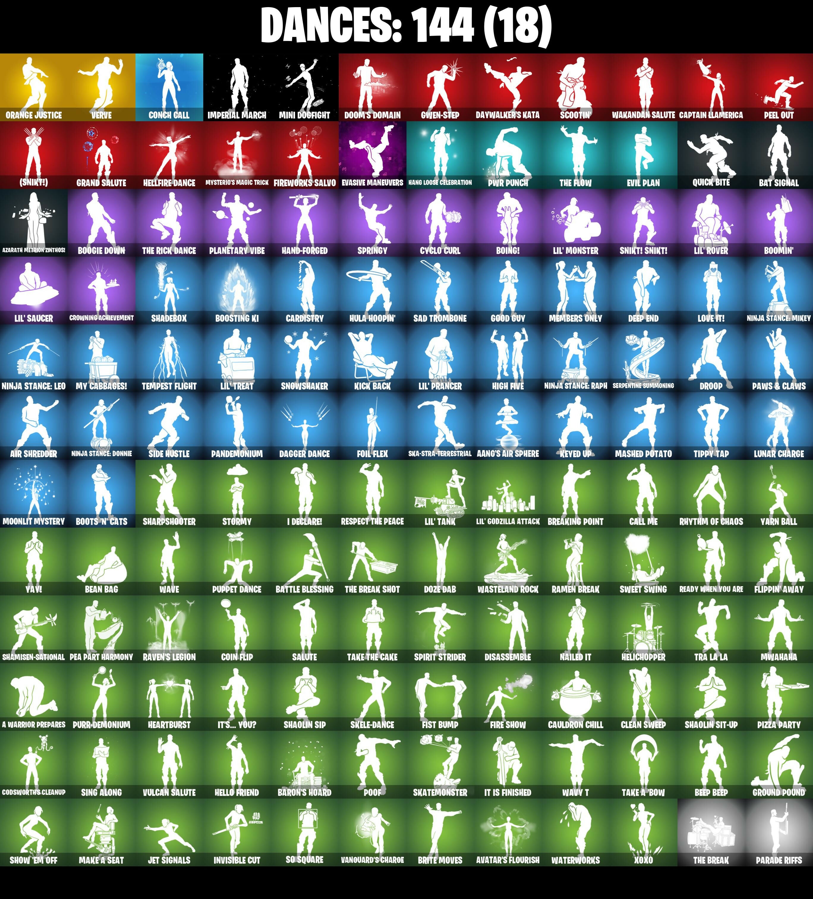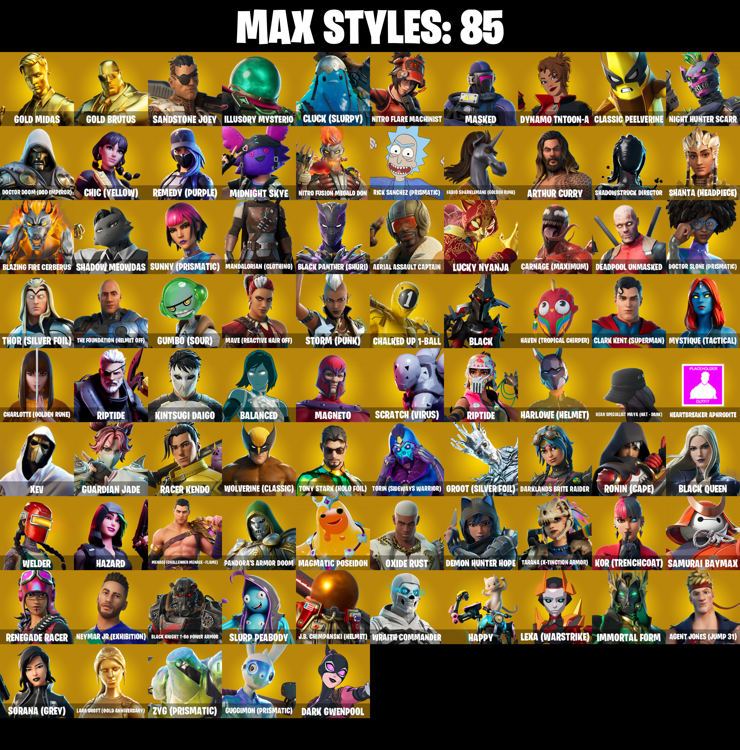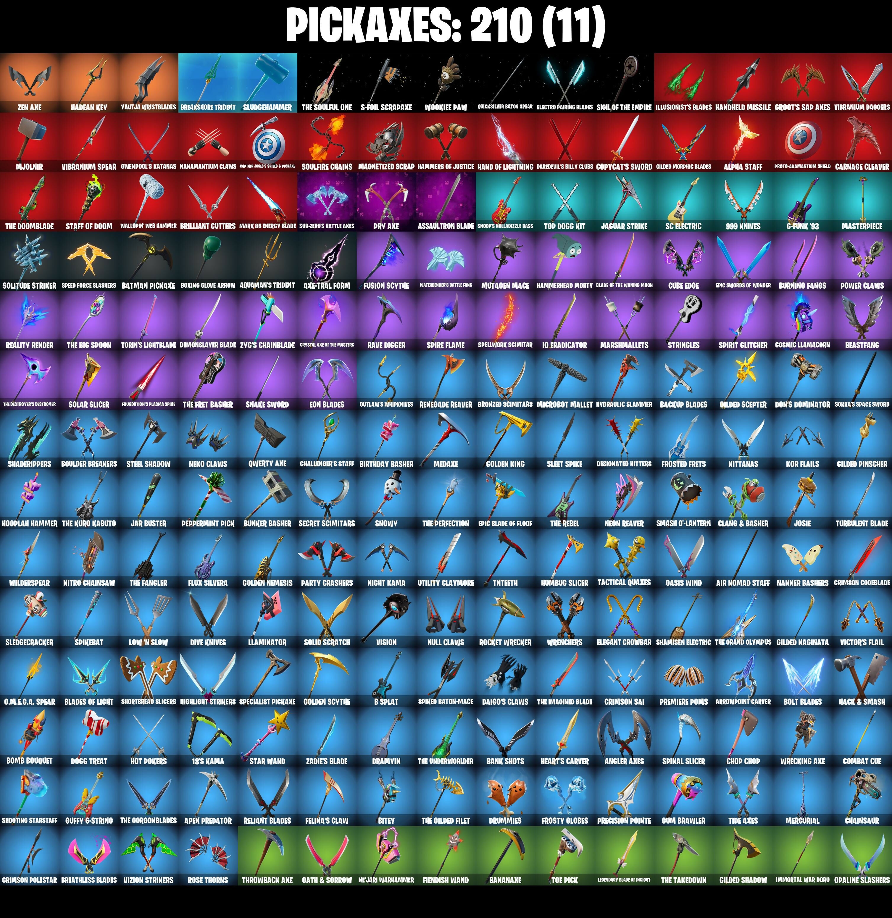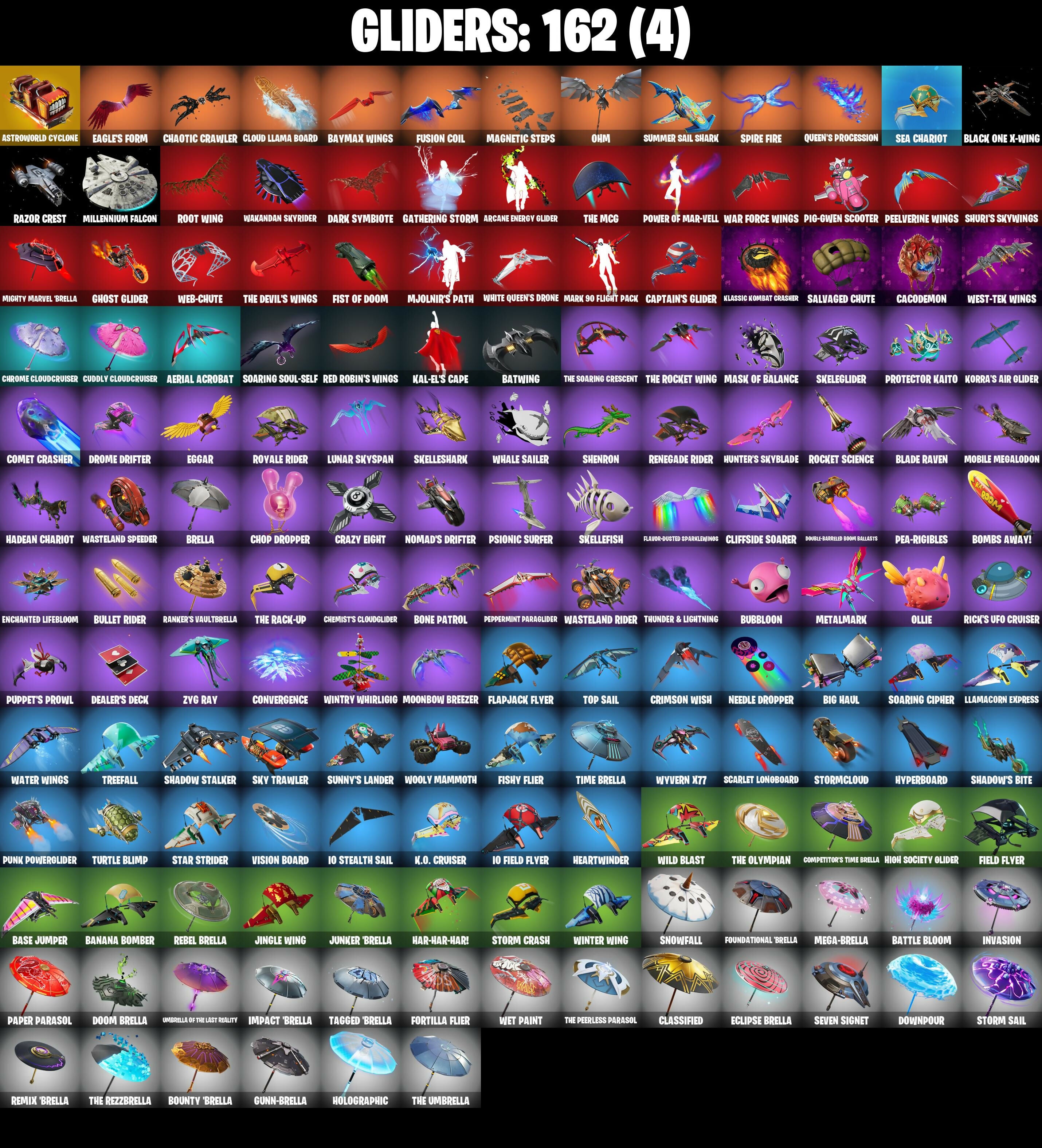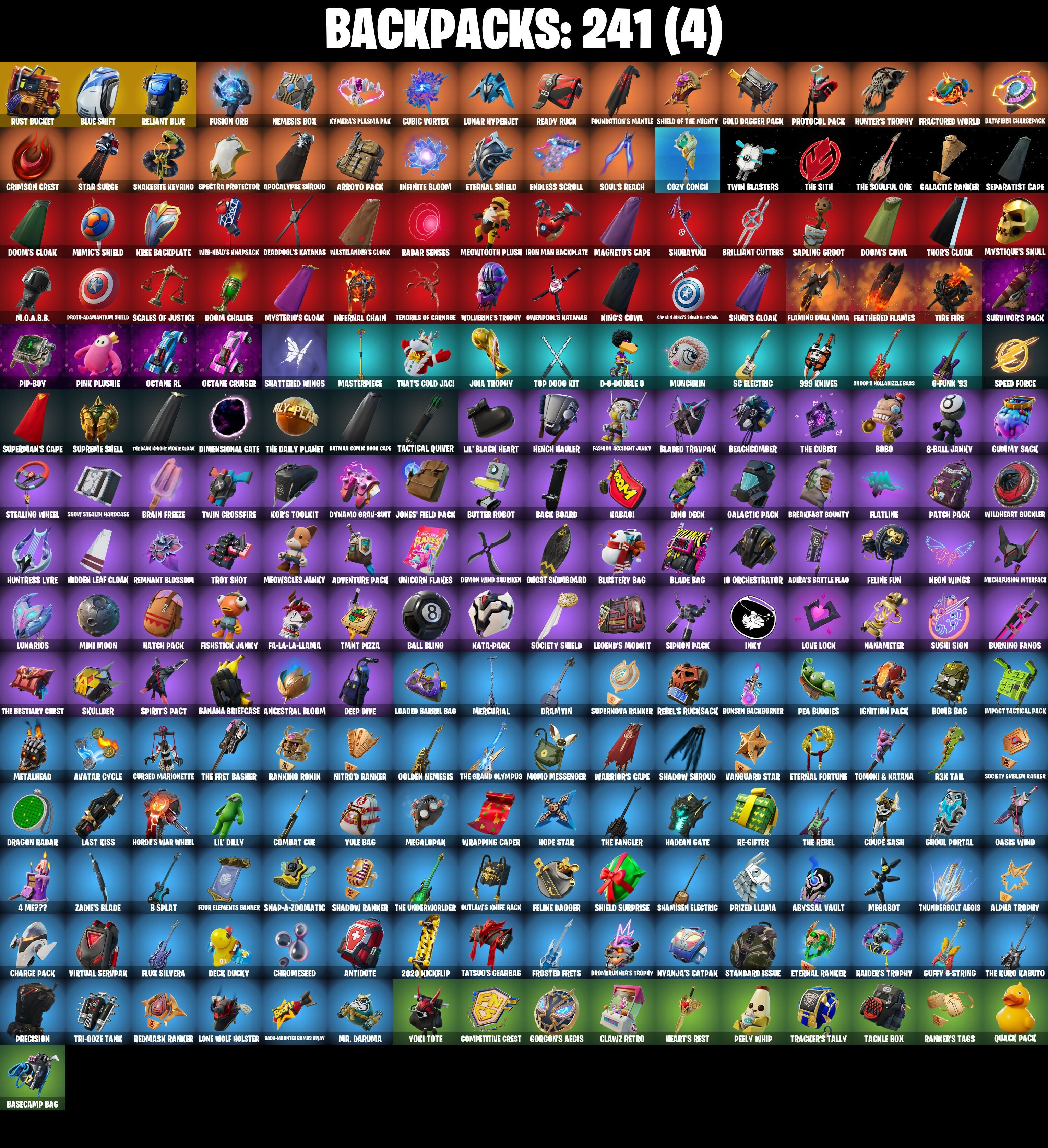 (Snikt!), 1-Ball, 10 Field Flyer, 10 Orchestrator, 10 Stealth Sail, 18's Kama, 2020 Kickflip, 4 NE???, 8-Ball Janky, 8-Ball Vs Scratch, 999 Knives, A Warrior Prepares, Aang, Aang's Air Sphere, Abyssal Vault, Adira's Battle Flag, Adventure Pack, Aerial Acrobat, Aerial Assault Bomber, Aerial Assault Captain, Aftermath, Agent Jones, Agent Jones (Jump 31), Agent Peely, Air Nomad Staff, Air Shredder, Alpha Staff, Alpha Trophy, Ancestral Bloom, Andy Fangerson, Angler Axes, Antidote, Apex Predator, Aphrodite, Apocalypse Shroud, Aquaman, Aquaman's Trident, Arcane Energy Glider, Arctic Adeline, Ares, Arrowpoint Carver, Arroyo Pack, Artemis, Arthur Curry, Assaultron Blade, Astroworld Cyclone, Avatar Cycle, Avatar State Aang, Avatar's Flourish, Axe-Tral Form, Azarath Metrion Zinthos!, B Splat, Back Board, Backlash, Backup Blades, Balanced, Ball Bling, Banana Bomber, Banana Briefcase, Bananaxe, Bank Shots, Baron's Hoard, Base Jumper, Basecamp Bag, Bat Signal, Batman Comic Book Cape, Batman Comic Book Outfit, Batman Pickaxe, Battle Blessing, Battle Bloom, Batwing, Baymax Wings, Beachcomber, Bean Bag, Beastfang, Beep Beep, Big Haul, Birthday Basher, Bitey, Black, Black Knight T-60 Power Armor, Black One X-Wing, Black Panther, Black Panther (Shuri), Black Queen, Blade Bag, Blade Of The Waning Moon, Blade Raven, Bladed Travpak, Blades Of Light, Blazing Fire Cerberus, Blue Shift, Blue Striker, Blustery Bag, Bobo, Boing!, Bolt Blades, Bomb Bag, Bomb Bouquet, Bombs Away!, Bone Patrol, Boogie Down, Boomin', Boosting KI, Boots 'N' Cats, Boulder Breakers, Bounty Brella, Boxing Glove Arrow, Brain Freeze, Breakfast Bounty, Breaking Point, Breakshore Trident, Breathless Blades, Brella, Brilliant Cutters, Brite Moves, Brite Raider, Bronzed Scimitars, Bubbloon, Bullet Rider, Bunker Basher, Bunsen Backburner, Burning Fangs, Butter Robot, Cacodemon, Call Me, Cameo Vs Chic, Captain America, Captain America's Shield & Pickaxe, Captain Jones, Captain Jones's Skid & Pickaxe, Captain Llamerica, Captain Marvel, Captain's Glider, Cardistry, Carnage, Carnage (Maximum), Carnage Cleaver, Cauldron Chill, Cerberus, Chainsaur, Chalked Up 1-Ball, Challenger's Staff, Champion Siren, Chaos Director, Chaos Origins, Chaotic Crawler, Charge Pack, Charlotte, Charlotte (Golden Rune), Chemist's Cloudglider, Chic (Yellow), Chop Chop, Chop Dropper, Chrome Cloudcruiser, Chromeseed, Clang & Basher, Clara, Clark Kent, Clark Kent (Superman), Classic Peelverine, Classified, Clawz Retro, Clean Sweep, Cliffside Soarer, Cloud Llama Board, Cluck, Cluck (Slurpy), Codsworth's Cleanup, Coin Flip, Combat Cue, Comet Crasher, Competitive Crest, Competitor's Time Brella, Conch Call, Convergence, Copycat's Sword, Cosmic Llamacorn, Coupé Sash, Cozy Conch, Crazy Eight, Crimson Codeblade, Crimson Crest, Crimson Polestar, Crimson Sai, Crimson Wish, Crowning Achievement, Crystal Axe Of The Masters, Cube Assassin, Cube Edge, Cubic Vortex, Cuddly Cloudcruiser, Cursed Marionette, Cyclo Curl, D-Double G, Dagger Dance, Daigo, Daigo's Claws, Daredevil, Daredevil's Billy Clubs, Dark Gwenpool, Dark Symbiote, Darklands Brite Raider, Datafiber Chargepack, Daywalker's Kata, Deadpool, Deadpool Unmasked, Deadpool's Katanas, Dealer's Deck, Deck Ducky, Deep Dive, Deep End, Demon Hunter Hope, Demon Wind Shuriken, Demonslayer Blade, Desionated Hitters, Dimensional Gate, Dino Deck, Disassemble, Dive Knives, Doctor Doom, Doctor Doom (God Emperor), Doctor Slone, Doctor Slone (Prismatic), Dogg Treat, Don's Dominator, Doom, Doom Brella, Doom Chalice, Doom's Cloak, Doom's Cowl, Doom's Domain, Double-Barrelled Boom Ballasts, Downpour, Doze Dab, Dragon Radar, Dramyin, Drome Drifter, Dromerunner's Trophy, Droop, Drummies, Dynamo Grav-Suit, Dynamo Tntina, Dynamo Tntoon-A, Eagle's Form, Eclipse Brella, Eggar, Electro Pairing Blades, Elegant Crowbar, Emma Frost, Enchanted Lifebloom, Endless Scroll, Envoy, Eon Blades, Epic Blade Of Floof, Epic Swords Of Wonder, Eternal Fortune, Eternal Knight, Eternal Ranker, Eternal Shield, Evasive Maneuvers, Evil Plan, Fa-La-La-Llama, Fabio Sparklemane, Fabio Sparklemane (Golden Rune), Fade, Fashion Accident Janky, Feathered Flames, Felina, Felina's Claw, Feline Dagger, Feline Fun, Field Flyer, Fiendish Wand, Fire Show, Fireworks Salvo, Fishstick Janky, Fishy Flier, Fist Bump, Fist of Doom, Flaming Dual Kama, Flapjack Flyer, Flatline, Flavor-Dusted Sparklewings, Flippin' Away, Flux Silvera, Foil Flex, Fortilla Flier, Foundation's Mantle, Foundation's Plasma Spike, Foundational Brella, Four Elements Banner, Fractured World, Frost Squad, Frosted Frets, Frosty Globes, Fusion, Fusion Coil, Fusion Orb, Fusion Scythe, G-Funk '93, Galactic Pack, Galactic Ranker, Galaxia, Gathering Storm, Gear Specialist Maya, Gear Specialist Maya (Hat - Dark), Ghost Glider, Ghost Rider, Ghost Skimboard, Ghoul Portal, Gilded Morphic Blades, Gilded Naginata, Gilded Pinscher, Gilded Scepter, Gilded Shadow, Gold Brutus, Gold Dagger Pack, Gold Midas, Golden King, Golden Nemesis, Golden Scythe, Good Guy, Gorgon's Aegis, Grand Salute, Green Arrow, Groot, Groot (Silver Foil), Groot's Sap Axes, Ground Pound, Guardian Jade, Guffy 6-String, Guffy G-String, Guggimon, Guggimon (Prismatic), Gum Brawler, Gumbo, Gumbo (Sour), Gummy Sack, Gunn-Brella, Gwen-Step, Gwenpool, Gwenpool's Katanas, Hack & Smash, Hadean Chariot, Hadean Gate, Hadean Key, Hades, Hammerhead Morty, Hammers Of Justice, Hand Of Lightning, Hand-Forged, Handheld Missile, Hang Loose Celebration, Happy, Har-Har-Har!, Harlowe, Harlowe (Helmet), Hatch Pack, Haven, Haven (Tropical Chirper), Hazard, Heart's Carver, Heart's Rest, Heartbreaker Aphrodite, Heartburst, Heartwinder, Helichopper, Hellfire Dance, Hello Friend, Hench Hauler, Hero Baymax, Hidden Leaf Cloak, High Five, High Society Glider, Highlight Strikers, Holographic, Hooplah Hammer, Hope Star, Horde's War Wheel, Hot Pokers, Hula Hoopin', Humbug Slicer, Hunter's Skyblade, Hunter's Trophy, Huntress Lyre, Hydraulic Slammer, Hyperboard, I Declare!, IO Eradicator, Ice Spice, I