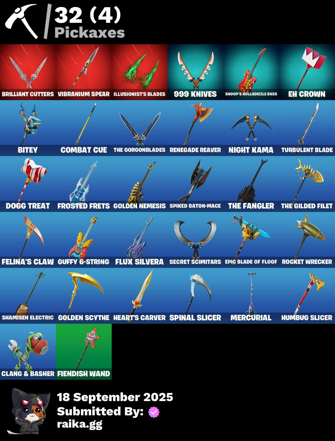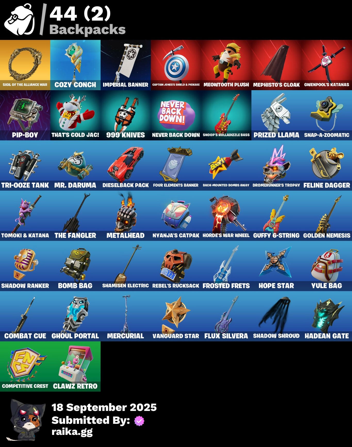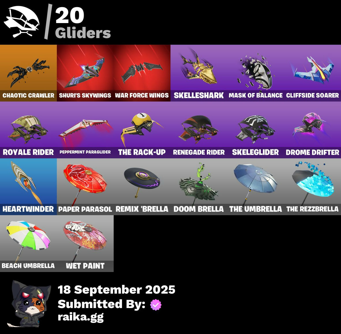 1-Ball, 10-Ball, 999 Knives, Aerial Assault Bomber, Aerial Assault Captain, Aerial Assault Trooper, Aerial Classic, Aerial Swagger, Babygirl!!!, Back-Mounted Bombs Away, Banner, Banner Icon, Battle Bus, Beach Umbrella, Bird Call, Birthday Bud, Bitey, Bomb Bag, Brilliant Cutters, Brite & Speedy, Captain Jones's Shield & Pickaxe, Captain Llamerica, Cauldron Chill, Cerberus Bite, Chalked Up 1-Ball, Chaos Directive, Chaos Director, Chaotic Crawler, Choose Naughty, Clang & Basher, Clawz Retro, Cliffside Soarer, Combat Cue, Comet, Competitive Crest, Controlled Chaos, Corrosive Stripe, Cozy Conch, Crashed Chiller, Crashed Shield, Crazy Castle, Crowning Achievement, Da Bomb, Dieselback Pack, Dogg Treat, Doom Brella, Drome Drifter, Dromerunner's Trophy, Dyna-Boom!, Dynamic Tntina, E.G.O., EH Theme, Eh Crown, Elemental Cycle, Emma's Influence, Epic Blade Of Floof, Eternal Renegade, Falling Leaf, Felina, Felina's Claw, Feline Dagger, Fiendish Wand, Fish Hook, Fishy Flourish, Fist Bump, Flow Bones, Flux Silvera, Four Elements Banner, Frosted Frets, Fryangles, Gentleman's Dab, Ghoul Portal, Golden Grin, Golden Nemesis, Golden Scythe, Guffy 6-String, Gwenpool's Katanas, Gwettermann Jacket, Hadean Gate, Heart's Carver, Heartwinder, Hope Star, Hope's Look, Horde's War Wheel, Humbug Slicer, Illusion Master, Illusionist's Blades, Imperial Banner, Infinite Swirl, Jet Signals, Ka-Chooh!, LBC Signature, Laughing Skull, Lil' Tank, Lobby Classic, Machinist In Control, Make A Seat, Mask of Balance, Meowdas, Meowdas Mark, Meowtooth Plush, Mephisto, Mephisto's Cloak, Mercurial, Metalhead, Midnight Skye, Modern Rōnin, Mr. Daruma, MurkTide, Never Back Down, Never Yield, Nick Eh 30, Night Kama, Ninja Stance: Leo, Ninja Style, Number One, Nyanja's Catpak, Organic Diamond, Outta My Skull, Paper Parasol, Party Trooper, Peas Out, Peelverine's Attack, Peppermint Paraglider, Pip Bling, Pip-Boy, Prismatic Keepsakes, Prized Llama, Purr-Demonium, Radiant 1, Rebel Bubble, Rebel's Rucksack, Remix 'Brella, Renegade Racer, Renegade Reaver, Renegade Rebel, Renegade Rider, Respect The Peace, Rhythm Of Chaos, Rocket, Rocket Wrecker, Royale Rider, Salute, Santa Dogg, Secret Scimitars, Serpentine Summoning, Shadow Meowdas, Shadow Ranker, Shadow Shroud, Shadowgold, Shadowstruck Director, Shamisen Electric, Show 'Em Off, Shuri's Skywings, Sigil Of The Alliance War, Skatemonster, Skele-Dance, Skeleglider, Skelleshark, Skull Commander, Slayer Juice Wrld, Slow Clap, Snap-A-Zoomatic, Snoop's Holladizzle Bass, Spiked Baton-Mace, Spinal Slicer, Stacked!, Start Your Engines, Stormtrooper Samurai, Stuffie Selfie, Sweet Heart Tat, Tactical Guff, Tekk Yellow, That's Cold Jac!, The Break Shot, The Doctor Is In, The Fangler, The Gilded Filet, The Golden Mrow, The Gorgonblades, The One, The Rack-Up, The Rezzbrella, The Umbrella, Tomoki & Katana, Tree Keys, Tri-Ooze Tank, Turbulent Blade, Undercover Skye, Vanguard Star, Vibranium Spear, Vibrant Heart, Vibrant Star, Victory Brawl, War Force Wings, Wet Paint, What Do You See?, Woodblock Print Daigo, Woodblock Print Jade, Woodblock Print Nyanja, Wraith Commander, You Think You're The King?, Yule Bag, Yulejacket, Yulejacket's Blaster