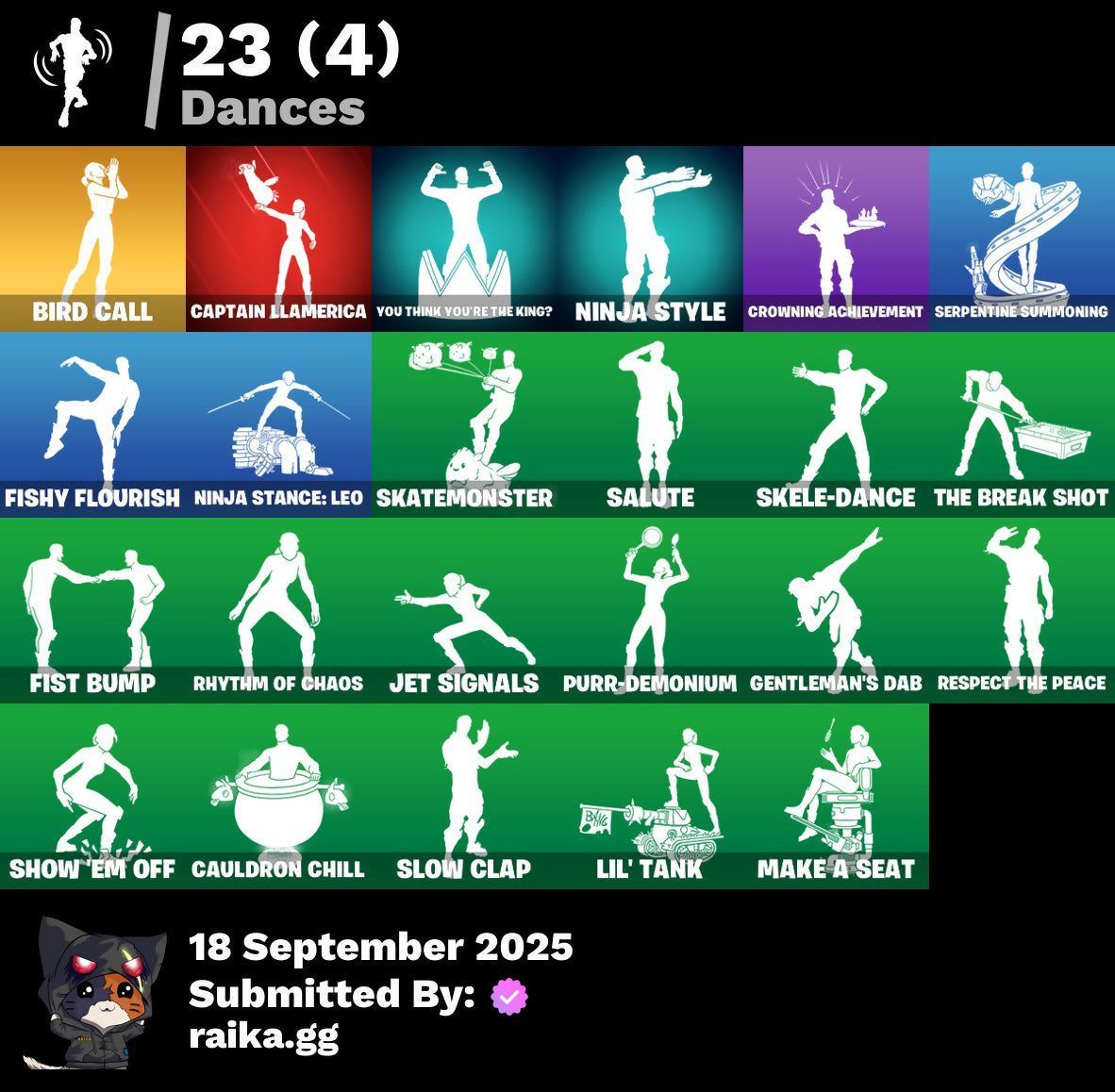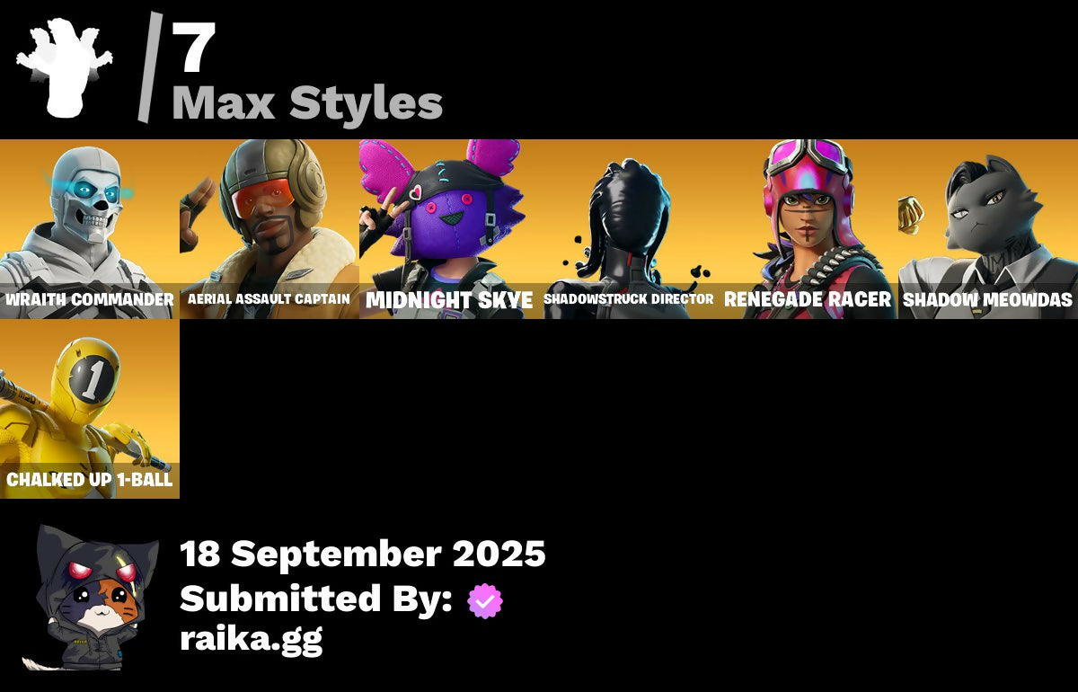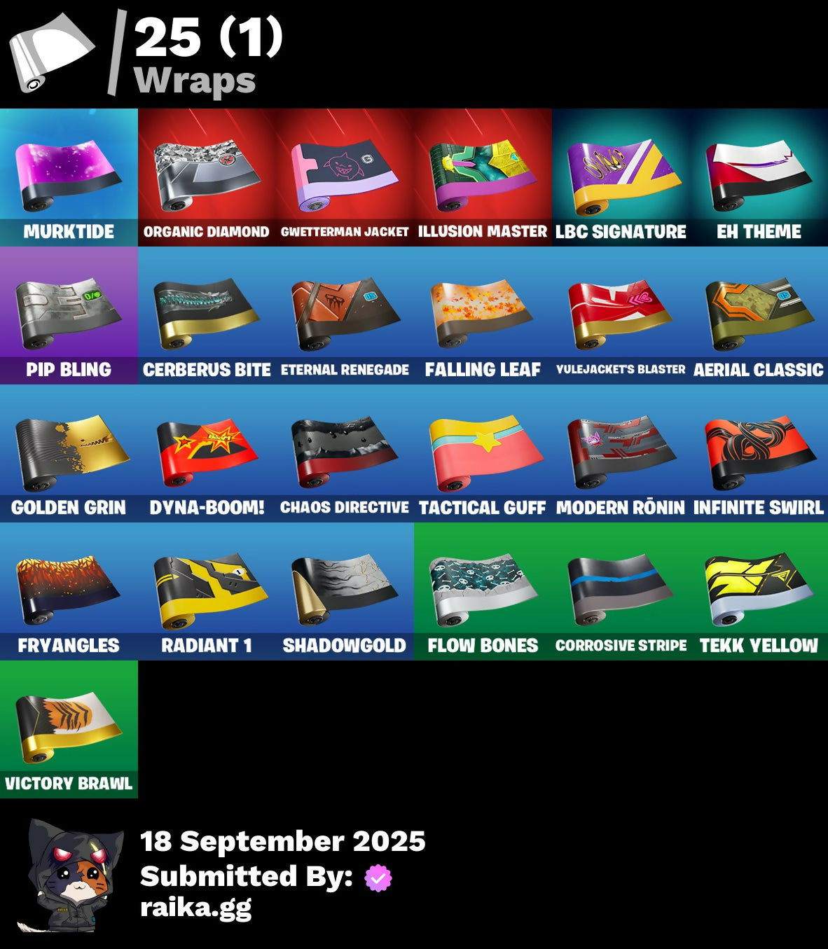 1-Ball, 10-Ball, 999 Knives, Aerial Assault Bomber, Aerial Assault Captain, Aerial Assault Trooper, Aerial Classic, Aerial Swagger, Babygirl!!!, Back-Mounted Bombs Away, Banner, Banner Icon, Battle Bus, Beach Umbrella, Bird Call, Birthday Bud, Bitey, Bomb Bag, Brilliant Cutters, Brite & Speedy, Captain Jones's Shield & Pickaxe, Captain Llamerica, Cauldron Chill, Cerberus Bite, Chalked Up 1-Ball, Chaos Directive, Chaos Director, Chaotic Crawler, Choose Naughty, Clang & Basher, Clawz Retro, Cliffside Soarer, Combat Cue, Comet, Competitive Crest, Controlled Chaos, Corrosive Stripe, Cozy Conch, Crashed Chiller, Crashed Shield, Crazy Castle, Crowning Achievement, Da Bomb, Dieselback Pack, Dogg Treat, Doom Brella, Drome Drifter, Dromerunner's Trophy, Dyna-Boom!, Dynamic Tntina, E.G.O., EH Theme, Eh Crown, Elemental Cycle, Emma's Influence, Epic Blade Of Floof, Eternal Renegade, Falling Leaf, Felina, Felina's Claw, Feline Dagger, Fiendish Wand, Fish Hook, Fishy Flourish, Fist Bump, Flow Bones, Flux Silvera, Four Elements Banner, Frosted Frets, Fryangles, Gentleman's Dab, Ghoul Portal, Golden Grin, Golden Nemesis, Golden Scythe, Guffy 6-String, Gwenpool's Katanas, Gwettermann Jacket, Hadean Gate, Heart's Carver, Heartwinder, Hope Star, Hope's Look, Horde's War Wheel, Humbug Slicer, Illusion Master, Illusionist's Blades, Imperial Banner, Infinite Swirl, Jet Signals, Ka-Chooh!, LBC Signature, Laughing Skull, Lil' Tank, Lobby Classic, Machinist In Control, Make A Seat, Mask of Balance, Meowdas, Meowdas Mark, Meowtooth Plush, Mephisto, Mephisto's Cloak, Mercurial, Metalhead, Midnight Skye, Modern Rōnin, Mr. Daruma, MurkTide, Never Back Down, Never Yield, Nick Eh 30, Night Kama, Ninja Stance: Leo, Ninja Style, Number One, Nyanja's Catpak, Organic Diamond, Outta My Skull, Paper Parasol, Party Trooper, Peas Out, Peelverine's Attack, Peppermint Paraglider, Pip Bling, Pip-Boy, Prismatic Keepsakes, Prized Llama, Purr-Demonium, Radiant 1, Rebel Bubble, Rebel's Rucksack, Remix 'Brella, Renegade Racer, Renegade Reaver, Renegade Rebel, Renegade Rider, Respect The Peace, Rhythm Of Chaos, Rocket, Rocket Wrecker, Royale Rider, Salute, Santa Dogg, Secret Scimitars, Serpentine Summoning, Shadow Meowdas, Shadow Ranker, Shadow Shroud, Shadowgold, Shadowstruck Director, Shamisen Electric, Show 'Em Off, Shuri's Skywings, Sigil Of The Alliance War, Skatemonster, Skele-Dance, Skeleglider, Skelleshark, Skull Commander, Slayer Juice Wrld, Slow Clap, Snap-A-Zoomatic, Snoop's Holladizzle Bass, Spiked Baton-Mace, Spinal Slicer, Stacked!, Start Your Engines, Stormtrooper Samurai, Stuffie Selfie, Sweet Heart Tat, Tactical Guff, Tekk Yellow, That's Cold Jac!, The Break Shot, The Doctor Is In, The Fangler, The Gilded Filet, The Golden Mrow, The Gorgonblades, The One, The Rack-Up, The Rezzbrella, The Umbrella, Tomoki & Katana, Tree Keys, Tri-Ooze Tank, Turbulent Blade, Undercover Skye, Vanguard Star, Vibranium Spear, Vibrant Heart, Vibrant Star, Victory Brawl, War Force Wings, Wet Paint, What Do You See?, Woodblock Print Daigo, Woodblock Print Jade, Woodblock Print Nyanja, Wraith Commander, You Think You're The King?, Yule Bag, Yulejacket, Yulejacket's Blaster