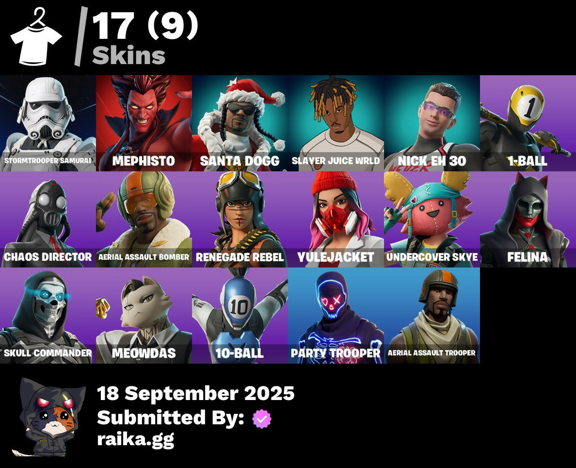 [PC/PSN/XBOX] 17 skins | Aerial Assault Trooper | Stormtrooper Samurai | Mephisto | Santa Dogg | Slayer Juice WRLD | Nick Eh 30 | 1-Ball | Chaos Director | 0 VB / Fortnite