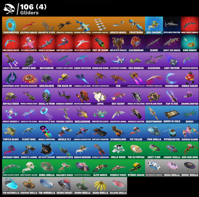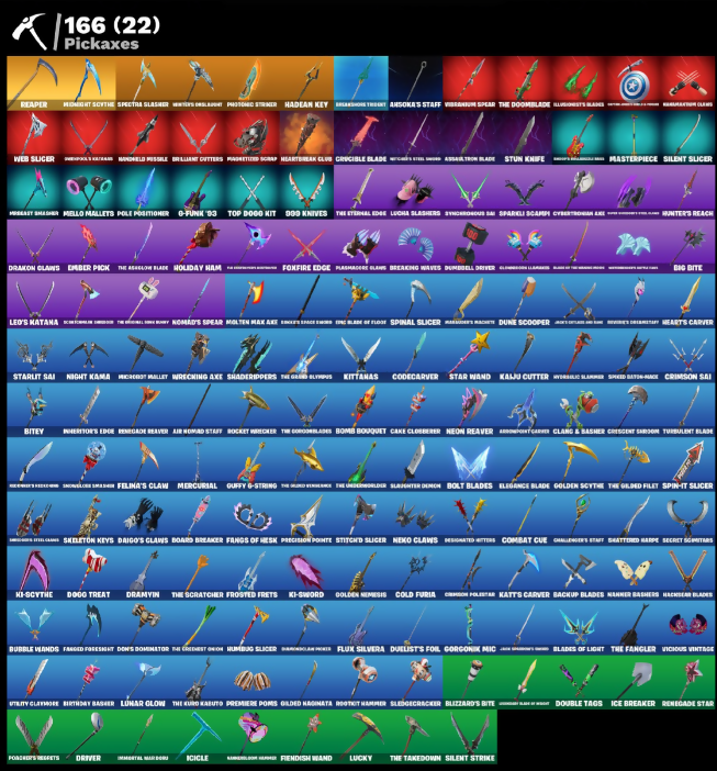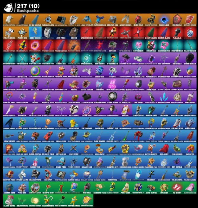 1.39 Power Armor, 909 Drives, 999 Knives, AXO, Access Core, Adult Ashley Robot, Adventure Aerial, Aero's Cutlass Axe, Afr, Ahsoka Tano, Ahsoka's Staff, Air Nomad Staff, Alarm’s Speaker, Alias, Amazing Cube, Ancestral Blob, Angels Battle Bag, Antonia, Apex Archer, Aphrodite, Appa, Arctic Adeline, Ares, Arm Max 1" 86, Arrowpoint Carver, Artemis, Aspmr Keys, Assault Iron Blade, Aura, Auto Glitch, Autobot Omega, Avatar Cycle, Avatar Flourish, Avatar State Aang, Axcioner Square, B.R.A.T.T.E. Gunner, Backup Blades, Bad Guy, Balanceboard, Bam Bam Boom, Basement Key, Bash, Bat Royale, Battle Bout/Bout, Battle Prep, Battlefit Outfits, Battlefun Calv., Baymax Wings, Beach Breezer, Beast Blastin', Beatzbunny, Bedside Humner, Bello Bag, Berserk Space Hook, Big Bite, Big Fan, Bikram Wings, Billy, Billy Bounce, Billy’s Tricycle, Bird Call, Birthday Basher, Bitey, Bitter Streets, Bizouchito, Blabal Stripe, Black Hole, Blades of Light, Blizzard's Bite, Blondbang Side, Board Breaker, Boba Bling, Bolt Blades, Bomb Bag, Bomb Bouquet, Bone of Awkarek, Bongoro, Bonz-Or, Boogie Domain, Boom Shack, Boom Slaver, Boomstick Explosives, Bounce Wit’ It, Bow Reclas, Boz Nailary, Breaking Waves, Breezabelle, Brief Moves, Bright Around, Brilliant Cutters, Brite Raider, Bubble Wands, Buddy Bag, Bugsy, Bullseye, Buzzsaw Breacher, Bye Bye Bye, Cacodemon, Cake Clobberer, Calico-Conut, Called Shot, Cap Kick, Captain Cameron, Captain Jones, Captain's Glider, Card Drop, Caseborn, Cauldron Chill, Cazadora, Cerberus, Challenger's Staff, Champion Brash, Champion Kumdo, Chaos Director, Chaotic Crawler, Chickenwing In The Grange (radio), Chiefs, Chip’s Special, Cholo Down, Chronos Logic, Chuck Pack, Clang & Basher, Clap Snap Elliot 44, Clara, Clawdown, Clawel Retro, Cliffside Soarer, Clinical Crosser, Clone Trooper, Codecarver, Cold Furia, Combat Cue, Comet, Commander Tilted, Commander’s Descent, Company Jig, Competitive Crew, Competitor's The Brella, Conch Call, Cool Kicks/Flip Flop, Corrupted Group, Corrupted Irong, Corrupted Paul, Cosmic Bitflare, Council Fintus, Count It, Coups Dash, Cozy Crocce, Crack It, Crescent Groan, Crimson Polestar, Crimson Sai, Crucible Blade, Crystal Spirit, Cursed Energy, Cybertronian Axe, Cyborgirl, D-Double G, D-Rune '13, Dahlia, Daigo, Daigo's Claws, Dance Monkey, Dancin Domino, Dark Raider, Dead/Ftn Out, Deadpool, Death Hog, Deck Ducky, Delivery Diver, Dembosssian Flow, Denied, Designated Hitters, Detonator, Dft, Diamond Throne, Diamondclaw Picker, Dicee Roll, Disassemble, Do The Split, Dogg Treat, Doggo, Don't Start Now, Dons Dominator, Doom, Doom Brella, Doom's Cloak, Double Malgea, Double Tags, Double-Barreled Boom Ballista, Doze Dab, Dragon Claws, Dragon Style Varys, Dramata Flairs, Dramyin, Drawing Claw Side Dog, Draytun, Dreadfang Tident, Drift Off Pocket It, Drippin’ Flavor, Driver, Drome Drifter, Drone Fighter, Duelist's Foil, Dumbbell Driver, Dune Scooper, Durrr Taysho, Dusty, Dutch Assassin, Dynamo Tinina, Eclipse Brella, Edge Blade of Floor, Electro Shuffle, Elegance Blade, Elite Servo, Ember Pick, Emberclaw, Emma Frost, Era, Etheria, Eve Plan, Exo-Intellect, Expert’s Demsage, Expirationishun, Face Palm, Fang Dance, Fanged Foresight, Fangs of Hesk, Felina, Felina's Claw, Felne Dagger, Festive Lumiera, Fiendish Wand, Finger Stumbles, Finger Wag, Fire Show, Firewalker Vayne, Fish Thicc, Fish-Bot, Fissuristn Jakrit, Fist Bump, Fist of Doom, Flaky Feast, Flight Risk, Flip Flyer, Flippin’ Sexy, Floating Island, Flux Glenda, Flux Silvera, Fly Trap, Focus, Focused, Foie/Flex, For Lady, Foxfire Edge, Freak Collara, Frook’s Stunt, Frostburn, Frostfed Frets, G-Funk '83, Gage, Galaxi-Run, Gazorda Horns, Geometrik, Geralt of Rivia, Get Griddy, Gingerbread Sniar, Glided Hanomata, Glidersong Lilmarks, Glitch & Dangerg, Glitter, Goku Black, Golden Minion, Golden Nemesis, Golden Scythe, Good Guy, Gorgonach Mic, Gorgonic Mic, Gorgon’s Seeds, Grand Glacier Glider, Grind Bag, Ground Pound, Guerrilla Dominion, Guffy & Strong, Guffy G-String, Gwenpool, Hackser Blades, Hadean Chariot, Hadean Gate, Hadean Key, Hades, Hana Bag, Handheld Missile, Har-Har-Har!, Have A Seat, Havi, Haxzaur, Heart Of A King, Heart's Carver, Heartbeat, Heartbreak Club, Heartwinder, Heart’s Rest, Heist Flier, Helicobopper, Heliridance, Helocslash, Helsie, Hemolskun, Hero Baymax, High Society Glider, Highwire, Hindruklas Flame, Hobo Boot Pack, Hogpablums, Holiday Boxy, Holiday Ham, Holiday Hiwent, Hope, Hope Star, Hoshi, Howl, Humbug Slicer, Hunter's Delight, Hunter's Reach, Huntress Lyre, Hypnot-Eyes, Hypnotic, Ice Breaker, Ice Space Mind, Icicle, Iluminosity's Blades, Imani, Immolation Claws, Immortal Marauder, Inbox Lacerity, Indy Evangerson, Infectious, Infield Fly, Infinite Dab, Inflate-A-Roach, Invasion from Qties, Inventor's Edge, Invisible Cut, Ion, Ioni Sign, Iron Man Mk 49, Ironclat Blason, It’s A Vibe, It’s True, I’m A Mystery, Jack Sparrow, Jack Sparrow's Sword, Jack's Ride, Jack's Ship, Jade, Jar Of Dirt, Jawbreaker, Jazz Hands, Jet Signals, Jobi Slide, John Silverfish, Jubilation, Juice WRLD, Jump R Bordon, Junker 'Brella, Kado Thorne, Kaiju Cutter, Kander Buddy, Kata-Pack, Katt's Carver, Kendo, Khary Lane, Ki-Scythe, Ki-Sword, Kibo, King Wings, Kitara, Kittanas, Knucklebow Vampr, Korra, Korra's Air Glider, Krang, Kronron Runner, Kyken Skedaddle, LBC '93 Dogg, Lady of Cranes, Lana Llane, Larkhorn Baby Rat, Leap Bold, Leaplord Shield, Leelah, Leo's Katana, Leo's Saya, Leonardo, Lie Longboat, Light It Up, Likely Loomdex, Lil Jet Set, Lil Princer, Lil Spout, Lil' Podracer, Lil’ Diplosoculus, Lil’ Supercar, Lil’ Tank, Lil’ Turtle Van, Litte Overgrown, Lorenzo, Loserfruit, Lost Meteor, Lt Black Heart, Lucha Slashers, Lucid Dreams, Lucky, Lumi Jellie, Lunar Glow, Lunar Hyperjet, Lunar Party, Lunar Skyspan, Lunard's Rocket, Lunaria’s, Ma-Ti-Hi, Madcap, Mae, Magnetic Cyberdog, Magnetic Steps, Magnetized Scrap, Make A Seat, Mariposa, Marsden's Reach, Marsh Walk, Marshmello, Mask of Balance,