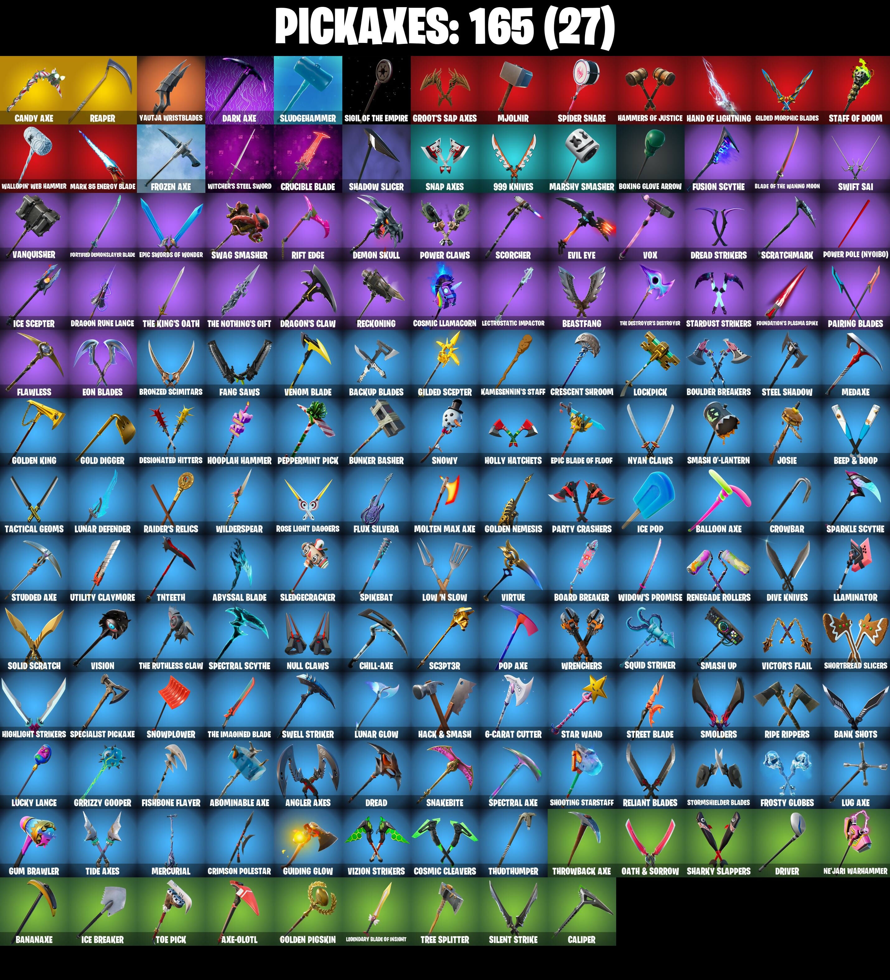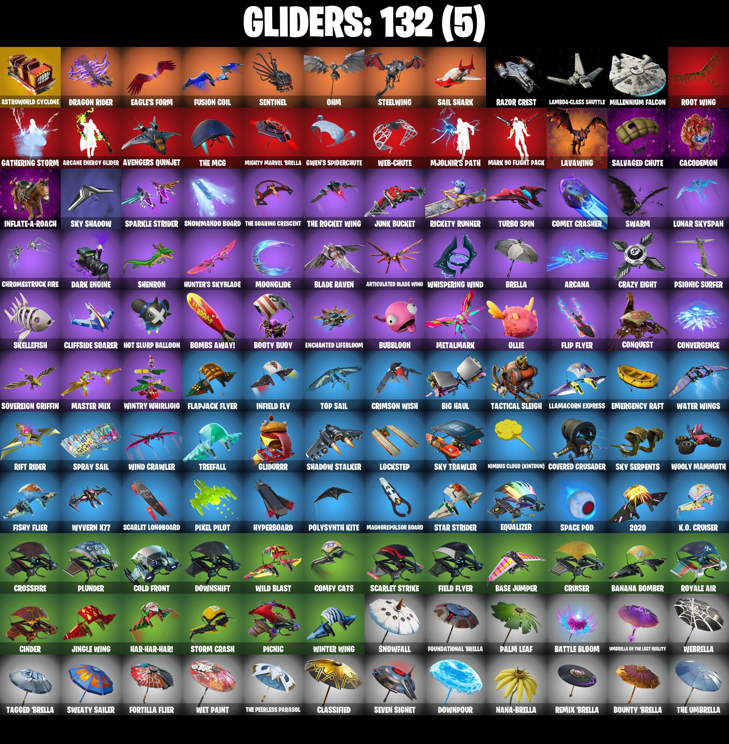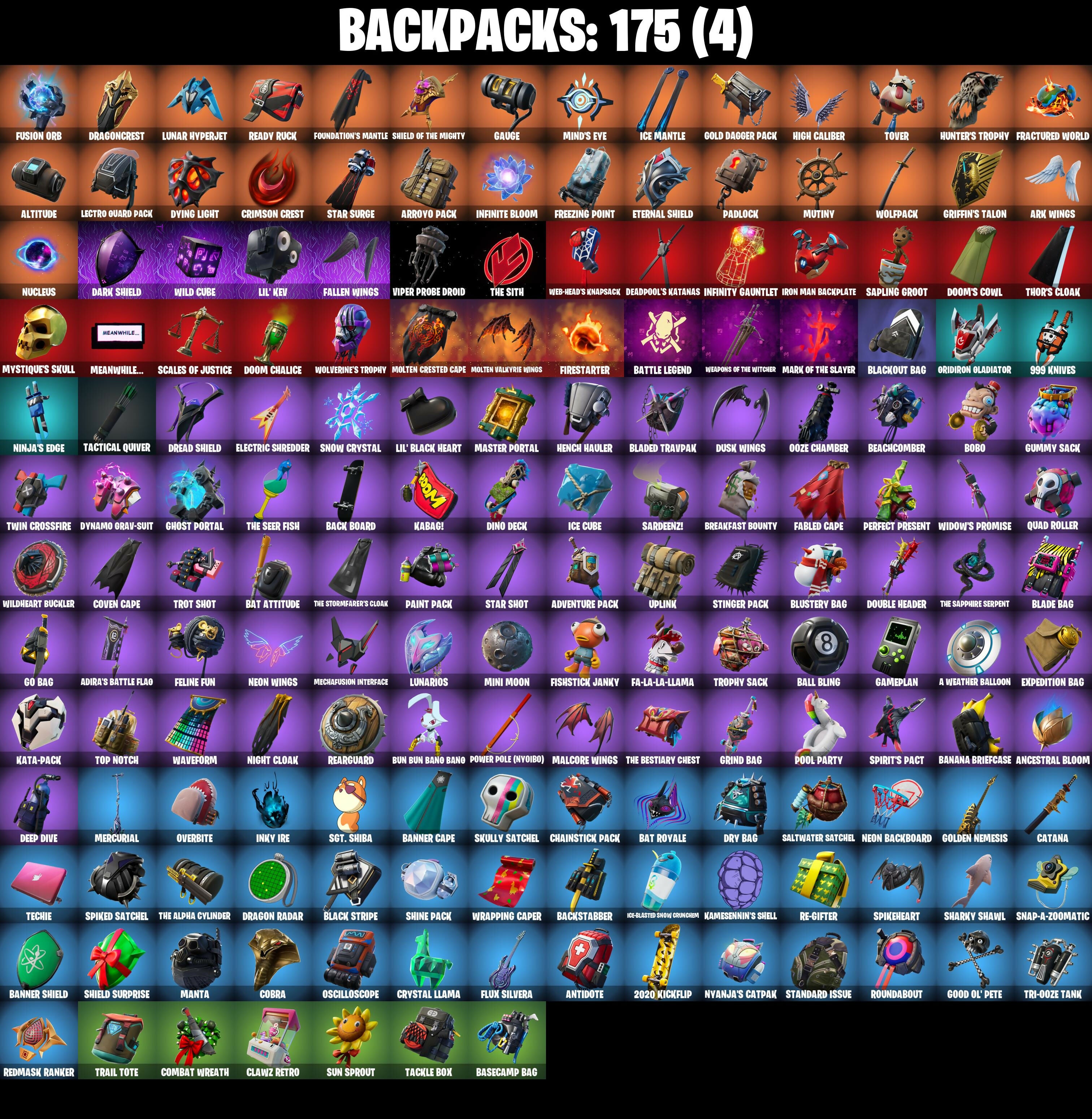 2020, 2020 Kickflip, 6-Carat Cutter, 8-Ball vs Scratch, 999 Knives, A Warrior Prepares, A Weather Balloon, Abominable Axe, Abyssal Blade, Adira, Adira (Battle Mask), Adira's Battle Flag, Adventure Pack, Agent Peely, Air Horn, Air Shredder, Altitude, Ancestral Bloom, Angler Axes, Antidote, Arachrobatics, Arcana, Arcane Energy Glider, Arctic Adeline, Ark, Ark Wings, Around The Clock, Arrovo Pack, Arsenz, Articulated Blade Wing, Astro Armor, Astroworld Cyclone, Avengers Quinjet, Axe-Ololt, Axo, Azuki, Back Board, Backstabber, Backup Blades, Balance Board, Ball Bling, Balloon Axe, Banana Bomber, Banana Briefcase, Bananaxe, Bank Shots, Banner Cape, Banner Shield, Base Jumper, Basecamp Bag, Bat Attitude, Bat Royale, Battle Bloom, Battle Legend, Beachcomber, Beastfang, Beep & Boop, Beep Beep, Beerus, Bhangra Boogie, Big Haul, Billy Bounce, Black Stripe, Black Werewolf, Blackheart, Blackheart (Stage 8), Blackout Bag, Blade Bag, Blade Raven, Blade of the Waning Moon, Bladed Travpak, Blaze, Blowin' Up, Blowing Bubbles, Blustery Bag, Board Breaker, Bobo, Boing!, Bombs Away!, Boomin', Boosting Ki, Booty Buoy, Boulder Breakers, Bounty 'Brella, Boxing Glove Arrow, Branded Brawler, Breakfast Bounty, Breakneck, Breezy, Brella, Brite Bomber, Bronzed Scimitars, Bubloon, Bullseye, Bully, Bulma, Bun Bun Bang Bang, Bunker Basher, Bunker Jonesy, Bytes, Bytes (Lone Traveler), Cacodemon, Calamity, Calamity Stage 5, Calculated, Caliper, Call Me, Cameo vs Chic, Candy Axe, Cat Flip, Catalyst, Catana, Chainstick Pack, Chaos Agent, Charging Up, Chill-Axe, Choice Knit, Chromestruck Fire, Cinder, Classified, Clawz Retro, Clean Sweep, Cliffside Soarer, Cluck Strut, Clutch, Cobra, Coin Flip, Cold Front, Combat Wreath, Comet Crasher, Comfy Cats, Comfy Chomps, Conga, Conquest, Convergence, Cosmic Cleavers, Cosmic Llamacorn, Coven Cape, Covered Crusader, Cozy Chomps, Crazy Eight, Crescent Shroom, Crimson Crest, Crimson Polestar, Crimson Wish, Crossfire, Crowbar, Crowning Achievement, Crucible Blade, Cruiser, Crystal Llama, Cyclo Curl, DJ Yonder, Dabstand, Dark Axe, Dark Engine, Dark Jonesy, Dark Red Knight, Dark Shield, Dark Wild Card, Darth Vader, Deadpool, Deadpool Unmasked, Deadpool's Katanas, Deep Dive, Deep End, Demon Skull, Derby Dynamo, Designated Hitters, Diamond Diva, Dino Deck, Dire, Dive Knives, Doctor Doom, Doctor Doom (God Emperor), Doom Chalice, Doom Slayer, Doom's Cowl, Double Header, Downpour, Downshift, Dragon Radar, Dragon Rider, Dragon Stance, Dragon's Claw, Dragoncrest, Dragoon Rune Lance, Dread, Dread Fate, Dread Shield, Dread Strikers, Drift, Drift Stage 5, Driver, Droop, Dry Bag, Dusk, Dusk Wings, Dusty, Dying Light, Dynamo Grav-Suit, Eagle's Form, Electric Shredder, Electro Shuffle, Electro Swing, Electrostatic Impactor, Ember, Emergency Raft, Enchanted Lifebloom, Eon Blades, Epic Blade of Floof, Epic Swords of Wonder, Equalizer, Eternal Knight, Eternal Shield, Eternal Voyager, Evie, Evie (Summer Strider), Evil Eye, Expedition Bag, Fa-La-La-Llama, Fable, Fabled Cape, Face Palm, Fade, Fallen Love Ranger, Fallen Wings, Fancy Feet, Fang Saws, Featherweight, Feelin' Jaunty, Feline Fun, Field Flyer, Fierce, Firestarter, Firewalker, Fishbone Flayer, Fishin', Fishstick, Fishstick Janky, Fishy Flier, Flamenco, Flapjack Flyer, Flawless, Flip Flyer, Flippin' Away, Flippin' Sexy, Flux, Flux Silvera, Focused, Fortified Demonslayer Blade, Fortilla Flier, Foundation's Mantle, Foundation's Plasma Spike, Foundational 'Brella, Fractured World, Free Flow, Freezing Point, Frost Squad, Frostbite, Frosty Globes, Frozen Axe, Fusion, Fusion Coil, Fusion Orb, Fusion Scythe, Fusion! Hah!!, Galaxia, Galaxy Scout, Gameplan, Gangnam Style, Gathering Storm, Gauge, Gear Specialist Maya, Gear Specialist Maya (Hat - Dark), Gentleman's Dab, Geralt of Rivia, Get Funky, Get Griddy, Ghost Portal, Giddy-Up, Gilded Morphic Blades, Gilded Scepter, Glidurr, Glowsticks, Go Bag, Gold Brutus, Gold Dagger Pack, Gold Digger, Gold Meowscles, Gold Midas, Golden King, Golden Nemesis, Golden Pigskin, Golf Clap, Good Ol' Pete, Green Arrow, Griffin's Talon, Grind, Grind Bag, Grizzy Gooper, Groot, Groot (Silver Foil), Groot's Sap Axes, Ground Pound, Grriz, Guiding Glow, Gum Brawler, Gumbo, Gummy Sack, Gwen's Spiderchute, Hack & Smash, Hammers of Justice, Hand of Lightning, Happy, Har-Har-Har!, Harlowe, Haven, Hazard, Hello Friend, Hench Hauler, High Caliber, High Five, Highlight Strikers, Hit It, Holly Hatchets, Hoop Master, Hooplah Hammer, Hot Marat, Hot Slurp Balloon, Hula Hoopin', Human Bill, Hunter's Skyblade, Hunter's Trophy, Huntress, Hush, Hybrid, Hybrid (Stage 4), Hyperboard, Hypernova, I Declare!, Ice Breaker, Ice Cube, Ice King (Gold), Ice Mantle, Ice Pop, Ice Scepter, Ice-Blasted Snow Crunchern, Igni Sign, Imperial March, Indiana Jones, Indiana Jones (Temple Explorer), Infield Fly, Infinite Bloom, Infinite Dab, Infinity Gauntlet, Inflate-A-Roach, Inky Ire, Iris, Iron Man Backplate, It Is Finished, It's Go Time!, It's... You?, Jaywalking, Jennifer Walters, Jingle Wing, Josie, Journey vs Hazard, Jules, Jump Around, Junk Bucket, K.O. Cruiser, Kabag!, Kamesennin's Shell, Kamesennin's Staff, Kata-Pack, Keep It Mello, Keyed Up, Kit, Kondor, Krisabelle, Lambda-Class Shuttle, Laser Focused, Last Forever, Laugh It Up, Lavawing, Leapin', Lectro Guard Pack, Legendary Blade of Insight, Lennox Rose, Lexa, Lil' Black Heart, Lil' Kev, Lil' Monster, Lil' Prancer, Lil' Warthog, Living Large, Llamacorn Express, Llaminator, Lock It Up, Lockpick, Lockstep, Love It!, Low 'N Slow, Lt. Evergreen, Lt. John Llama, Lucky Lance, Lug Axe, Lunar Charge, Lunar Defender, Lunar Glow, Lunar Hyperjet, Lunar Party, Lunar Skyspan, Lunarios, Luxe, Luxe (Gold Clothing), Lynx, Lynx (Stage 4 - No Ponytail), Magnorepulsor Board, Malcore, Malcore Wings, Malik, Malik (Solitary Defender), Mancake, Mandalorian, Mandalorian (Clothing), Manta, Mark 85 Energy Blade, Mark 90 Flight Pack, Mark Of The Slayer, Marked Marauder, Marshy Smasher, Mashed Potato, Masked, Massai, Master Chief, Mas