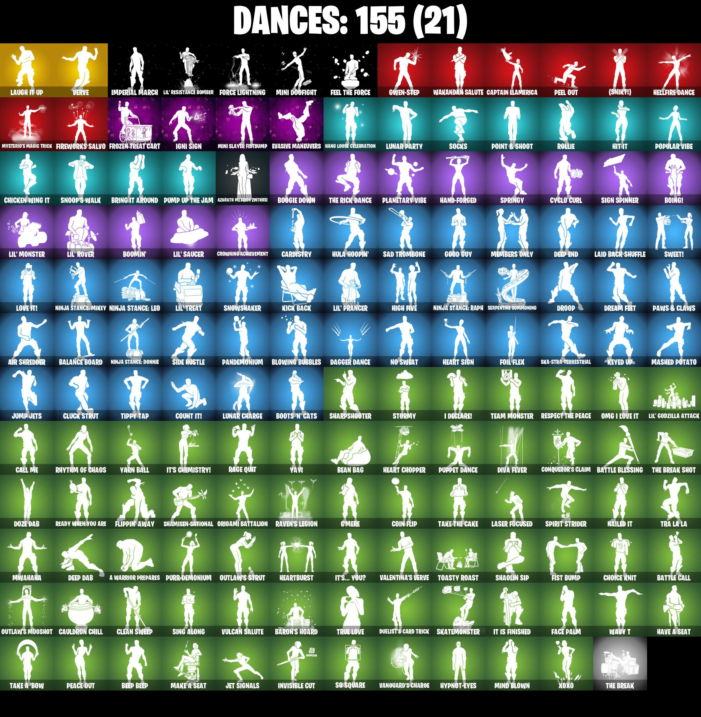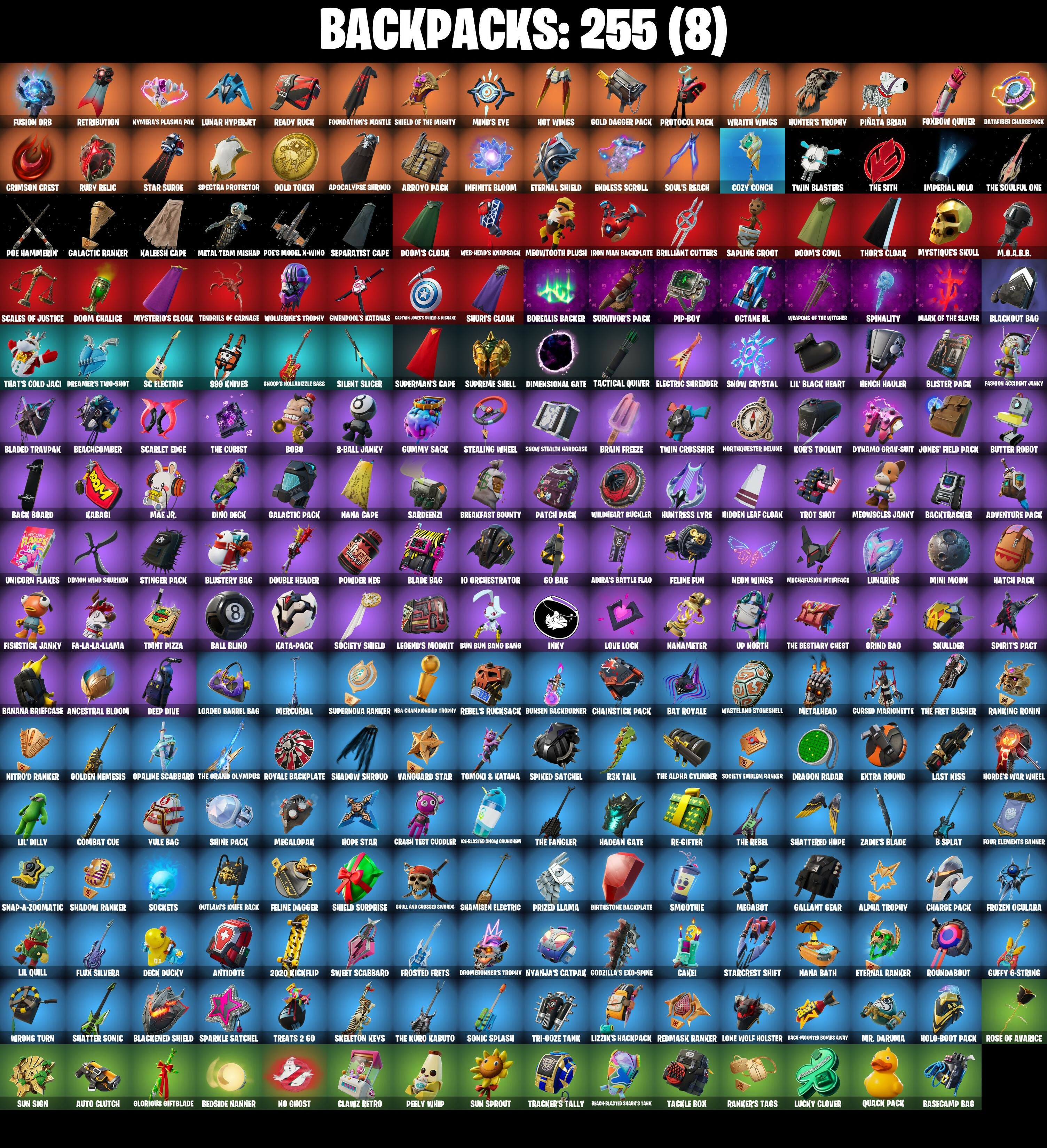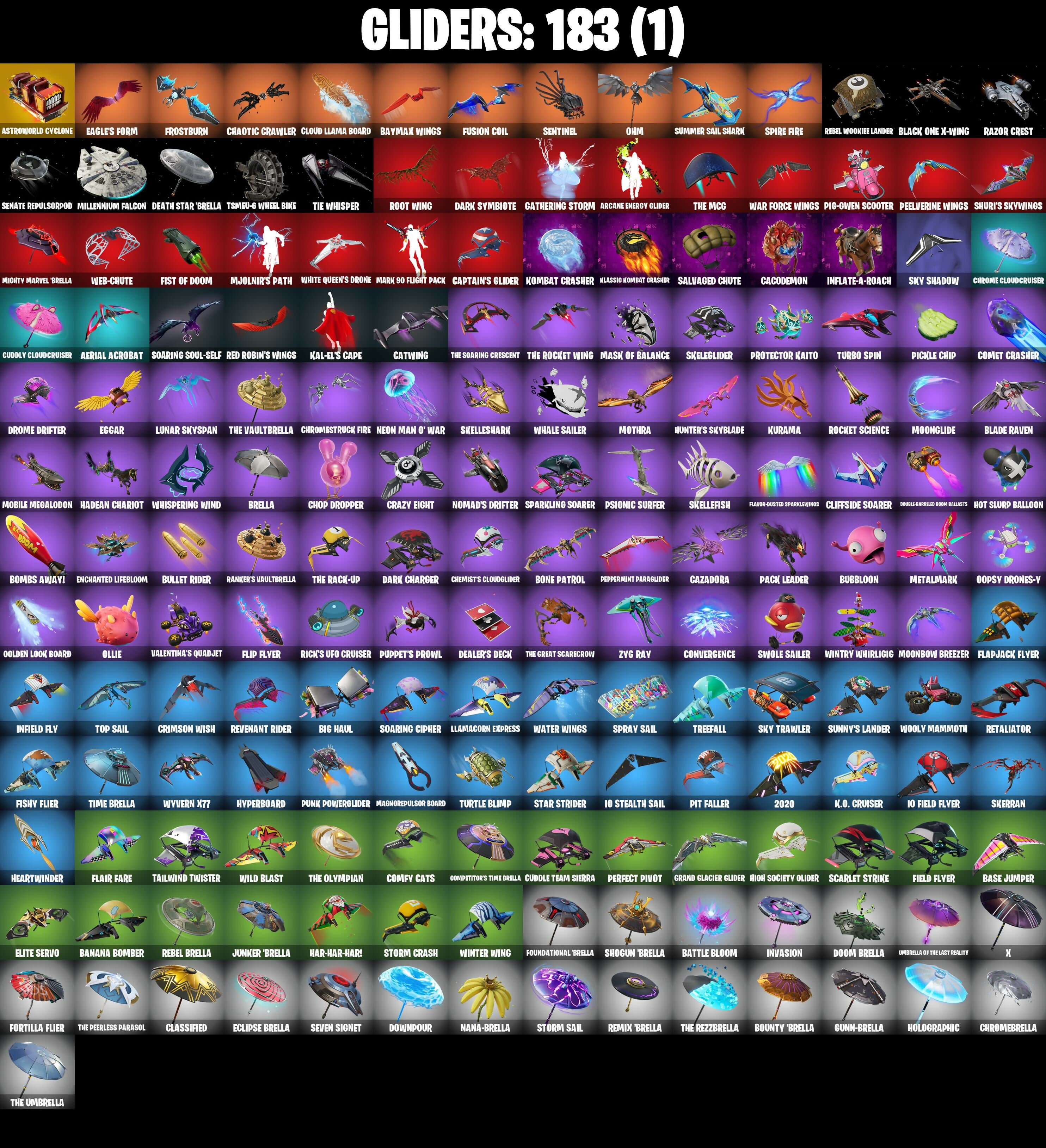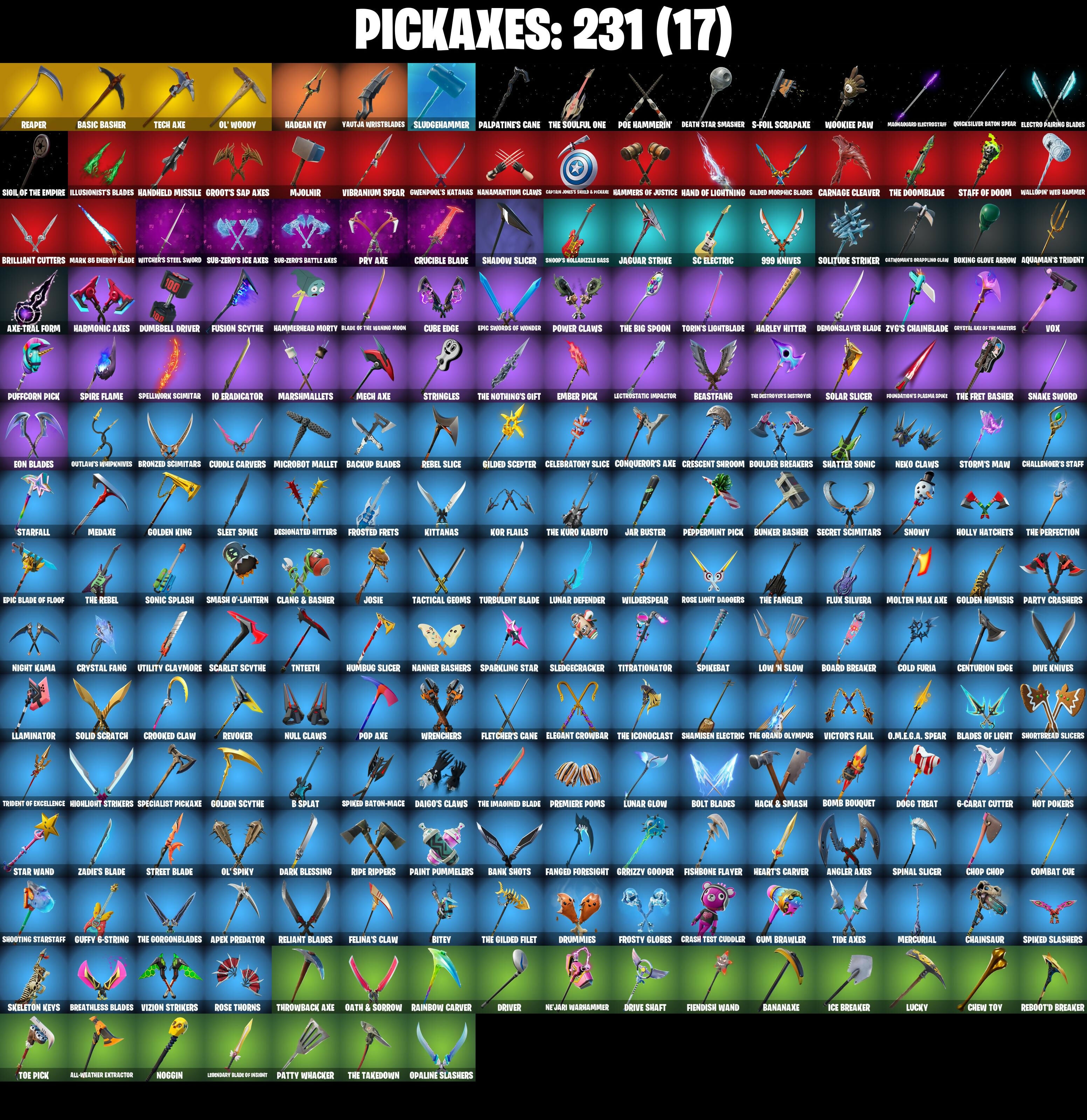 (Snik†), 1-Ball, 10 Eradicator, 2020, 2020 Kickflip, 6-Carat Cutter, 8-Ball Janky, 8-Ball vs Scratch, 999 Knives, A Warrior Prepares, Adira's Battle Flag, Adventure Pack, Aerial Acrobat, Agent Jones, Agent Jones (Jump 31), Agent Peely, Air Shredder, All-Weather Extractor, Alpha Trophy, Ancestral Bloom, Angler Axes, Antidote, Apex Predator, Apocalypse Shroud, Apprentice Evie, Aquaman, Aquaman's Trident, Arcane Energy Glider, Arctic Adeline, Arroyo Pack, Arthur Curry, Astro Armor, Astroworld Cyclone, Aura, Auto Clutch, Axe-Tral Form, Azarath Metrion Zinthos!, B Splat, Back Board, Back-Mounted Bombs Away, Backtracker, Backup Blades, Balance Board, Ball Bling, Banana Bomber, Banana Briefcase, Bananaxe, Bank Shots, Baron's Hoard, Base Jumper, Basecamp Bag, Basic Basher, Bat Royale, Battle Blessing, Battle Bloom, Battle Call, Baymax Wings, Beachcomber, Bean Bag, Beastfang, Bedside Manner, Beep Beep, Bi-Han, Big Dill, Big Haul, Birtstone Backplate, Bitey, Black, Black One X-Wing, Black Panther (Shuri), Black Queen, Blackened Shield, Blackout Bag, Blade Bag, Blade Raven, Blade of the Waning Moon, Bladed Travpak, Blades of Light, Blister Pack, Blowing Bubbles, Blustery Bag, Board Breaker, Bobble-Button Quack's Twerk, Bobo, Boing!, Bolt Blades, Bomb Bouquet, Bombs Away!, Bone Patrol, Boogie Down, Boomin', Boots 'n' Cats, Borealis Backer, Boulder Breakers, Bounty 'Brella, Boxing Glove Arrow, Bracer, Brain Freeze, Breakfast Bounty, Breathless Blades, Brella, Brilliant Cutters, Bring It Around, Bronzed Scimitars, Bubbloon, Bullet Rider, Bun Bun Bano Bano, Bunker Basher, Bunker Jonesy, Bunnymoon, Bunsen Backburner, Butter Robot, Bytes, Bytes (Lone Traveler), C'Mere, Cacodemon, Cake!, Call Me, Cameo vs Chic, Cammy, Captain Jones, Captain Jones's Shield & Pickaxe, Captain Llamerica, Captain's Glider, Cardistry, Carnage, Carnage (Maximum), Carnage Cleaver, Cassidy Quinn, Catwing, Catwoman Zero, Catwoman's Grappling Claw, Cauldron Chill, Cazadora, Celebratory Slice, Centurion, Centurion Edge, Chainsaur, Chainstick Pack, Chalked Up 1-Ball, Challenger's Staff, Chaos Director, Chaotic Crawler, Charge Pack, Charlotte, Chemist's Cloudglider, Chew Toy, Chicken Wing It, Choice Knit, Chop Chop, Chop Dropper, Chrome Cloudcruiser, Chromebrella, Chromestruck Fire, Clang & Basher, Clark Kent, Clark Kent (Superman), Classic Peelverine, Classified, Clawz Retro, Clean Sweep, Cliffside Soarer, Clinical Crosser, Cloud Llama Board, Cluck, Cluck (Slurpy), Cluck Strut, Coin Flip, Cold Furia, Combat Cue, Comet Crasher, Comfy Cats, Competitors Time Brella, Conqueror's Axe, Conqueror's Claim, Convergence, Count It!, Cozy Commander, Cozy Conch, Crash Test Cuddler, Crazy Eight, Crescent Shroom, Crimson Crest, Crimson Wish, Crooked Claw, Crowning Achievement, Crucible Blade, Crystal Axe of the Masters, Crystal Fang, Cube Assassin, Cube Edge, Cuddle Carvers, Cuddle Team Sierra, Cuddle Team Specialist, Cuddly Cloudcruiser, Cursed Marionette, Cyclo Curl, D'Ark, Dagger Dance, Daigo, Daigo's Claws, Dancefloor Diva, Dark Blessing, Dark Charger, Dark Symbiote, Datafiber Chargepack, Deadpool, Deadpool Unmasked, Dealer's Deck, Death Star 'Brella, Death Star Smasher, Deck Ducky, Deep Dab, Deep Dive, Deep End, Demi, Demi (Night), Demon Hunter Hope, Demon Wind Shuriken, Demonslayer Blade, Designated Hitters, Diamond Diva, Dillinger The Otherk, Dimensional Gate, Dino Deck, Diva Fever, Dive Knives, Dizzie, Doctor Doom, Doctor Doom (OOD Emperor), Doctor Slone, Doctor Slone (Prismatic), Dogg Treat, Doom, Doom Brella, Doom Chalice, Doom Slayer, Doom's Cloak, Doom's Cowl, Double Header, Double-Barreled Boom Ballasts, Downpour, Doze Dab, Dragon Radar, Dream Feet, Dreamer's Two-Shot, Drive Shaft, Driver, Drome Drifter, Dromerunner's Trophy, Droop, Drummies, Duelist's Card Trick, Dumbbell Driver, Dummy, Dusk Knight, Dusty, Dynamo Grav-Suit, Eagle's Form, Eclipse Brella, Eggar, Electric Shredder, Electro Pairing Blades, Elegant Crowbar, Elite Servo, Ember Pick, Emma Frost, Emperor Palpatine, Enchanted Lifebloom, Endless Scroll, Energized Godzilla, Eon Blades, Epic Blade of Floof, Epic Swords of Wonder, Eternal Knight, Eternal Ranker, Eternal Shield, Evasive Maneuvers, Extra Round, Fa-La-La-Llama, Fabio Sparklemane, Face Palm, Fade, Fanged Foresight, Fashion Accident Janky, Feel The Force, Felina, Felina's Claw, Feline Dagger, Feline Fun, Field Flyer, Fiendish Wand, Fireworks Salvo, Fishbone Flayer, Fishstick Janky, Fishy Flier, Fist Bump, Fist of Doom, Flair Fare, Flapjack Flyer, Flavor-Dusted Sparklingwing, Fletcher Kane, Fletcher's Cane, Flip Flyer, Flippin' Away, Flux Silvera, Foil Flex, Force Lightning, Fortilla Flier, Foundation's Mantle, Foundation's Plasma Spike, Foundational 'Brella, Four Elements Banner, Foxbow Quiver, Frost Squad, Frostburn, Frosted Frets, Frosty Globes, Frozen Oculara, Frozen Treat Cart, Full Moon Fletcher Kane, Fusion, Fusion Coil, Fusion Orb, Fusion Scythe, Galactic Pack, Galactic Ranker, Gallant Gear, Gathering Storm, Gear Specialist Maya, General Grievous, Geralt of Rivia, Gilded Morphic Blades, Gilded Scepter, Glorious Giftblade, Go Bag, Godzilla Evolved, Godzilla's Exo-Spine, Gold Brutus, Gold Dagger Pack, Gold Midas, Gold Token, Golden Conqueror, Golden King, Golden Look Board, Golden Nemesis, Golden Scythe, Good Guy, Grand Glacier Glider, Green Arrow, Grind Bag, Grizzly Gooper, Groot, Groot (Silver Foil), Groot's Sap Axes, Grriz, Guardian Jade, Guffy 6-String, Guffy G-String, Guggimon, Guggimon (Prismatic), Gum Brawler, Gumbo, Gumbo (Sour), Gummy Sack, Gunn-Brella, Gunslinger Outlaw Midas, Gwen-Step, Gwenpool, Gwenpool's Katanas, Hack & Smash, Hadean Chariot, Hadean Gate, Hadean Key, Hammerhead Morty, Hammers of Justice, Hand of Lightning, Hand-Forged, Handheld Missile, Hang Loose Celebration, Happy, Har-Har-Har!, Harley Hitter, Harlowe, Harlowe (Helmet), Harmonic Axes, Hatch Pack, Have A Seat, Haven, Hazard, Head (Droopy), Heart Chopper, Heart Sign, Heart's Carver, Heartburst, Heartwinder, Hellfire Dance, Hench Ha