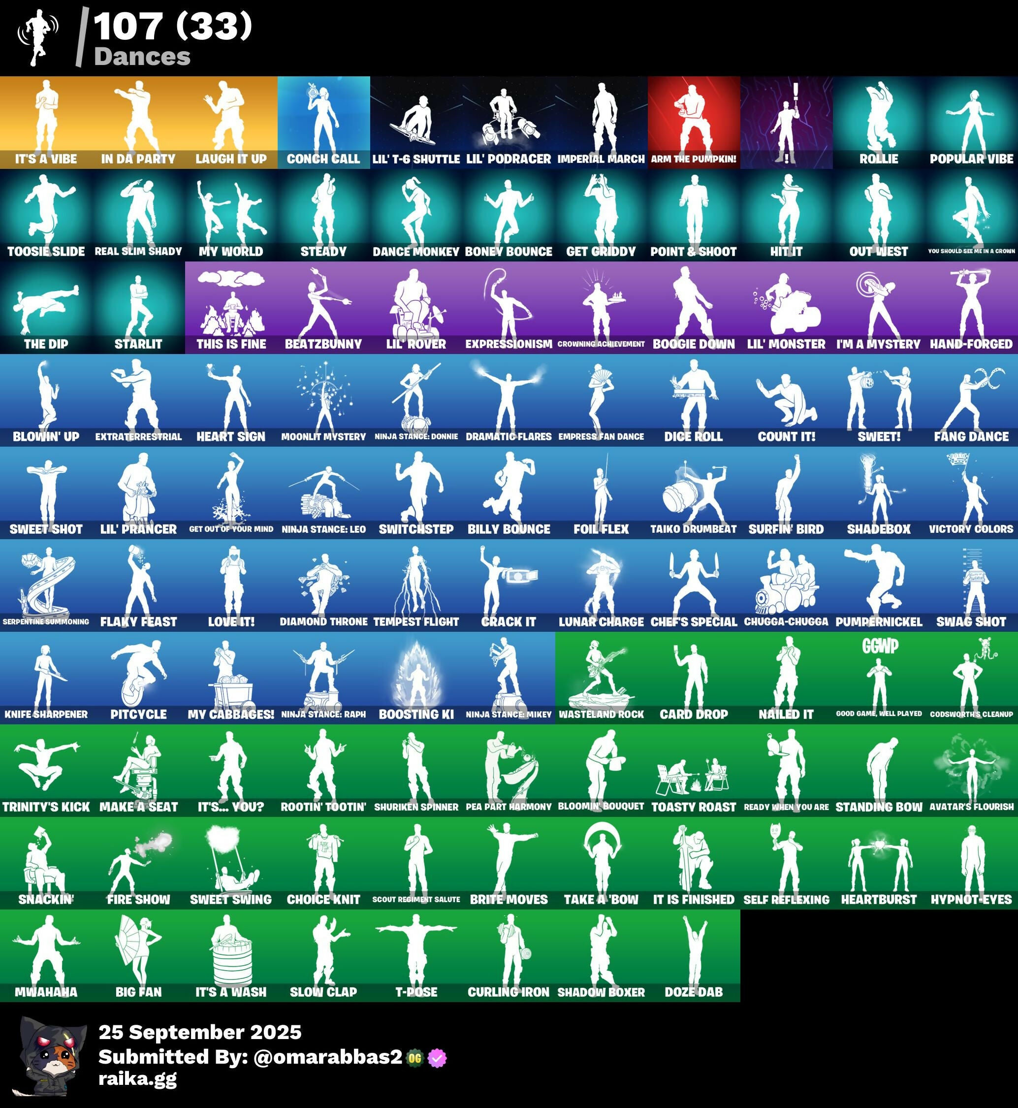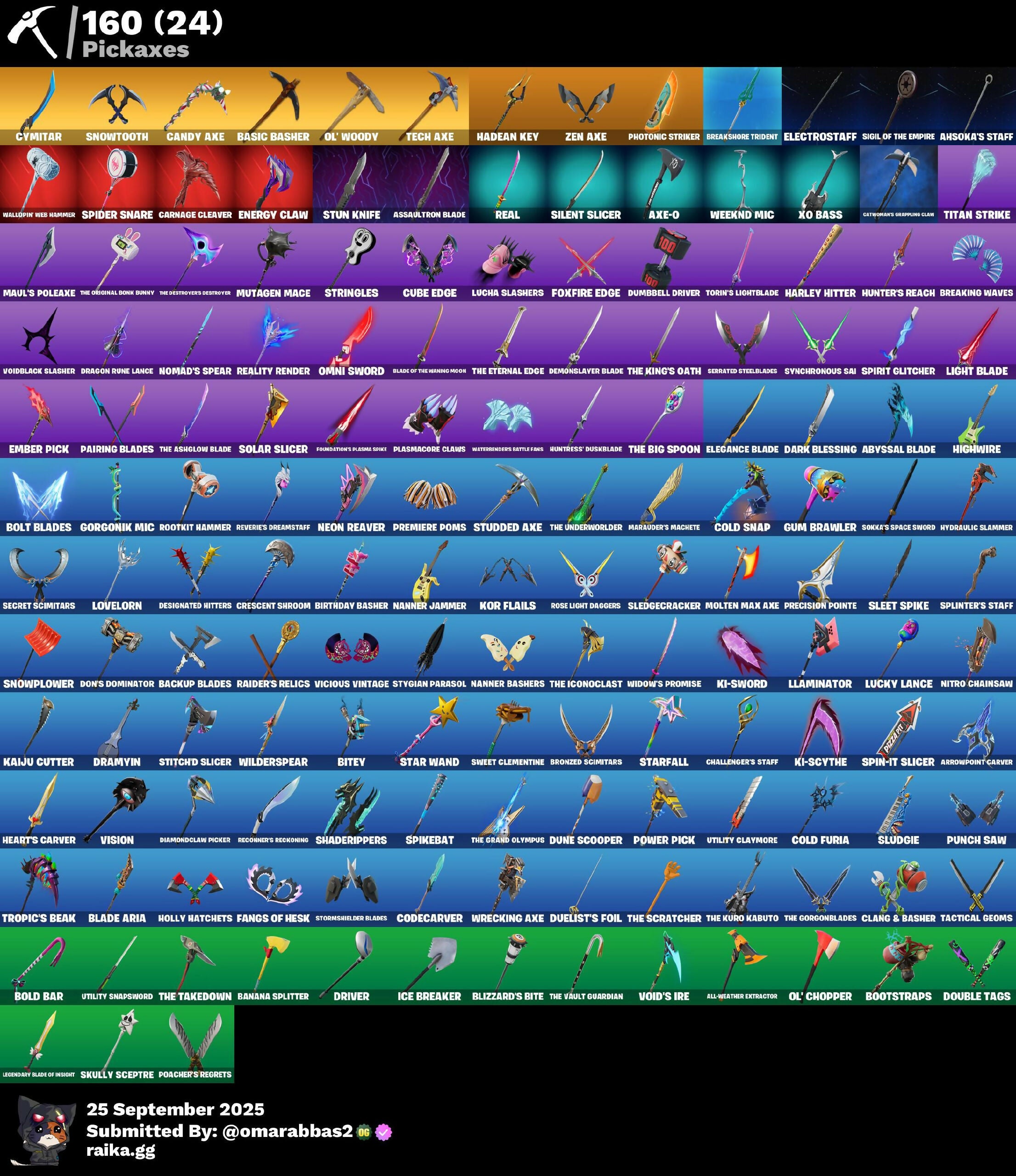 Absenz, Abyssal Blade, Adira, Ahsoka Tano, Ahsoka's Clone Trooper, Ahsoka's Staff, All-Weather Extractor, Antonia, Aphrodite, Arctic Adeline, Arctic Assassin, Arm The Pumpkin!, Arrowpoint Carver, Artemis, Assaultron Blade, Astra, Astrea, Avatar's Flourish, Axe-O, Axo, Backup Blades, Banana Splitter, Basic Basher, Beatzbunny, Big Fan, Billy Bounce, Birthday Basher, Bitey, Blade Aria, Blade of the Waning Moon, Blaze, Blizzard's Bite, Bloomin' Bouquet, Blowin' Up, Bold Bar, Bolt Blades, Boney Bounce, Boogie Down, Boosting Ki, Bootstraps, Bracer, Breaking Waves, Breakshore Trident, Brite Bomber, Brite Moves, Brite Raider, Bronzed Scimitars, Candy Axe, Caper, Card Drop, Carnage, Carnage Cleaver, Castaway Jonesy, Catwoman Zero, Catwoman's Grappling Claw, Cerberus, Challenger's Staff, Champion Kyra, Chaos Origins, Charlotte, Chef's Special, Chill Count, Choice Knit, Chrome Punk, Chugga-Chugga, Clang & Basher, Clara, Clone Trooper, Codecarver, Codename E.L.F., Codsworth's Cleanup, Cold Furia, Cold Snap, Conch Call, Coruscant Guard, Count It!, Crack It, Crescent Shroom, Crowning Achievement, Cube Assassin, Cube Edge, Curling Iron, Curse Buster, Cymitar, D'Ark, Dahlia, Dance Monkey, Dark Blessing, Darth Maul, Darth Vader, Demonslayer Blade, Desert Dominator, Designated Hitters, Diamond Throne, Diamondclaw Picker, Dice Roll, Don's Dominator, Double Tags, Doublecross, Doze Dab, Dragon Rune Lance, Dramatic Flares, Dramyin, Dream, Driver, Duelist's Foil, Dumbbell Driver, Dummy, Dune Scooper, Dynamo, Dynamo Dancer, Electrostaff, Elegance Blade, Eleven, Ember Pick, Empress Fan Dance, Energy Claw, Envoy, Era, Eren Jaeger, Everfrost Bushranger, Evie, Explorer Emilie, Expressionism, Extraterrestrial, Fabio Sparklemane, Fang Dance, Fangs of Hesk, Fire Show, Fish Thicc, Flaky Feast, Foil Flex, Foundation's Plasma Spiker, Foxfire Edge, Frozen Fishstick, Frozen Nog Ops, Galaxy Grappler, Get Griddy, Get Out Of Your Mind, Glitch, Goku Black, Gold Blooded Ace, Good Game, Well Played, Gorgonik Mic, Green Roots Billie, Gum Brawler, Gumbo, Gunnar, Hadean Key, Hades, Hana, Hand-Forged, Hangtime, Harley Hitter, Harlowe, Haven, Haxasaur, Heart Sign, Heart's Carver, Heart-Stopper, Heartburst, Highwire, Hit It, Holiday Boxy, Holly Hatchets, Holly Jammer, Hope, Hunter's Reach, Huntress' Duskblade, Hush, Hydraulic Slammer, Hypnot-Eyes, I'm A Mystery, Ice Breaker, Imani, Imperial March, In Da Party, Indiana Jones, It Is Finished, It's A Vibe, It's A Wash, It's... You?, Itachi Uchiha, J Balvin, J.B. Chimpanski, Jing, Jonesy The First, Jumpshot, Kado Thorne, Kaiju Cutter, Kata Captain, Khaby Lame, Ki-Scythe, Ki-Sword, Killian, Knife Sharpener, Kor, Kor Flails, Korra, Krisabelle, Laugh It Up, Legendary Blade of Insight, Light Blade, Lil' Monster, Lil' Podracer, Lil' Prancer, Lil' Rover, Lil' T-6 Shuttle, Llaminator, Lorenzo, Love It!, Lovelorn, Lt. John Llama, Lucha Slashers, Lucky Lance, Lunar Charge, Mae, Major Mancake, Make A Seat, Malik, Manic, Marauder's Machete, Mariposa, Marked Marauder, Match Point, Maul's Poleaxe, Media Strike Commander, Medusa, Megalo Don, Mezmer, Min-Joon, Mizuki, Mogul Master, Molten Max Axe, Montague, Moonlit Mystery, Mr. Dappermint, Mutagen Mace, Mwahaha, My Cabbages!, My World, Mystica, Nailed It, Nanner Bashers, Nanner Jammer, Neon Reaver, Ninja Stance: Donnie, Ninja Stance: Leo, Ninja Stance: Mikey, Ninja Stance: Raph, Nisha, Nitro Chainsaw, Nolan Chance, Nomad's Spear, Ol' Chopper, Ol' Woody, Omni Sword, Orochimaru, Oscar, Out West, PJ, Padmé Amidala, Pairing Blades, Par Patroller, Pea Part Harmony, Peabody, Peter Griffin, Phaedra, Photonic Striker, Piper Pace, Pitcycle, Plasmacore Claws, Poacher's Regrets, Point & Shoot, Polar Peely, Popular Vibe, Poseidon, Power Pick, Precision Pointe, Premiere Poms, Prowler, Pumpernickel, Punch Saw, Purradise Meowscles, Raider's Relics, Ready When You Are, Real, Real Slim Shady, Reality Render, Recon Expert, Reconner's Reckoning, Red Knight, Relik, Renzo The Destroyer, Reverie, Reverie's Dreamstaff, Rey, Rian, Ringmaster Scarr, Rio Grande, Robo-Kevin, Rollie, Ronin, Rootin' Tootin', Rootkit Hammer, Rose Light Daggers, Runway Racer, Rust, Sabina, Sandstorm, Scarlet Commander, Scout Regiment Salute, Scuba Crystal, Secret Scimitars, Self Reflexing, Serpentine Summoning, Serrated Steelblades, Shadebox, Shaderippers, Shadow Boxer, Shadow Ops, Shanta, Shimmerdusk, Shuriken Spinner, Sierra, Sigil of the Empire, Silas Hesk, Silent Slicer, Skeletara, Skull Scout, Skully Sceptre, Sled Ready Guff, Sledgecracker, Sleet Spike, Slow Clap, Sludgie, Snackin', Snap, Snorkel Ops, Snow Stealth Slone, Snowplower, Snowtooth, Sokka's Space Sword, Solar Slicer, Solid Snake, Sparkplug, Spider Snare, Spider-Man, Spikebat, Spin-it Slicer, Spirit Glitcher, Spirit Hunter Saexo, Splinter's Staff, Standing Bow, Star Wand, Starfall, Starlit, Steady, Stitch'd Slicer, Stormfarer, Stormshielder Blades, Stray, Stringles, Studded Axe, Stun Knife, Stygian Parasol, Styx, Sultura, Sunset Alto, Surf Witch, Surfin' Bird, Swag Shot, Swamp Stalker, Sweet Clementine, Sweet Shot, Sweet Swing, Sweet!, Swish, Switchstep, Synchronous Sai, T-60 Power Armor, T-Pose, Tactical Geoms, Taiko Drumbeat, Take A 'Bow, Tech Axe, Tegan, Tempest Flight, The Ashglow Blade, The Big Spoon, The Cube Queen, The Destroyer's Destroyer, The Devourer, The Dip, The Eternal Edge, The Foundation, The Gorgonblades, The Grand Olympus, The Iconoclast, The King's Oath, The Kuro Kabuto, The Machinist, The Original Bonk Bunny, The Scratcher, The Takedown, The Underworlder, The Vault Guardian, The Weeknd, The Weeknd Combat, This Is Fine, Thunder, Tigeress, Titan Strike, Toasty Roast, Toona Fish, Toosie Slide, Torin, Torin's Lightblade, Trace, Tricksy, Trinity Trooper, Trinity's Kick, Tropic's Beak, Tsuki 2.0, Underswold Desdemona, Utility Claymore, Utility Snapsword, Valeria, Vengeance Jones, Vicious Vintage, Victory Colors, Vision, Void Warrior Arsenz, Void's Ire, Voidblack Slasher, Wallopin' War Hammer, Wasteland Rock, Waterbinders