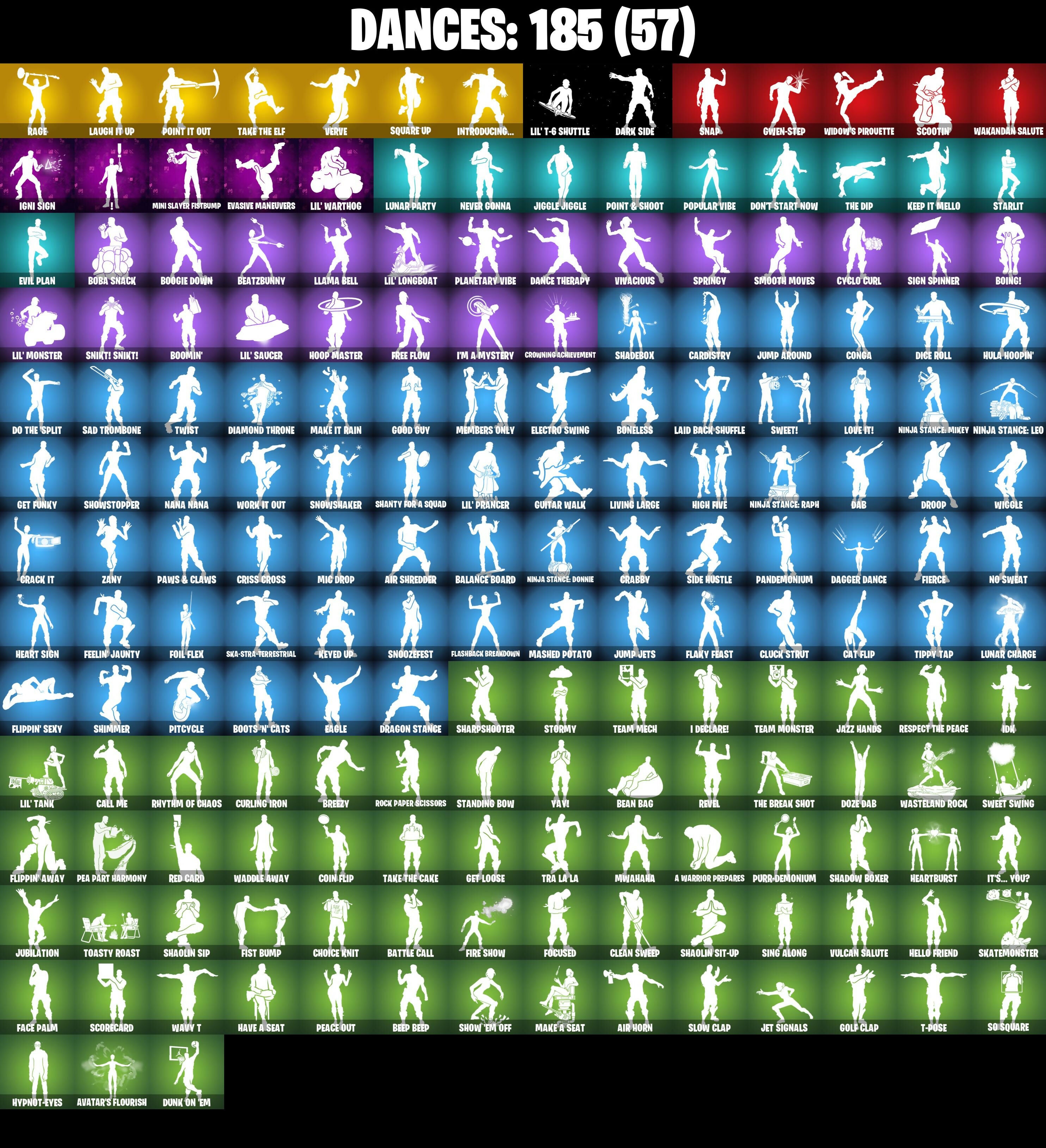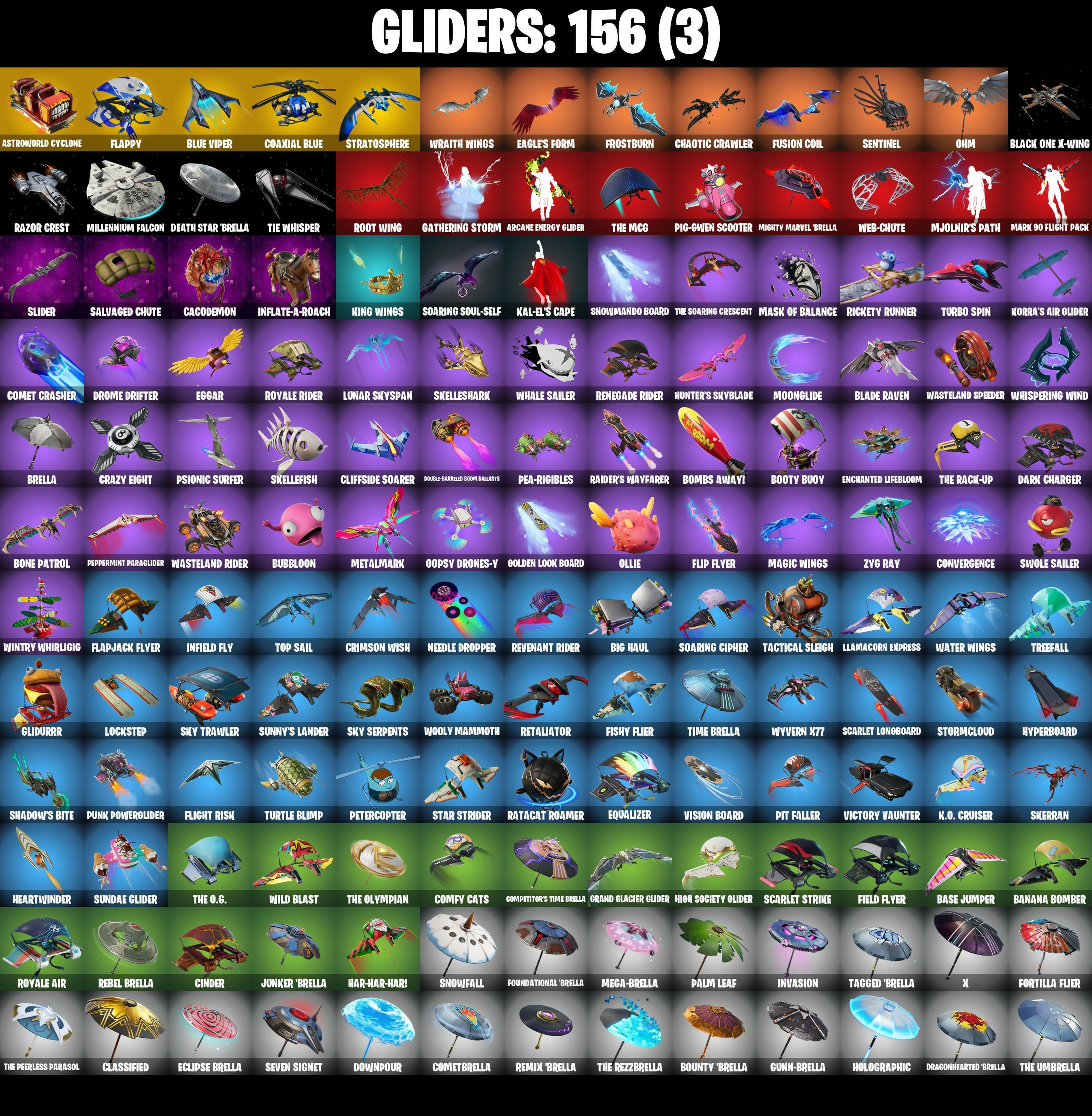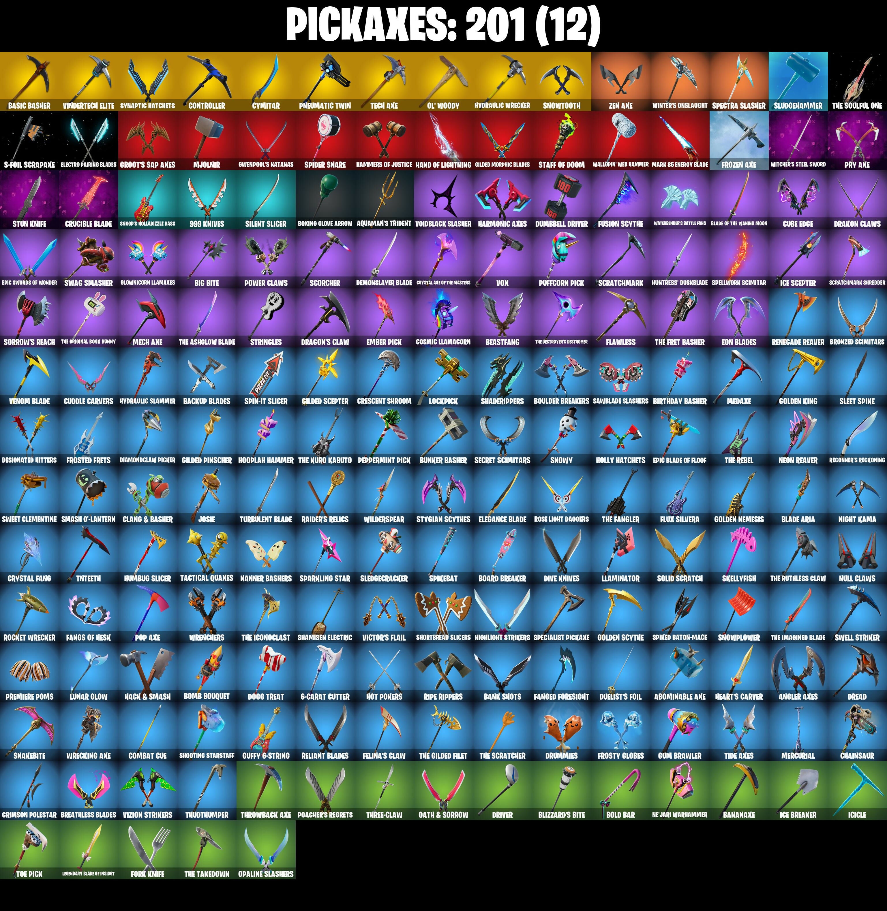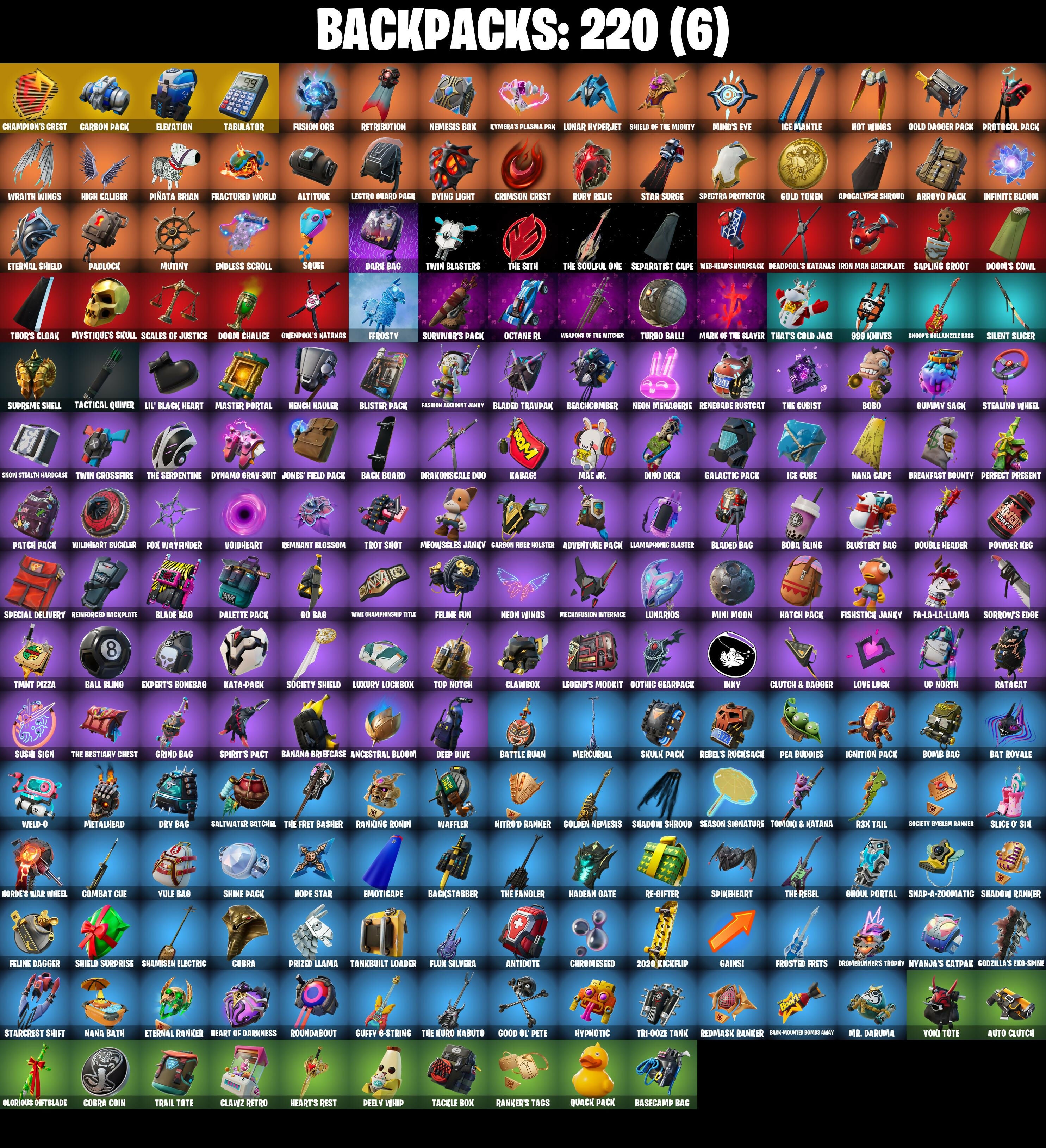 1-Ball, 2020 Kickflip, 6-Carat Cutter, 8-Ball Vs Scratch, 999 Knives, A Warrior Prepares, Abominable Axe, Adventure Pack, Aerial Assault Bomber, Aerial Assault Captain, Agent Jones, Agent Jones (Jump 31), Agent Peely, Ahsoka Tano, Air Horn, Air Shredder, Alli, Altitude, Ancestral Bloom, Angler Axes, Antidote, Antonia, Aphrodite, Apocalypse Shroud, Aquaman, Aquaman's Trident, Arcane Energy Glider, Arctic Adeline, Arroyo Pack, Astrea, Astro Armor, Astroworld Cyclone, Aura, Auto Clutch, Avatar's Flourish, Back Board, Back-Mounted Bombs Away, Backstabber, Backup Blades, Balance Board, Ball Bling, Banana Bomber, Banana Briefcase, Bananaxe, Bank Shots, Base Jumper, Basecamp Bag, Basic Basher, Bat Royale, Battle Call, Battle Ruan, Beachcomber, Bean Bag, Beastfang, Beatzbunny, Beep Beep, Big Bite, Big Haul, Birthday Basher, Black One X-wing, Blackheart, Blackheart (Stage 8), Blade Aria, Blade Bag, Blade Raven, Blade of the Waning Moon, Bladed Bag, Bladed Travpak, Blister Pack, Blizzard's Bite, Blue Viper, Blustery Bag, Board Breaker, Boba Bling, Boba Snack, Bobo, Boing!, Bold Bar, Bomb Bag, Bomb Bouquet, Bombs Away!, Bone Patrol, Boneless, Boogie Down, Boomin', Boots 'n' Cats, Booty Buoy, Boulder Breakers, Bounty 'Brella, Boxing Glove Arrow, Breakfast Bounty, Breathless Blades, Breezy, Brella, Brite Bomber, Bronzed Scimitars, Bubbloon, Bullseye, Bunker Basher, Bunker Jonesy, Cacodemon, Call Me, Cameo Vs Chic, Carbon Commando, Carbon Fiber Holster, Carbon Pack, Cardistry, Cat Flip, Cerberus, Chainsaur, Chalked Up 1-Ball, Champion's Crest, Chaos Director, Chaotic Crawler, Charlotte, Choice Knit, Chromeseed, Cinder, Clang & Basher, Classified, Clawbox, Clawz Retro, Clean Sweep, Cliffside Soarer, Clinical Crosser, Cloud Striker, Cluck, Cluck (Slurpy), Cluck Strut, Clutch & Dagger, Coaxial Blue, Cobalt, Cobra, Cobra Coin, Coin Flip, Collector Kado Thorne, Combat Cue, Comet Brella, Comet Crasher, Comfy Cats, Competitor's Time Brella, Conga, Controller, Convergence, Cosmic Llamacorn, Crabby, Crack It, Crazy Eight, Crescent Shroom, Crimson Crest, Crimson Polestar, Crimson Wish, Criss Cross, Crowning Achievement, Crucible Blade, Crystal Axe of the Masters, Crystal Fang, Cube Assassin, Cube Edge, Cuddle Carvers, Curling Iron, Cyclo Curl, Cymitar, Dab, Dagger Dance, Dance Therapy, Dark Bag, Dark Bomber, Dark Charger, Dark Side, Deadpool, Deadpool Unmasked, Deadpool's Katanas, Death Star 'Brella, Deep Dive, Deimos, Demi, Demonslayer Blade, Desert Dominator, Desolated Hitters, Diamond Diva, Diamond Hanz, Diamond Throne, Diamondclaw Picker, Dice Roll, Dino Deck, Dive Knives, Do The Split, Doctor Doom, Doctor Doom (God Emperor), Dogg Treat, Don't Start Now, Doom Chalice, Doom Slayer, Doom's Cowl, Double Header, Double-Barreled Boom Ballasts, Downpour, Doze Dab, Dragon Stance, Dragon's Claw, Dragonhearted 'Brella, Drakon Claws, Drakon Steel Hybrid, Drakon Steel Hybrid (Cosmic Legacy), Drakonscale Duo, Dread, Driver, Drome Drifter, Droop, Drummerunner's Trophy, Drummies, Dry Bag, Duelist's Foil, Dumbbell Driver, Dunk On 'Em, Dusty, Dying Light, Dynamic Dribbler, Dynamo Grav-Suit, Dynamo Tntina, Dynamo Tntoon-a, Eagle, Eagle's Form, Eclipse Brella, Eggar, Electro Pairing Blades, Electro Swing, Elegance Blade, Elevation, Ember, Ember (Night), Ember Pick, Emoticape, Enchanted Lifebloom, Endless Scroll, Eon Blades, Epic Blade of Floof, Epic Swords of Wonder, Equalizer, Eternal Knight, Eternal Ranker, Eternal Shield, Evasive Maneuvers, Evie, Evil Plan, Expert's Bonebag, Fa-la-la-llama, Face Palm, Fade, Fanged Foresight, Fangs of Hesk, Fashion Accident Janky, Feelin Jaunty, Felina, Felina's Claw, Feline Dagger, Feline Fun, Field Flyer, Fierce, Finesse Finisher, Fire Show, Fish Thicc, Fishstick, Fishstick Janky, Fishy Flier, Fist Bump, Flaky Feast, Flapjack Flyer, Flappy, Flashback Breakdown, Flawless, Flight Risk, Flip Flyer, Flippin' Away, Flippin' Sexy, Flux Silvera, Focused, Foil Flex, Fork Knife, Fortilla Flier, Foundational 'Brella, Fox Wayfinder, Fractured World, Free Flow, Frost Squad, Frostburn, Frosted Frets, Frosty, Frosty Globes, Frozen Axe, Fusion, Fusion Coil, Fusion Orb, Fusion Scythe, Gains!, Galactic Pack, Galaxia, Gathering Storm, Gear Specialist Maya, Geralt Of Rivia, Get Funky, Get Loose, Ghoul Portal, Gilded Morphic Blades, Gilded Pinscher, Gilded Scepter, Glidurr, Glowicorn Llamaxes, Go Bag, Godzilla's Exo-Spine, Gold Brutus, Gold Dagger Pack, Gold Meowscles, Gold Midas, Gold Token, Golden King, Golden Look Board, Golden Nemesis, Golden Scythe, Golf Clap, Good Guy, Good Ol' Pete, Gothic Gearpack, Grand Glacier Glider, Green Arrow, Grind Bag, Groot, Groot (Silver Foil), Groot's Sap Axes, Guffy 6-String, Guffy G-String, Guitar Walk, Gum Brawler, Gumbo, Gumbo (Sour), Gummy Sack, Gunn-Brella, Gwen-Step, Gwenpool, Gwenpool's Katanas, Hack & Smash, Hadean Gate, Hammers of Justice, Hand of Lightning, Happy, Har-Har-Har!, Harbinger Armor Omedarok, Harlowe, Harlowe (Helmet), Harmonic Axes, Hatch Pack, Have A Seat, Haven, Heart Sign, Heart of Darkness, Heart's Carver, Heart's Rest, Heartburst, Heartwinder, Hello Friend, Helsie, Hench Hauler, Heron Stance Hero, High Caliber, High Five, High Society Glider, Highlight Strikers, Holly Hatchets, Holographic, Hoop Master, Hooplah Hammer, Hope, Hope Star, Horde's War Wheel, Hot Pokers, Hot Wings, Hula Hoopin', Humbug Slicer, Hunter's Skyblade, Huntress' Duskblade, Hybrid, Hybrid (Stage 4), Hydraulic Slammer, Hydraulic Wrecker, Hyperboard, Hypnot-Eyes, Hypnotic, I Declare!, I'm A Mystery, Ice Breaker, Ice Cube, Ice King (Gold), Ice Mantle, Ice Scepter, Icicle, Igni Sign, Ignition Pack, Infield Fly, Infinite Bloom, Inflate-A-Roach, Inky, Introducing..., Invasion, Iris, Iron Man Backplate, It's... You?, Jazz Hands, Jennifer Walters, Jet Signals, Jiggle Jiggle, Jing, John Cena, Jones' Field Pack, Jonesy The First, Josie, Journey Vs Hazard, Jubilation, Jules, Jump Around, Jump Jets, Junker 'Brella, K.O. Cruiser, Kabagi, Kado Thorne, Kal-El's Cape, Kata-Pack, Keep It Me