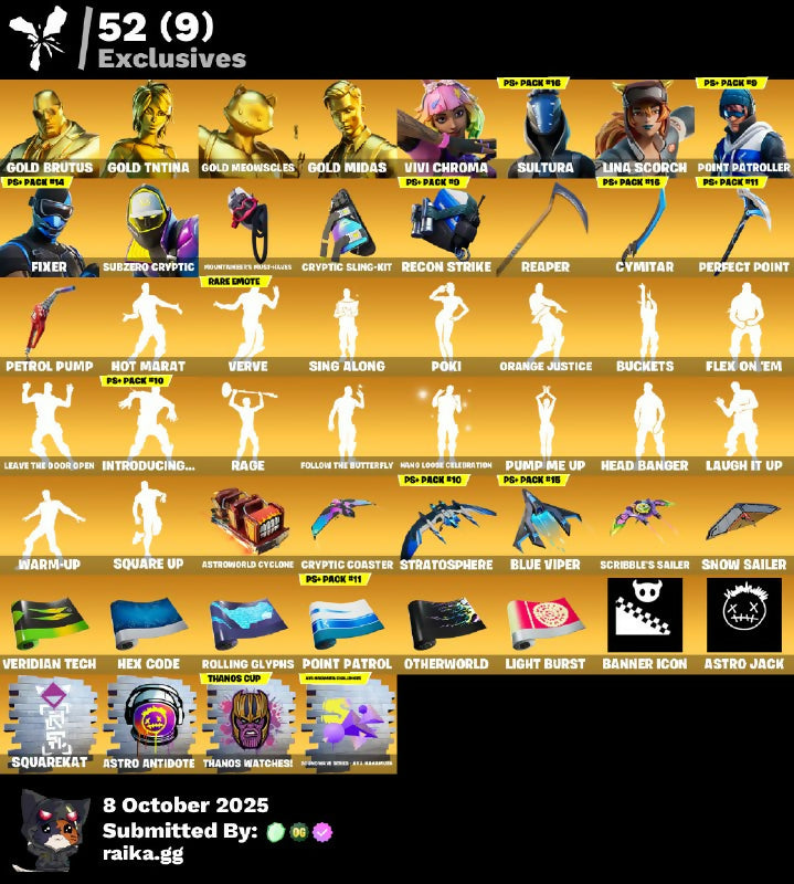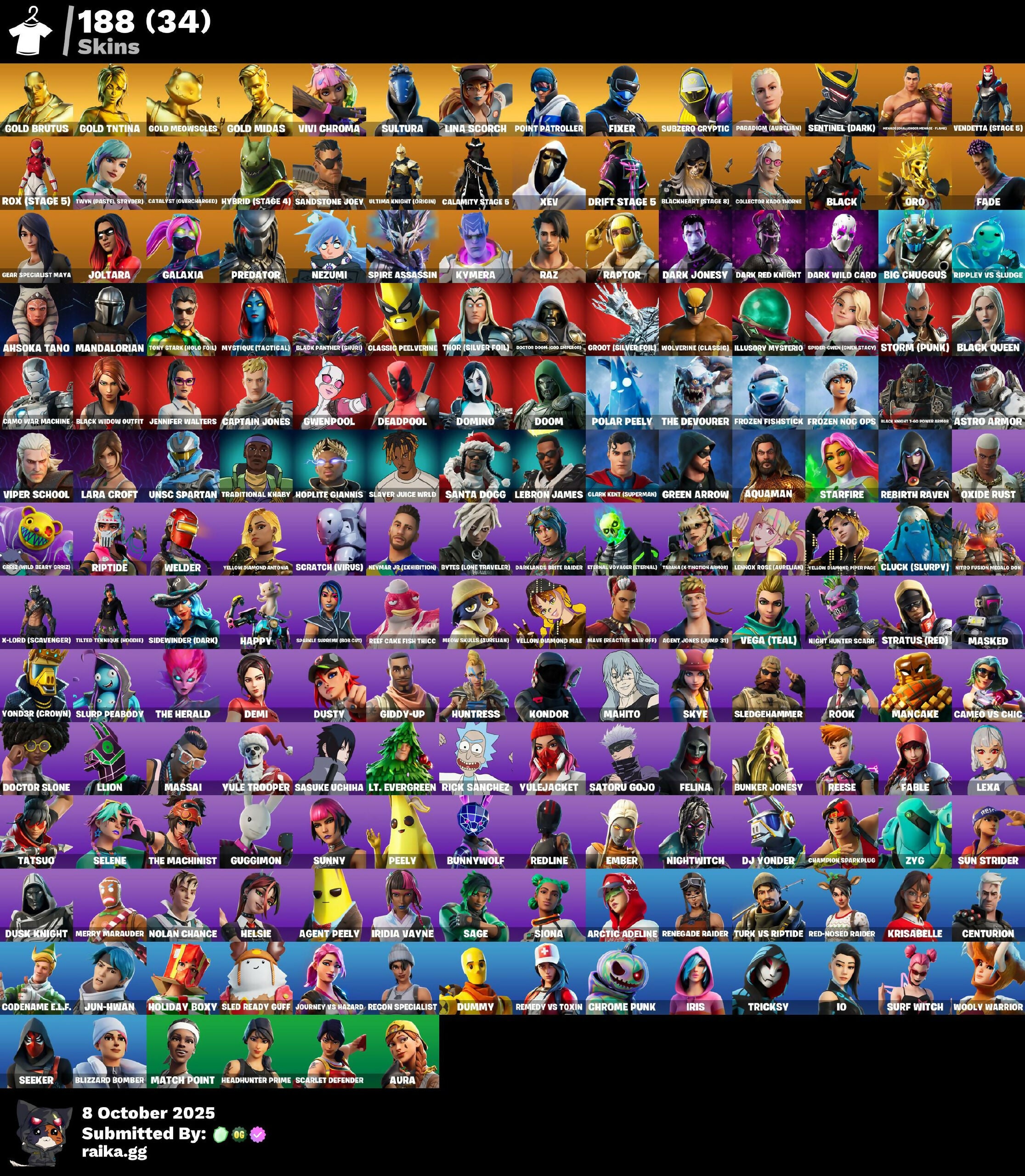 [PC/PSN/XBOX] 188 skins | Renegade Raider | Gold Brutus | Gold TNTina | Gold Meowscles | Gold Midas | Vivi Chroma | Sultura | Lina Scorch | Point Patroller | 300 VB #542