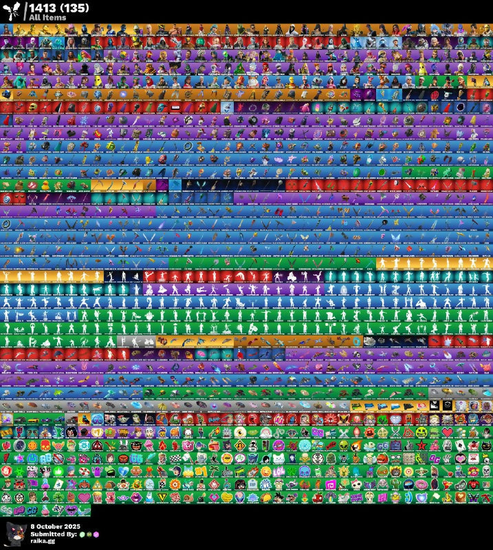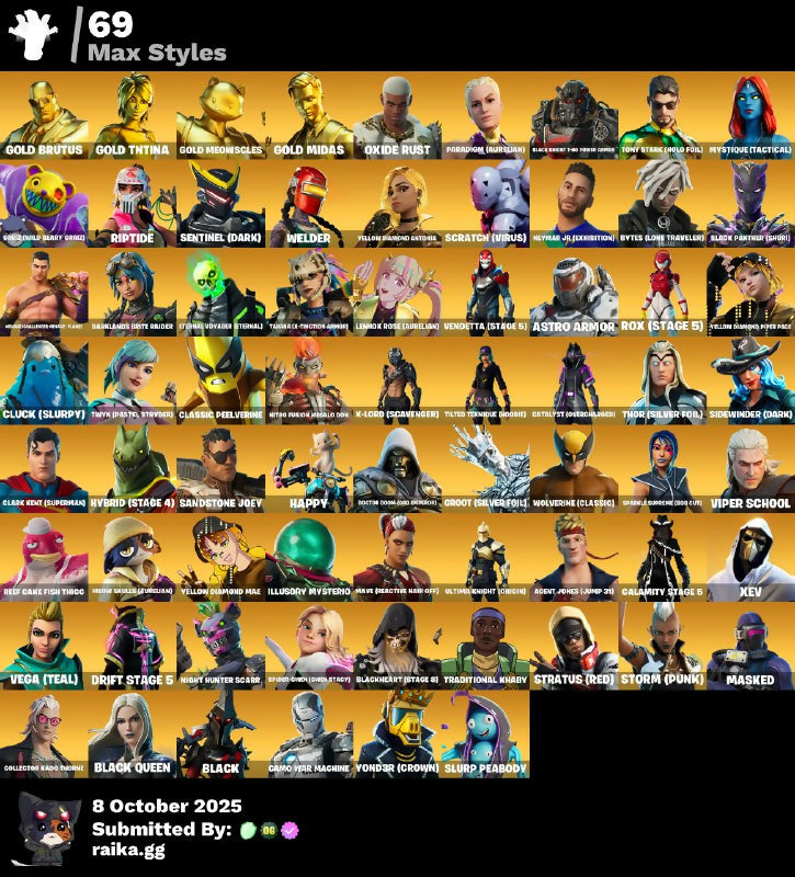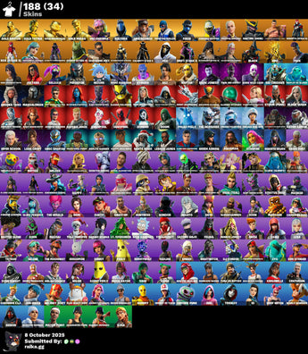 Agent Jones (Jump 31), Agent Peely, Ahsoka Tano, Aquaman, Arctic Adeline, Astro Antidote, Astro Armor, Astro Jack, Astroworld Cyclone, Aura, Banner Icon, Big Chuggus, Black, Black Iceberg T-90 Power Ranger, Black Knight 1-600 Border Armor, Black Panther (Ghoul), Black Panther (Shuri), Black Queen, Black Widow Outfit, Blackheart (Stage 8), Blizzard Bomber, Blue Viper, Buckets, Bunker Jonesy, Bunnywolf, Bytes (Lone Traveler), Calamity (Stage 5), Calamity Stage 5, Cameo vs Chic, Camo War Machine, Captain Jones, Catalyst (Overcharged), Centurion, Chrome Punk, Clark Kent (Superman), Classic Peelverine, Classic Peelyerine, Cluck (Slurpy), Codename E.L.F., Collector Kado Thorne, Collector Klaxo Regone, Critz (Wild Bearz Criz), Cryptic Coaster, Cryptic Sling-Kit, Cymitar, DJ Yonder, Dark Jonesy, Dark Lands Brite Raider, Dark Red Knight, Dark Wild Card, Darklands Brite Raider, Deadpool, Demi, Doctor Doom (3000 Unicorn), Doctor Doom (Endowment), Doctor Slone, Domino, Doom, Drift (Stage 5), Drift Stage 5, Dummy, Dusk Knight, Dusty, Ember, Eternal Voyager (Eternal), Fable, Fade, Felina, Fixer, Flex On 'Em, Follow The Butterfly, Frozen Fishstick, Frozen Nog Ops, Galaxia, Gear Specialist Maya, Giddy-Up, Gold Brutus, Gold Meowscles, Gold Midas, Gold Tintina, Gold Tntina, Green Arrow, Groot (Silver Foil), Guaco (Wild Baby Graze), Guggimon, Gwenpool, Happy, Head Banger, Headhunter Prime, Helsie, Hex Code, Holiday Boxy, Hoplite Giannis, Hot Marat, Huntress, Hybrid (Stage 4), Illusory Mysterio, Introducing..., Io, Iridia Vayne, Iris, Jennifer Walters, Joltara, Journey vs Hazard, Jun-Hwan, Kondor, Krisabelle, Kymera, Lara Croft, Laugh It Up, LeBron James, Leave The Door Open, Lenox Rose (Aurelian), Lexa, Light Burst, Lina Scorch, Llion, Lt. Evergreen, Mahito, Mancake, Mandalorian, Masked, Massai, Match Point, Mave (Reactive Hair Off), Mean Skull (Aurelian), Meow Skulls (Aurelian), Merry Marauder, Midas Rex (Galaxy Equalizer) - Planet X, Mystique (Tactical), Neymar Jr (Exhibition), Nezumi, Night Hunter Scarr, Night Twitch, Nitro Fusion Herald Don, Nitro Fusion Medalo Don, Nolan Chance, Nya Mae (Reactive Hard Off), Orange Justice, Oro, Otherworld, Oxide Rust, Paradigm (Aurelian), Peely, Perfect Point, Peter Griffin, Petrol Pump, Point Patrol, Point Patroller, Poki, Polar Peely, Predator, Pump Me Up, Rage, Raptor, Raz, Reaper, Rebirth Raven, Recon Specialist, Recon Strike, Red-Nosed Raider, Redline, Reef Cake Fish Taco, Reef Cake Fish Thicc, Reese, Remedy vs Toxin, Renegade Raider, Rick Sanchez, Rippley vs Sludge, Riptide, Rolling Glyphs, Rook, Rox (Stage 5), Sage, Sandstone Joey, Santa Dogg, Sasuke Uchiha, Satoru Gojo, Scarlet Defender, Scratch (Virus), Scribble's Sailer, Seeker, Selene, Sentinel (Dark), Sidewinder (Dark), Sienna Supreme (Bogo Cut), Sing Along, Siona, Skye, Slayer Juice Wrld, Sled Ready Guff, Sledgehammer, Slurp Peabody, Snow Sailer, Sparkle Supreme (Bob Cut), Spider Gwen (Dead Stacy), Spider Gwen (Eidol Stacv), Spire Assassin, Square Up, Squarekat, Starfire, Storm (Punk), Stratosphere, Stratus (Red), Subzero Cryptic, Sultura, Sun Strider, Sunny, Surf Witch, Tarana (Extinction Armor), Tatsuo, Thanos Watches!, The Devourer, The Herald, The Machinist, The Reaper, Thor (Silver Foil), Tilted Teknique (Boogie), Tilted Teknique (Hoodie), Tony Stark (Holo Foil), Tony Stark (Solo Foil), Traditional Khaby, Tricksy, Tsarina (E-Sction Armor), Turk vs Riptide, Twig (Paste, Stover), Twig (Pastel Stryder), UNSC Spartan, Ultima Knight (Origin), Vega (Teal), Vendetta (Stage 5), Veridian Tech, Verve, Viper School, Vivi Chroma, Vond3r (Crown), Warm-Up, Welder, Wolverine (Classic), Wooly Warrior, X-Lord (Scavenger), Xev, Yellow Diamond Antonia, Yellow Diamond Mae, Yellow Diamond Male, Yellow Diamond Piper Pace, Yond3r (Crown), Yule Trooper, Yulejacket, Zyg