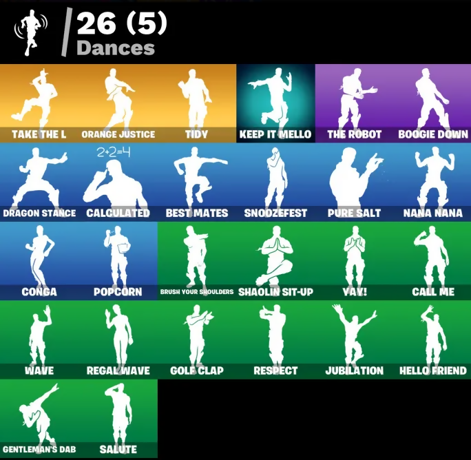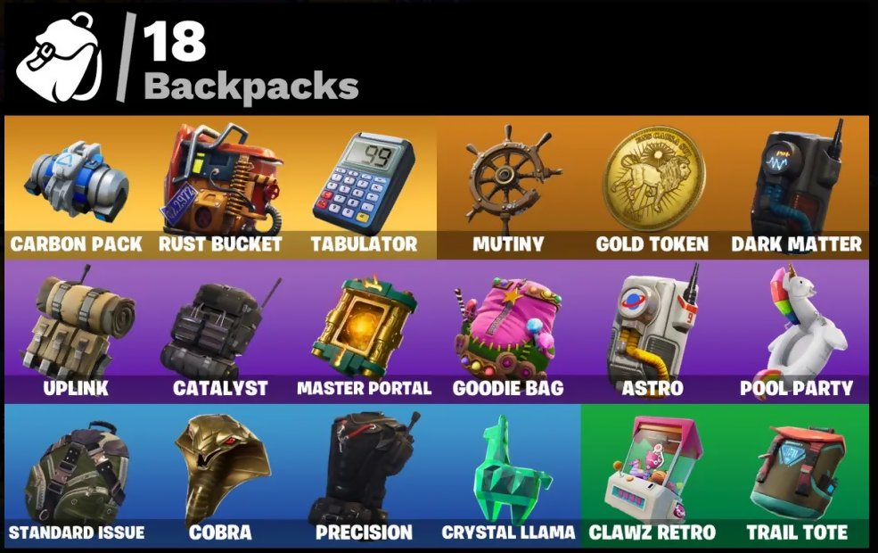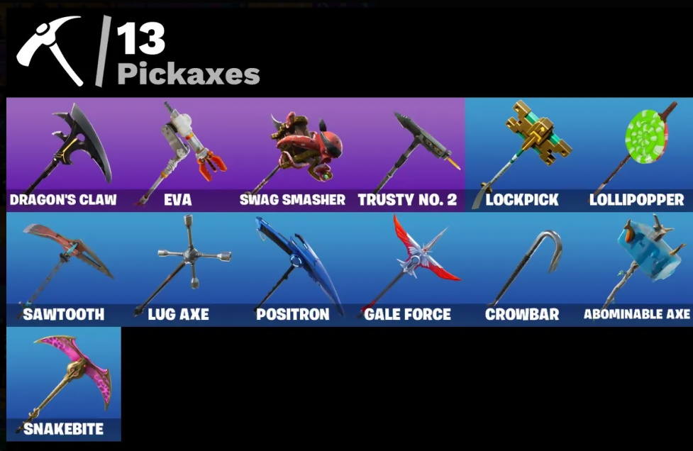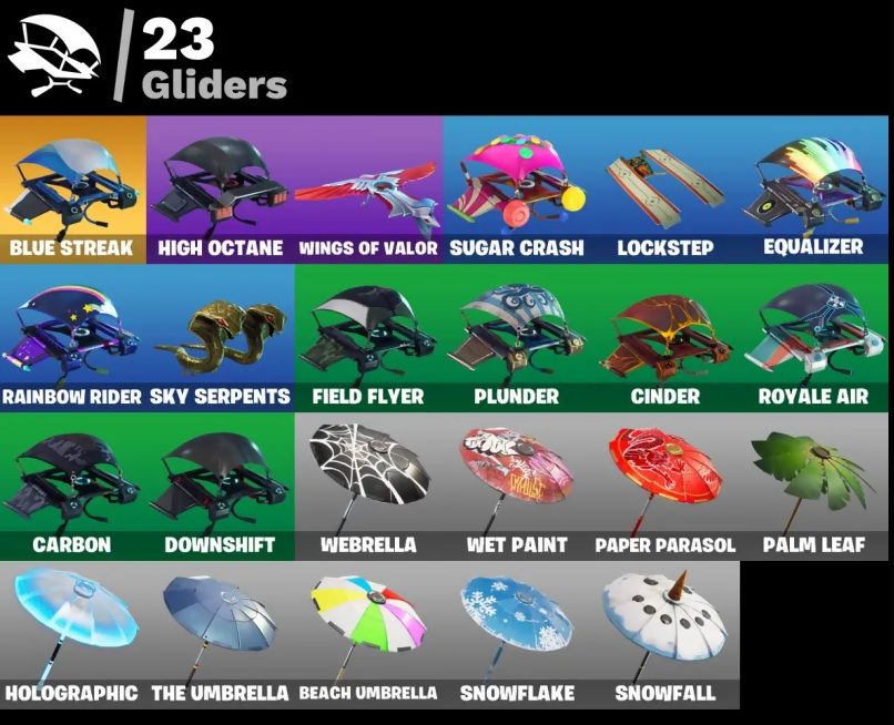 Abominable Axe, Astro, Battlehawk, Beach Umbrella, Best Mates, Blackheart, Blue Streak, Blue Team Leader, Boogie Down, Brush Your Shoulders, Calculated, Call Me, Carbide, Carbon, Carbon Commando, Carbon Pack, Catalyst, Cinder, Clawz Retro, Cobra, Conga, Crowbar, Crystal Llama, Dark Matter, Dark Voyager, Downshift, Dragon Stance, Dragon's Claw, Elite Agent, Equalizer, Eva, Field Flyer, Gale Force, Gentleman's Dab, Gold Token, Golf Clap, Goodie Bag, Hello Friend, High Octane, Holographic, Hybrid, Jubilation, Keep It Mello, Lockpick, Lockstep, Lollipopper, Lug Axe, Master Portal, Mission Specialist, Moonwalker, Mutiny, Nana Nana, Orange Justice, Palm Leaf, Paper Parasol, Peely, Plunder, Pool Party, Popcorn, Positron, Precision, Prodigy, Pure Salt, Rainbow Rider, Regal Wave, Respect, Rogue Agent, Royale Air, Rust Bucket, Rust Lord, Salute, Sawtooth, Scarlet Defender, Shaolin Sit-Up, Sidewinder, Sky Serpents, Snakebite, Snoozefest, Snowfall, Snowflake, Standard Issue, Sugar Crash, Swag Smasher, Tabulator, Take The L, Teknique, The Reaper, The Robot, The Umbrella, Tidy, Trail Tote, Trusty No. 2, Uplink, Wave, Webrella, Wet Paint, Wings Of Valor, Yay!, Zoey