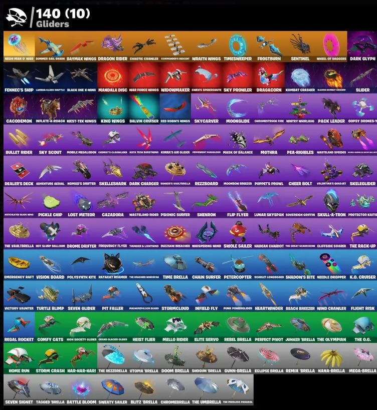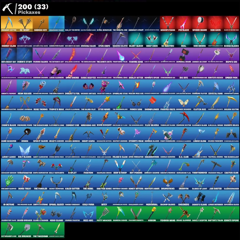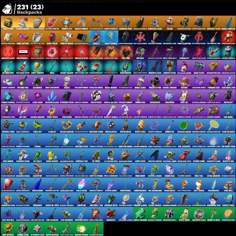 "Ones Champion Suit", 928 Axes, 999 Knives, Adam's Battle Flag, Adira (Battle Mask), Adventure Aerial, Ahsoka Tano, Ahsoka's Staff, Air Max 1'86, Alpha Trophy, Amazing Cube, Ancestral Bloom, Antonia, Apex Predator, Aphrodite, Apocalypse Shroud, Arachrobatics, Arcane Research, Arctic Adeline, Arctic Intel, Around The Clock, Artemis, Articulated Blade Wing, Ascension Medusa, Assaultron Blade, Astro Armor, Aura, Auto Clutch, Autobot Emblem, Autumn Knight, Avatar Cycle, Avatar’s Flourish, B Splat, B-Han, BB’s Beast Bat, Back Board, Backlash, Backup Blades, Balance Board, Balanced, Balhari Raider, Balvin Cruiser, Bandin Backburner, Baron’s Hoard, Bat Royale, Battle Blessing, Battle Bloom, Battle Call, Battle-Tested, Baymax Wings, Beach Breezer, Beacon Glass, Bear Blitz, Bear Hug, Beast Blastin’, Beast Boy, Beatzbunny, Bedside Manner, Beep & Boop, Big Bite, Big Fan, Billstar The Elder, Birdaring Flourish, Birdie, Birthday Basher, Bitey, Bittertome Backplate, Black One X-Wing, Blade Of The Vanishing Moon, Blades Of Brother Vande, Blades of Light, Bleached Shield, Blitz 'Brella, Blitz Brigade, Blowin’ Up, Board Breaker, Boba Bling, Boba Snack, Body Up, Bogey Basher, Bolt, Bolt Blades, Bomb Bouquet, Book of Eausghosto, Boosting Ki, Bracer, Breaking Point, Breakshore Trident, Breezy, Bringit Around, Brite Agent, Brite Moves, Brite Raider, Brush Your Shoulders, Bugha, Bugha Blades, Bullet Rider, Bunny Brawler, Burst Gas Scenario, Bushranger, Buzz Pack, Buzzsaw Breacher, Buzzy Bag, Cacodemon, Cactus Club, Calico-Conut, Called Shot, Caper (Bunny), Card Drop, Cardio Fire Holster, Cartwheelin’, Castaway Jonesy, Cauldron Chill, Cazadora, Cazadora Wings, Celebratory Slice, Cerberus, Chain Surfer, Challenger's Staff, Champion Kyra, Chaotic Crawler, Charge Pack, Charging Up, Cheer Bag, Cheer Bolt, Chemist's Cloudslider, Chicken Wing It, Chilled Up N-Galli, Chimichanga!, Choice Knit, Chromebrella, Chromeseed, Chromestruck Fire, Chronos Lock, Chuck Pack, Cimere, Clang & Basher, Classic Kombat Gasser, Clawbox, Clawz Retro, Cliffside Soarer, Cloaked Star, Clover Team Leader, Clutch & Dagger, Clutch Axe, Cobra Coin, Cold Furia, Combat Cue, Comfy Cats, Commander's Descent, Competitive Crest, Conch Call, Conjure Weapon, Contract Giller, Cosmic Blades, Couch Titan, Count It!, Cozy Conch, Crack It, Crash Test Cooler, Creaxtor Cougar, Crescent Shroom, Crimson Polestar, Crimson Scythe, Crucible Blade, Crystal Fang, Cube Aether, Cubic Scepter, Cuddle Carvers, Curling-Iron, Cursed Energy, Cursed Marionette, Cybertronian Axe, Cyclo Curl, Dagger Dance, Daigo's Claws, Dark Charger, Dark Glyph, Dark Red, Dark Red President Ike, Dark Tourist Kelsea, Darth Vader, Dauntless Driver, Dawn, Deadeye Recon, Dealer's Deck, Deck Ducky, Demon Hunter Hope, Denied, Desert Shadow, Designated Hitters, Diamond Throne, Diamondclaw Picker, Dice Roll, Dieselback Pack, Dill With It, Dogg Treat, Don's Dominator, Donatello, Donnie's Bo Staff, Donnie's DG Sheath, Doom Brella, Door’s Worth Cleanup, Dorsal Destroyer, Dote Dab, Double Header, Dragacorn, Dragon Bre Lance, Dragon Radar, Dragon Rider, Dramatic Flares, Dramyin, Dream Feet, Dreamzy Randbag, Dribblin’, Driftlike Challenge, Drippin’ Flavor, Drome Drifter, Drumsticks, Duelist's Foil, Duelist’s Card Trick, Duffy G-String, Dumbbell Driver, Dummy, Dune Scooper, Duplicating Axions, Dusk Knight, Dutch, Dynamo Tintoh-a, Eclipse Brella, Eddie's Spear, Eevee (Gone Trukwilli), Electric Shredder, Electro Flaring Blades, Elegance Blade, Elegant Crowbar, Elite Servo, Ember Pick, Emergency Raft, Emotipcape, Endop's Scimitar, Energized Godzilla, Energy Claw, Epic Blade of Food, Eternal Ranker, Evil Plan, Expedition Bag, Expert's Emblem, Expressionism, Fa-La-La-Llama, Face Palm, Fancy Fritz Clipper, Fang Dance, Fanged Foresight, Fast Break, Feathered Flames, Felina, Felina's Claw, Feline Dagger, Fennec Shand, Fennec's Ship, Field Kit, Fiendish Wand, Finger Guns, Fire Show, Fishy Flourish, Fissionos Flayer, Fist Bump, Five Digit Slapper, Fixation, Fizzix, Flaky Feast, Flaming Duals Kama, Fletcher's Cane, Flight Risk, Flintlock, Flip Flyer, Flippin’ Sexy, Flux Silvera, Focus, Foil Flex, Four Elements Ranger, Fox Wayfinder, Foxfire Edge, Frequency Flyer, Frieza, Frieza's Pod, Frigid Foregoer, Frostbite, Frostbite Howlsquis, Frostburn, Frosted Frets, Frozen Oculata, Frozen Treat Cart, Frying Pan, Fuzzetti Cake, Galactic Banner, Gangnam Style, Get Griddy, Get Out Of Your Mind, Ghost Enforcer, Ghost Portal, Ghosts Bunny (Craym), Gilded Pinscher, Glorious Guitarras, Gnashers, Godzilla's EXO-Spine, Golden Nemesis, Golden Scythe, Good Ol' Pete, Gorgon's Aegis, Grand Glacier Glider, Grand Slammer, Griffin's Talon, Griffon Gladiator, Grind Bag, Grit, Grizzy Gooper, Groove, Guardian Daggers, Guardian Jade, Guffy G-String, Gunn-'Brella, Hacktop, Hadean Chariot, Hadean Gate, Hadean Key, Handsome Rogue, Har-Har-Har!, Harley Hitter, Harley Quinn's Earrings, Have A Seat, Haxasaur, Haylee Skye, Heart's Carver, Heart's Rest, Heartburst, Heartwinder, Heel Clicker Shadow, Heist Flier, Herald's Star, Hi-Octane, High Society Glider, Holiday Boxy, Holiday Hydrant, Holly Hatchets, Holo-Back, Home Run, Homegrown Flal, Honey Hitters, Hope, Hope Star, Hot Pokers, Hot Slurp Balloon, Hot Stuff, Howl, Humble, Humbug Slicer, Hunter's Knife, Hunter's Reach, Huntress Lyre, Hutt Clan Symbol, Hydraulic Slammer, Hypnot-Eyes, Ice Breaker, Iconic Era, Igni Sign, Ignition Pack, Imani, Immortal Fenix, Imperial March, In Da Party, Incinerator Kuno, Inferno, Inferno Pulse, Infield Fly, Inflate-A-Roach, Invisible Cut, It Is Finished, It’s A Vibe, It’s Chemistry!, I’m A Mystery, J Balvin, Jar Buster, Jet Set, Jet Signals, Job Well Done, John Cena, Jubilation, Jumbo Popcorn, Junker 'Brella, K.O. Club, K.O. Cruiser, Kaiju Cutter, Karateka Jones, Kata Tech Burstwing, Kata-Pack, Killswitch, Killswitch Drone, King Wings, Kintsugi Daido, Knife Sharpener, Knight's Torment, Kombat Crasher, Korra's Air Glider, Krang, Krisabelle, 
