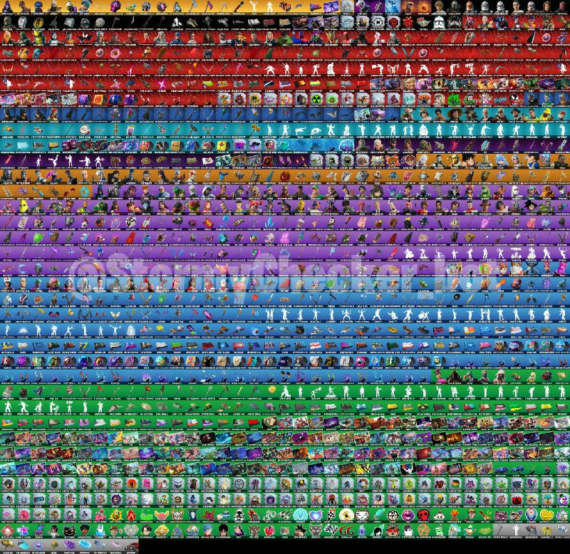 Adira, Agent Jones, Agent Peely, Ali-A, Anakin Skywalker, Anderson .Paak, Announce, Arctic Adeline, Ark, Armored Batman Zero, Ash Williams, Astro Jack, Astroworld, Astroworld Cyclone, Atom Eve, Batman Zero, Battlehawk, Beerus, Birdie, Blaze, Boba Fett, Boot It, Brite Bomber, Bruno Mars, Brutus, Bubble Bomber, Bulma, Bunny Brawler, Cable, Captain America, Captain America (Sam Wilson Form), Carnage, Claptrap, Clone Trooper, Colossus, Coruscant Guard, Cryptic Coaster, Cryptic Sling-Kit, Cuddle Team Leader, Cuddlepool, Cyclops, Dark Rex, Dark Skully, Dark Skully Satchel, Dark Splitter, Dark Voyager, Darth Maul, Deadpool, Deathstroke Zero, Diamond Hanz, Diamond Jack, Doctor Doom, Domino, Donatello, Doom, Doom Slayer, Drift, Dusty, Eddie Brock, Elite Agent, Ember Baton, Emma Frost, Envoy, Era, Eren Jaeger, Eternal Knight, Eve, Fade, Galaxia, Gambit, Gear Specialist Maya, Geralt of Rivia, Ghost Rider, Gildhart, Goku Black, Gold Midas, Goldie, Green Arrow, Green Goblin, Groot, Guff, Gwenpool, Havoc, Helsie, Highwire, Hope, Hopper, Hulk, Huntress, Hybrid, Imani, Indiana Jones, Invincible, Iris, Iron Man, Iron Spider, Isaac Clarke, Isabelle, Jellie, Jennifer Walters, John Cena, Jonesy, Joni The Red, Journey vs Hazard, Jubilee, Juggernaut, Jun-Hwan, Kratos, Krisabelle, Lachlan, Lara Croft, Lazar, Lazarbeam, LeBron James, Leonardo, Leviathan Axe, Lil Split, Lil Whip, Lorenzo, Loveless, Lt. John Llama, Luke Skywalker, Lynx, MJ (No Way Home), Major Lazer, Maki Master, Malgore, Malik, Mancake, Mandalorian, Mando's Questtrooper, Mariposa, Marshall Never More, Massai, Master Chief, Meowscles, Michelangelo, Midas, Midas Rex, Mighty Thor, Minecraft Steve, Mission Specialist, Mizuki, MrBeast, Mystica, Mystique, Naruto, Neon Wings, Neymar Jr., Nezumi, Nick Eh 30, Nickmercs, Nikkita, Ninja, Ocean, Omega, Omegarok, Omni-Man, Optimus Primal, Optimus Prime, Oscar, Paragon (Reality-689), Payback, Peabody, Peekaboo, Peelverine, Peely, Poison Ivy, Polar Peely, Portal Master, Power Chord, Predator, Psylocke, Purradise Meowscles, Rage, Rap Boy, Raphael, Raptor, Rave, Raven, Ravenpool, Red Knight, Redline, Reese, Relik, Remedy vs Toxin, Remzo The Destroyer, Renegade Lynx, Reverberate, Rey, Rian, Ringmaster Scarr, Rippley vs Sludge, Ronin, Rook, Ruby, Rust, Rust Lord, Sangtum, Scribbles, Selene, Shanta, She-Hulk, Shredder, Silver Surfer, Skull Trooper, Skye, Sled Ready Guff, Sledgehammer, Slim Shady, Snap, Snikit! Snikit!, Solid Snake, Son Goku, Sonic, Spectra Knight, Spider-Man, Spider-Man (Miles Morales), Spider-Man (No Way Home), Spider-Man 2099, Squad Leader, Star-Lord, Storm, Stormfarer, Stray, Subzero Cryptic, Summit Seeker, Summit Seeker Olaf, Super Shredder, Swamp Knight, Synth, TNTina, Tarana, Teknique, Tfue, The Ageless, The Batman Who Laughs, The Big Bang, The Ice King, The Joker, The Kid Laroi, The Machinist, The Reaper, The Rogue Laroi, The Scientist, Thor, Thor Odinson, Thunder, Timthetatman, Tomatohead, Tony Stark, Trace, Tracker's Tally, Travis Scott, Tricera Ops, Tsuki 2.0, Turk vs Riptide, Typical Gamer, Valor, Vegeta, Vengeance Jones, Venom, Venturion, Verge, Vivi Chroma, Vuletide Ranger, War Machine, Warpaint, Wasteland Dragontooth, Wild Card, Wolf Pack Trooper, Wolverine, Wolverine Zero, Zoey