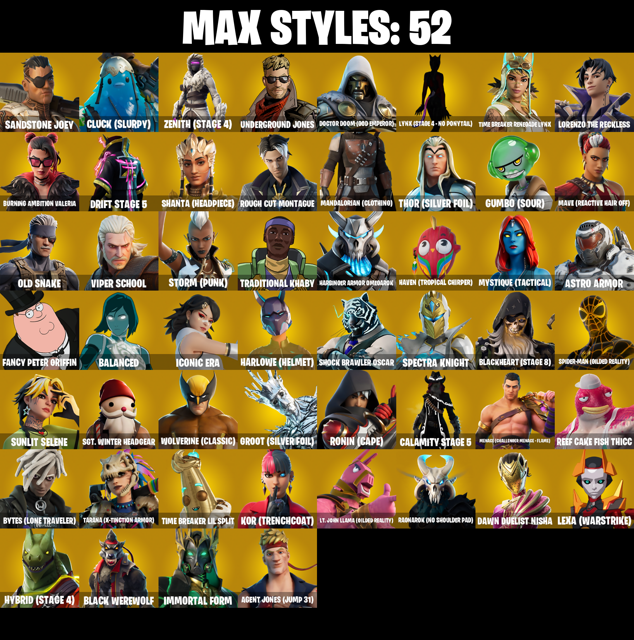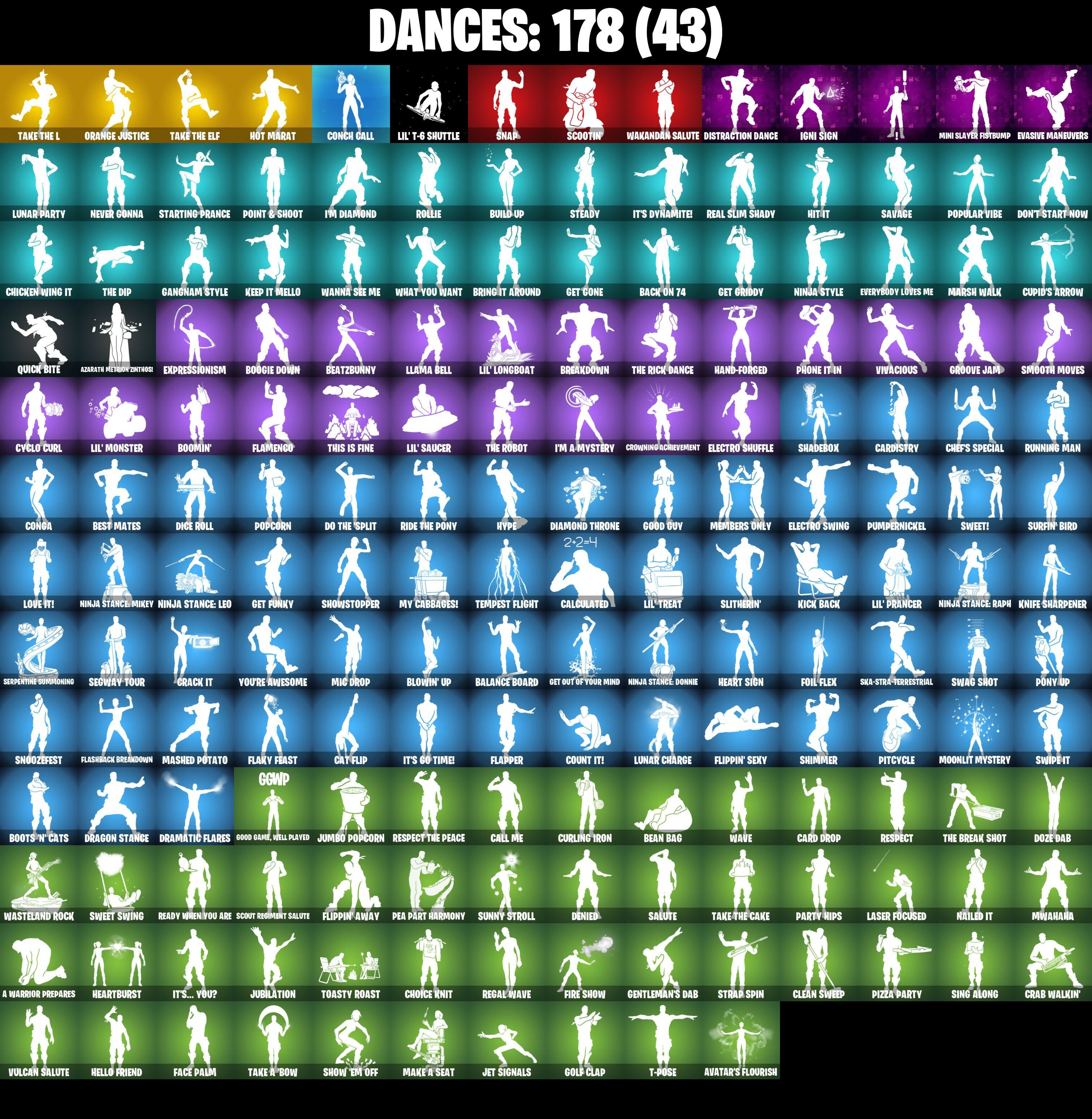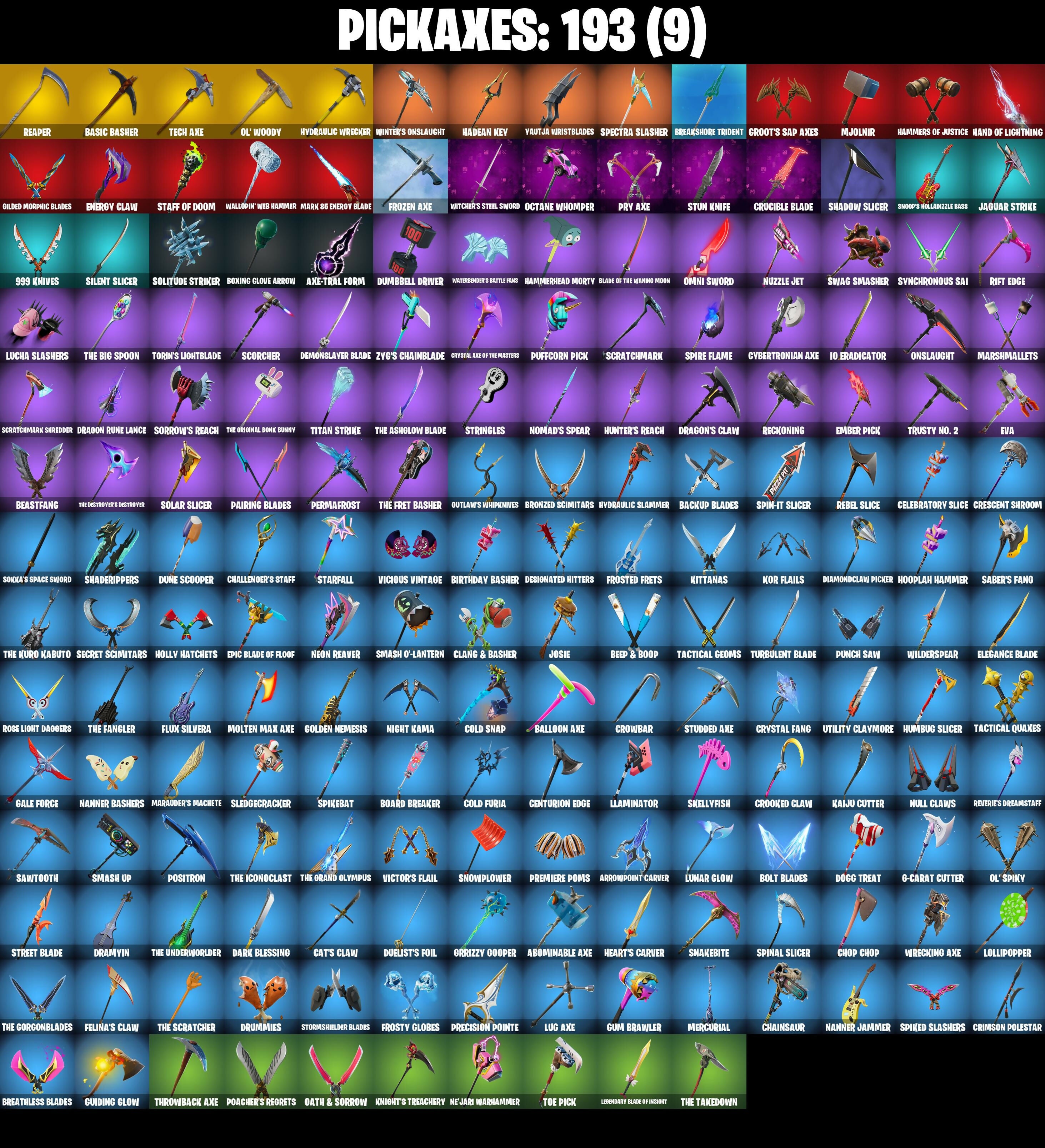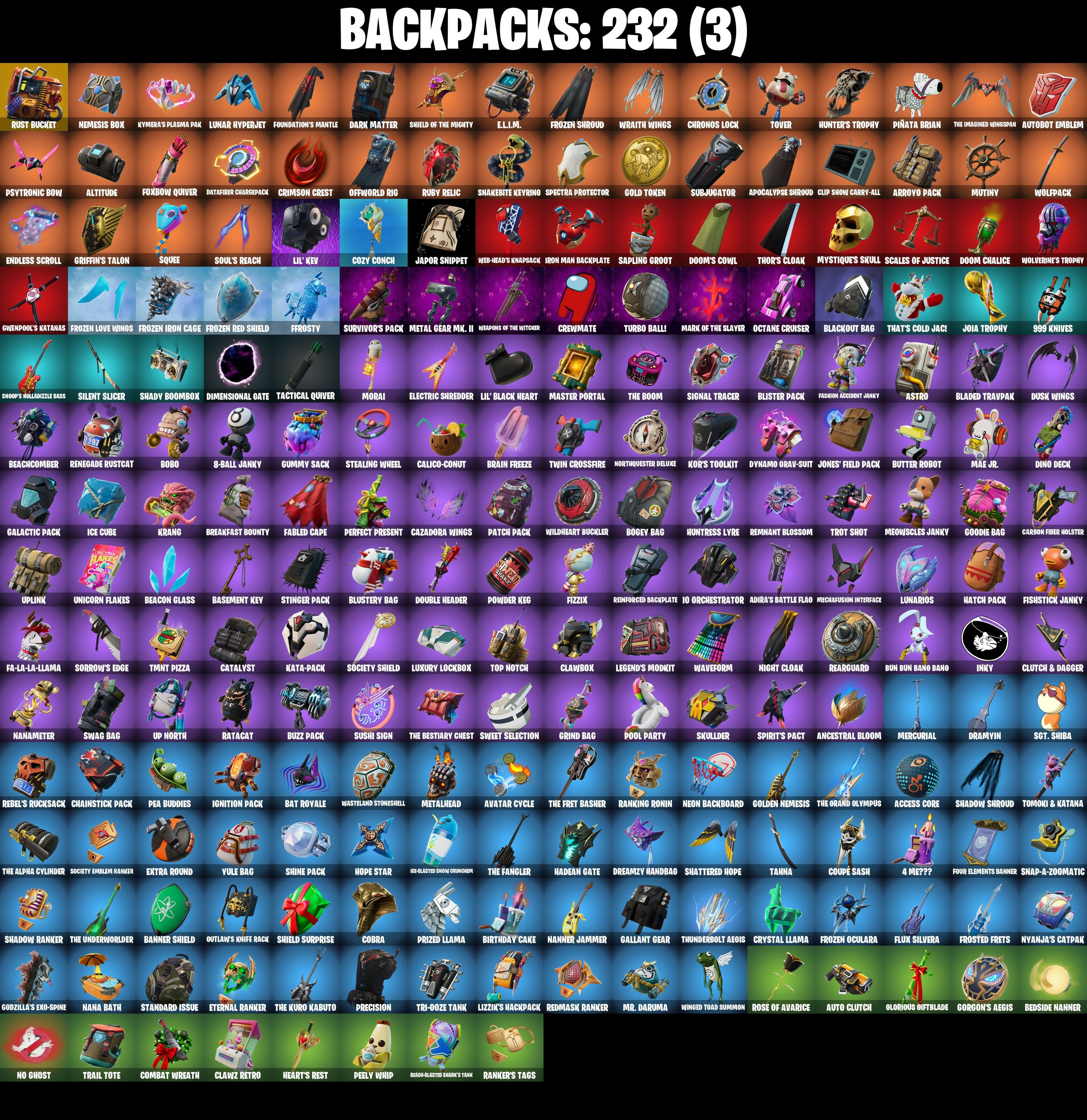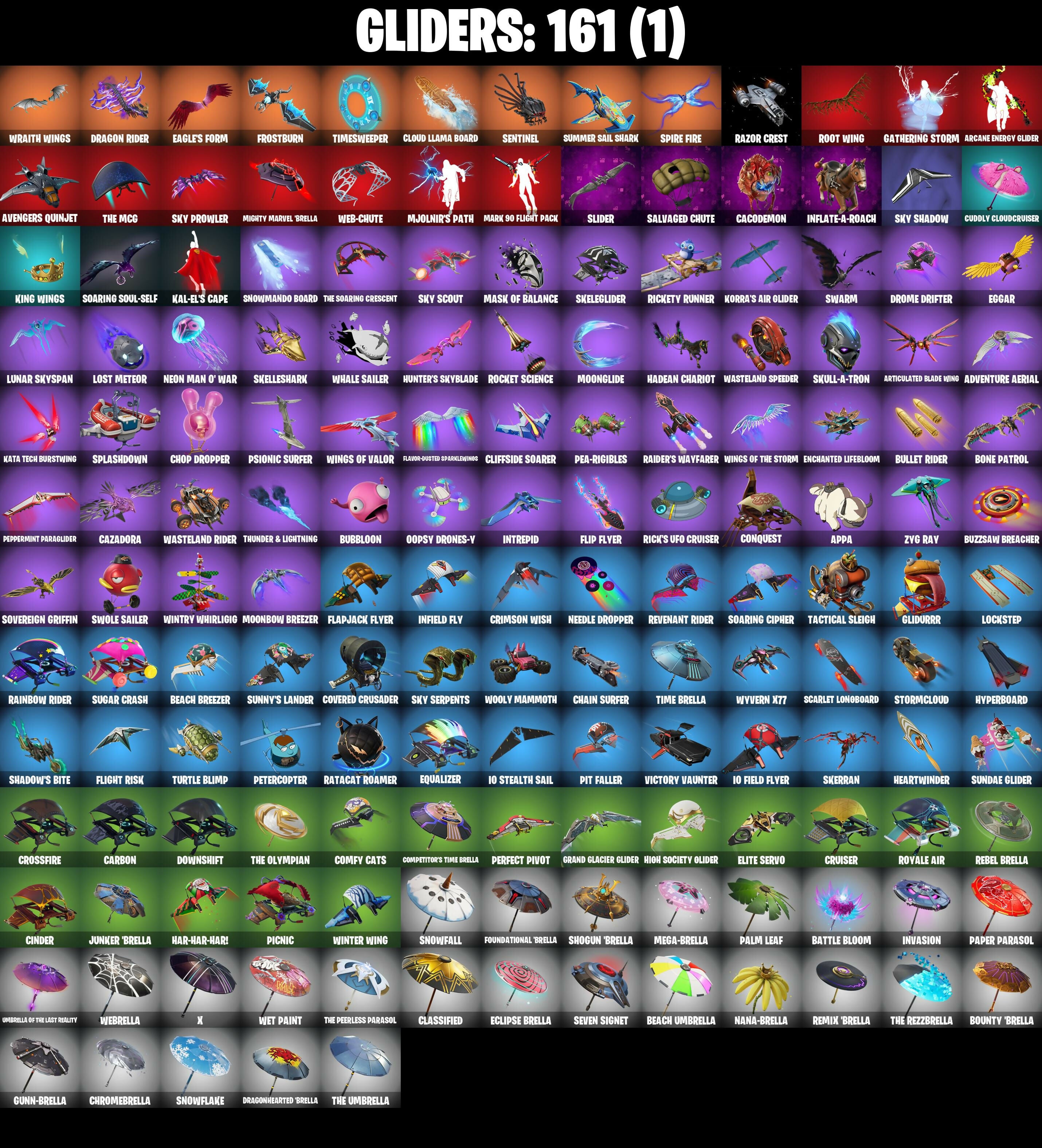10 Field Flyer, 10 Orchestrator, 10 Stealth Sail, 4 Me???, 6-Carat Cutter, 8-Ball Janky, 999 Knives, A Warrior Prepares, A.I.M., Abominable Axe, Access Core, Adira's Battle Flag, Adventure Aerial, Agent Jones, Agent Jones (Jump 31), Ahsoka Tano, Alli, Altitude, Ancestral Bloom, Antonia, Aphrodite, Apocalypse Shroud, Appa, Arcane Energy Glider, Arctic Adeline, Arrowpoint Carver, Arroyo Pack, Artemis, Articulated Blade Wing, Astro, Astro Armor, Auto Clutch, Autobot Emblem, Avatar Cycle, Avatar's Flourish, Avengers Quinjet, Axe-tral Form, Axo, Azarath Metrion Zinthos, B.R.U.T.E. Gunner, Back On 74, Backup Blades, Balance Board, Balanced, Balloon Axe, Banner Shield, Basement Key, Basic Basher, Bat Royale, Battle Bloom, Battlehawk, Beach Breezer, Beach Umbrella, Beach-Blasted Shark’s Tank, Beachcomber, Beacon Glass, Bean Bag, Beastfang, Beatzbunny, Bedside Nanner, Beep & Boop, Best Mates, Birthday Basher, Birthday Cake, Black Werewolf, Blackheart, Blackheart (Stage 8), Blackout Bag, Blade of the Waning Moon, Bladed Travpak, Blister Pack, Blowin' Up, Blustery Bag, Board Breaker, Bobo, Bogey Bag, Bolt Blades, Bone Patrol, Boogie Down, Boomin', Boots 'N Cats, Bounty 'Brella, Boxing Glove Arrow, Brain Freeze, Breakdown, Breakfast Bounty, Breakshore Trident, Breathless Blades, Bring It Around, Bronzed Scimitars, Bubbloon, Build Up, Bullet Rider, Bullseye, Bun Bun Bano Bano, Burning Ambition Valeria, Butter Robot, Buzz Pack, Buzzsaw Breacher, Bytes, Bytes (Lone Traveler), Cacodemon, Calamity, Calamity Stage 5, Calculated, Calico-Conut, Call Me, Carbide, Carbon, Carbon Fiber Holster, Card Drop, Cardistry, Cat Flip, Cat's Claw, Catalyst, Cazadora, Cazadora Wings, Celebratory Slice, Centurion, Centurion Edge, Cerberus, Chain Surfer, Chainsaur, Chainstick Pack, Challenger's Staff, Charlotte, Chef's Special, Chicken Wing It, Choice Knit, Chop Chop, Chop Dropper, Chromebrella, Chronos Lock, Cinder, Clang & Basher, Clara, Classified, Clawbox, Clawz Retro, Clean Sweep, Cliffside Soarer, Clip Show Carry-All, Cloud Llama Board, Cluck, Cluck (Slurpy), Clutch & Dagger, Cobalt, Cobra, Cold Furia, Cold Snap, Combat Wreath, Comfy Cats, Competitor's Time Brella, Conch Call, Conga, Conquest, Count It!, Coupe Sash, Covered Crusader, Cozy Conch, Crab Walkin', Crack It, Crescent Shroom, Crewmate, Crimson Crest, Crimson Polestar, Crimson Wish, Crooked Claw, Crossfire, Crowbar, Crowning Achievement, Crucible Blade, Cruiser, Crystal Axe of the Masters, Crystal Fang, Crystal Llama, Cuddly Cloudcruiser, Cupid's Arrow, Curling Iron, Cybertronian Axe, Cyclo Curl, D'Ark, DJ Yonder, Dark Blessing, Dark Matter, Dark Voyager, Datafiber Chargepack, Dawn Duelist Nisha, Deimos, Demonslayer Blade, Denied, Designated Hitters, Diamond Diva, Diamond Throne, Diamondclaw Picker, Dice Roll, Dimensional Gate, Dino Deck, Dire, Distraction Dance, Dizzie, Do The Split, Doctor Doom, Doctor Doom (God Emperor), Doctor Slone, Dogg Treat, Don't Start Now, Doom Chalice, Doom Slayer, Doom's Cowl, Double Header, Downshift, Doze Dab, Dragon Rider, Dragon Rune Lance, Dragon Stance, Dragon's Claw, Dragonhearted 'Brella, Dramatic Flares, Dramvin, Dramyin, Dreamzy Handbag, Drift, Drift Stage 5, Drome Drifter, Drummies, Duelist's Foil, Dumbbell Driver, Dune Scooper, Dusk, Dusk Wings, Dynamo Grav-Suit, E.L.I.M., Eagle's Form, Eclipse Brella, Eggar, Electric Shredder, Electro Shuffle, Electro Swing, Elegance Blade, Elite Agent, Elite Servo, Ember Pick, Enchanted Lifebloom, Endless Scroll, Energy Claw, Enforcer, Epic Blade of Floof, Equalizer, Era, Eren Jaeger, Eternal Ranker, Eva, Evasive Maneuvers, Everybody Loves Me, Evie, Expressionism, Extra Round, Fa-La-La-Llama, Fabio Sparklemane, Fable, Fabled Cape, Face Palm, Fancy Peter Griffin, Fashion Accident Janky, Felina, Felina's Claw, Fire Show, Fish Thicc, Fishstick Janky, Fizzix, Flaky Feast, Flamenco, Flapjack Flyer, Flapper, Flashback Breakdown, Flavor-Dusted Sparklewings, Flight Risk, Flip Flyer, Flippin' Away, Flippin' Sexy, Flux Silvera, Foil Flex, Foundation's Mantle, Foundational 'Brella, Four Elements Banner, Foxbow Quiver, Frost Squad, Frostburn, Frosted Frets, Frosty, Frosty Globes, Frozen Axe, Frozen Iron Cage, Frozen Love Ranger, Frozen Love Wings, Frozen Oculara, Frozen Raven, Frozen Red Knight, Frozen Red Shield, Frozen Shroud, GGWP, Galactic Pack, Gale Force, Gallant Gear, Gangnam Style, Gathering Storm, Gentleman's Dab, Geralt of Rivia, Get Funky, Get Gone, Get Griddy, Get Out of Your Mind, Giddy-Up, Gilded Morphic Blades, Glidurrr, Glorious Giftblade, Godzilla’s Exo-Spine, Gold Token, Golden Nemesis, Golf Clap, Good Game, Well Played, Good Guy, Goodie Bag, Gorgon’s Aegis, Grand Glacier Glider, Green Arrow, Griffin's Talon, Grind Bag, Grizzy Gooper, Groot, Groot (Silver Foil), Groot's Sap Axes, Groove Jam, Guggimon, Guiding Glow, Gum Brawler, Gumbo, Gumbo (Sour), Gummy Sack, Gunn-Brella, Gunnar, Gwenpool's Katanas, Hadean Chariot, Hadean Gate, Hadean Key, Hades, Hammerhead Morty, Hammers of Justice, Hand of Lightning, Hand-Forged, Har-Har-Har!, Harbinger Armor Omegarok, Harlowe, Harlowe (Helmet), Hatch Pack, Haven, Haven (Tropical Chirper), Heart Sign, Heart's Carver, Heartburst, Heartwinder, Heart’s Rest, Hello Friend, High Society Glider, Hit It, Holiday Boxy, Holly Hatchets, Hooplah Hammer, Hope, Hope Star, Hot Marat, Humbug Slicer, Hunter's Reach, Hunter's Skyblade, Hunter's Trophy, Huntmaster Saber, Huntress, Huntress Lyre, Hybrid, Hybrid (Stage 4), Hydraulic Slammer, Hydraulic Wrecker, Hype, Hyperboard, I'm A Mystery, I'm Diamond, IO Eradicator, Ice Cube, Ice-Blasted Snow Crunch, Iconic Era, Igni Sign, Ignition Pack, Imani, Immortal Form, Infield Fly, Inflate-A-Roach, Inky, Intrepid, Invasion, Iron Man Backplate, It's Dynamite!, It's Go Time!, It's... You?, Jack Gourdon, Jaguar Strike, Japor Snippet, Jennifer Walters, Jet Signals, Joey, Joia Trophy, Jolly Jammer, Joltara, Jones' Field Pack, Josie, Jubilation, Jumbo Popcorn, Junker 'Brella, KQR'S Toolkit, Kado Thorne, Kaiju Cutt