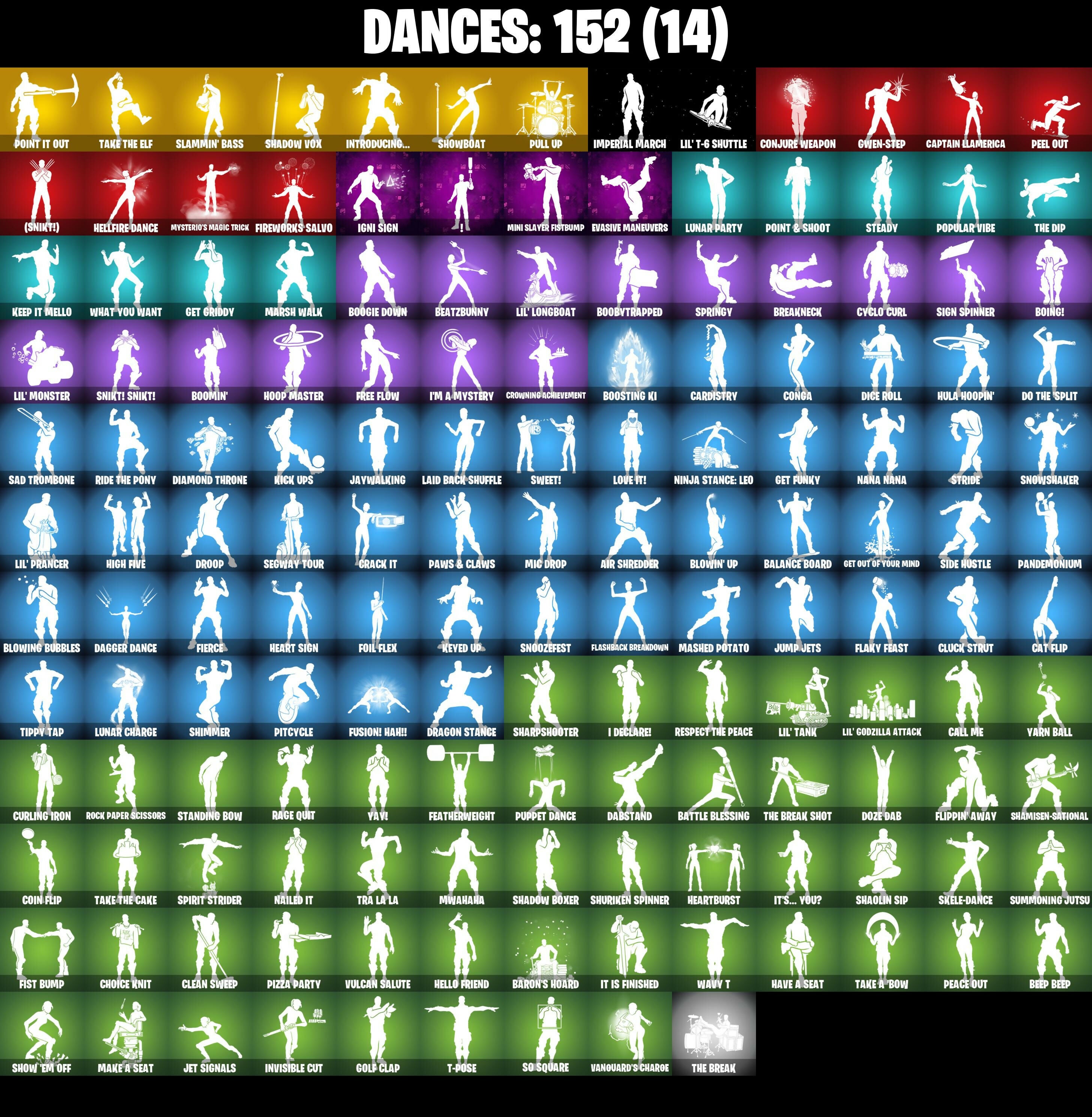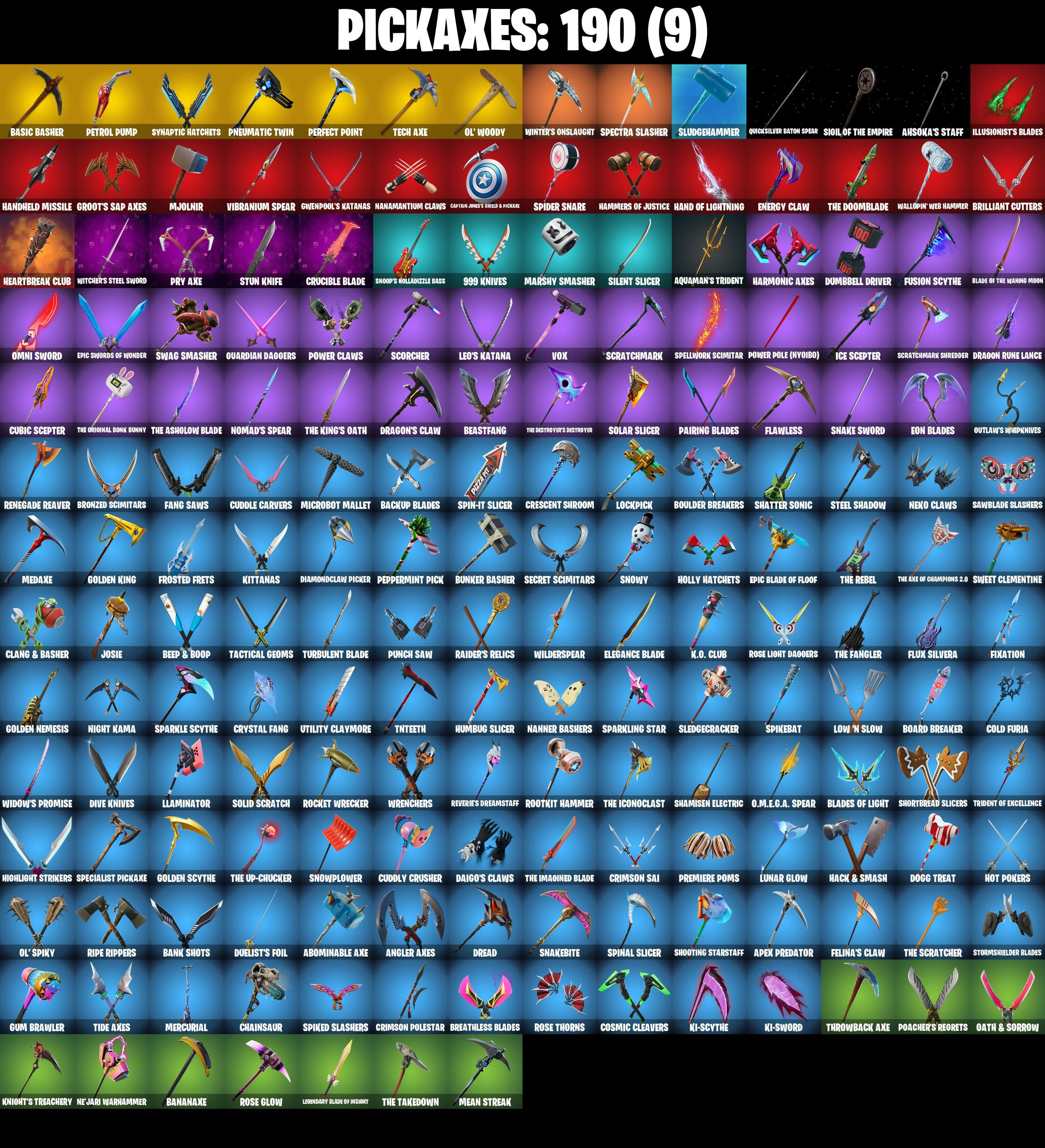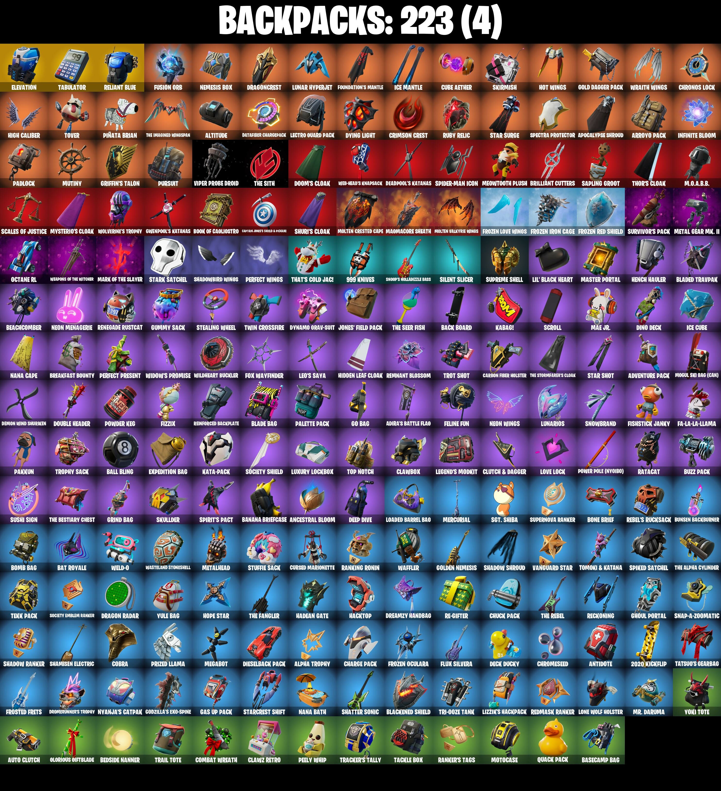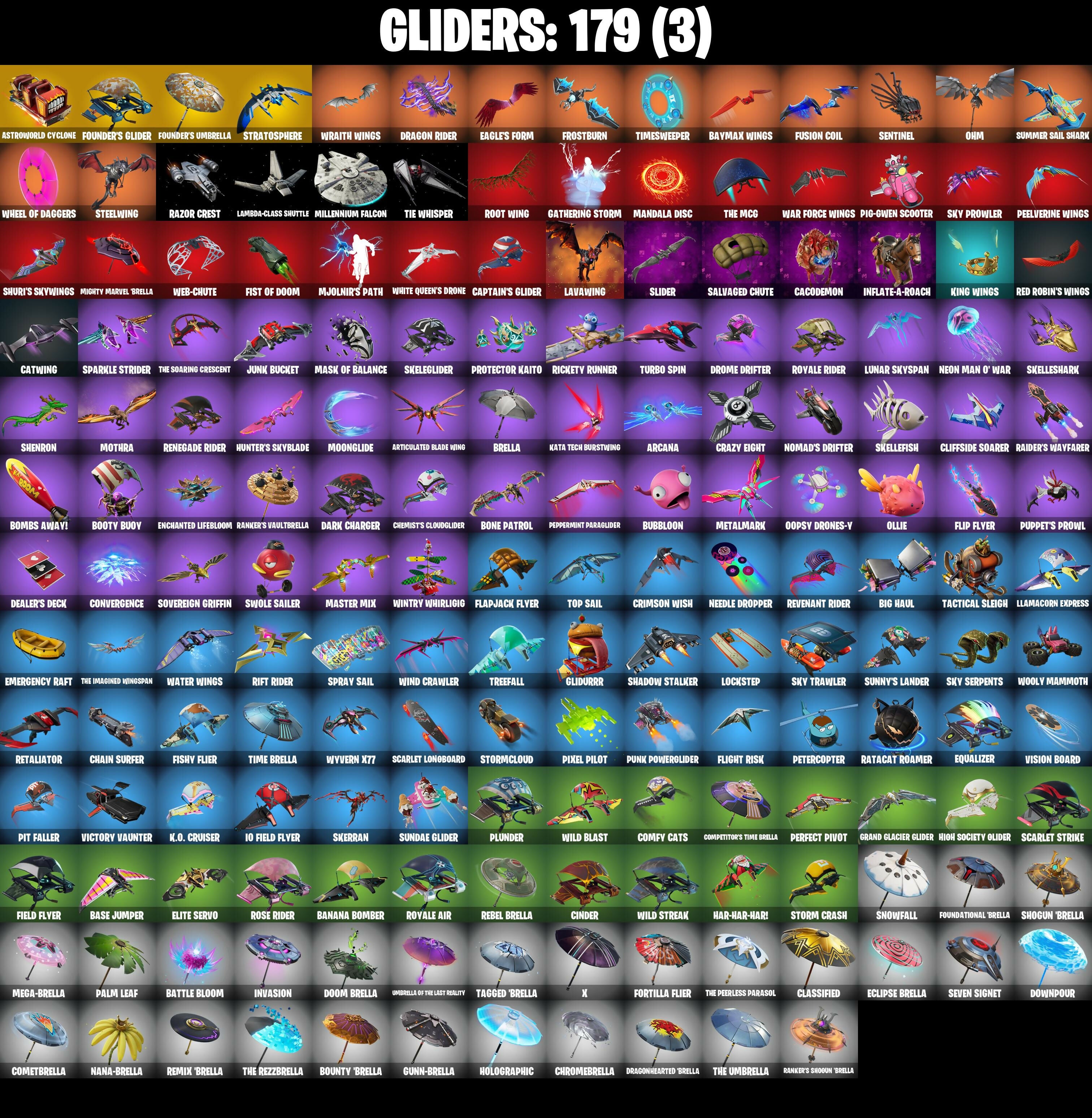 (Snikt!), 2020 Kickflip, 8-Ball Vs Scratch, 999 Knives, Abominable Axe, Adira, Adira (Battle Mask), Adira's Battle Flag, Adventure Pack, Aerial Assault Bomber, Aerial Assault Captain, Agent Jones, Agent Peely, Ahsoka Tano, Ahsoka's Staff, Air Shredder, Alpha Trophy, Altitude, Ancestral Bloom, Angler Axes, Antidote, Antonia, Apex Predator, Apocalypse Shroud, Aquaman, Aquaman's Trident, Arcana, Arctic Adeline, Arroyo Pack, Articulated Blade Wing, Astro Armor, Astroworld Cyclone, Auto Clutch, Back Board, Backlash, Backup Blades, Balance Board, Ball Bling, Banana Bomber, Banana Briefcase, Bananaxe, Bank Shots, Baron's Hoard, Base Jumper, Basecamp Bag, Basic Basher, Bat Royale, Battle Blessing, Battle Bloom, Baymax Wings, Beachcomber, Beastfang, Beatzbunny, Bedside Nanner, Beep & Boop, Beep Beep, Beerus, Big Haul, Black Panther (Shuri), Blackened Shield, Blackheart, Blackheart (Stage 8), Blade Bag, Blade of the Waning Moon, Bladed Travpak, Blades of Light, Blowin' Up, Blowing Bubbles, Board Breaker, Boing!, Bomb Bag, Bombs Away!, Bone Brief, Bone Patrol, Boobytrapped, Boogie Down, Book Of Gaolosstro, Boomin', Boosting Ki, Booty Buoy, Boulder Breakers, Bounty 'Brella, Breakfast Bounty, Breakneck, Breathless Blades, Brella, Brilliant Cutters, Brite Bomber, Bronzed Scimitars, Brutus, Bubloon, Bullseye, Bunker Basher, Bunker Jonesy, Bunsen Backburner, Buzz Pack, Cacodemon, Call Me, Cameo Vs Chic, Captain Blamerica, Captain Jones, Captain Jones's Shield & Pickaxe, Captain's Glider, Carbon Fiber Holster, Cardistry, Cat Flip, Catalyst, Catalyst (Overcharged), Catwing, Chain Surfer, Chainsaur, Charge Pack, Chemist's Cloudglider, Choice Knit, Chrome Punk, Chromebrella, Chromeseed, Chronos Lock, Chuck Pack, Cinder, Clang & Basher, Classified, Clawbox, Clawz Retro, Clean Sweep, Cliffside Soarer, Cloud Striker, Cluck Strut, Clutch & Dagger, Cobalt, Cobra, Coin Flip, Cold Furia, Collector Kado Thorne, Combat Wreath, Cometbrella, Comfy Cats, Competitor's Time Brella, Conga, Conjure Weapon, Convergence, Cosmic Cleavers, Crack It, Crazy Eight, Crescent Shroom, Crimson Crest, Crimson Polestar, Crimson Sai, Crimson Wish, Crowning Achievement, Crucible Blade, Crystal Fang, Cube Aether, Cubic Scepter, Cuddle Carvers, Cuddly Crusher, Curling Iron, Cursed Marionette, Cyclo Curl, Dabstand, Dagger Dance, Daigo, Daigo's Claws, Dali, Dark Charger, Dark Doggo, Darth Vader, Datafiber Chargepack, Deadpool, Deadpool Unmasked, Deadpool's Katanas, Dealer's Deck, Deck Ducky, Deep Dive, Demi, Demon Hunter Hope, Demon Wind Shuriken, Diamond Throne, Diamondclaw Picker, Dice Roll, Dieselback Pack, Dino Deck, Dive Knives, Do The Split, Doctor Strange, Dogg Treat, Doom, Doom Brella, Doom Slayer, Doom's Cloak, Double Header, Downpour, Doze Dab, Dragon Radar, Dragon Rider, Dragon Stance, Dragon's Claw, Dragoncrest, Dragonhearted 'Brella, Dragoon Rune Lance, Dread, Dreamzy Handbag, Drome Drifter, Dromerunner's Trophy, Droop, Duelist's Foil, Dumbbell Driver, Dying Light, Dynamo, Dynamo Grav-Suit, Eagle's Form, Eclipse Brella, Elegance Blade, Elevation, Elite Servo, Ember, Emergency Raft, Emma Frost, Enchanted Lifebloom, Energized Godzilla, Energy Claw, Eon Blades, Epic Blade of Floof, Epic Swords of Wonder, Equalizer, Era, Erisa, Eternal Voyager, Eternal Voyager (Eternal), Evasive Maneuvers, Evie, Expedition Bag, Fa-La-La-Llama, Fade, Fang Saws, Featherweight, Felina, Felina's Claw, Feline Fun, Field Flyer, Fierce, Fireworks Salvo, Fish Thicc, Fishstick Janky, Fishy Flier, Fist Bump, Fist of Doom, Fixation, Fixer, Fizzix, Flaky Feast, Flapjack Flyer, Flashback Breakdown, Flawless, Flight Risk, Flip Flyer, Flippin' Away, Flux Silvera, Focus, Foil Flex, Fortilla Flier, Foundation's Mantle, Foundational 'Brella, Founder's Glider, Founder's Umbrella, Fox Wayfinder, Free Flow, Frostburn, Frosted Frets, Frozen Iron Cage, Frozen Love Ranger, Frozen Love Wings, Frozen Oculata, Frozen Raven, Frozen Red Knight, Frozen Red Shield, Fusion, Fusion Coil, Fusion Orb, Fusion Scythe, Fusion! Hah!!, Gas Up Pack, Gathering Storm, Gear Specialist Maya, Geralt Of Rivia, Get Funky, Get Griddy, Get Out Of Your Mind, Ghoul Portal, Glidrrrr, Glorious Giftblade, Go Bag, Godzilla Evolved, Godzilla's Exo-Spine, Goku Black, Gold Dagger Pack, Golden King, Golden Nemesis, Golden Scythe, Golf Clap, Grand Glacier Glider, Griffin's Talon, Grind Bag, Groot, Groot's Sap Axes, Guardian Daggers, Guardian Jade, Gum Brawler, Gumbo, Gummy Sack, Gunn-Brella, Gunnar, Gwen-Step, Gwenpool, Gwenpool's Katanas, Haasaur, Hack & Smash, Hacktop, Hadean Gate, Hammers of Justice, Hand of Lightning, Handheld Missile, Har-Har-Har!, Harbinger Armor Omeborok, Harlowe, Harmonic Axes, Have A Seat, Haven, Heart Sign, Heartbreak Club, Heartbreak Ranger, Heartburst, Hellfire Dance, Hello Friend, Hench Hauler, Hero Baymax, Hidden Leaf Cloak, High Caliber, High Five, High Society Glider, Highlight Strikers, Holiday Boxy, Holly Hatchets, Holographic, Hoop Master, Hope, Hope Star, Hot Pokers, Hot Wings, Hula Hoopin', Humbug Slicer, Hunter's Skyblade, Hybrid, Hybrid (Stage 4), I Declare!, I'm A Mystery, IO Field Flyer, Ice Cube, Ice King (Gold), Ice Mantle, Ice Scepter, Igni Sign, Illusionist's Blades, Imperial March, Indiana Jones, Infinite Bloom, Inflate-A-Roach, Introducing..., Invasion, Invisible Cut, It Is Finished, It's... You?, Jackie, Jade, Jaywalking, Jennifer Walters, Jet Signals, Jones' Field Pack, Josie, Journey Vs Hazard, Jules, Jump Jets, Junk Bucket, K.O. Club, K.O. Cruiser, Kabag!, Kado Thorne, Kakashi Hatake, Kata Tech Burstwing, Kata-Pack, Keep It Mello, Kendo, Keyed Up, Khaby Lame, Ki-Scythe, Ki-Sword, Kiara K.O., Kiara K.O. (Captain's Bomber), Kick Ups, King Wings, Kintsugi Daigo, Kit, Kittanas, Knight's Treachery, Kondor, Krisabelle, Laid Back Shuffle, Lambda-Class Shuttle, Lara Croft, Lavawing, Lectro Guard Pack, Legend's Modkit, Legendary Blade of Insight, Leo's Katana, Leo's Saya, Leonardo, Lil Split, Lil T-6 Shuttle, Lil' Black Heart, Lil' Godzilla Attack, Lil' Longboat, Lil