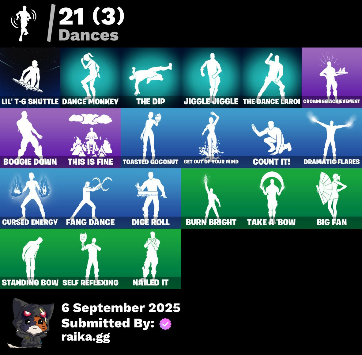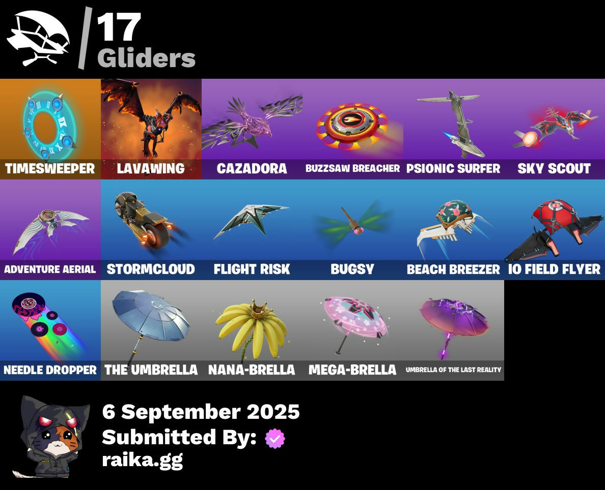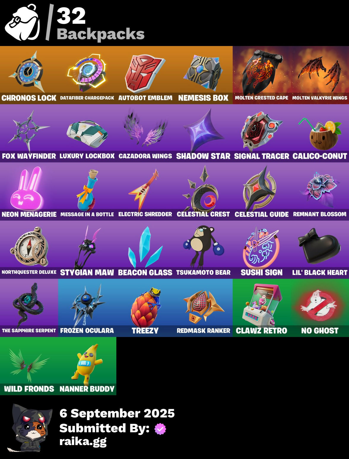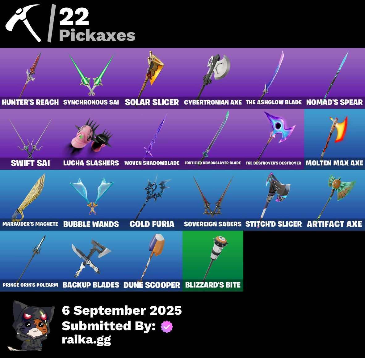 Adventure Aerial, Artifact Axe, Autobot Emblem, Backup Blades, Beach Breezer, Beacon Glass, Big Fan, Blizzard's Bite, Boogie Down, Breezabelle, Bubble Wands, Bugsy, Burn Bright, Buzzsaw Breacher, Calico-Coconut, Cazadora, Cazadora Wings, Celestial Crest, Celestial Guide, Chronos Lock, Clawz Retro, Cold Furia, Count It!, Crowning Achievement, Cursed Energy, Cybertronian Axe, Dance Monkey, Datafiber Chargepack, Dice Roll, Dramatic Flares, Dune Scooper, Electric Shredder, Era, Fang Dance, Flight Risk, Fortified Demonslayer Blade, Fox Wayfinder, Frozen Oculara, Get Out Of Your Mind, Hunter's Reach, IO Field Flyer, Jiggle Jiggle, Lavawing, Lil' Black Heart, Lil' T-6 Shuttle, Lorenzo, Lucha Slashers, Luxury Lockbox, Marauder's Machete, Mariposa, Mega-Brella, Message In A Bottle, Molten Battle Hound, Molten Crested Cape, Molten Max Axe, Molten Valkyrie, Molten Valkyrie Wings, Nailed It, Nana-Brella, Nanner Buddy, Needle Dropper, Nemesis Box, Neon Menagerie, No Ghost, Nolan Chance, Nomad's Spear, Northquester Deluxe, Optimus Prime, Prince Orin, Prince Orin's Polearm, Princess Lexa, Psionic Surfer, Purradise Meowscles, Redmask Ranker, Relik, Remnant Blossom, Rian, Santa Dogg, Self Reflexing, Shadow Star, Signal Tracer, Sky Scout, Slayer Charlotte, Solar Slicer, Sovereign Sabers, Standing Bow, Stitch'd Slicer, Stormcloud, Streetwear Yuji Itadori, Stygian Maw, Styx, Sushi Sign, Swift Sai, Synchronous Sai, Take A 'Bow, The Ashglow Blade, The Dance Laroi, The Destroyer's Destroyer, The Dip, The Sapphire Serpent, The Umbrella, This Is Fine, Timesweeper, Toasted Coconut, Trace, Treezy, Tsukamoto Bear, Umbrella Of The Last Reality, Underworld Desdemona, Vikora, Wild Fronds, Woven Shadowblade
