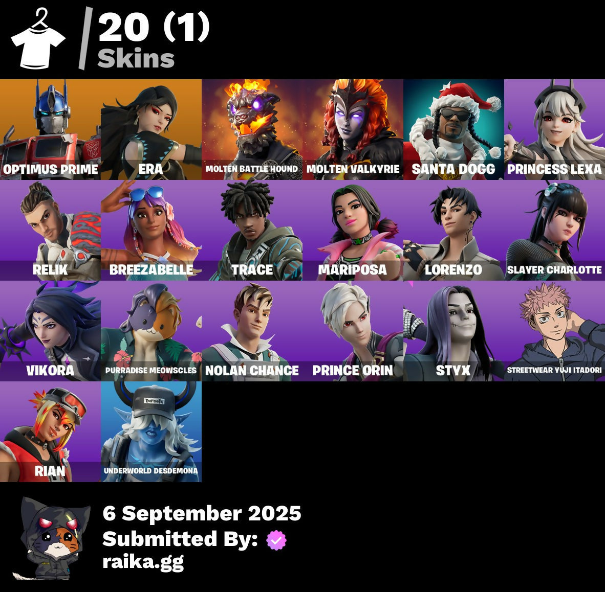 [PC/PSN/XBOX] 20 skins | Optimus Prime | Era | Molten Battle Hound | Molten Valkyrie | Santa Dogg | Princess Lexa | Relik | Breezabelle | Trace | Mariposa | 450 VB