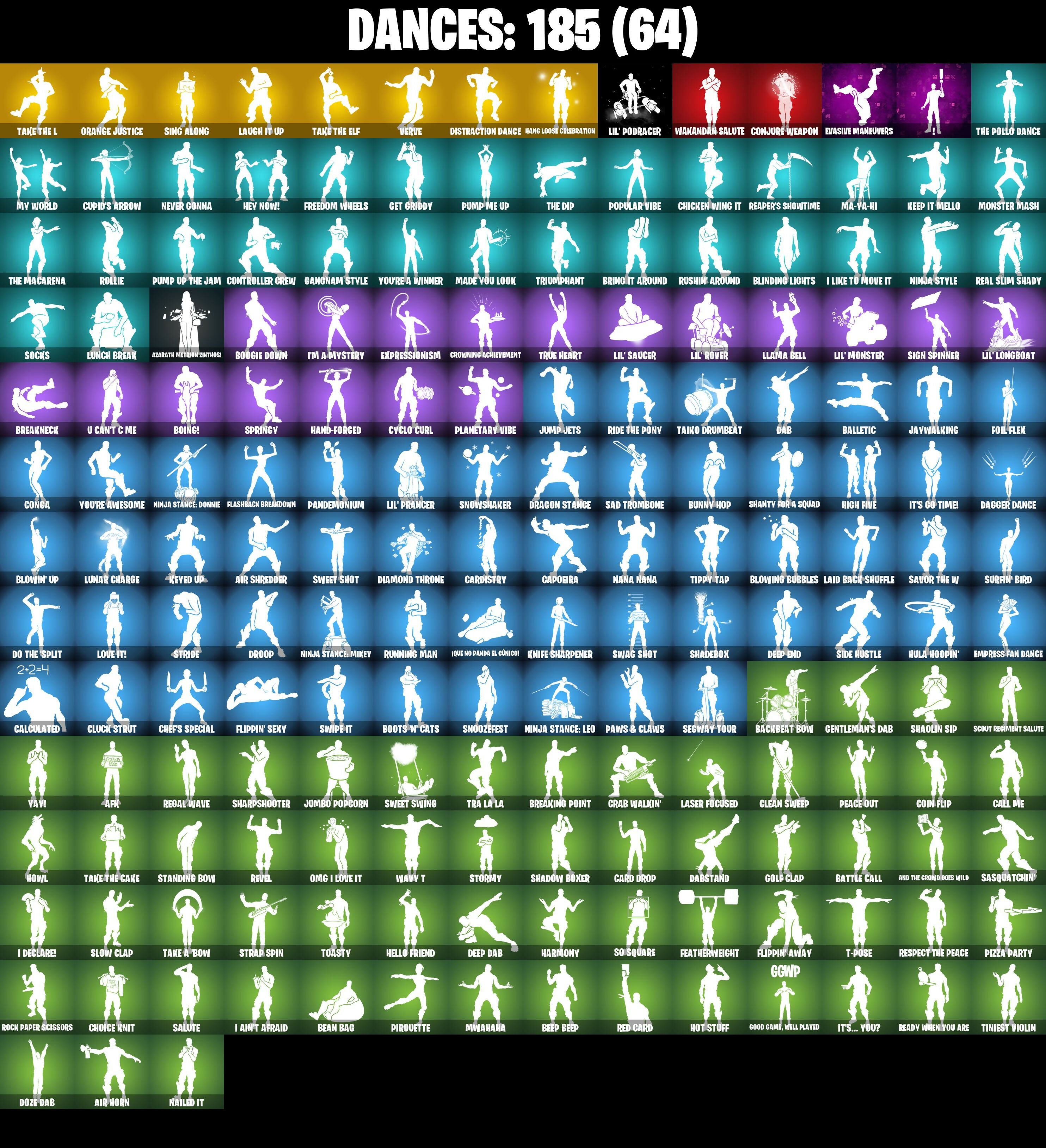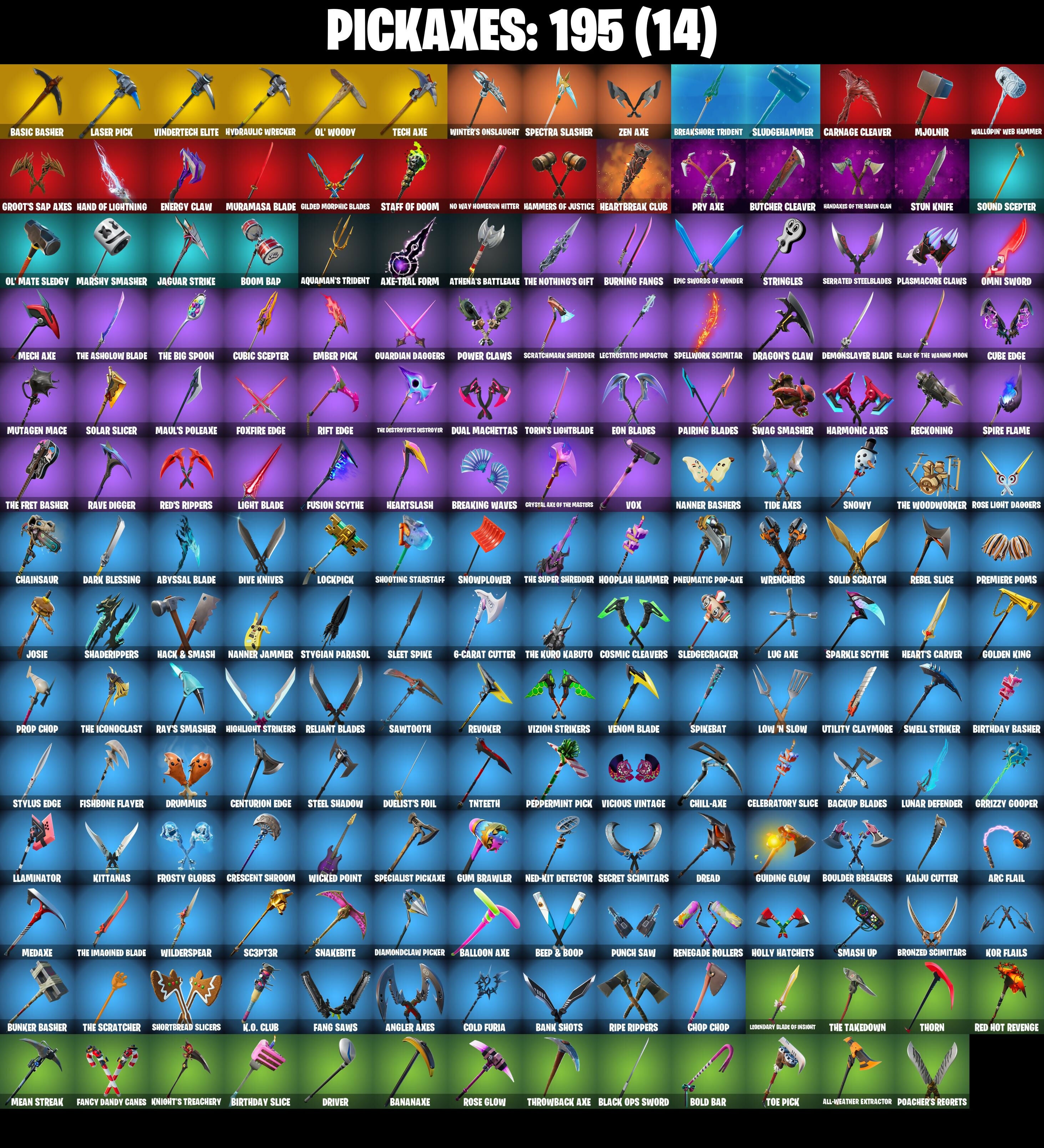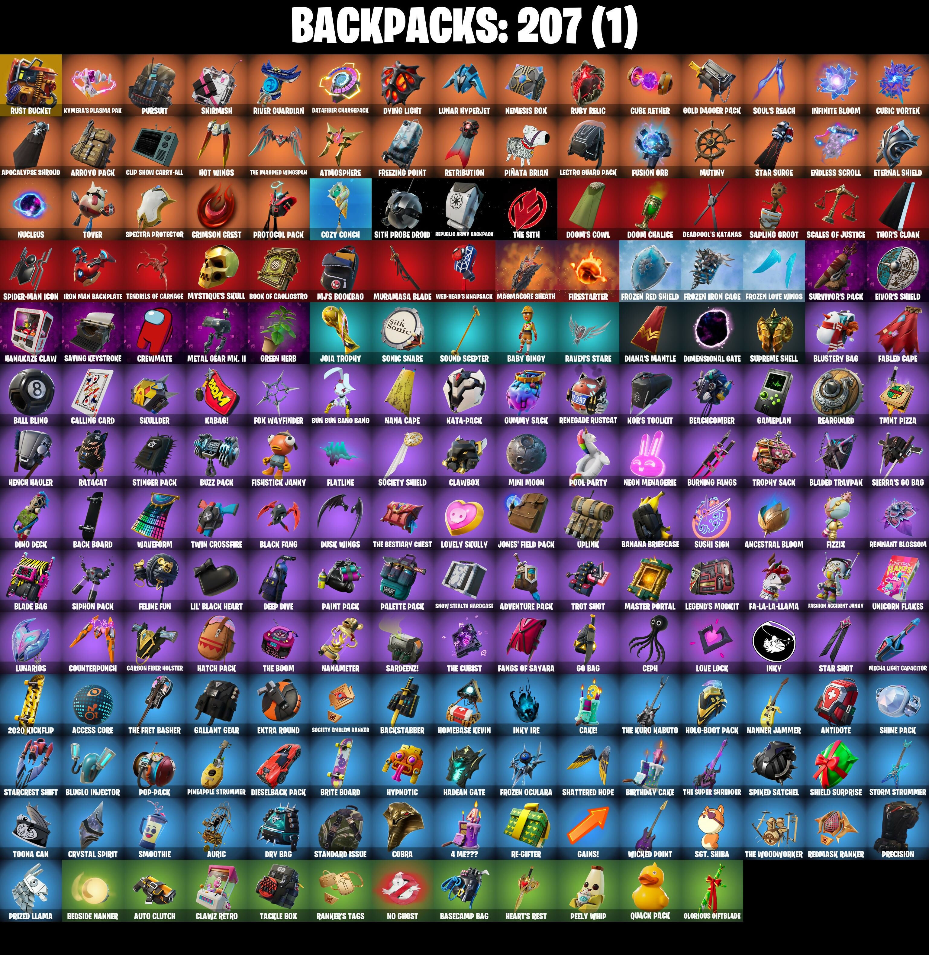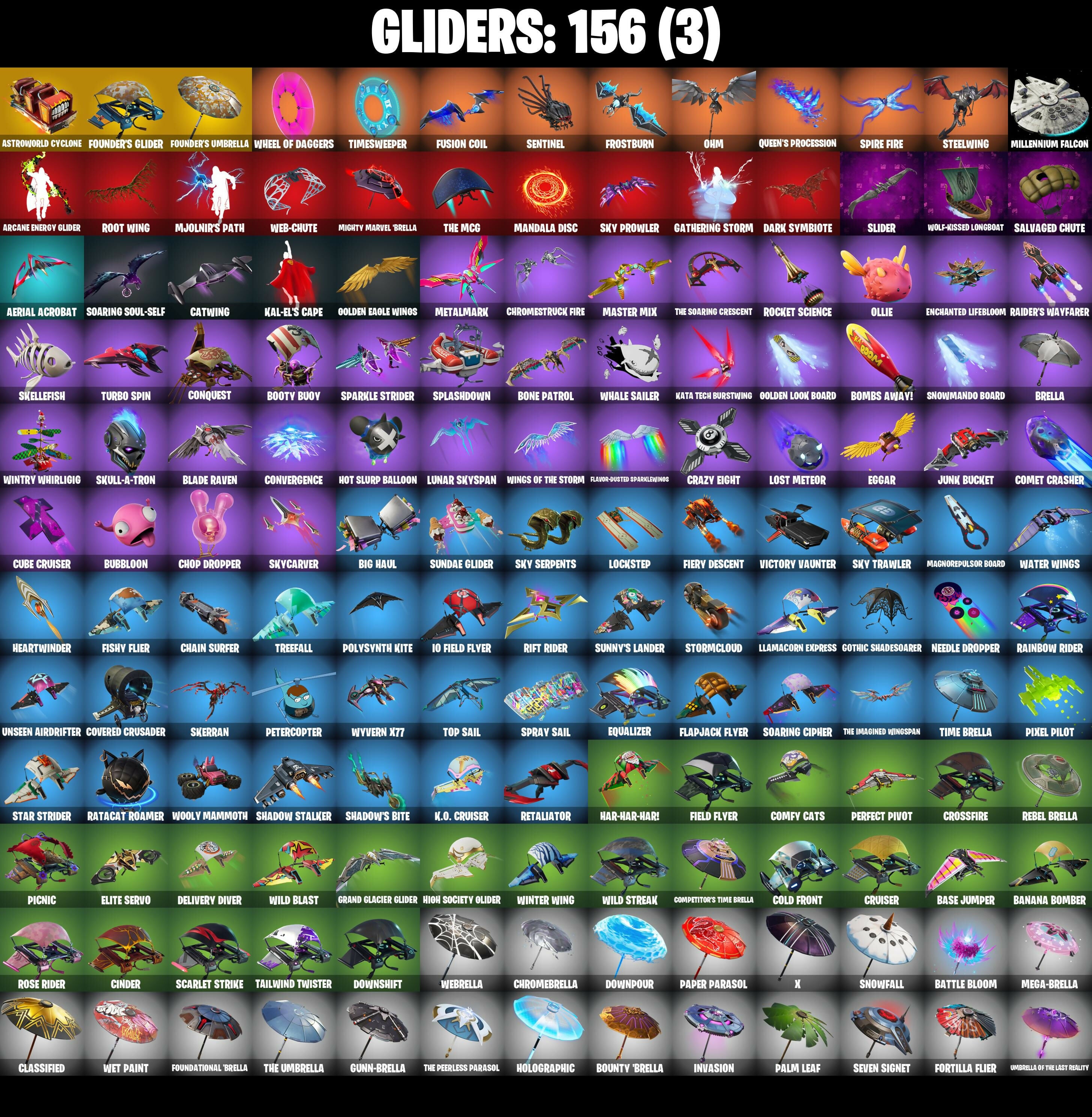 #Keyed Up#, 10 Field Flyer, 2020 Kickflip, 4 M????, 6-Carat Cutter, 8-Ball vs Scratch, AFK, Absenz, Abyssal Blade, Access Core, Adventure Pack, Aerial Acrobat, Aftermath, Agent Jones, Agent Jones (Jump 31), Agent Peely, Air Horn, Air Shredder, All-Weather Extractor, Ancestral Bloom, And The Crowd Goes Wild, Anderson .Paak, Angler Axes, Antidote, Aphrodite, Apocalypse Shroud, Aquaman, Aquaman's Trident, Arc Flail, Arcane Energy Glider, Arctic Adeline, Arkosa's Clone Trooper, Arroyo Pack, Arthur Curry, Astroworld Cyclone, Athena's Battleaxe, Atmosphere, Auric, Auto Clutch, Axe-tral Form, Azarath Metrion Zinthos!, Baba Yaga, Baby Gingy, Back Board, Backbeat Bow, Backstabber, Backup Blades, Ball Bling, Balletic, Balloon Axe, Banana Bomber, Banana Briefcase, Bananaxe, Bank Shots, Base Jumper, Basecamp Bag, Basic Basher, Battle Bloom, Battle Call, Beach Bomber, Beachcomber, Bean Bag, Bedside Nanner, Beep & Boop, Beep Beep, Big Haul, Birthday Basher, Birthday Cake, Birthday Slice, Black, Black Fang, Black Ops Sword, Blackheart, Blackheart (Stage 8), Blade Bag, Blade Raven, Blade of the Waning Moon, Bladed Travpak, Blaze, Blinding Lights, Blowin' Up, Blowing Bubbles, Blustery Bag, Boing!, Bold Bar, Bombs Away!, Bone Patrol, Boogie Down, Book of Caoloistro, Boom Bap, Boots 'N' Cats, Booty Buoy, Boulder Breakers, Bounty 'Brella, Breaking Point, Breaking Waves, Breakneck, Breakshore Trident, Brella, Bring It Around, Brite Board, Bronzed Scimitars, Bruno Mars, Brutus, Bubblegum Highwire, Bubloon, Buglo Injector, Bun Bun Bang Bang, Bunker Basher, Bunker Jonesy, Bunny Hop, Burning Ambition Valeria, Burning Fangs, Butcher Cleaver, Buzz Pack, Bytes, Bytes (Lone Traveler), Cake!, Calamity, Calamity Stage 5, Calculated, Call Me, Calling Card, Cameo vs Chic, Capoeira, Carbon Fiber Holster, Card Drop, Cardistry, Carnage, Carnage (Maximum), Carnage Cleaver, Catalyst, Catwing, Celebratory Slice, Centurion, Centurion Edge, Ceph, Cerberus, Chain Surfer, Chainsaur, Chaos Origins, Chaos Origins (Shadow), Charlotte, Charlotte (Golden Rune), Chef's Special, Chicken Wing It, Chill-axe, Choice Knit, Chop Chop, Chop Dropper, Chris Redfield, Chrome Brella, Chromestruck Fire, Cinder, Classified, Clawbox, Clawz Retro, Clean Sweep, Clip Show Carry-All, Clone Trooper, Cluck, Cluck (Slurpy), Cluck Strut, Cobra, Coin Flip, Cold Front, Cold Furia, Comet Crasher, Comfy Cats, Competitor's Time Brella, Conga, Conjure Weapon, Conquest, Controller Crew, Convergence, Coruscant Guard, Cosmic Cleavers, Counterpunch, Covered Crusader, Cozy Conch, Crab Walkin', Crazy Eight, Crescent Shroom, Crewmate, Crimson Crest, Crossfire, Crowning Achievement, Cruiser, Crystal Axe of the Masters, Crystal Spirit, Cube Aether, Cube Assassin, Cube Cruiser, Cube Edge, Cubic Scepter, Cubic Vortex, Cupid's Arrow, Cyclo Curl, D'ark, DJ Yonder, Dab, Dabstand, Dagger Dance, Dark Blessing, Dark Symbiote, Darth Maul, Datafiber Chargepak, Dawn Duelist Nisha, Deadpool, Deadpool Unmasked, Deadpool's Katanas, Deep Dab, Deep Dive, Deep End, Delivery Diver, Demi, Demonslayer Blade, Diamond Diva, Diamond Hanz, Diamond Throne, Diamondclaw Picker, Diana's Mantle, Dieselback Pack, Dimensional Gate, Dino Deck, Distraction Dance, Dive Knives, Dizzie, Do The Split, Doctor Doom, Doctor Strange, Doctor Strange (Stealth Silver), Doom Chalice, Doom's Cowl, Downpour, Downshift, Doze Dab, Dragon Stance, Dragon's Claw, Dread, Drift, Drift Stage 5, Driver, Droop, Drummies, Dry Bag, Dual Machettas, Duelist's Foil, Dusk Wings, Dying Light, Eggar, Eivor Varinsdottir, Eivor's Shield, Electrostatic Impactor, Elite Servo, Ember, Ember Pick, Empress Fan Dance, Enchanted Lifebloom, Endless Ned, Endless Scroll, Energy Claw, Eon Blades, Epic Swords of Wonder, Equalizer, Era, Erisa, Erisa (Stealth Silver), Eternal Knight, Eternal Shield, Eternal Voyager, Etheria, Evasive Maneuvers, Evie, Expressionism, Extra Round, Ezio Auditore, Fa-La-La-Llama, Fabio Sparklemane, Fabio Sparklemane (Golden Rune), Fable, Fabled Cape, Fade, Fancy Dandy Canes, Fancy Peter Griffin, Fang Saws, Fangs of Sayara, Fashion Accident Janky, Featherweight, Feline Fun, Field Flyer, Fiery Descent, Firestarter, Fishbone Flayer, Fishstick Janky, Fishy Flier, Fizzix, Flapjack Flyer, Flashback Breakdown, Flatline, Flavor-Dusted Sparkle Wings, Flippin' Away, Flippin' Sexy, Foil Flex, Fortilla Flier, Foundational 'Brella, Founder's Glider, Founder's Umbrella, Fox Wayfinder, Foxfire Edge, Freedom Wheels, Freezing Point, Frost Squad, Frostbite, Frostburn, Frosty Globes, Frozen Iron Cage, Frozen Love Ranger, Frozen Love Wings, Frozen Oculara, Frozen Raven, Frozen Red Knight, Frozen Red Shield, Fusion, Fusion Coil, Fusion Orb, Fusion Scythe, Gains!, Galaxy Scout, Gallant Gear, Gameplan, Gangnam Style, Gathering Storm, Gear Specialist Maya, Gear Specialist Maya (Hat - Dark), Gentleman's Dab, Get Griddy, Giddy-Up, Gilded Morphic Blades, Glorious Giftblade, Go Bag, Gold Dagger Pack, Gold Midas, Golden Eagle Wings, Golden King, Golden Look Board, Golf Clap, Good Game, Well Played, Gothic Shadesoarer, Grand Glacier Glider, Green Herb, Grizzly Gooper, Groot, Groot's Sap Axes, Grriz, Guardian Daggers, Guggimon, Guiding Glow, Gum Brawler, Gumbo, Gumbo (Sour), Gummy Sack, Gunn-Brella, Gunnar, Gunnar (Stealth Silver), Hack & Smash, Hadean Gate, Hammers of Justice, Hanakaze Claw, Hand of Lightning, Hand-Forged, Handaxes of the Raven Clan, Hang Loose Celebration, Happy, Har-Har-Har!, Harbinger Armor Omegarok, Harlowe, Harlowe (Helmet), Harmonic Axes, Harmony, Hatch Pack, Haven, Heart's Carver, Heart's Rest, Heartbreak Club, Heartbreak Ranger, Heartslash, Heartwinder, Hello Friend, Hench Hauler, Hey Now!, High Five, High Society Glider, Highlight Strikers, Highwire, Holiday Boxy, Holly Hatchets, Holo-Boot Pack, Holographic, Homebase Kevin, Hooplah Hammer, Hope, Hot Slurp Balloon, Hot Stuff, Hot Wings, Howl, Hula Hoopin', Huntress, Hybrid, Hybrid (Stage 4), Hydraulic Wrecker, Hypnotic, I Ain't Afraid, I Declare!, I Like To Move It, I'm A Mystery