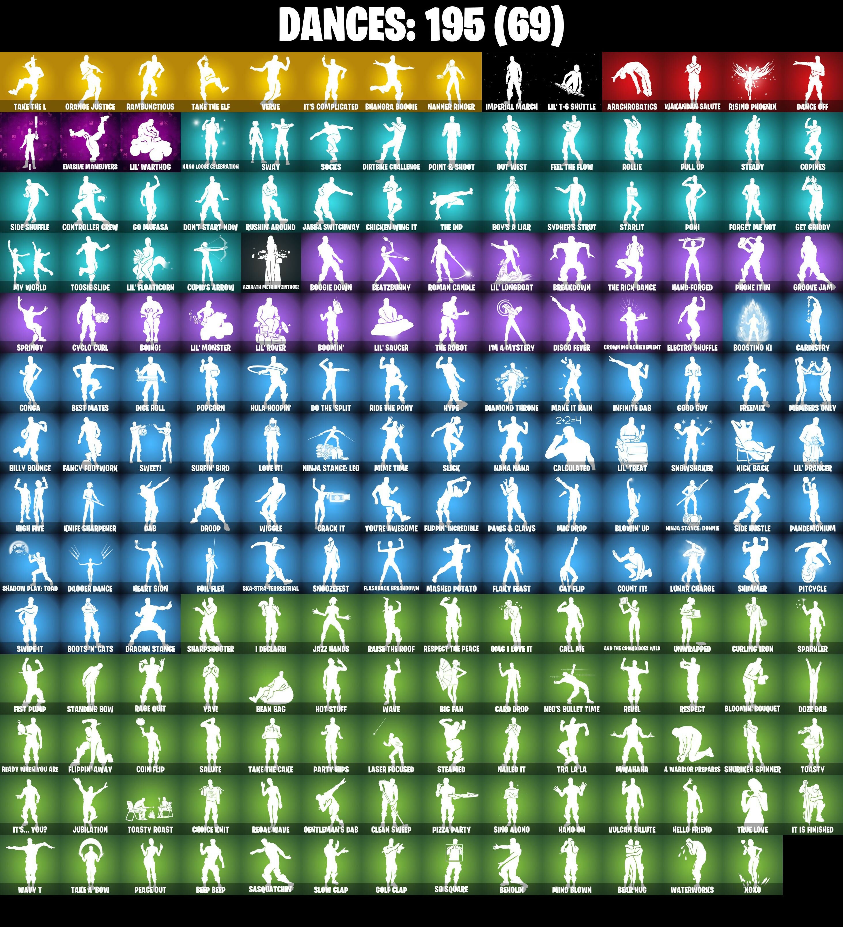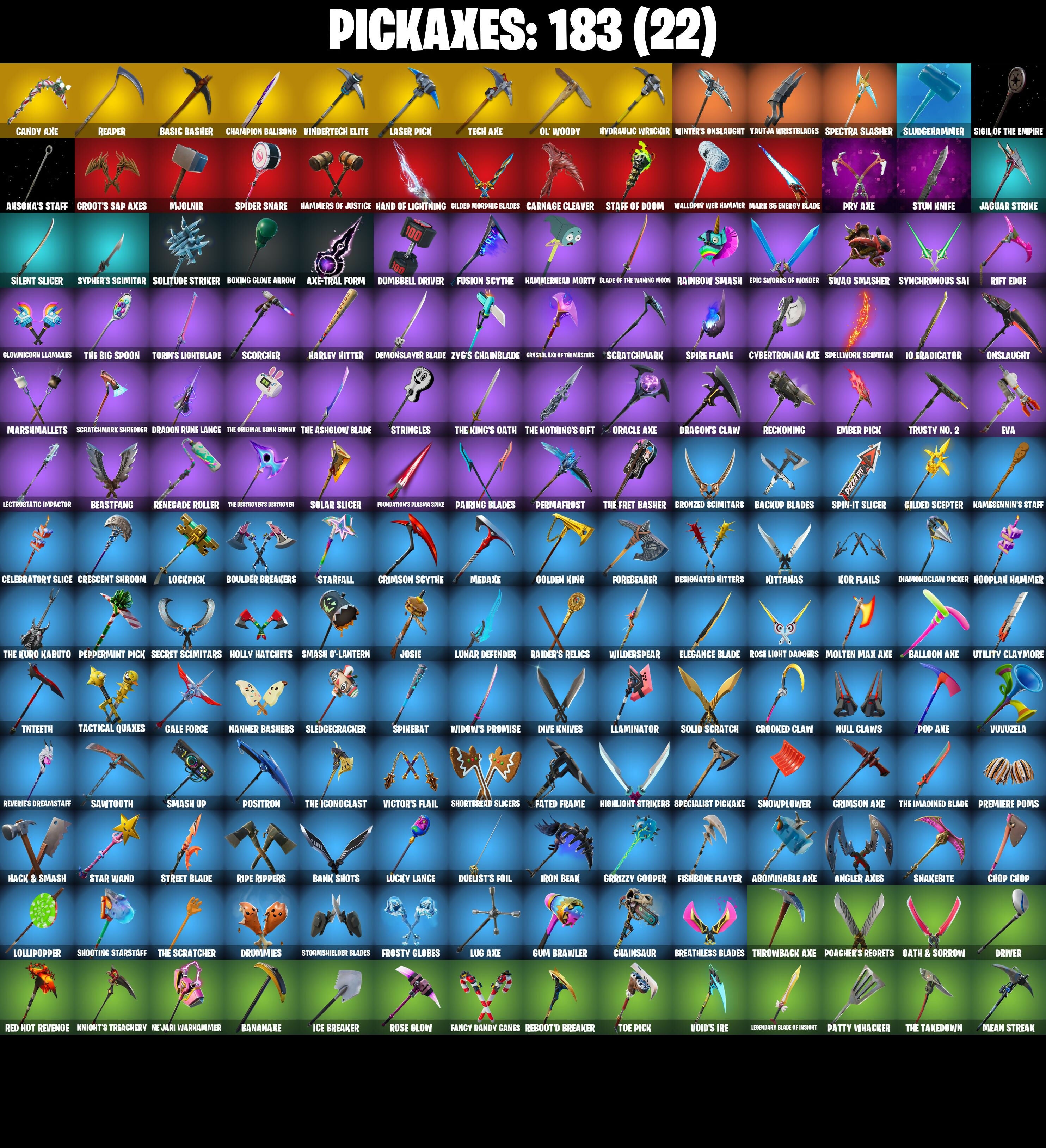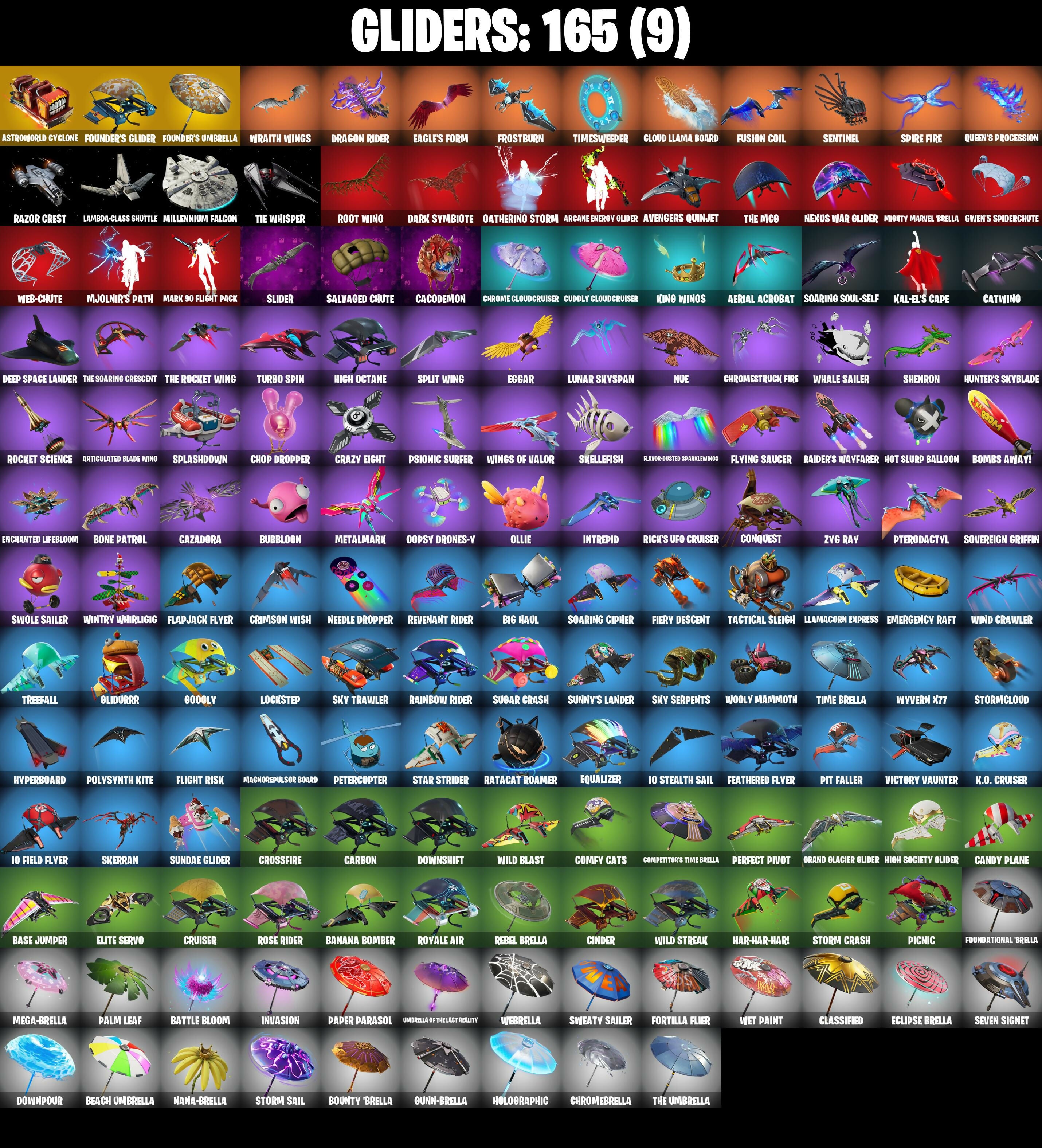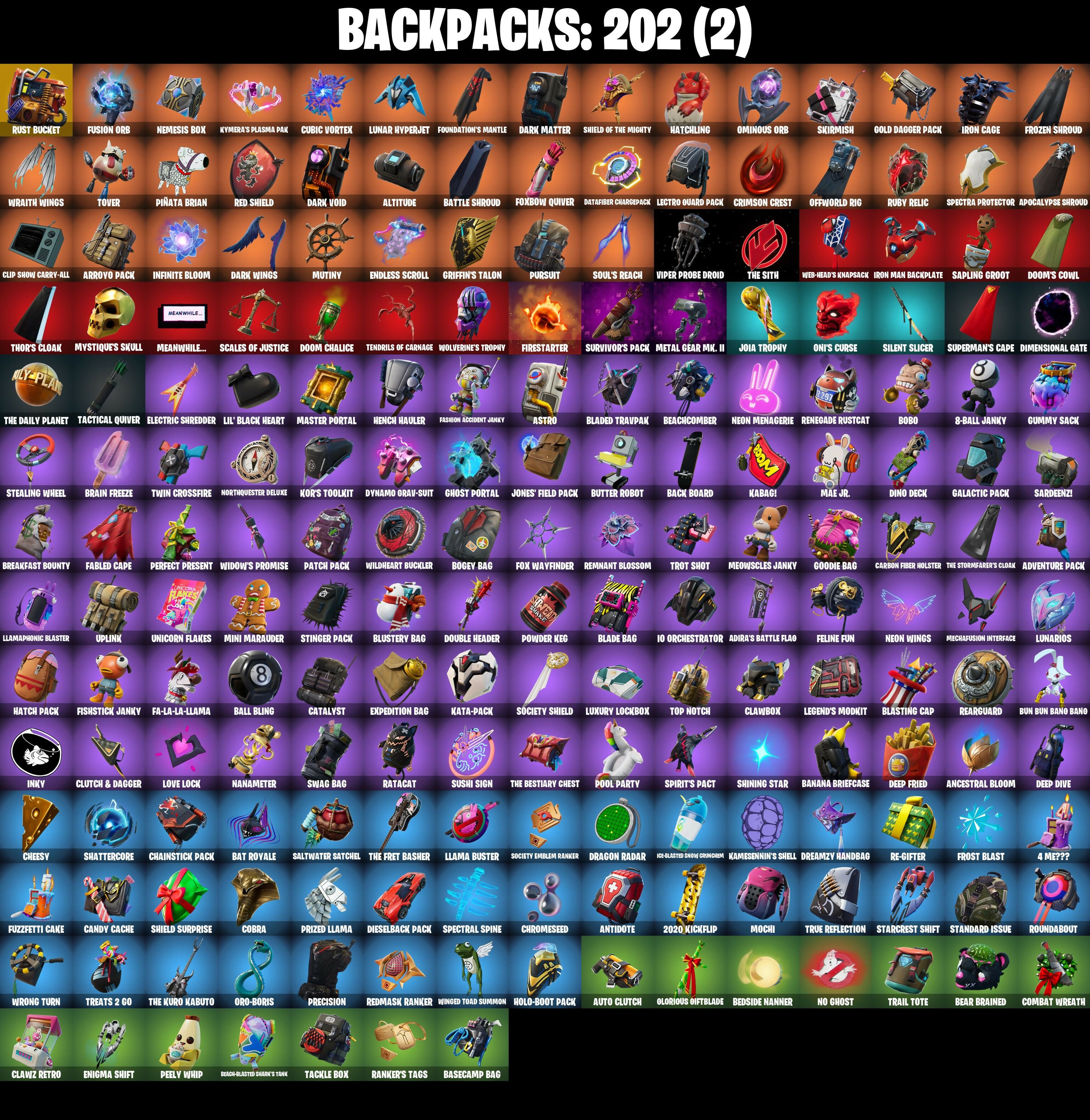 2020 Kickflip, 4 Me???, 8 Ball vs Scratch, 8-Ball Janky, A Warrior Prepares, Abominable Axe, Adira, Adira (Battle Mask), Adira's Battle Flag, Adventure Pack, Aerial Acrobat, Agent Jones, Agent Jones (Jump 31), Agent Peely, Ahsoka's Staff, Altitude, Ancestral Bloom, And The Crowd Goes Wild, Angler Axes, Antidote, Antonia, Apocalypse Shroud, Arachrobatics, Arcane Energy Glider, Arroyo Pack, Articulated Blade Wing, Astra, Astro, Astroworld Cyclone, Aura, Auto Clutch, Avengers Quinjet, Axe-Trial Form, Azarath Metrion Zinthos, Bachii, Back Board, Backup Blades, Ball Bling, Balloon Axe, Banana Bomber, Banana Briefcase, Bananaxe, Bank Shots, Base Jumper, Basecamp Bag, Basic Basher, Bat Royale, Battle Bloom, Battle Shroud, Battlehawk, Beach Umbrella, Beach-Blasted Shark's Tank, Beachcomber, Bean Bag, Bear Brained, Bear Hug, Beastfang, Beatzbunny, Bedside Nanner, Beef Boss, Beep Beep, Behold!, Best Mates, Bhangra Boogie, Big Fan, Big Haul, Billy Bounce, Blackheart, Blackheart (Stage 8), Blade Bag, Blade Of The Waning Moon, Bladed Travpak, Blasting Cap, Blaze, Bloomin’ Bouquet, Blowin’ Up, Blustery Bag, Bobo, Bogey Bag, Boing!, Bombs Away!, Bone Patrol, Boogie Down, Boomin’, Boosting Ki, Boots ‘n’ Cats, Boulder Breakers, Bounty Brella, Boxing Glove Arrow, Boy’s A Liar, Brain Freeze, Brainiac, Branded Brigadier, Breakdown, Breakfast Bounty, Breathless Blades, Bronzed Scimitars, Bubbloon, Bun Bun Bano Bano, Burning Ambition Valeria, Butter Robot, Bytes, Bytes (Lone Traveler), Cacodemon, Calamity, Calamity Stage 5, Calculated, Call Me, Cameo vs Chic, Candy Axe, Candy Cache, Candy Plane, Carbide, Carbide Armor Stage 5, Carbon, Carbon Fiber Holster, Card Drop, Cardistry, Carnage, Carnage (Maximum), Carnage Cleaver, Cat Flip, Catalyst, Catwing, Cazadora, Celebratory Slice, Chainsaur, Chainstick Pack, Champion Balisong, Champion Kyra, Charlotte, Cheesy, Chicken Wing It, Choice Knit, Chop Chop, Chop Dropper, Chrome Cloudcruiser, Chrome Punk, Chromebrella, Chromeseed, Chromestruck Fire, Cinder, Clark Kent, Clark Kent (Superman), Classified, Clawbox, Clawz Retro, Clean Sweep, Clinical Crosser, Clip Show Carry-All, Cloud Llama Board, Cluck, Cluck (Slurpy), Clutch & Dagger, Cobra, Coin Flip, Collector Kado Thorne, Combat Wreath, Comfy Cats, Commando, Competitor's Time Brella, Conga, Conquest, Controller Crew, Copines, Count It!, Crack It, Crazy Eight, Crescent Shroom, Crimson Axe, Crimson Crest, Crimson Scythe, Crimson Wish, Crooked Claw, Crossfire, Crowning Achievement, Cruiser, Cryptic, Crystal, Crystal Axe Of The Masters, Cubic Vortex, Cuddly Cloudcruiser, Cupid’s Arrow, Curling Iron, Cybertronian Axe, Cyclo Curl, DJ Yonder, Dab, Dagger Dance, Dance Off, Dark Matter, Dark Symbiote, Dark Vanguard, Dark Void, Dark Voyager, Dark Wings, Darth Vader, Datafiber Charapack, Deadpool, Deadpool Unmasked, Deep Dive, Deep Fried, Deep Space Lander, Demonslayer Blade, Designated Hitters, Diamond Throne, Diamondclaw Picker, Dice Roll, Dieselback Pack, Dimensional Gate, Dino Deck, Dirtbike Challenge, Disco Fever, Dive Knives, Do The Split, Doctor Doom, Doctor Doom (God Emperor), Doctor Slone, Doctor Slone (Prismatic), Don’t Start Now, Doom Chalice, Doom's Cowl, Double Header, Downpour, Downshift, Doze Dab, Dragon Radar, Dragon Rider, Dragon Rune Lance, Dragon Stance, Dragon's Claw, Dreamzy Handbag, Drift, Drift Stage 5, Driver, Droop, Drummies, Duelist's Foil, Dumbbell Driver, Dummy, Dummy Supreme, Dynamo Grav-Suit, Eagle's Form, Echo, Eclipse Brella, Eggar, Electric Shredder, Electro Shuffle, Elegance Blade, Elite Agent, Elite Servo, Ember Pick, Emergency Raft, Enchanted Lifebloom, Endless Scroll, Enigma Shift, Epic Swords Of Wonder, Equalizer, Eva, Evasive Maneuvers, Evie, Evie (Summer Strider), Expedition Bag, Fa-La-La-Llama, Fabio Sparklemane, Fabled Cape, Fancy Dandy Canes, Fancy Footwork, Fancy Peter Griffin, Fashion Accident Janky, Fate, Fated Frame, Feathered Flyer, Feel The Flow, Feline Fun, Fiery Descent, Firestarter, Fireworks Team Leader, Fish Thicc, Fishbone Flayer, Fishstick, Fishstick Janky, Fist Pump, Flaky Feast, Flapjack Flyer, Flashback Breakdown, Flavor-Dusted Sparklewings, Flight Risk, Flippin’ Away, Flippin’ Incredible, Flying Saucer, Foil Flex, Forebearer, Forget Me Not, Fortilla Flier, Foundation's Mantle, Foundation's Plasma Spike, Foundational 'Brella, Founder's Glider, Founder's Umbrella, Fox Wayfinder, Foxbow Quiver, Freemix, Frost Blast, Frost Squad, Frostburn, Frosty Globes, Frozen Shroud, Fusion, Fusion Coil, Fusion Orb, Fusion Scythe, Fuzzetti Cake, Galactic Pack, Gale Force, Gathering Storm, Gear Specialist Maya, Gear Specialist Maya (Hat-Dark), Gentleman’s Dab, Get Griddy, Ghost Portal, Ghoul Trooper, Giddy-Up, Gilded Morphic Blades, Gilded Scepter, Glidurr, Glorious Giftblade, Glownicorn Llamaxes, Go Mufasa, Gold Brutus, Gold Dagger Pack, Gold Meowscles, Gold Midas, Golden King, Golf Clap, Good Guy, Goodie Bag, Googly, Grand Glacier Glider, Green Arrow, Griffin's Talon, Grizzly Gooper, Groot, Groot (Silver Foil), Groot's Sap Axes, Groove Jam, Grriz, Guggimon, Guggimon (Prismatic), Guild, Gum Brawler, Gumbo, Gumbo (Sour), Gummy Sack, Gunn-Brella, Gwen's Spiderchute, Hack & Smash, Hammerhead Morty, Hammers Of Justice, Hand Of Lightning, Hand-Forged, Hang Loose Celebration, Hang On, Har-Har-Har!, Harbinger Armor Omebarok, Harley Hitter, Harlowe, Harlowe (Helmet), Hatch Pack, Hatchling, Haven, Haven (Tropical Chirper), Head (Droopy), Heart Sign, Hello Friend, Hench Hauler, High Five, High Octane, High Society Glider, Highlight Strikers, Holiday Boxy, Holly Hatchets, Holo-Boot Pack, Holographic, Hooplah Hammer, Hope, Hot Slurp Balloon, Hot Stuff, Hula Hoopin’, Hunter's Skyblade, Huntress, Hybrid, Hybrid (Stage 4), Hydraulic Wrecker, Hype, Hyperboard, I Declare!, IO Eradicator, IO Field Flyer, IO Orchestrator, IO Stealth Sail, Ice Breaker, Ice-Blasted Snow Crunch, Imperial March, Indiana Jones, Indiana Jones (Temple Explorer), Inferno, Infinite Bloom, Infinite Dab, Inky