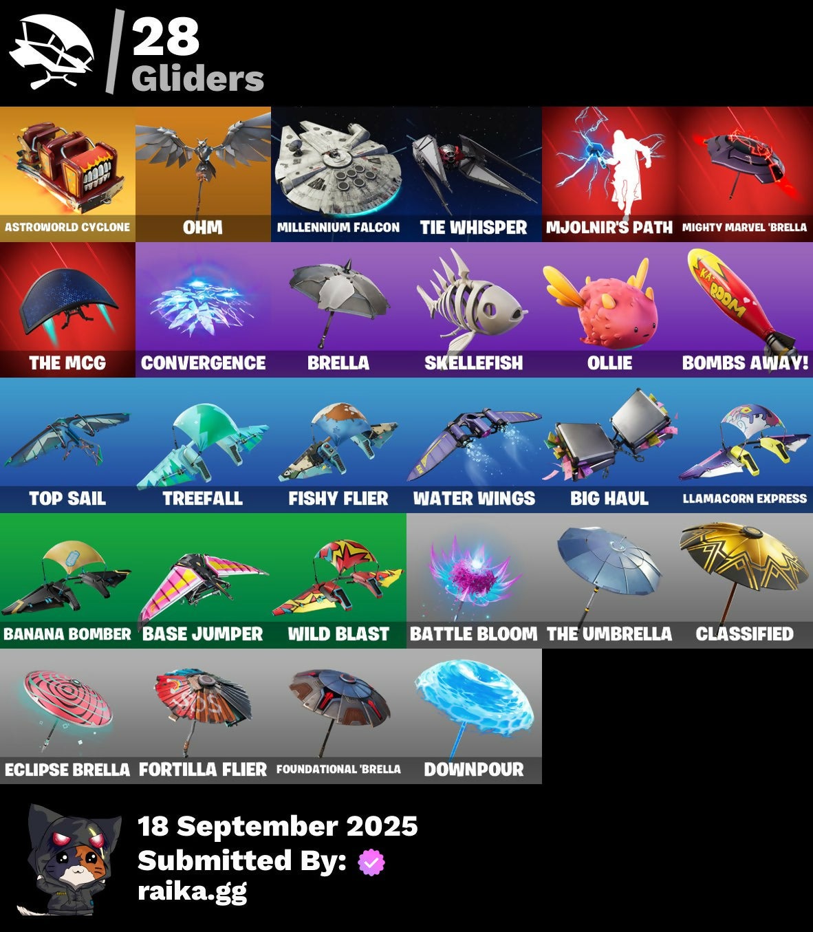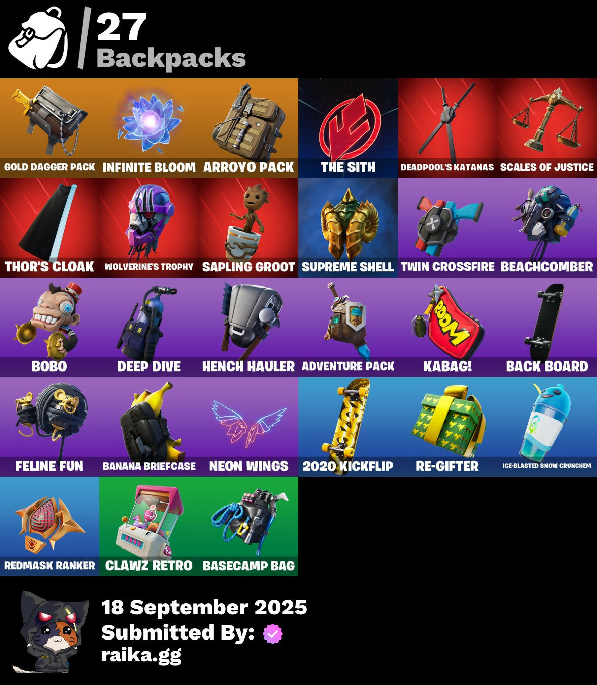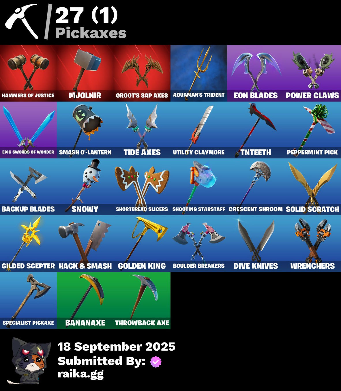 2020 Kickflip, 8-Ball, A.L.T.E.R., Adira's Armor, Adventure Pack, Afterparty, Agent Jones, Agent Nana, Agent Peely, Air Shredder, Aquaman, Aquaman's Trident, Arroyo Pack, Arthur Curry, Astro Antidote, Astro Jack, Astroworld Cyclone, Back Board, Backup Blades, Banana Bomber, Banana Briefcase, Bananaxe, Banner, Banner Icon, Base Jumper, Basecamp Bag, Batman, Battle Bloom, Battle Mode, Beachcomber, Beep Beep, Berserker Barrage!, Big Haul, Blasted, Bobo, Bombs Away!, Both Eyes Open, Boulder Breakers, Brella, Brutus, Calico, Call Me, Cash Grab, Classified, Clawz Retro, Clean Sweep, Coin Flip, Comet, Convergence, Cowboy Chat, Crabby King, Crescent Shroom, Deadpool, Deadpool Unmasked, Deadpool's Katanas, Deep Dive, Denim Destiny, Dive Knives, Dolphin, Downpour, Dynamite, E.G.O., Eclipse Brella, Eon Blades, Epic Swords Of Wonder, Everything's Fine, Fade, Feline Fun, Fish Hook, Fishbone, Fishy Flier, Fist, Flippin' Away, Fortilla Flier, Foundational 'Brella, Fryangles, G.O.A.T., Gear Specialist Maya, Gilded Scepter, Gold Brutus, Gold Dagger Pack, Gold Midas, Gold Touch, Golden King, Golden Shine, Greed, Groot, Groot Glow, Groot's Sap Axes, Hack & Smash, Hammerhead, Hammers Of Justice, Happy, Head Banger, Hench, Hench Hauler, Ice-Blasted Snow Crunchem, Industrious, Infinite Bloom, Jennifer Walters, Jules, Jules' Mask, Kabag!, Kaboom!, Keyed Up, King's Wrath, Kit, Llamacorn Express, Lobby Classic, Lt. Evergreen, Mandalorian, Masked, Master Engineer, Mecha Fish, Meowabunga!, Meowscles, Meowstermind, Midas Memory, Midas' Shadow, Mighty Marvel 'Brella, Mighty Tree, Millennium Falcon, Mjolnir, Mjolnir Strike, Mjolnir's Path, Monks, Neon Wings, New Year 2020, Ocean, Ocean Wave, Ohm, Ollie, Oni Mask, Pandemonium, Paper Plane, Paws & Claws, Peppermint Pick, Power Claws, Rage, Rage Quit, Re-Gifter, Redmask Ranker, Respect The Peace, Ride The Corn!, Riptide, Rock Love, Rocket, Roses, Sap, Sapling Groot, Scales Of Justice, Scuba Jonesy, Shadow Ghost, Shaolin Sip, Sharpshooter, She-Hulk Smash, Shooting Starstaff, Shortbread Slicers, Side Hustle, Sing Along, Sionica, Sith, Skellefish, Skye, Slam Dunk, Smash O'-Lantern, Snowshaker, Snowy, So Square, Solid Scratch, Specialist Pickaxe, Spreading Chaos, Springy, Spy Vs Banana, Starshine, Stay Smooth, Storm King, Supreme Shell, Take A 'Bow, The McG, The Sith, The Umbrella, Thor, Thor's Cloak, Throwback Axe, Thumbs Down, Tide Axes, Tie Whisper, Tippy Tap, Tnteeth, Tntina, Top Sail, Treefall, Trident!, Twin Crossfire, Undercurrent, Utility Claymore, Verdant Vascularity, Verve, Wade Grenade, Water Wings, Well Wrapped, Wild Blast, Wolverine, Wolverine's Claw, Wolverine's Trophy, Wooly Warrior, Wrenchers, X-Mass Sweater, Yay!