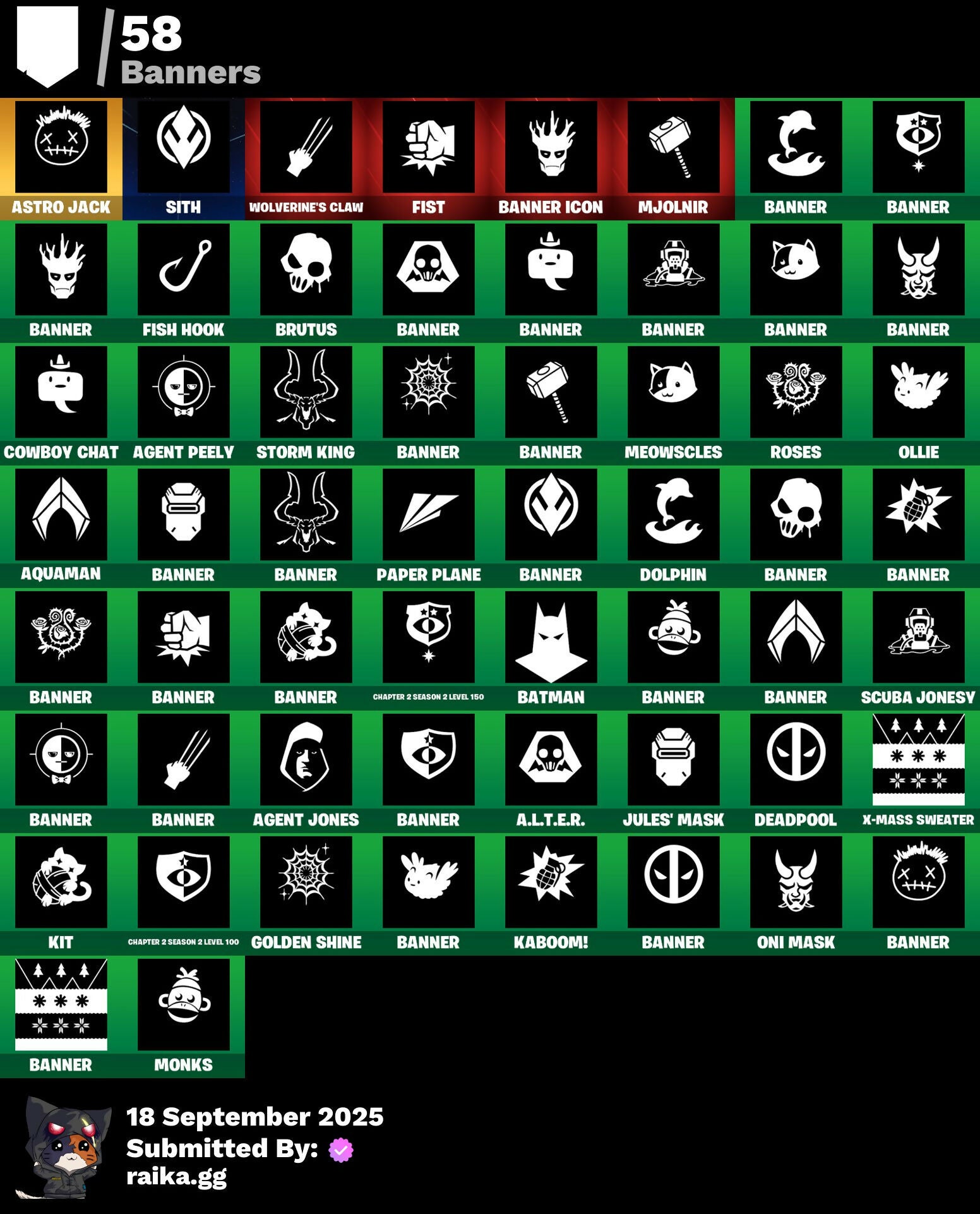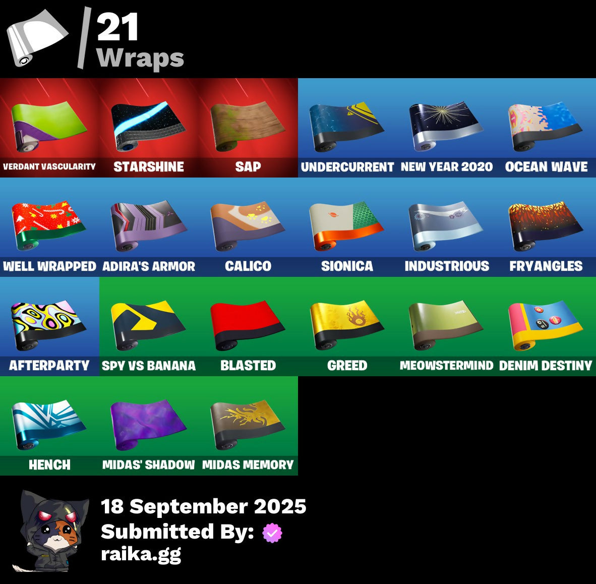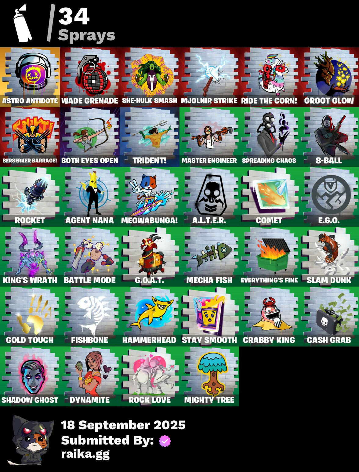 2020 Kickflip, 8-Ball, A.L.T.E.R., Adira's Armor, Adventure Pack, Afterparty, Agent Jones, Agent Nana, Agent Peely, Air Shredder, Aquaman, Aquaman's Trident, Arroyo Pack, Arthur Curry, Astro Antidote, Astro Jack, Astroworld Cyclone, Back Board, Backup Blades, Banana Bomber, Banana Briefcase, Bananaxe, Banner, Banner Icon, Base Jumper, Basecamp Bag, Batman, Battle Bloom, Battle Mode, Beachcomber, Beep Beep, Berserker Barrage!, Big Haul, Blasted, Bobo, Bombs Away!, Both Eyes Open, Boulder Breakers, Brella, Brutus, Calico, Call Me, Cash Grab, Classified, Clawz Retro, Clean Sweep, Coin Flip, Comet, Convergence, Cowboy Chat, Crabby King, Crescent Shroom, Deadpool, Deadpool Unmasked, Deadpool's Katanas, Deep Dive, Denim Destiny, Dive Knives, Dolphin, Downpour, Dynamite, E.G.O., Eclipse Brella, Eon Blades, Epic Swords Of Wonder, Everything's Fine, Fade, Feline Fun, Fish Hook, Fishbone, Fishy Flier, Fist, Flippin' Away, Fortilla Flier, Foundational 'Brella, Fryangles, G.O.A.T., Gear Specialist Maya, Gilded Scepter, Gold Brutus, Gold Dagger Pack, Gold Midas, Gold Touch, Golden King, Golden Shine, Greed, Groot, Groot Glow, Groot's Sap Axes, Hack & Smash, Hammerhead, Hammers Of Justice, Happy, Head Banger, Hench, Hench Hauler, Ice-Blasted Snow Crunchem, Industrious, Infinite Bloom, Jennifer Walters, Jules, Jules' Mask, Kabag!, Kaboom!, Keyed Up, King's Wrath, Kit, Llamacorn Express, Lobby Classic, Lt. Evergreen, Mandalorian, Masked, Master Engineer, Mecha Fish, Meowabunga!, Meowscles, Meowstermind, Midas Memory, Midas' Shadow, Mighty Marvel 'Brella, Mighty Tree, Millennium Falcon, Mjolnir, Mjolnir Strike, Mjolnir's Path, Monks, Neon Wings, New Year 2020, Ocean, Ocean Wave, Ohm, Ollie, Oni Mask, Pandemonium, Paper Plane, Paws & Claws, Peppermint Pick, Power Claws, Rage, Rage Quit, Re-Gifter, Redmask Ranker, Respect The Peace, Ride The Corn!, Riptide, Rock Love, Rocket, Roses, Sap, Sapling Groot, Scales Of Justice, Scuba Jonesy, Shadow Ghost, Shaolin Sip, Sharpshooter, She-Hulk Smash, Shooting Starstaff, Shortbread Slicers, Side Hustle, Sing Along, Sionica, Sith, Skellefish, Skye, Slam Dunk, Smash O'-Lantern, Snowshaker, Snowy, So Square, Solid Scratch, Specialist Pickaxe, Spreading Chaos, Springy, Spy Vs Banana, Starshine, Stay Smooth, Storm King, Supreme Shell, Take A 'Bow, The McG, The Sith, The Umbrella, Thor, Thor's Cloak, Throwback Axe, Thumbs Down, Tide Axes, Tie Whisper, Tippy Tap, Tnteeth, Tntina, Top Sail, Treefall, Trident!, Twin Crossfire, Undercurrent, Utility Claymore, Verdant Vascularity, Verve, Wade Grenade, Water Wings, Well Wrapped, Wild Blast, Wolverine, Wolverine's Claw, Wolverine's Trophy, Wooly Warrior, Wrenchers, X-Mass Sweater, Yay!