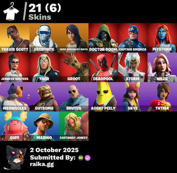 Agent Peely, Brutus, Captain America, Castaway Jonesy, Deadpool, Doctor Doom, Frostbite, Gear Specialist Maya, Groot, Guff, Gutbomb, Jennifer Walters, Marino, Meowscles, Mystique, Skye, Storm, Thor, Tntina, Travis Scott, Wilde