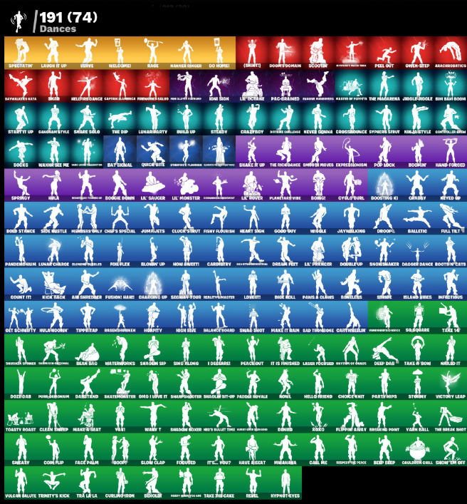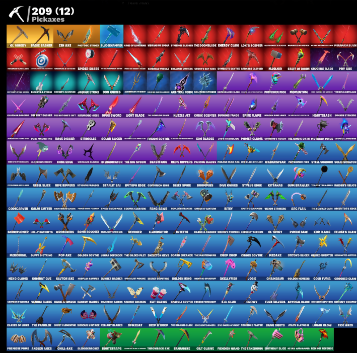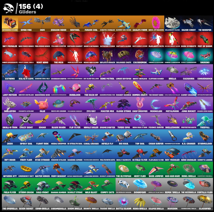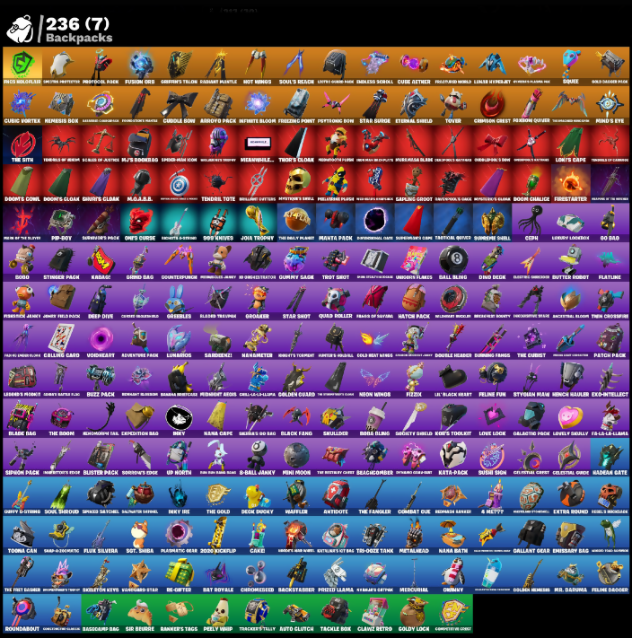 (Shints), 00 Bao, 10 Orchestrator, 2020, 2020 Kickflip, 8-Ball Janky, 999 Knives, Absenz, Abyssal Blade, Acroacrobtics, Adira, Adventure Pack, Aftermath, Agent Jones, Agent Peely, Air Shredder, Alli, Alora, Angler Axes, Antidote, Aquaman, Arc Flail, Arcade vs Toon, Arcane Energy Glider, Arctic Agline, Arroyo Pack, Arthur's Hoodal, Articulated Base Hype, Astrea, Astroworld Cyclone, Auto Clutch, Automatic Stun, Avalanche, Aviator, Axecal Form, Backstabber, Backup Blades, Balanceboard, Ball Bling, Balletic, Banana Barbecue, Banana Bomber, Bananaxe, Bank Shots, Barrier Longboard, Base Jumper, Basecamp Bag, Basic Basher, Basil, Bat Royale, Battle Bloom, Beach Jules, Beachcomber, Bearclaw, Beastfang, Beep & Boop, Beep Beep, Behold!, Beneath Blossom, Big Haul, Bim Bam Boom, Birthday Slice, Bitey, Black Fang, Black Manta, Blade Bag, Blade Raven, Blades of Light, Blaze, Blight Short Blades, Blister Pack, Bloom Bubbles, Blowin Up, Board Breaker, Boba Bling, Bobo, Boiled Brogans, Boing!, Bold Stance, Bomb Bouquet, Bombs Away!, Bone Patrol, Booby, Boogie Down, Boomin', Boosting Ki, Boots N' Cats, Bootstrap, Bounty 'Brella, Boxer, Break It Down, Breakdance Pony, Breakwater Short, Brella, Brilliant Outfits, Bronzed Scimitar, Bubbloon, Build Up, Bundles, Bunker Jonesy, Burning Fangs, Burnout Shake, Butter Robot, Buzz Pack, Buzzabelle, Bye Signal, Bytes, Cacodemon, Cake!, Call Me, Calling Card, Captain Alamrica, Captain Jones, Captain's Glider, Carbide Legacy, Cardistry, Carnage, Cartwheelin', Catalyst, Catwing, Cauldron Chill, Cazadora, Celestial Crest, Celestial Glider, Cell-0x-4liga, Centurion, Centurion Edge, Ceph, Chain Surfer, Chainsaur, Chaos Director, Chaos Origins, Chaos Scythe, Chaotic Crawler, Charging Up, Charlotte, Chiefs Special, Chill-Axe, Chitauri Chariot, Choice Knit, Chop Chop, Chop Dropper, Chrome Cloudcrusher, Chrome Punk, Chromebrella, Chromeseed, Clamp & Basher, Clark Kent, Classified, Clawz Retro, Clean Sweep, Cliffside Soarer, Cloud Strike, Cluck, Cluck Strut, Codcracker, Coin Flip, Cold Front, Cold Heat Wings, Combat Clue, Combat Cue, Comet Crasher, Comfy Cats, Competitive Crest, Controller Bay, Convergence, Coral Cruiser, Cosmic Claws, Cosmic Llamawawa (partially visible), Count It, Counterpunch, Crazboy, Crazy Eight, Crescent Shroom, Crescent Slicer, Crimson Crest, Crimson Folistra, Crooked Claw, Cross Bounce, Crossbones Katana, Cube Aether, Cube Assassin, Cube Edge, Cubic Scepter, Cubic Vortex, Cuddle Bow, Cuddlepool, Cuddly Cloudcrusher, Cured Healscald, Curling Iron, Cyclo G'url, Dab Stend, Dagger Dance, Dahlia, Dansa Field Pack, Dark Havoc Blade, Dark Symbiote, Dawnspool Cage, Daywalkers Kata, Deadeye Ex-Sciatica, Deadpool, Deck Ducky, Deep Dive, Deimos, Demon's Talons, Derby Dynamo, Dernied, Desolated Knives, Destroyer, Diamond Dance, Dimensional Gate, Dino Deck, Diona, Dirt Roll, Dirtbike Challenge, Dive Knives, Dizzle, Doctor Doom, Doctor Slone, Doom, Doom Brella, Doom Chalice, Doom Slayer, Doom's Cloak, Doom's Cowl, DoorsDoom, Doro, Double Header, Double Up, Downpour, Doze Dab, Dragon Rider, Dragon Rune Lance, Dream Feet, Drift To Drift, Drome Drifter, Droop, Drumlines, Dual Mangettas, Dugigimon, Dunker Dasher, Dusty, Dynamo Grip Gear, Dynamo Inferno, Eagle's Form, Eclipse Brella, Eddie Brock, Eggar, Electric Shroomer, Emergency Raft, Emissary Bag, Emma Frost, Enchanted Lifebloom, Endless Scroll, Energy Claw, Eon Blades, Epic Chord of Night, Epitaph Edge, Eradicator, Eternal Knight, Eternal Shield, Evie, Exo-Intellect, Expedition Bag, Explorer Gille, Expressionism, Extra Round, Fa-La-La-Llama, Face Palm, Fade, Fang Saws, Fanged Foresight, Fasshy Maneuvers, Felina's Claw, Feline, Feline Drabber, Feline Fun, Field Flyer, Field Of Destiny, Fiendish Wand, Fiery Descent, Firestarter, Fireworks Salvo, Fishbone Flayer, Fishy Flier, Fishy Flourish, Fist of Doom, Fizzix, Flapjack Flyer, Flatline, Flight Risk, Flip Flop, Flip Flyer, Flippin Away, Flux Silvara, Flux Silvera, Focused, Foie Flex, Fortilla Flier, Foundation Tbrella, Foundation's Mantle, Foxbow Quiver, Fractal Sean, Fractured World, Freezing Point, Frostbite, Frostguard Cape, Full Tilt, Fusion, Fusion Coil, Fusion Mane, Fusion Orb, Fusion Scythe, Galactic Pack, Galaxia, Gallant Gear, Gangnam Style, Gathering Storm, Geralt Of Rivia, Get Schwifty, Ghostpool's Katana, Gildhart, Gilt Glaive, Glided Nordic Blade, Glitch Axe, Go Home!, Gold Brutus, Gold Dagger Pick, Gold Furia, Gold Midas, Golden Guard, Golden King, Golden Look Board, Golden Nemesis, Golden Scythe, Goldy Lock, Good Guy, Grabby, Greasepaint Paint, Green Arrow, Green's Plasma Axe, Greenstrafe Fire, Griffin's Tail, Grind Bag, Grizz, Grizzly Gooper, Groakker, Groot, Guardian Daggers, Guff Gringle, Guffy G-String, Guidance Arrow, Gum Brawler, Gumbo, Gummy, Gummy Sage, Gunn-Brella, Gunnar, Guppy E-String, Gwen-Step, Hack & Smash, Hadean Gate, Hammer Bashers, Hammer Composite, Hammerfells, Hand of Lightning, Hand-Forged, Hangar-38 Glider, Hanged Hardy, Hanmaa Ringer, Harlowe, Harmonic Axes, Have A Seat, Heart Sign, Heartslash, Heist Flier, Hello Friend, Hench Hauler, Heyed Up, High Five, Holly Hatchets, Homecurls Jerry, Homeless, Hopitty, Hoplite Hammer, Hornet's Conclave, Hot Slurp Balloon, Hot Wings, How Sweet!, Hugo, Hula, Hula Hoopin', Hunter's Skylade, Hurricane, Hypnot-Eyes, ID Stealth Sail, Illusive's Blades, Indiana Jones, Indigo's Kid's Hair Kit, Infectious, Infield Fly, Infinite Bloom, Inflate-A-Roach, Inhibitor's Edge, Inky, Inky Ire, Invasion, Io Field Flyer, Ioni Sion, Iris, Island Trauma, Island Vibes, Its.. You?, Jackmetal Bloom, Jaywalking, Jhakaksu Maura (partially visible), Joey, Joggle Joggle, Joia Trophy, Joni The Red, Jorge The Jailbreak, Josie, Jota Shortblend, Jules, Jump Jets, Junk Bucket, K.O. Club, K.O. Cruiser, Kabagi, Kal-El's Cape, Kalii Cutter, Kat Claws, Kata Tech Hoverboard, Kata-Pack, Katniel's Kit Bag, Kelgritta, Kiana K.O., Kick Back, Kior Flails, Kit, Kittanas, Koi, Kori's Toolkit, Krisabelle, Kymera, Laminator, Laminator Umbre