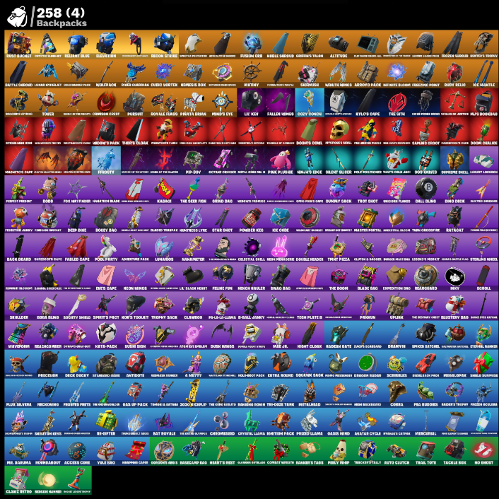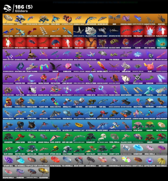 090 Knives, 10 Field Flyer, 2000 Load Unit Rom, 3030 Kickflip, 900° Knives, A Meezy, A Warrior's Swag, Abominable Axe, Academic Owlberd, Access Core, Adira, Adventure Pack, Agent Jones, Agent Peely, Aggravator Blade, Ahsoka Tano, Air Nomad Staff, Air Shredder, Altitude, Angler Axes, Anti-patter Pulse, Antidotes, Antonia, Aphrodite, Appa, Aquaman, Aquaman's Trident, Arctic Energy Glider, Arctic Raider, Arrow Pack, Artemis, Astronought Claws, Astroworld Cyclone, Atom Defibrill, Atom Eve, Auto Clutch, Avatar Cycle, Avatar's Flourish, Axe Skin, Axion Sentinel, Axo, Back Board, Backup Blades, Bade, Balance Board, Ball Bling, Balloon Axe, Banana Bonker, Bananaxe, Bank Shots, Base Jumper, Basecamp Bag, Basic Basher, Bat Royale, Batcat, Battle Bloom, Battle Hyperion, Battle Prep, Battle Prep: Super, Battle Shroud, Beach Umbrella, Beast Blastin', Beastfang, Beatzbunny, Beb Deed, Beesfoot's Peace, Big Bits, Big Fan, Big Haul, Bitey, Black Chamber, Blackheart, Blacksteel Edge, Blade Bag, Blazed Tropana, Blizzard Bomber, Blossoming Reign, Blowing Bubbles, Blown Up, Blue Squire, Blueguard, Board Breaker, Bob Snack, Bobo, Boggy Bag, Bogslat Dagger, Boing!, Bolt Blades, Bombard Insight, Bombs Away!, Boogie Down, Boomin, Boosting Ki, Bounty Bellas, Breakdance Trouble, Breakdown, Breakfast Bunny, Breaking Waves, Breathless Blades, Brella, Brilliant Cutters, Brisco's Scimitars, Brite Bomber, Brute Moves, Brute Raider, Bubloon, Budge, Cacodemon, Cactus Cruiser, Calamity, Calculated, Call Me, Called Shot, Canny One-Eyed Charred, Card Drop, Carnage, Carnage Cleaver, Catalyst, Catflip, Cazadora, Celebratory Slice, Celestial Shell, Cerberus, Charging Up, Charlotte, Chief's Special, Chill-Axe, Choice Knit, Chromapain, Chrome, Chrome Punk, ChromeBrella, Chromebased, Clang & Basher, Classified, Clean Swipe, Cliffsides Soarer, Climbers, Cloud Striker, Clusterfly Dag, Clutch & Dagger, Cobra, Coin Flip, Cold Furia, Coman Jones, Comba, Combat Avatar, Comfy Cats, Commander Bliss Keys, Commander Frostwing, Commuter to the Depths, Company Jig, Conch Call, Condor, Conjurer, Conquest, Controller, Convergence, Copter’s Skylayer, Copy Broney-1, Corruptor’s Armor, Cosmic Cleavers, Count It!, Cozy Cuddle, Crack It, Crackle Supreme, Crazy Eight, Creepy Moon Sentinel, Crescent Cliff Farm, Crescent Sickle, Crimson Crest, Crimson Wish, Crossbows & Claw, Crossfire, Crucible Blade, Crystal Lama, Cubic Vortex, Curling Iron, Cyblo Curl, Cymitar, Cypher Guide Kit, DJ Yonder, Dabstand, Dahl vs Schaden, Dark Symbiote, Darth Vader, Daywalker's Kaita, Deadpool, Deck Ducky, Deep Dive, Delivery Driver, Desguised Mitten, Diamond Throne, Diamondclan Pick, Dice Roll, Dino Deck, Dire, Disassemble, Dive Knives, Divewing Sailor, Dizzee, Do The Split, Doctor Doom, Dogg Treat, Domo Dominator, Doom Slayer, Doomhorn Blade, Doom’s Cowl, Double Bling, Double Header, Double Tags, Downpour, Downshift, Doze Dab, Dragon Radar, Dragon Rider, Dragon Stance, Dragon's Claw, Drawvin, Dreads Gavel, Dribblin', Drift, Drome Drifter, Droop, Dual Katanas, Duelist's Foil, Dumbbell Driver, Dusk, Dusk Wings, Dusty, E.M.P Show Crossbow, Eagle's Form, Eclipse Brella, Eldecracker, Electric Sessions, Elegance Blade, Elevation, Elite Servo, Ellie Rider, Ember, Ember Baton, Ember Pick, Embroidery Leaf, Enchanting Lilypad, Enigma Venom, Eon Blades, Equalizer, Eternal Ranger, Eves Cape, Evie, Expedition Bag, Expressionism, Extra Round, Fable, Fabled Cape, Fade, Fallen Wings, Fanged Foresight, Felina's Claw, Feline Fun, Fire Lantern Lantern, Fire Show, Fish Taco, Fishstick, Fishy Flyer, Fixer, Flaky Feast, Flamendo, Flamethrowa, Flapcake, Flappy, Flashback Flyer, Flashmore Claws, Flight Risk, Flip Flyer, Flippin Away, Flippin' Disckellie, Flux Silveira, Flux Silvera, Foil Flex, Follow The Trolley, Fortilla Flare, Forward Fury Skin, Fox Hayfinder, Foxfire Edge, Free Flow, Frenzied Glider, Frizzed Llama, Frost Squad, Frostbite, Frosted Frets, Frosted Frites, Frostsburn, Frosty, Frosty Globes, Frozen Axe, Frozen Oculus, Frozen Point, Frozen Shroud, Fusion, Fusion Coil, Fusion Name, Fusion Orb, Fusion Scythe, Future Music Scythe, G-Ball Jimmy, Gambito's Chaos, Gas Up Pack, Gathering Storm, Gazro Skin Glitch, Gentleman's Dab, Geralt of Rivia, Get Funky, Get Groovy, Gg2-0, Ghost Of The Mission, Gildurra, Glacial Longboard, Glazin Retro, Glider, Goku Black, Gold Brutus, Gold Clap, Gold Crow, Gold Dagger Pack, Gold Front, Gold Midas, Golded Scepter, Golden Halo Blades, Golden King, Golden Scythe, Good Apples, Gowp, Grand Bag, Grand Sundowner, Griddy-Up, Griffin’s Talon, Grind Smasher, Grit Infiltration, Groot, Groots Craft Claw, Groots Sap Axes, Gulding Glow, Gum Brawler, Gumbo, Gummy Sack, Gunn-Brella, Hack & Smash, Hadean Key, Haden Chariot, Hades, Hammer Batstalker, Hammers Of Justice, Hand Of Lightning, Hand-Forged, Har-Har-Har!, Harpoon, Haven, Heart Sign, Heart's Carver, Heartburst, Heartspan, Heartwinder, Heart’s Rest, Hektaransa Slayer, Helium Blue Reef, Hellburner Rider, Hello Friend, Helm Of Valor, Helsie, Hero Messenger, High Five, High Hauler, High Society Glider, Highwire, Hitch’s Pan, Hold-Out Pack, Holiday Sexy, Hollowbuck Case, Hollow’s Prides, Holly Hatchets, Hookah Hammer, Hope, Hot Marat, Howl, Hulahoopin', Hull Claws, Hunter’s Trophy, Huntress, Huntress Lyre, Hybrid, Hydraulic Horn, Hyperboard, Hypersonic, Hyphae’s Catch, Hypnoteyes, I Declare!, I'm A Mystery, Ice Age Emblem, Ice Cube, Ice Mantle, Ice Scepter, Igni Sign, Ike Pickaxe, Imani, Impaled Spear, Imperial March, Ina, Indian Jones, Infield Fly, Infinite Bloom, Inflate-A-Roach, Instacirc Janky, Introducing..., Invasion, Invincible, Iris, It's Finished, It's Go Time, It's... You?, Jackal, Jackalclaw, Jaina Stormborn, Janny's Lander, Jaywalking, Jerry Joke Jones, Jingle Wing, Josie, Judges Battle-Pack, Jules, Jun-Nihan, Junk Bucket, Junker Brella, KOR, Kabagi, Kado Thorne, Kaibosh Hatake, Kajiu Cutter, Kata-Pack, Keep It Mello, Khaby Lame, Ki-Scythe, Ki-Sword, Kieved Up, King Kings, Kittanas,