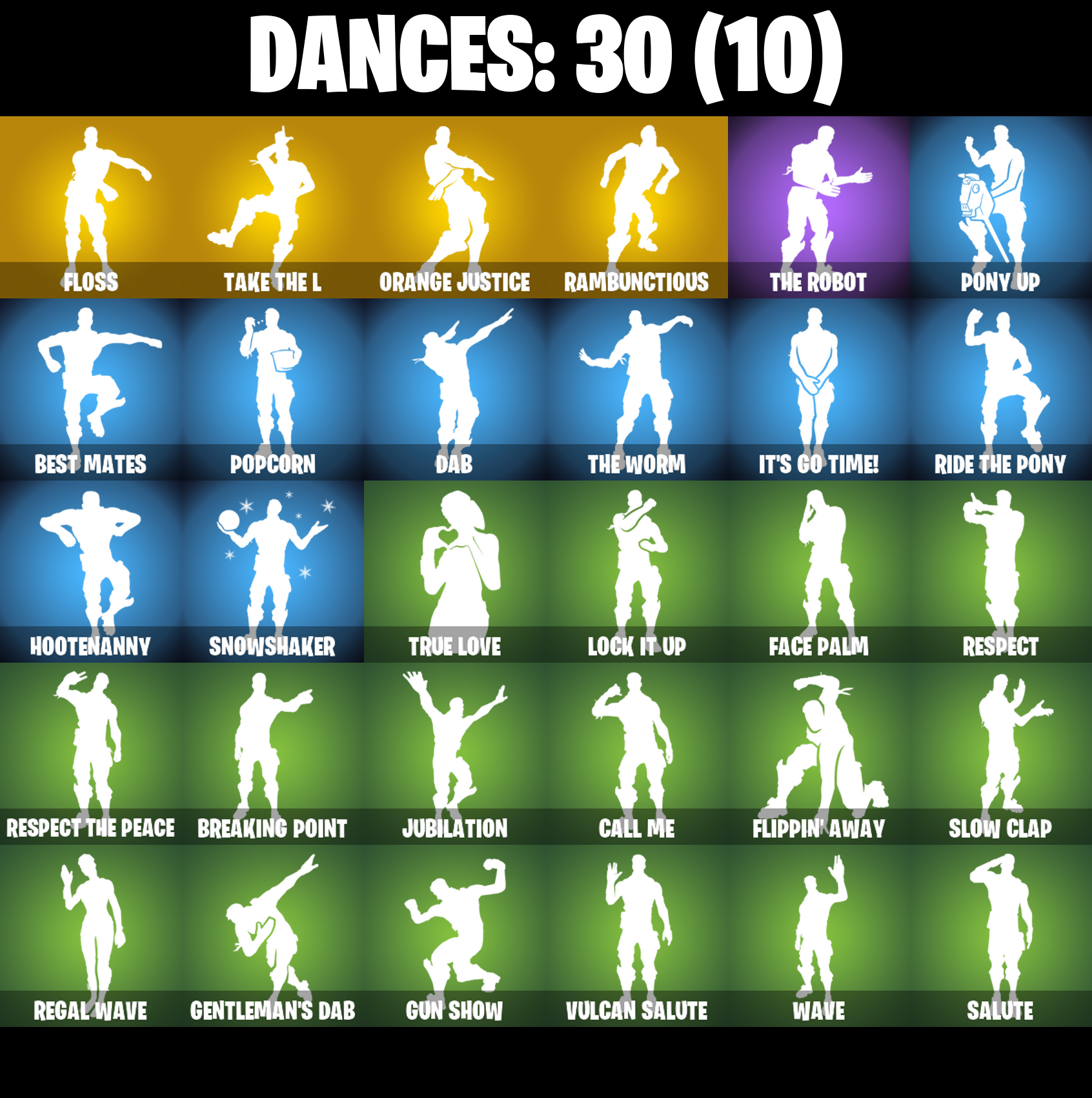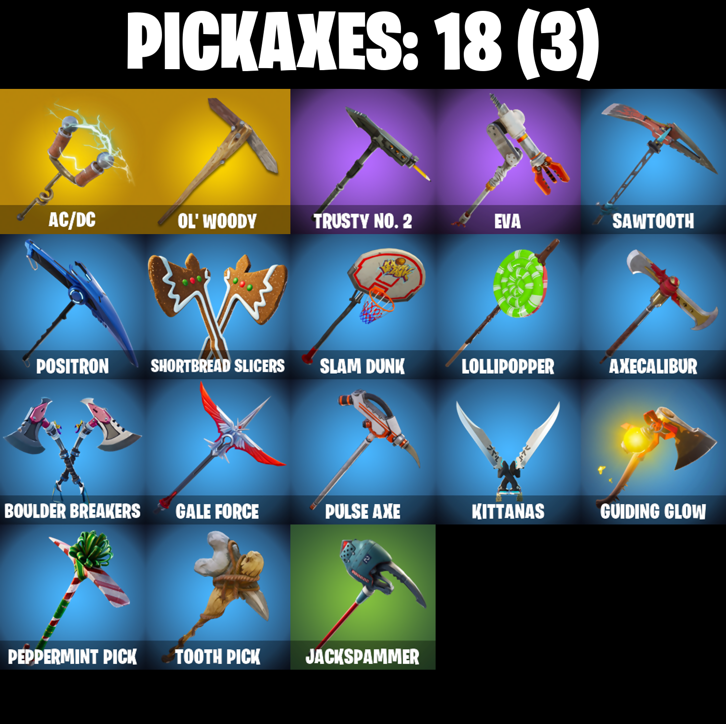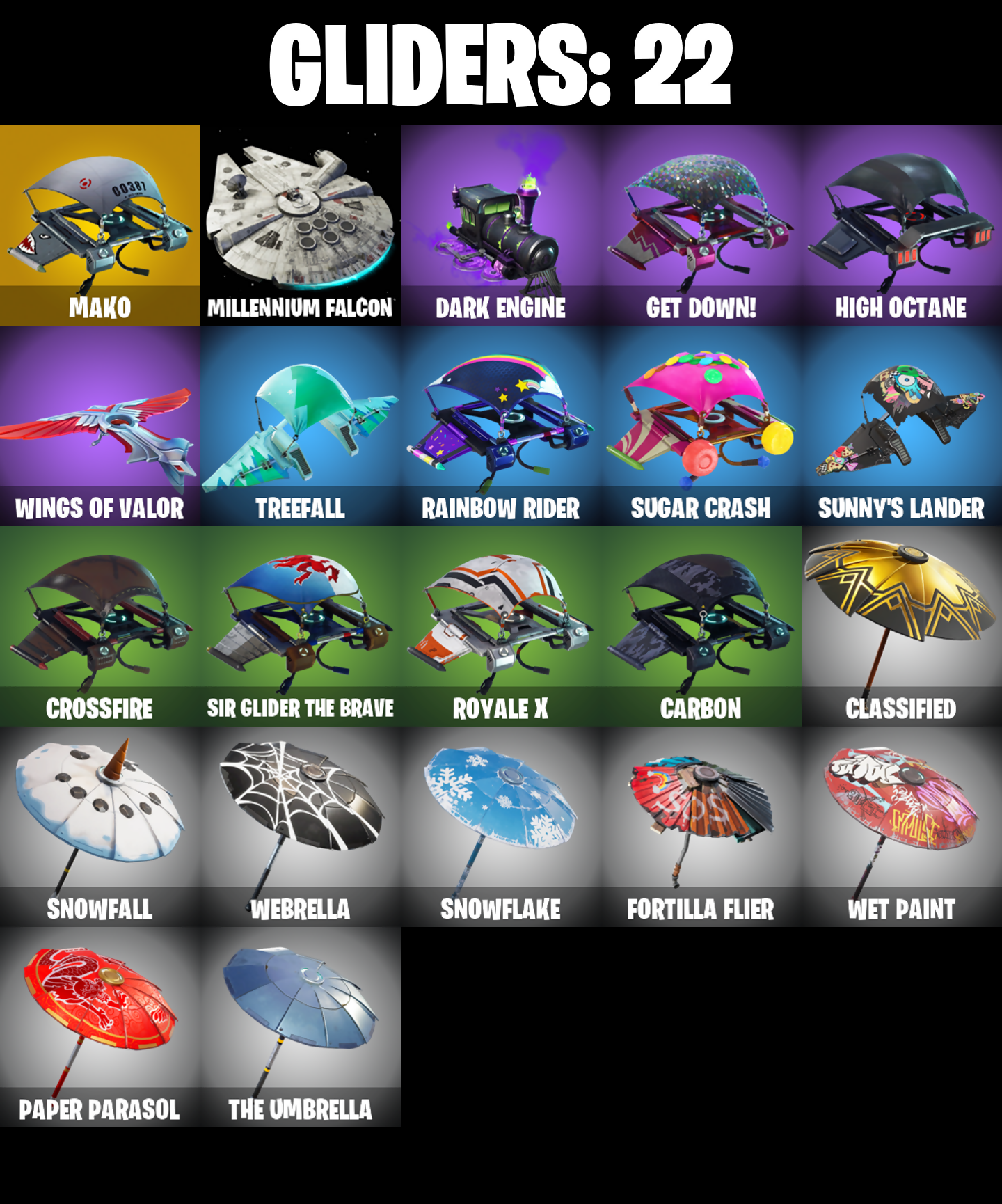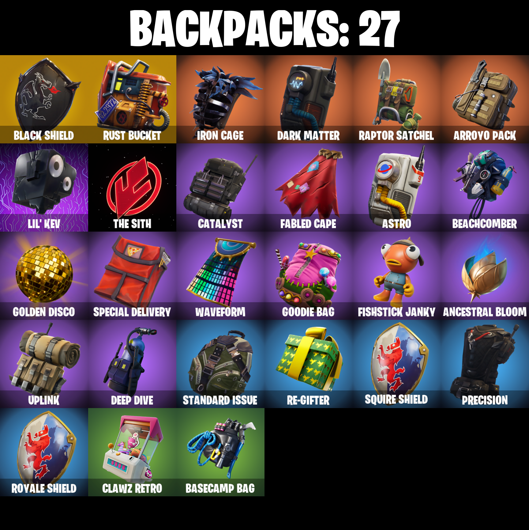 Ac/dc, Ancestral Bloom, Arroyo Pack, Astro, Axecalibur, Basecamp Bag, Battlehawk, Beachcomber, Best Mates, Black Knight, Black Shield, Blue Squire, Boulder Breakers, Breaking Point, Brite Bomber, Call Me, Carbide, Carbon, Catalyst, Classified, Clawz Retro, Crossfire, Dab, Dark Engine, Dark Matter, Dark Voyager, Deep Dive, Elite Agent, Eva, Fabled Cape, Face Palm, Fishstick Janky, Flippin' Away, Floss, Fortilla Flier, Funk Ops, Gale Force, Gentleman's Dab, Get Down!, Golden Disco, Goodie Bag, Guiding Glow, Gun Show, High Octane, Hootenanny, Iron Cage, It's Go Time!, Jackspammer, Jubilation, Kittanas, Lil' Kev, Lock It Up, Lollipopper, Lt. Evergreen, Mako, Millennium Falcon, Mission Specialist, Moonwalker, Ol' Woody, Orange Justice, Paper Parasol, Peppermint Pick, Pony Up, Popcorn, Positron, Precision, Pulse Axe, Rainbow Rider, Rambunctious, Raptor, Raptor Satchel, Raven, Re-Gifter, Regal Wave, Respect, Respect The Peace, Ride The Pony, Rogue Agent, Royale Knight, Royale Shield, Royale X, Rust Bucket, Rust Lord, Salute, Sawtooth, Shortbread Slicers, Sir Glider The Brave, Slam Dunk, Slow Clap, Snowfall, Snowflake, Snowshaker, Sparkle Specialist, Special Delivery, Squire Shield, Standard Issue, Sugar Crash, Sunny's Lander, Take The L, Teknique, The Reaper, The Robot, The Sith, The Umbrella, The Worm, Tomatohead, Tomatohead Crown, Tooth Pick, Treefall, True Love, Trusty No. 2, Uplink, Vulcan Salute, Wave, Waveform, Webrella, Wet Paint, Wings Of Valor, Wooly Warrior, Zoey