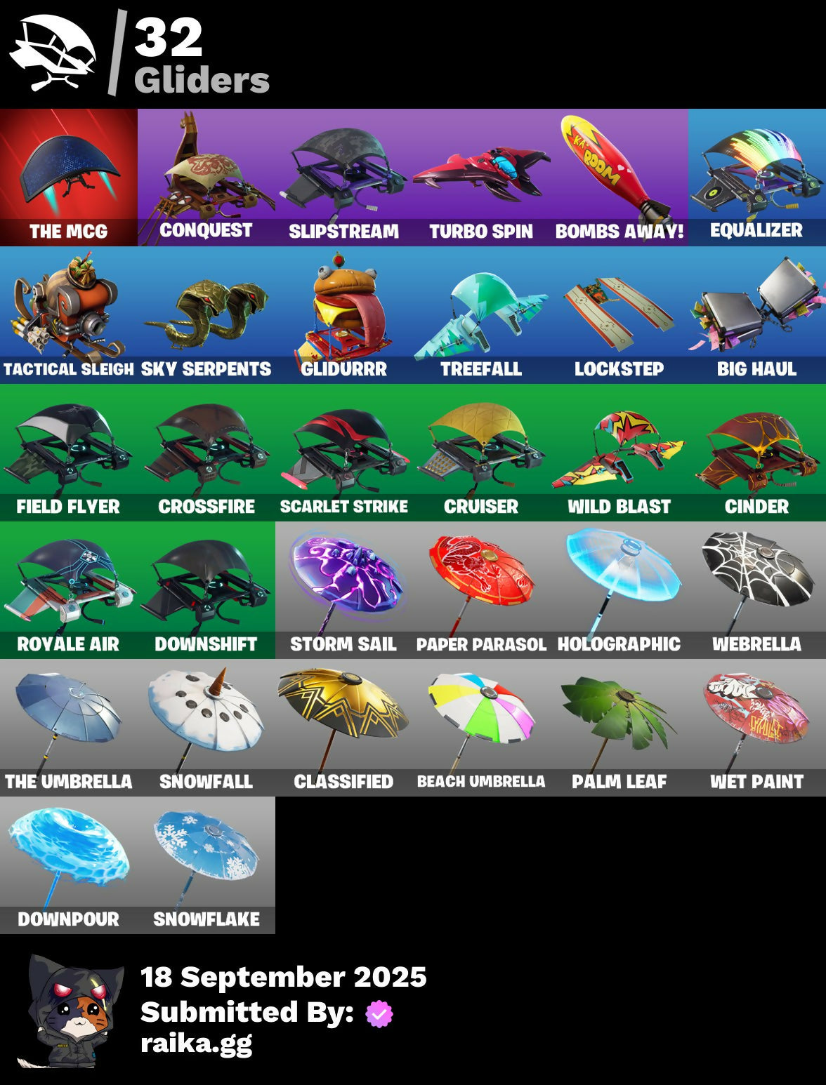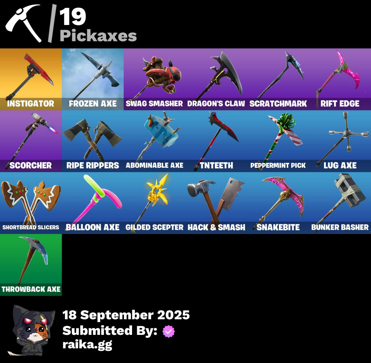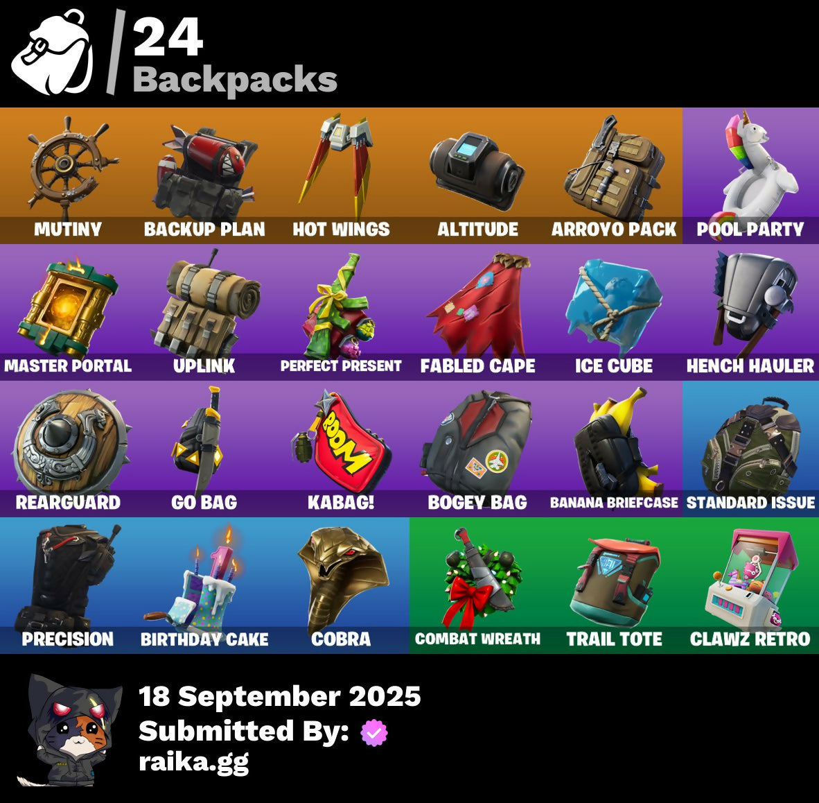 Abominable Axe, Agent Nana, Agent Peely, Altitude, Arctic Camo, Arroyo Pack, Backup Plan, Bacon, Bag of Coal, Balloon Axe, Banana Briefcase, Banner, Batman, Beach Chair, Beach Umbrella, Big Haul, Birthday Cake, Blackheart, Blackheart (Stage 8), Blasted, Bogey Bag, Bombs Away!, Bone, Boogeyman, Boogie, Brutus, Bunker Basher, Bunker Jonesy, Calculated, Call Me, Cash Grab, Cat Flip, Cinder, Classified, Clawz Retro, Cluck Strut, Cobra, Coconuts, Combat Wreath, Comet, Conga, Conquest, Cowboy Chat, Crazy Castle, Crossfire, Cruiser, Cuddle Team Hula, Cursed, Dance Mat, Dinosaur, Dolphin, Downpour, Downshift, Dragon Stance, Dragon's Claw, Drift, Drift Stage 5, Driftwood, Durrr, Durrr Burger, Dynamite, E.G.O., Equalizer, Fabled Cape, Fake Door, Fate, Festive Paper, Field Flyer, Fish Hook, Floating Island, Flowy Hat, Fox, Fox Clan Mask, Frozen Axe, Fryangles, GG Ornament, GG Snakes, GG Snowman, Gear Specialist Maya, Gentleman's Dab, Gilded Scepter, Glidurrr, Go Bag, Golf Ball, Golf Clap, Good Vibes, Greed, Grumpy Tree, Hack & Smash, Ham, Happy Birthday!, Havoc, Hello Friend, Hench, Hench Hauler, Holographic, Hot Wings, Huntress, Hybrid, Hybrid (Stage 4), Ice Cream Truck, Ice Cube, Infinity Blade, Instigator, Jellyfish, Jolly Roger, Jump Jets, Kabag!, Kaboom!, Laser Chomp, Lobby Classic, Lockstep, Love Ranger, Lucha GG, Lug Axe, Lynx, Lynx (Stage 4 - No Ponytail), Master Portal, Mermaid, Merry Marauder, Mic Drop, Monks, Moth, Mutiny, Neon Cat, New Year 2020, Orange Justice, Paint Brush, Palm Leaf, Palm Trees, Paper Parasol, Paper Plane, Peace Out, Peeled, Peely, Peppermint Pick, Perfect Present, Pineapple, Pirate Parrot, Pixel Jonesy, Pixels Royale, Pool Party, Porthole, Powder, Precision, Rearguard, Redline, Regal Wave, Respect The Peace, Rift Edge, Ripe, Ripe Rippers, Rock Love, Rocket, Rox, Rox (Stage 5), Royale Air, Sad Trombone, Salt, Salute, Scarlet Strike, Scorcher, Scratchmark, Sentinel, Sgt. Winter, Sgt. Winter Headgear, Shimmer, Shopping Cart, Shortbread Slicers, Sidewinder, Sidewinder (Dark), Sith, Skeleton Key, Sky Serpents, Slipstream, Snakebite, Snoozefest, Snow Clan Shuriken, Snow Shaker, Snowfall, Snowflake, Spiderweb, Spreading Chaos, Standard Issue, Storm Sail, Strawberry Paws, Sub Commander, Suited Up, Sun Strider, Sunbird, Sunprint, Sushi, Swag Smasher, Swipe It, T-Rex Head, Tactical Sleigh, Take The Elf, Tartan, That Way, The Brood, The Mcg, The Umbrella, This Way, Throwback Axe, Tic-Tac-Toe, Tnteeth, Too Tilted, Trail Tote, Trash Can, Treasure Chest, Treefall, Tropical Camo, Turbo Spin, Ultra Red, Uplink, Vega, Viking Ship, Wave, Webrella, Well Wrapped, Wet Paint, Wild Blast, Wingman, Woot Bonesy, Wreath, X, X-4 Stormwing, Yay!, You're Awesome, Zenith, Zenith (Stage 4), Ziggurat