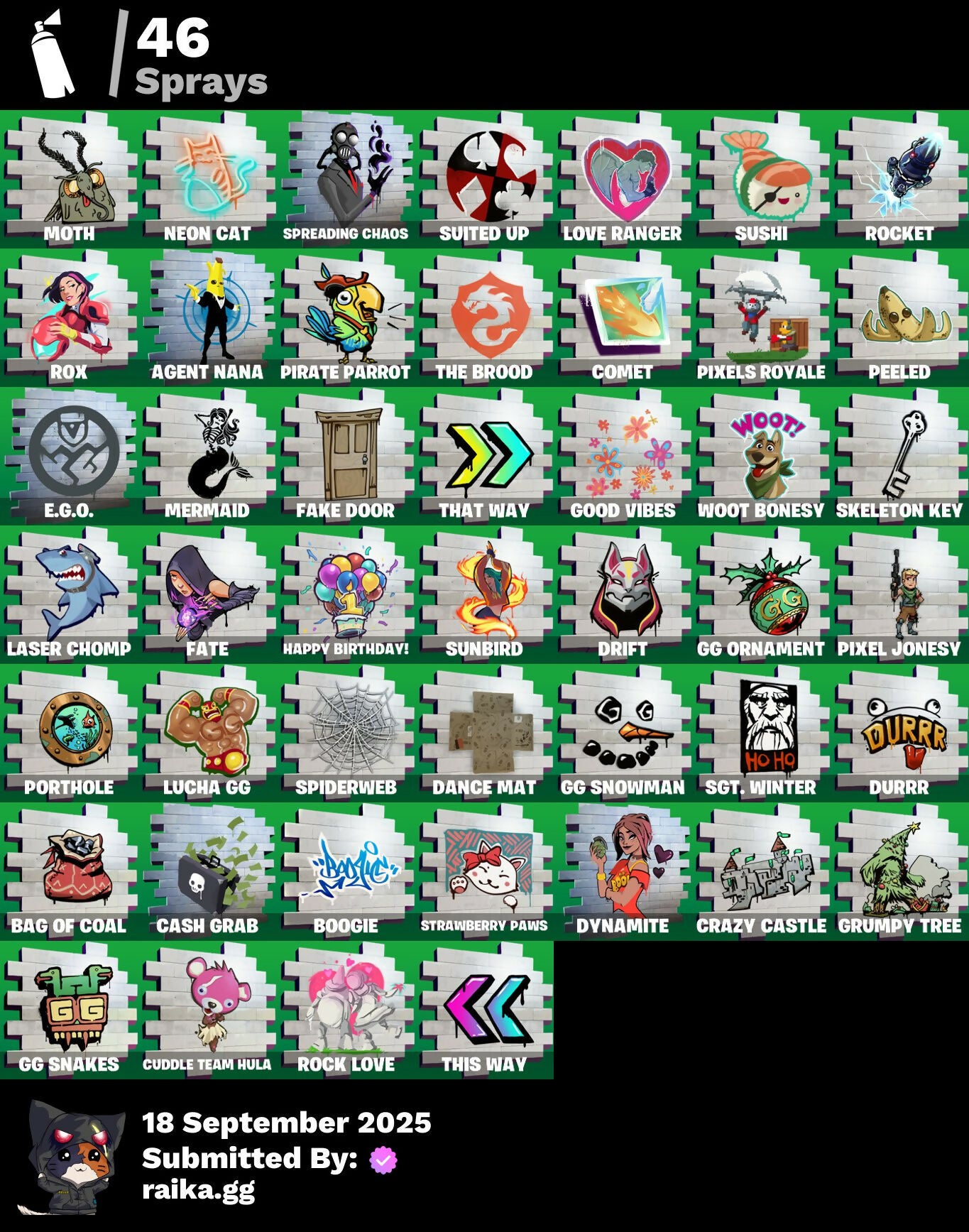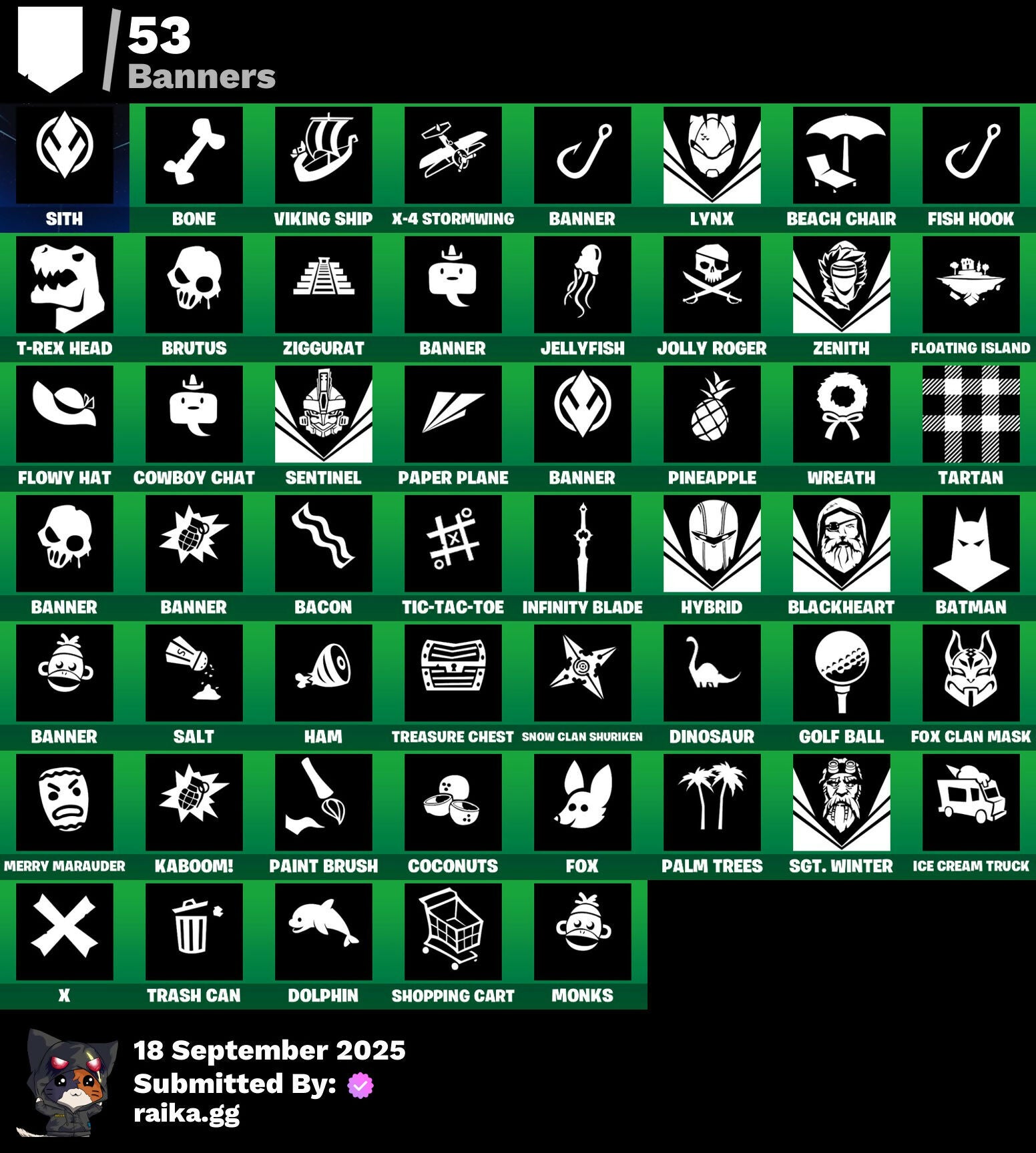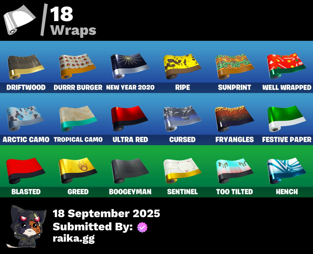 Abominable Axe, Agent Nana, Agent Peely, Altitude, Arctic Camo, Arroyo Pack, Backup Plan, Bacon, Bag of Coal, Balloon Axe, Banana Briefcase, Banner, Batman, Beach Chair, Beach Umbrella, Big Haul, Birthday Cake, Blackheart, Blackheart (Stage 8), Blasted, Bogey Bag, Bombs Away!, Bone, Boogeyman, Boogie, Brutus, Bunker Basher, Bunker Jonesy, Calculated, Call Me, Cash Grab, Cat Flip, Cinder, Classified, Clawz Retro, Cluck Strut, Cobra, Coconuts, Combat Wreath, Comet, Conga, Conquest, Cowboy Chat, Crazy Castle, Crossfire, Cruiser, Cuddle Team Hula, Cursed, Dance Mat, Dinosaur, Dolphin, Downpour, Downshift, Dragon Stance, Dragon's Claw, Drift, Drift Stage 5, Driftwood, Durrr, Durrr Burger, Dynamite, E.G.O., Equalizer, Fabled Cape, Fake Door, Fate, Festive Paper, Field Flyer, Fish Hook, Floating Island, Flowy Hat, Fox, Fox Clan Mask, Frozen Axe, Fryangles, GG Ornament, GG Snakes, GG Snowman, Gear Specialist Maya, Gentleman's Dab, Gilded Scepter, Glidurrr, Go Bag, Golf Ball, Golf Clap, Good Vibes, Greed, Grumpy Tree, Hack & Smash, Ham, Happy Birthday!, Havoc, Hello Friend, Hench, Hench Hauler, Holographic, Hot Wings, Huntress, Hybrid, Hybrid (Stage 4), Ice Cream Truck, Ice Cube, Infinity Blade, Instigator, Jellyfish, Jolly Roger, Jump Jets, Kabag!, Kaboom!, Laser Chomp, Lobby Classic, Lockstep, Love Ranger, Lucha GG, Lug Axe, Lynx, Lynx (Stage 4 - No Ponytail), Master Portal, Mermaid, Merry Marauder, Mic Drop, Monks, Moth, Mutiny, Neon Cat, New Year 2020, Orange Justice, Paint Brush, Palm Leaf, Palm Trees, Paper Parasol, Paper Plane, Peace Out, Peeled, Peely, Peppermint Pick, Perfect Present, Pineapple, Pirate Parrot, Pixel Jonesy, Pixels Royale, Pool Party, Porthole, Powder, Precision, Rearguard, Redline, Regal Wave, Respect The Peace, Rift Edge, Ripe, Ripe Rippers, Rock Love, Rocket, Rox, Rox (Stage 5), Royale Air, Sad Trombone, Salt, Salute, Scarlet Strike, Scorcher, Scratchmark, Sentinel, Sgt. Winter, Sgt. Winter Headgear, Shimmer, Shopping Cart, Shortbread Slicers, Sidewinder, Sidewinder (Dark), Sith, Skeleton Key, Sky Serpents, Slipstream, Snakebite, Snoozefest, Snow Clan Shuriken, Snow Shaker, Snowfall, Snowflake, Spiderweb, Spreading Chaos, Standard Issue, Storm Sail, Strawberry Paws, Sub Commander, Suited Up, Sun Strider, Sunbird, Sunprint, Sushi, Swag Smasher, Swipe It, T-Rex Head, Tactical Sleigh, Take The Elf, Tartan, That Way, The Brood, The Mcg, The Umbrella, This Way, Throwback Axe, Tic-Tac-Toe, Tnteeth, Too Tilted, Trail Tote, Trash Can, Treasure Chest, Treefall, Tropical Camo, Turbo Spin, Ultra Red, Uplink, Vega, Viking Ship, Wave, Webrella, Well Wrapped, Wet Paint, Wild Blast, Wingman, Woot Bonesy, Wreath, X, X-4 Stormwing, Yay!, You're Awesome, Zenith, Zenith (Stage 4), Ziggurat