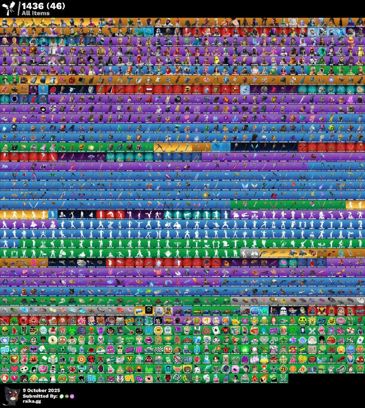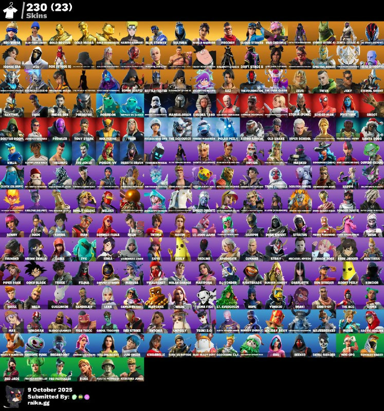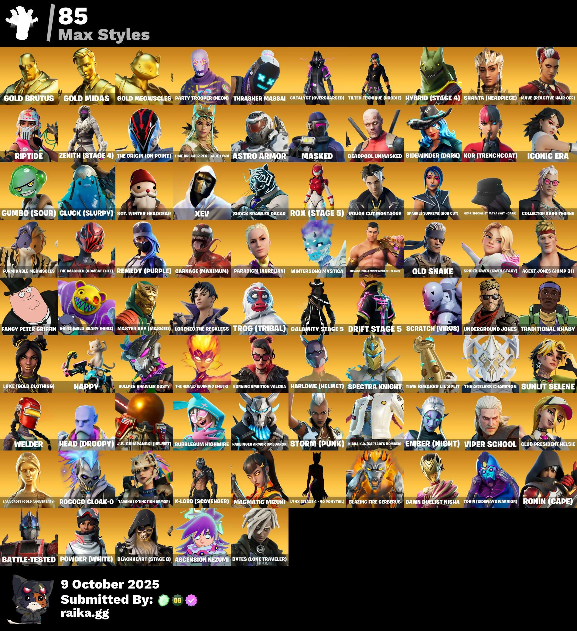 Agent Jones (Jump 31), Agent Peely, Antonia, Aphrodite, Aquaman, Arctic Arcade, Armored Jones, Ascension Nezumi, Astro Armor, Astro Jack, Astroworld Cyclone, Aura, Bamboo, Barcode Point, Battle Hawk, Battle-Tested, Bear, Black Knight, Black Team Leader, Blackheart (Stage 8), Blazing Fire Cerberus, Blue Bladey Dog, Blue Shift, Blue Streak, Blue Striker, Blue Team Leader, Brody The Viking, Bubblegum Highwire, Bullpen Brawler Dusty, Bunker Jonesy, Burning Ambition Valeria, Bytes (Lone Traveler), Calamity Stage 5, Camp Cuddle Team Leader, Carbide Chibi, Carnage (Maximum), Catalyst (Overcharged), Charlotte, Chimney Sweep, Chrome Punk, Cloud Striker, Club President Helsie, Cluck, Cluck (Slurp), Cluck (Slurpy), Cobra Kai, Collector Kado Thorne, Controller, Cuddle King, Cunnad, Cymitar, DJ Yonder, Dark Bomber, David Stark 4, Dawn Duelist Nisha, Dead Headpoopy, Deadpool, Deadpool Unmasked, Doctor Doom, Dolphiname El.9, Drift (Stage 6), Drift Stage 5, Dusky Knight, Edna, Elevation, Ember (Night), Eren Jaeger, Eternal Knight, Eventide, Fable, Fade, Family Vibe Corey, Fancy Peter Griffin, Faraday, Fasting Angeles, Fire Pathfinder, Fish Thicc, Flappy, Follow The Butterfly, Foxina, Frozen Fishstick, Frozen Nog Ops, Furmidable Meowscles, Ganja Jonesy, Gear Specialist Maya (Hat - Dark), Giddy Up, Gnarl Trooper, Goku Black, Gold Brutus, Gold Meowscles, Gold Midas, Gold Trooper, Groot, Grriz (Wild Beary Grriz), Guggimon, Gumbo (Sour), Happo, Happy, Harbinger Armor Omegakor, Harlowe (Helmet), Haven, Havoc, Hazardler, Head (Droopy), High Octane, Hillbilly, Hope, Hoshigaki Tano, Hot Marat, Huntress, Hush, Hybrid, Hybrid (Stage 4), Iconic Cpa, Iconic Era, Introducing..., J.B. Chimpanski (Helmet), Joey, Joseph Winters, Jun-Whid, Kiara K.O. (Captain's Bomber), Kondor, Kor (Trenchcoat), Korra, Krissabelle, Kyra, Lana Del Rey, Lara Croft, Lara Croft (Gold Anniversary), Lennox Dose, Lexa, Lil' Whiplash, Lorenzo The Reckless, Lt. Evergreen, Lt. John Liam, Lunagirl, Luxe (Gold Clothing), Lynx (Stage 4 - No Ponytail), Mae, Magmatic Mizuki, Mako X Otis, Malvbreaker, Mana, Mandalorian, Marias, Mariposa, Marnoran, Masked, Master Kev (Masked), Master Key, Mave (Reactive Hair Off), Maverake, Medusa, Mega, Menace (Challenger Menace - Flame), Meowscles, Merry Marauder, Michael Myers, Midas, Molara Lady, Moxie, Mysterio, Naruto, Naruto Uzumaki, Neo Versa, Neon Skulls, Nidos Rex, Nightshade, Nog Ops, Nolan Chance, Old Guard, Old Snake, Orange Justice, Papa Mario Lopez, Paradigm (Aurelian), Party Trooper (Neon), Peely, Perfect Point, Peter Griffin, Piper Rage, Point Patrol, Poison Ivy, Polar Peely, Poseidon, Powder (White), Predator, Prodigy, Prowler, Raj, Rat King, Reaper, Rebirth Raven, Recon Loki, Red Jade, Red Strike, Redline, Reese, Regen Hawn Magee, Reliyn, Remedy (Purple), Rev, Riptide, Rococo Cloak-O, Rogue Agent, Rogue Spider Knight, Rok (Stage 5), Ronin (Cape), Rook, Rosalina, Rough Cut Montage, Rox, Rox (Stage 5), Royale Knight, Ruby Quest, Rust Bucket, Ryan, Santa Dogg, Santana, Scratch (Finesse), Scratch (Virus), Scribble's Sailer, Scuba Jonesy, Seeker, Sentinal, Sentinel, Sgt. Winter Headgear, Shadow, Shadow Valkyrie, Shanta (Headpiece), Shock Brawler Oscar, Sidewinder, Sidewinder (Dark), Sing Along, Skull Ranger, Skye, Sledgehammer, Slone, Snow Sailer, Sona, Sparkle Supreme (Bob Cut), Spectra Knight, Spectral Knight, Spider-Gwen (Gwen Stacy), Stay, Storm (Punk), Stormtrooper, Stratosphere, Stratus, Sultra, Sultura, Summer Fable, Summit Seeker Buck, Summit Seeker Evie, Summit Seeker Olaf, Sun Strider, Sunlit Selene, Sunny, Sunnyt Storm, Sunway Rager, Sweet Toothy, Tabulator, Take The Elf, Talidark Lara, Tarana (X-Tinction Armor), The Ace, The Ageless Champion, The Cube Queen, The Devourer, The Foundation, The Herald (Burning Ember), The Ice King, The Ice King (Event), The Imagined (Combat Elite), The Joker, The Origin (On Point), The Reaper, Thor, Thrasher Massai, Thunder, Tilted Teknique (Hoodie), Time Breaker Lil Split, Time Breaker Renegade Lynx, Tiona Fish, Tntina, Tono (Tribal), Tony Stark, Torin (Sideways Warrior), Trace, Traditional Khaby, Trog (Tribal), Tsubaki, Tsuki 2.0, Twine, Twiyn, Twyn Reptide, Ultima Knight, Underground Jones, Unpeely, Valor, Vanguard Zadie, Verve, Vigil Jacket, Vingalam, Viper School, Vivi Chroma, Welder, Wendell, Wintersong Mystica, Wireless Icon, Wolverine, Wooly Warrior, World Warrior, X-Lord (Scavenger), Xev, Yellow Arrow, Yond3r, Yuki Onna Gaitora, Zenith (Stage 4), Zero, Zeus, Zyg