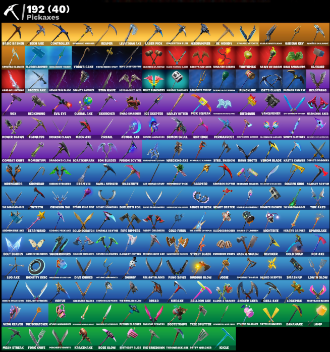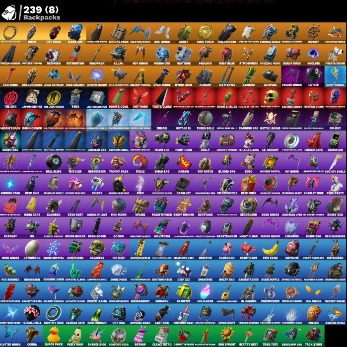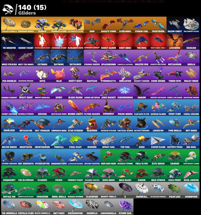2020, 2020 Kickflip, A Weather Balloon, Aang, Abyssal Blade Axe, Abyssal Vault, Adventure Pack, Agent Peely, Air Nomad Staff, Air Shredder, Alsons of Nordicus, Altitude, Angler Axes, Ant-Man, Ant-Tono, Antidote, Antigrav Missile, Aphrodite, Apocalypse Pack, Appa, Aquaman, Aquaman's Trident, Arcana, Arcane Energy Glider, Arctic Agent Role, Ares, Ark Wings, Arroyo Pack, Artemis, Assasatron Blade, Astra, Astral Axe, Astroworld Cyclone, Atmosphere, Avatar Cycle, Avatar's Flourish, Avengers Quinjet, Axehammer, Back Board, Backstabber, Backtracker, Ball Bling, Balloon Axe, Bamboo, Banana Bomber, Banana Grenade, Bananaxe, Bandwidth, Bang's Air Sphere, Barbaric Axe, Base Jumper, Basecamp Bag, Basic Basher, Basilisk, Bat' Signal, Batglider, Batman Pickaxe, Batnap, Battle Legend, Batwing, Beach Umbrella, Beachcomber, Beastfang, Beastmode, Beckon's Reckoning, Beef Boss, Beep Beep, Bicentennial, Big Haul, Birthday Cake, Birthday Slice, Bitemark, Blacklight, Blade Bag, Blade Raven, Bladed Bag, Bloodsun Pikes, Bloomrock's Bonepicker, Blowing Bubbles, Bobo, Boing!, Bolt Blades, Bombs Away!, Booby Bag, Boobytrapped, Boogie Down, Boomer, Boomin', Bootstraps, Booty Buoy, Bounce Berry, Bouncer, Bounty Brella, Bradwin, Break-in-Stick Blades, Breakdown, Breakdown Trident, Breakneck, Brella, Bruel Scout, Buckler, Buddy Bag, Budge, Bullet Rider, Bunnyh24on, Bushranger, Business Hips, Buzzy Bag, C-Gear Cutter, Cabin Stock Pack, Calavera, Calculated, Call Me, Camouflage Gala, Care of Nauticus, Cat's Claws, Catalyst, Catflip, Catrina, Catwing, Cerberus, Cheer Up, Chewbacca, Chill-Axe, Chromebrella, Chromeosed, Chugga-Chugga, Cinder, Clang & Basher, Classified, Clawbox, Clawz Retro, Clean Sweep, Climbing Gear, Cluck Strut, Cobalt, Cobra, Coin Flip, Cold Front, Cold Furia, Cold Snap, Combat Knife, Combat Trooper Saga, Combat Wreath, Comet Crasher, Conch Call, Conga, Conquest, Contagion, Controller, Convergence, Coral Cruiser, Cosmic Cleavers, Cosmic Pick Axe, Cosmopolitan Cleanup, Covered Crusader, Cozy Chomps, Cozy Conch, Crazy Eight, Crimson Sal, Crimson Scythe, Crimson Wish, Crossfire, Crowbar, Cruiser, Crystal Llama, Cyberonly Salute, Dabstand, Danker Dasher, Dark Engine, Davy Jones, Deadpool, Deep Dive, Deep End, Deep Fried, Deep ZZZ, Demon Skull, Diamond Diva, Diamond Throttle, Dive Knives, Dj Yonder, Do The Split, Dolly, Domino, Domino Pack, Doom Chalice, Doomsday Packout, Doom’s Cowl, Doublecross, Downpour, Downshift, Doze Dab, Dragon Claws, Dragon Stance, Dragon's Claw, Dragoncrest, Dragonscale Duffel, Dragon’s Doomfist, Dranvin, Dread, Drift, Droop, Dry Bag, Dry Bones of Doom, Duck Duffle, Duelist's Foil, Dusk, Dusk Wings, Dying Light, Eagle's Form, Eddy Gunner, Elevation, Elite Servo, Ellipse, Ember, Eon Blades, Equalizer, Eternal Night, Eternal Shield, Eternal Wolf, Evil Eye, Exo-Spine, Exotics, Fa-La-La-Llama, Fabled Cape, Fade, Fallen Wings, Fang Saws, Fangs of Hesh, Featherweight, Feline Fun, Field Flyer, Fierce, Fire Show, Fish Tank, Fishy Flier, Fishy Flourish, Fist Edge, Fizzle, Flambago, Flamengo, Flapjack Flyer, Flappy, Flashback Breakdown, Flawless, Flippin' Away, Floral Shell, Flutter, Flutter Wings, Flying Saucer, Flying Slasher, Foil Flex, Fork Knife, Fortilla Flier, Founders Glider, Founders Umbrella, Fractured World, Free Flow, Freezing Point, Frostburn, Frozen Axe, Frozen Fish Shield, Frozen Iron Cage, Frozen Lion Shield, Frozen Shadow, Fruit Punchers, Fusion Coil, Fusion Orb, Fusion Scythe, Gameplan, Gathering Storm, Gentleman's Dab, Get Funky, Get Green Green, Ghost Glider, Giddy-Up, Gilded Scepter, Glidurr, Glitter, Global Axe, Glow, Gnasher, Go Bag, Go Paradigm, Goals of Justice, Gold Brutus, Gold Dagger Pack, Gold Kratos, Gold Midas, Gold Pinocchio, Gold Tntina, Gold Token, Golden King, Golden Morning Blades, Gole Clap, Gorgon’s Aegis, Gossip's Llamacorn, Grand Glacier Glider, Grave, Gravity Hammer, Green Arrow, Green Glow Show, Groot's Sap Axes, Guardian Shield, Guardsman's Fate Stick, Guff Grinrole, Guiding Glow, Hacksaw Blades, Hadean Chariot, Hadean Key, Hadeon Gate, Hades, Hana Cape, Hand of Lightning, Har-Har-Har!, Harley Mitter, Hatchback, Hazard Agent, Hazard Blings, Haze, Heart Beater, Heart's Carver, Heartblast, Heartspan, Heartwinder, Heart’s Rest, Heavy Warhammer, Hello Friend, Henchi Hauler, High Caliber, High Five, High Society Glider, Holiday Bow, Holo-Back, Holographic, Holy Warrior, Hoop Master, Hope, Hot Marat, Hot Wings, Hula Hoopin', Hulk Smashers, Human Bill, Hunter's Skyblade, Hunter’s Trophy, Huntress, Huntress Lyre, I Declare!, I'm A Mystery, Ice Cube, Ice Mantle, Ice Scepter, Ice Skynet Cypher, Icicle, Identity Disc, Ignition Pack, Imperial Halo Axe V2, Indigo Wings, Infernal Chain, Infinite Bloom, Iris, Irish Saber, Island Vibes, It's Go Time!, JAWs Dragon Slayer, Jade Shellstorm, Japor Snippet, Jawwalking, Jedi Holocron, JeweL, Jeweled Cat, Josie, Journey Vs Status, Jules, Jump Jets, Junk Bucket, Kabag!, Kait's Carver, Katt, Keep It Mello, Keyed Up, Kiss The Cup, Korra, Krakenaxe, Laguna, Laid Back Shuffle, Lamp, Lara Liane, Laser Pick, Last Kiss, Lavawing, Legendary Dispatch, Legends Rocket, Leviathan Axe, Lil Kokoha, Lil Splyt, Lil' Longboat, Lil' Prancer, Lil' Warthog, Lil’ Gnashy, Lil’ Kev, Llamacorn Express, Lockpick, Lockstep, Lono, Lovely, Low N' Slow, Lt. Evergreen, Lug Axe, Lunar Hyperjet, Lunar Skyspan, Lunarios, Mack & Smash, Magic Wings, Major Stripes, Make A Seat, Malcore, Mandolorian, Manner Bashers, Martial Artd Master, Master Key, Master Mix, Master Portal, Mean Streak, Mech Axe, Mecha Morty, Medaxe, Medusa, Members Only, Metal Gear RL, Metalhead, Metalmark, Mic Drop, Millennium Falcon, Mina Park, Mini Moon, Minir, Mjolnir, Mjolnir's Path, Mollors Wings, Momentum, Monks, Montague, Moonbow Breezer, Moonlit Mystery, Morty’s Backpack, Mourning Glory, Mutiny, My Cabbages!, Mythique’s Skull, Naboo Yacht, Nana Nana, Nasty Smasher, Nautilus, Neon Reaver, Neon Wings, Neonlight Strikers, Never Gonna, Night Cloak, Nightbite, Nightlif