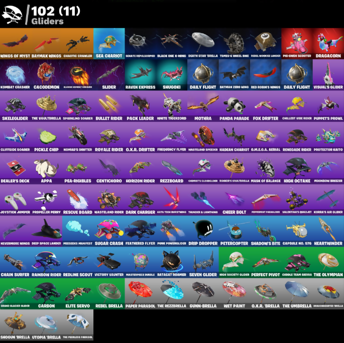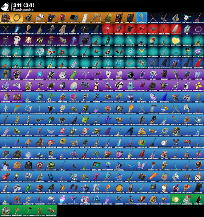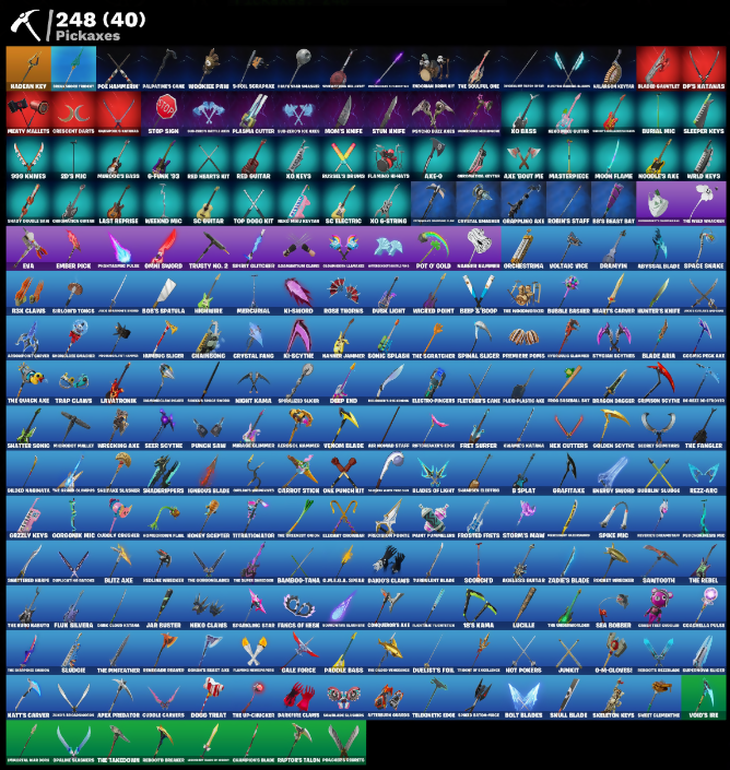 1981's Kama, 1984 Sashimi Bat, 20's Rice, 2015 Holdover, 400 Dog, 903 Eveters, 999 Knives, 999 Mic, A Goat, Absense, Abstract, Abyssal Blade, Ace Striker, Adam, Adoomiyoto, Aerosol Hammer, Afterburn Gloves, Agent Jones, Agent Patch, Alice World, Alien Boat, Alley Hangout, Alpha Trophy, Alphonso, Amo's, Android 17, Angela Outlaw, Angry Counter, Apex Predator, Aphrodite, Appa, Apprentice Eye, Arcanebreaker, Ares, Ark, Arnold Keys, Artemis, Astro, Astro Astral Sam, Augury, Augustine and Clay, Auto Clutch, Avatar Cycle, Avatar’s Flourish, Aw, Shucks., Awv Pack, Axe Shoot Me, Axe Woman's Staff, Axe-42, Axeviathan, Ayla Winn, Azarakotrek, B-Splat, Babette Claws, Baby Blaze, Bach’on 74, Backfett Bow, Bake To Go, Bamboo Patch, Bamboo-Tama, Bard Boiled, Baron’s Sword, Baroo's Claws, Bass Booster Guitar, Basshunter Cutlass, Batman Zero, Batman Zero Wing, Battle Blessing, Battle Legend, Battle Ruin, Battle Sludge, Battlemash, Baymax Wings, Beast Boy, Beasty Cloud, Beep 'n Boop, Bench Upgrade, Bernie, Best Mates, Big Boppers, Big Chill, Billion, Billy, Billy's Crown, Billy’s Tricycle, Black One X-Wing, Blade Aria, Blade Gauntlet, Blade-Void's Cape, Bladeo Breath, Blades of Light, Blazing Keytar, Blitz Woods, Blond, Bloodwing's Talons, Bloomed, Bloopers Bee, Blue Study, Blutz Axe, Bob Belcher, Bob's Beast Bat, Bob's Spatula, Boba Fett, Bob’s Happy Dance, Bolt Blades, Bomb Bag, Bone Breaker, Bonehead, Bones, Boogie Down, Booz Burner, Bop Mek, Boris Hane, Boss Breaker, Bouldin Sludge, Bow Go, Brat Smasher, Broken Eyes, Bubble Basher, Bullet Rider, Burgers Of The Bay, Bursai Mag, Butt-Head, Buzz Beat, Buzz Pogie, C.Q. H.Q. Laid-Eye, Cacodemon, Cafe Owner, California Love, Call Me, Capsule No. 576, Captain Phasma, Carbide, Carbon, Card Case, Card Drop, Carmine Rosso, Carnage (Venom), Carrot Stick, Cassidy Quinn, Catalyst, Catalyst Omega, Caution, Cazador, Cecilzilla Pulse, Centichoro, Cerberus, Chain Song, Chain Surfer, Champion Scout, Chaos Director, Chaotic Crawler, Cheer Bag, Cheer Bolt, Chemist's Cloudglider, Chewbacca, Chillest Vibe Rider, Chimichanga!, Chromatic Gaga, Civil Loads, Clara, Claret Retro, Classic Kombat Crasher, Clawbox, Clean Robot Billie, Cliffside Soarer, Cobalt Comrade, Coca Zero, Coldfish Stones, Commander, Company Jig, Conch Call, Constant Flyer, Construction Cards, Contract Caller, Cornholio Walk, Corsair's Cutlass, Corsair's Swordcrafter, Cosma, Cosmic Pick Axe, Couch Titan, Couple Dash, Covenant Launcher, Cozy Comcha, Crab Walkin’, Crates, Crazy Kong, Cream Cocoa, Crescent Darts, Crimson Scythe, Cro Octagonist, Crowbar Rex, Crystal Fang, Crystal Smasher, Cuddle Carvers, Cuddle Team Sierra, Cuddlepool, Cuddly Crusher, Cursed Katana, Cyclo Cycle, D-Double O E, DD2, DJ U.L. Ramer, DPS Katana, Dahl, Daigo, Daily Flight, Damage Carr, Dara, Dare, Dark Bullet, Dark Charger, Dark Doggo, Dark Matter, Dark Paradigm, Dark Vanguard, Dark Void, Dark Voyager, Darkfire Pickaxe, Darth Jar Jar, De-Rez Stixx, Dead Assassin, Deadpool, Dealer's Deck, Death Rockers, Death Star 'Brella, Deep End, Deep Space Lander, Dental Mic, Desirable, Diamond Hammer, Diamond Hanzo, Diamond Throne, Die With A Smile, Dilly With It, Diva Fever, Doggie Foot, Doggo Treat, Dokkai Dack, Doom Team Leader, Doppelschlate, Downturn Axe, Dragacorn, Dragon Dagger, Dragon Fly, Dragonrider’s Chop, Dramyin, Dreadknight, Dream Island Pickaxe, Drink '83, Drip Dropper, Duck Duffle, Dude With The Fish, Dudge, Dueling Card Trick, Duelist's Foil, Duke Of Flies, Duplikates, Durrr Taisho, Dusk Hammer, Dusk Light, E.P. Protodog, Eeavis, Egg House Bus, Eggshell, Electric Fingers, Electric Saber, Element Crowbar, Elite Agent, Elite Servo, Ember Pick, Emoticare, Enchanted Blades, End Bones, Endonian Bomb Axe, Errant, Ethans Footage, Ettigan Scythes, Eva, Excaliburs, Experts Combo, Feathered Flyer, Feazy, Feel The Force, Felix Silvera, Fenna, Fightculas, Fish Hunter, Fist Bump, Flaming Hearts, Flaming Hornbills, Flaming J-Bird, Flamingo, Flapper, Fletcher Kane, Fletcher's Cane, Flum Silvera, Flying Axes, Foil Flex, Fool of Jungle, For Ol’ K.R., Force Lightning, Fowl Mantle, Fox Drifter, Francs of Hire, Freeze Mage, Frequency Flyer, Fret Surfer, Frontpage Pose, Frosted Frets, Frozen Treat Earl, Full Head, Fulle Googley, Funk '93, G.A.T.C.H.E.R., Gains, Galactic Knives, Gale Force, Games Manager, Garbage Pack, Gardens - Hits, Garrison Stacks, Gatso Brush Axe, General Grievous, Generators Mug Table, Genius Core, Geno, Gentleman’s Dab, Get Lost, Get Schwifty, Ghost Battalion, Ghostpatrol, Ghost’s Heart Axe, Gilbert, Gleark, Gludge, Gmail Portal, Goku Black, Golden Scythe, Golden Skate92, Golden Sledgehammer, Goliath, Good Gesture, Goodwires Glam, Gorgonik Mic, Goth The Riff, Grand Glacier Glider, Grappling Axe, Gravelord's Blade, Green Ranger, Grimey, Grizzly Keys, Groover's Beats, Gumball Gun, Gunn-Brella, Gunnar, Gwen Step, Hadean Chariot, Hadean Key, Hades, Hadman Gate, Hajime, Halo Ring, Hammer Jammer, Hanpikes Kasa, Harvest Shaker, Hatch-Pack, Hatfield, Havoc Slicer, Headmaster 'Brella, Headpool, Heart Chopper, Heart's Beast, Heart's Carver, Heartwinder, Helichopper, Hero Baymak, Hexo Claws, Hi-Def, Hi-Scythe, Hiedsmall, High Octane, High Society Glider, Highwire, Hilder, Holey Game, Holiday Boyy, Holy 8000 Pack, Honey Scepter, Hoodie's Case, Hope, Hope Star, Horizon, Horizon Rider, Hot Pokers, Hotdog's Kebabak, Hoverfly, Humble, Huntcure, Hunter's Knife, Hydroslashers Axe, Hype, Ignition Pack, Ik Press Nog, Immortal Maid, Imperial Admiral, Imperial Koiro, In The Robot, Indira Wayne, Inferno, Inky Pie, Invisible Cut, Iron Cage, Iron Man, Iron Man Zero, Isaac Clarke, It’s Chemistry!, I’m A Mystery, I’m The Visual, Jack O' Cannons, Jack Sparrow, Jack's C Ploze, Jack's Imagination, Jack's Prize, Jackie, Jade, Jake Car, Japanese Ambassador, Jar Of Dirt, Jarr Buster, Jet Signals, Jing, Jok, Joss, Joystick Jumper, Jukebox Bop, Jumbo Popcorn, Junk-Y, Junkit, KI-Sword, Kaiser Scepter, Kaleidos Cape, Kata Tech Bursting, Ka