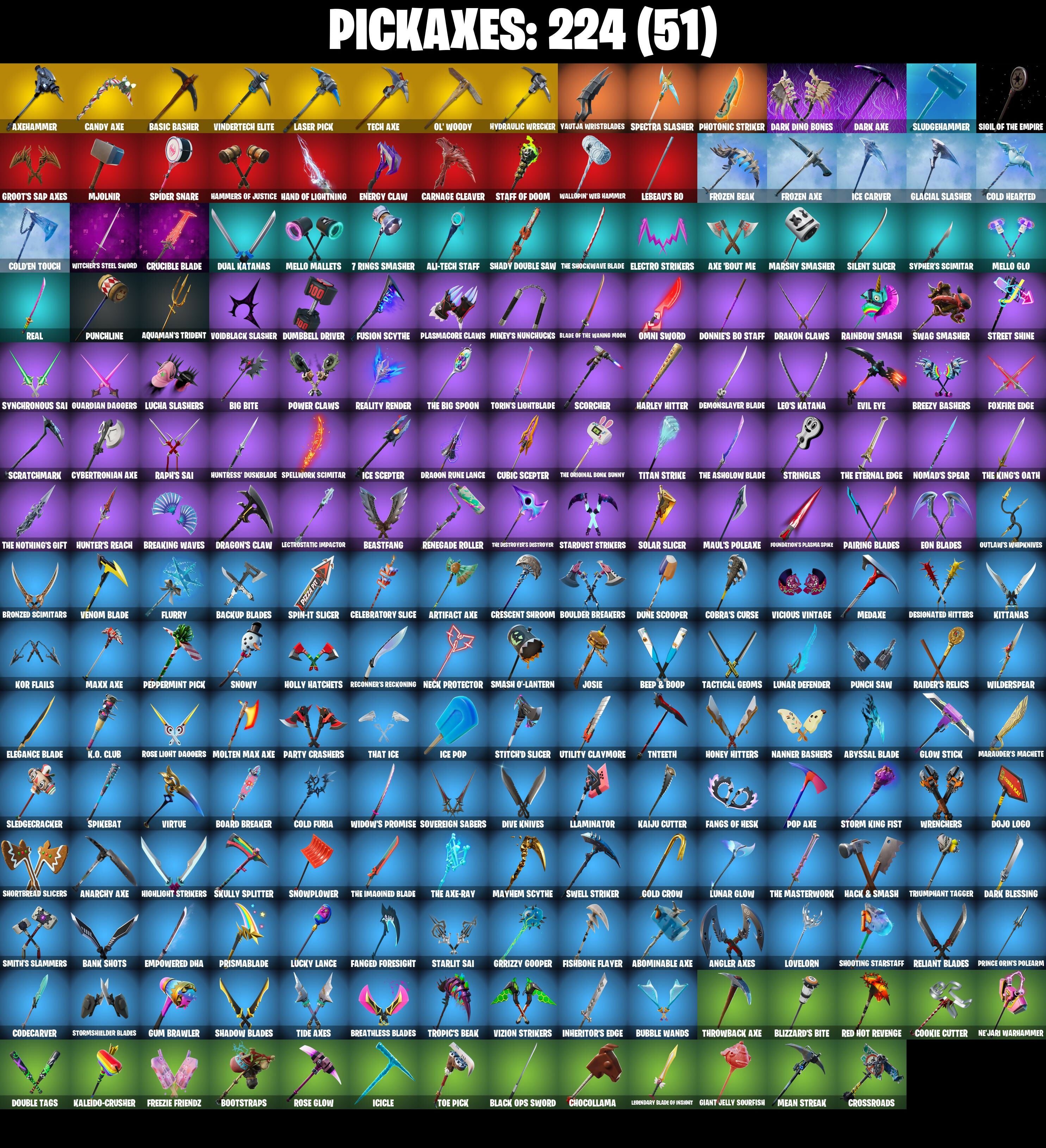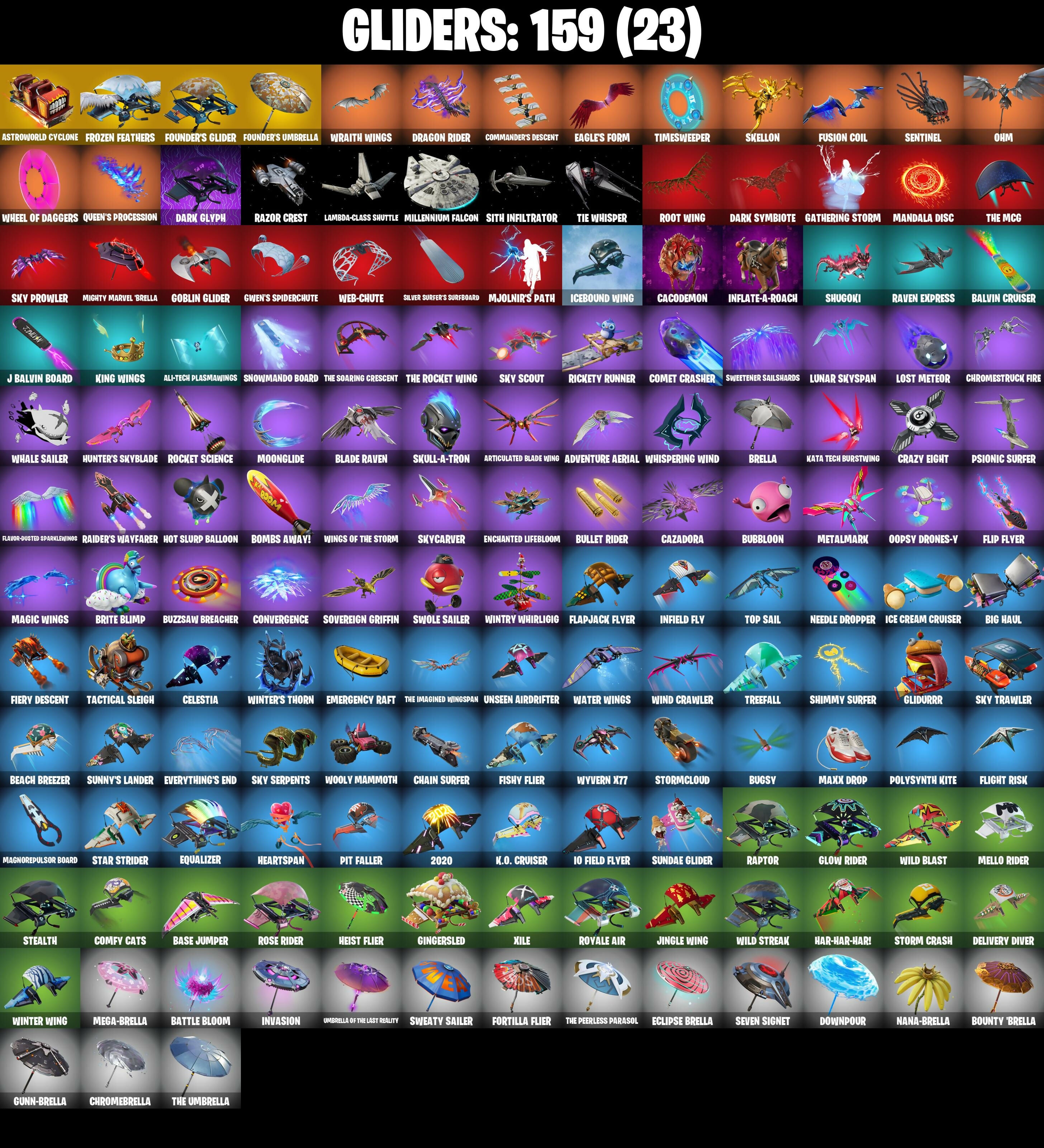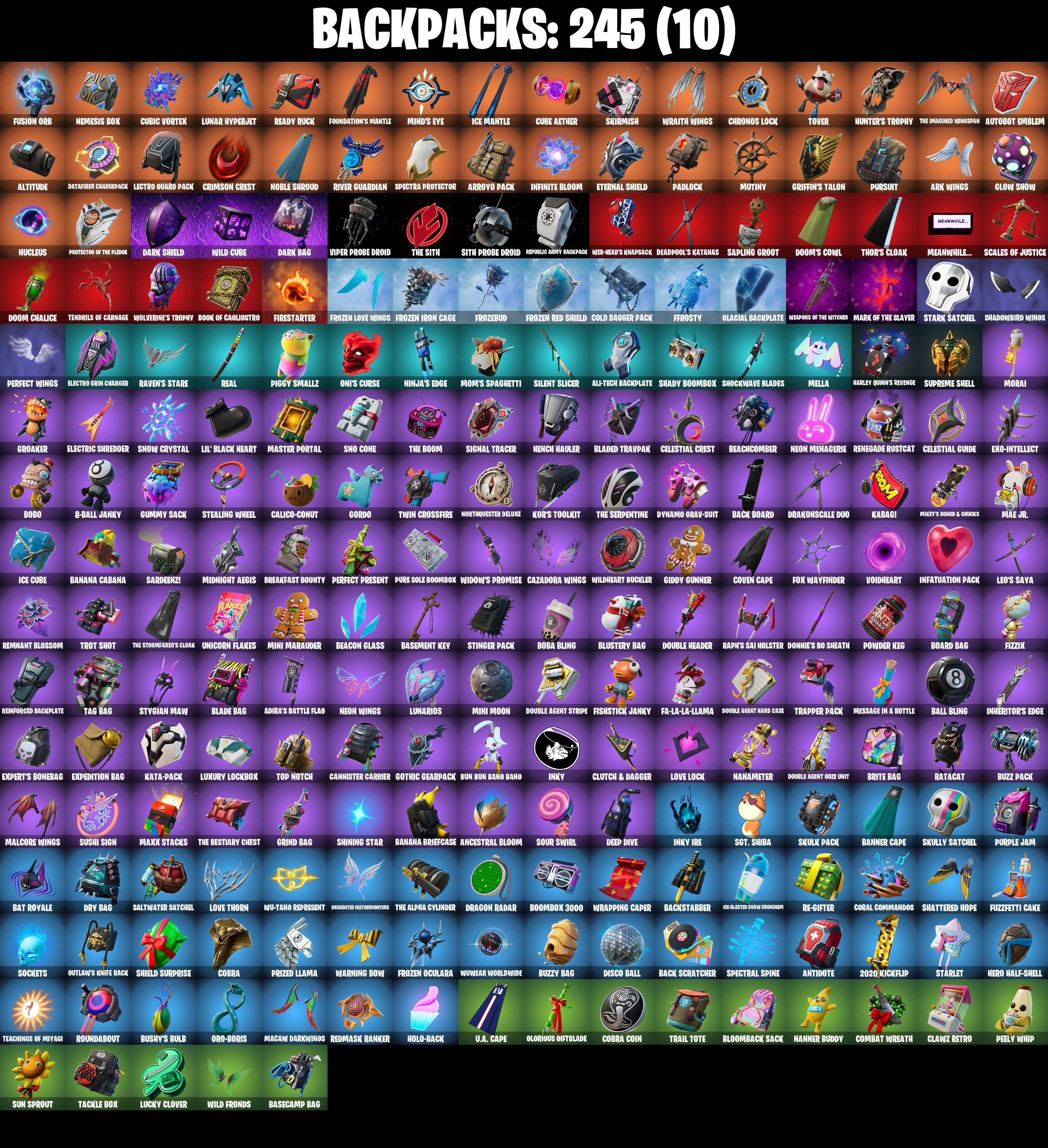 'Scratchmark, 10 Field Flyer, 2020, 2020 Kickflip, 7 Rings Smasher, 8-Ball Janky, 8-Ball Vs Scratch, Abominable Axe, Absenz, Abstrakt, Abyssal Blade, Adira, Adira (Battle Mask), Adira's Battle Flag, Adventure Aerial, Agent Peely, Ahsoka Tano, Air Shredder, Airie, Ali-A, Ali-Tech Backplate, Ali-Tech Plasmawings, Ali-Tech Staff, Altitude, Anarchy Axe, Ancestral Bloom, Angler Axes, Antidote, Antonia, Aquaman, Aquaman's Trident, Arachrobatics, Arctic Adeline, Ariana Grande, Ark, Ark Wings, Arroyo Pack, Arsola's Clone Trooper, Arthur Curry, Articulated Blade Wing, Artifact Axe, Astra, Astrea, Astro Armor, Astroworld Cyclone, Autobot Emblem, Axe 'Bout Me, Axehammer, Back Board, Back Scratcher, Backstabber, Backup Blades, Balance Board, Ball Bling, Balletic, Balvin Cruiser, Banana Briefcase, Banana Cabana, Bank Shots, Banner Cape, Base Jumper, Basecamp Bag, Basement Key, Basic Basher, Bat Royale, Battle Bloom, Beach Breezer, Beachcomber, Beacon Glass, Bear Hug, Beast Blastin', Beastfang, Beep & Boop, Big Bite, Big Fan, Big Haul, Billy Bounce, Black Ops Sword, Blackheart, Blackheart (Stage 8), Blade Bag, Blade Of The Waning Moon, Blade Raven, Bladed Travpak, Blaze, Blinding Lights, Blizzard's Bite, Bloomback Sack, Blowin' Up, Blustery Bag, Board Bag, Board Breaker, Boba Bling, Boba Snack, Bobo, Boing!, Bombs Away!, Book of Gaolostro, Boombox 3000, Boomin', Boop!, Boosting Ki, Bootstraps, Boulder Breakers, Bounty 'Brella, Breakfast Bounty, Breakin', Breaking Waves, Breathless Blades, Breezabelle, Breezy Bashers, Brella, Bring It Around, Brite Bag, Brite Blump, Brite Bomber, Brite Gunner, Britestorm Bomber, Bronzed Scimitars, Brutus, Bryce 3000, Bubble Wands, Bubblegum Highwire, Bubbloon, Bugsy, Bullet Rider, Bullpen Brawler Dusty, Bun Bun Bano Bano, Bushranger, Bushy's Bulb, Bust A Move, Buzz Pack, Buzzsaw Breacher, Buzzy Bag, Bytes, Bytes (Lone Traveler), Cacodemon, Calico-Conut, Call Me, Called Shot, Cameo Vs Chic, Candy Axe, Cannister Carrier, Carnage, Carnage Cleaver, Cat Flip, Cazadora, Cazadora Wings, Celebratory Slice, Celestia, Celestial Crest, Celestial Guide, Chain Surfer, Chaos Double Agent, Charlotte, Chef's Special, Chicken Wing It, Chocollama, Choice Knit, Chromebrella, Chromestruck Fire, Chronos Lock, Clawz Retro, Clean Groove, Clean Sweep, Click Click Flash, Clone Trooper, Club President Helsie, Clutch & Dagger, Cobalt, Cobra, Cobra Coin, Cobra's Curse, Codecarver, Cold Dagger Pack, Cold Furia, Cold Hearted, Cold'en Touch, Combat Wreath, Comet Crasher, Comfy Cats, Commander's Descent, Conjure Weapon, Convergence, Cookie Cutter, Coral Commandos, Coruscant Guard, Count It!, Coven Cape, Cozy Knit Jonesy, Crabby, Crack It, Crackdown, Crazy Eight, Crazy Feet, Crescent Shroom, Crimson Crest, Crossroads, Crowning Achievement, Crucible Blade, Cryptic, Cube Aether, Cubic Scepter, Cubic Vortex, Curling Iron, Cybertronian Axe, Cyclo Curl, D'ark, DJ Bop, Dagger Dance, Dahlia, Dance Monkey, Dark Axe, Dark Bag, Dark Blessing, Dark Bomber, Dark Dino Bones, Dark Glyph, Dark Jonesy, Dark Red Knight, Dark Shield, Dark Symbiote, Dark Wild Card, Darth Maul, Darth Vader, Datafiber Chargepack, Deadpool, Deadpool Unmasked, Deadpool's Katanas, Deep Dive, Delivery Diver, Demonslayer Blade, Designated Hitters, Dice Roll, Dirtbike Challenge, Disco Ball, Disco Diva, Dive Knives, Doctor Doom, Doctor Strange, Dojo Logo, Don't Start Now, Donatello, Donnie's Bo Sheath, Donnie's Bo Staff, Doom Chalice, Doom Slayer, Doom's Cowl, Double Agent Hard Case, Double Agent Hush, Double Agent Ooze Unit, Double Agent Stripe, Double Agent Wildcard, Double Header, Double Tags, Double Up, Downpour, Dragon Radar, Dragon Rider, Dragon Rune Lance, Dragon Stance, Dragon Steel Hybrid, Dragon's Claw, Drakonscale Duo, Dramatic Flares, Draxon Claws, Drippin' Flavor, Droop, Dry Bag, Dual Katanas, Dumbbell Driver, Dune Scooper, Dusty, Dynamo Grav-Suit, Eagle's Form, Eclipse Brella, Electric Shredder, Electro Grin Charger, Electro Shuffle, Electro Strikers, Elegance Blade, Emergency Raft, Empowered Dha, Empress Fan Dance, Enchanted Featherbrooch, Enchanted Lifebloom, Energy Claw, Envision, Eon Blades, Equalizer, Era, Eren Jaeger, Erisa, Eternal Knight, Eternal Shield, Everything's End, Evie, Evie (Summer Strider), Evil Eye, Exo-Intellect, Expedition Bag, Expert's Bonebag, Expressionism, Extraterrestrial, Fa-La-La-Llama, Fabio Sparklemane, Fade, Fanged Foresight, Fangs of Hesk, Fast Flex, Feelin Jaunty, Fiery Descent, Fire Spinner, Firestarter, Fish Thicc, Fishbone Flayer, Fishstick, Fishtstick Janky, Fishy Flier, Fizzix, Flaky Feast, Flap-Jack Flyer, Flashback Breakdown, Flavor-Dusted Sparklewings, Flight Risk, Flip Flyer, Flippin' Away, Flurry, Focused, Fortilla Flier, Foundation's Mantle, Foundation's Plasma Spike, Founder's Glider, Founder's Umbrella, Fox Wayfinder, Foxfire Edge, Free Flow, Freezie Friendz, Frost Squad, Frosty, Frozebud, Frozen Axe, Frozen Beak, Frozen Feathers, Frozen Iron Cage, Frozen Love Ranger, Frozen Love Wings, Frozen Ocularea, Frozen Raven, Frozen Red Knight, Frozen Red Shield, Fusion, Fusion Coil, Fusion Orb, Fusion Scythe, Fuzzetti Cake, GI Guardian, Gage, Galaxy Scout, Gangnam Style, Gathering Storm, Gear Specialist Maya, Geralt Of Rivia, Get Funky, Get Gone, Get Griddy, Get Out Of Your Mind, Giant Jelly Soupfish, Giddy Gunner, Ginger Gunner, Gingersled, Glacial Backplate, Glacial Slasher, Glidurrr, Glorious Giftblade, Glow Rider, Glow Show, Glow Stick, Glowsticks, Goblin Glider, Gold Crow, Golf Clap, Good Guy, Gordo, Gothic Gearpack, Grand Salute, Griffin's Talon, Grind Bag, Grizzly Gooper, Groaker, Groot, Groot's Sap Axes, Grriz, Guardian Daggers, Gum Brawler, Gumbo, Gumbo (Sour), Gummy Sack, Gunn-Brella, Gunnar, Gwen's Spiderchute, Hack & Smash, Hammers of Justice, Hand Signals, Hand of Lightning, Hand-Forged, Happy, Har-Har-Har!, Harley (Always Fantabulous), Harley Hitter, Harley Quinn, Harley Quinn's Revenge, Harlowe, Harlowe (Helmet), Have A Seat, Haven, Haven (Tropical Chirper), Hazard, Heart Sign, H