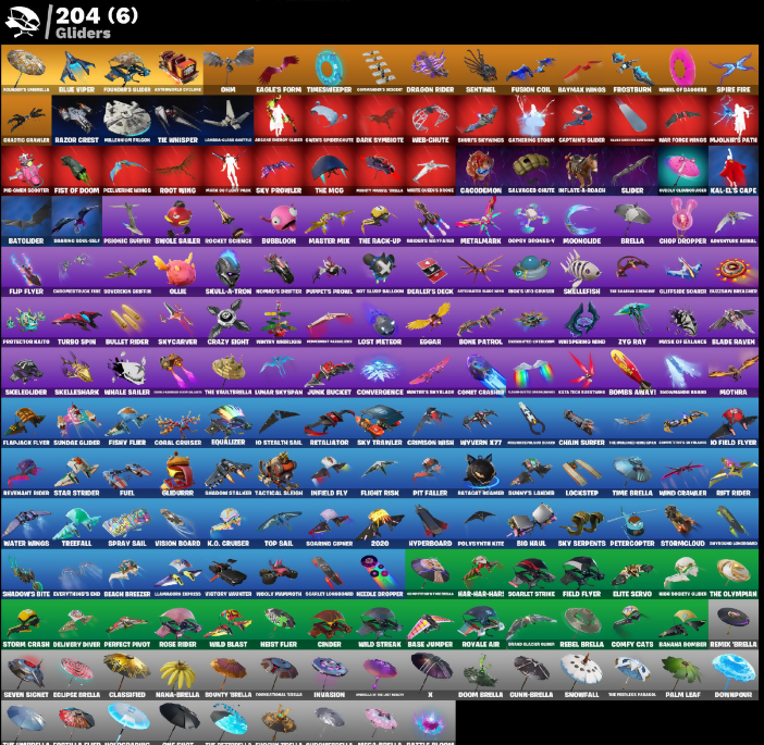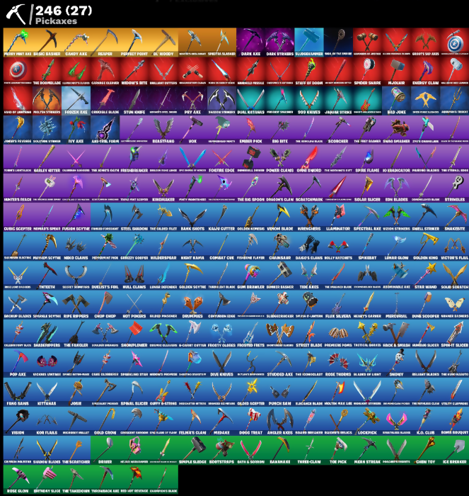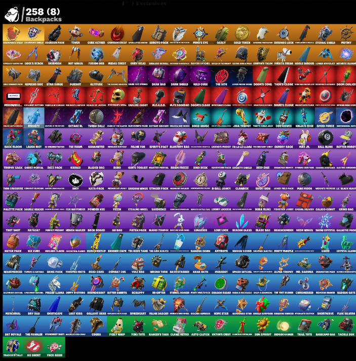 1-Ball, 10 Orchestration, 2020, 2020 Kickflip, 393 Knives, 8 Ball-Janky, 9000 Knives, A Taste For Machine, Abomination Axe, Ace's Wrap, Acrobatics Grand Salute, Adam's Battle Flag, Adira, Adventure Pack, Adventurer's Aviator, Agent Jones, All Shredder, Alpha Thrower, Altitude, Anchor Arms, Angler Axes, Antarctic Bloom, Antidote, Aphrodite, Arachne, Arctic Adelle, Arroyo Pack, Assassin Pack, Atomicbacksmile Mesh, Atomwing Cyclone, Aura, Australian Claus, Auto Clutch, Axe-tinction Form, Back 8 Smash, Back Bloom, Back Board, Back Pack Katana, Backstabber, Bad Joke, Balance Board, Ball Bling, Ballsy, Baloo Trunkpak, Bamboo Slash, Banana Bomber, Banana Style, Bananarma, Bananaxe, Bank Shots, Banner Cape, Barrel Of Daggers, Base Jumper, Basecamp Bag, Bashboy, Basic Basic, Bat Royale, Batdoller, Battalion, Baymax Wings, Beach Breezer, Beachcomber, Beacon Glass, Bean Bag, Bear Breaker, Beast Mode, Beastfang, Berry Bag, Best Friends, Between Cheeks, Big Bite, Big Haul, Bigts UFO Cruiser, Bike Cycle, Billy Bounce, Bird vs Train, Birthday Slice, Blaccio Blade, Blackheart, Blade Bag, Blade Raven, Blade of Hope, Bladed Bag, Bladeriders, Blades of Light, Blast Beat, Blinding Lights, Blowin' Up, Blue Viper, Blustery Bag, Board Breaker, Bob'a Bling, Bob's Night, Bobbins Lightslicer, Bobo, Bombomi, Bombs Away!, Bonds Banquett, Bone Dagger, Bone Patrol, Boogie Down, Boosting M, Bootstraps, Booty Beats, Booyah, Bop Bop, Bored, Bounty' Brella, Brain Freeze, Brainpaths, Brawn, Breathless Blades, Brella, Brilliant Blades, Brilliant Outfits, Brilliant Outfitter, Bro Root, Broken Lightning, Bubbooloon, Bullet Rider, Bun Bun Bag, Bunny Racer, Butter Robot, Button Shorts, Buzz Pack, Buzzsaw Bear Killer, Bytes, Cacodemon, Cake, Calamity Classic, Calico-Count, Call Me, Called Shot, Cameo, Camerage, Camoflistric Fue, Camper Outback, Camsy, Candy Axe, Cantina, Captain America, Captain Jones, Carbon Polisher, Card Drop, Cardistry, Case Clobberer, Cat Flup, Catalyst, Celestial Fury Nails, Centurian Edge, Centurion, Cerberus, Chain Surfer, Chainman's Crest, Chainman's Shield, Chainsaur, Chairman Meowscles, Champion's Blade, Chaos Director, Charlotte, Chew Toy, Chop Chop, Chop Dropper, Chrome Punk, Chromedress, Chronos Lock, Churchill Twist, Cinder, Clartz Retro, Classified, Clawbox, Clean Slide, Clicky Test, Cliffse Brella, Cliffside Soarer, Cloak of Justice, Clone Peely Queen, Cluck, Cobalt, Cobra, Combat Cue, Combo Vibin, Come Up, Comet Crash, Comfy Cats, Commando's Secret, Conga, Convergence, Coral Cruiser, Corey Commando, Cosmic Claws, Crackle Blade, Crazy Eight, Creation Cruiser, Creation's Peak, Crescent Scythe Edge, Crimson Crest, Crimson Wish, Crystal, Crystal Llama, Cubic Sceptor, Culex Eather, Curl Rotation, Cyclostroll, DJ Woody, Dab Stand, Dabjo's Claws, Dagger Dance Pins & Claws, Danger Roll Driver, Dark Axe, Dark Bag, Dark Bomber, Dark Jonesy, Dark Sea Strong, Dark Shield, Dark Strikers, Darth Vader, Dat's & Soom, Dave Knives, Dead Card, Deadfort Harvester, Deadpool, Dealer's Deck, Death Mask, Deep Dive, Delivery Diver, Demonic Ladies, Demonstrator, Depth Dealer, Despair, Dewdrop, Diamond Diva Jones, Diamond Stone, Dice Roll, Dimensional Gate, Dino Deck, Dino Scooper, Dirty Roadster, Disco Fever, Divine Eye-Oculus, Djila vs Sentinel, Do The Split, Doctor Doom, Doctor Slone, Dodo House, Dog's Treat, Donata Brian, Doom, Doom Brella, Doom Chalice, Doom Slayer, Doom Team Leader, Doom's Cloak, Doom's Cowl, Doomin', Double Header, Downpour, Dragon Again, Dragon Rider, Dragon Stance, Dragon's Claw, Dragoon's Torch, Drana, Dream Fleet, Driver, Droop, Drumslice, Dry Bag, Dual Montages, Duelist's Foil, Dummy, Dusty, Dynamo, Dynamo Tatina, ED Eradicator, Eagle, Eagle's Form, Eclipse Scroll, Eden Blades, Egg, Eggar, Electric Seagars, Electro Shuffle, Elite Servo, Ember Pick, Emma Frost, Emoticiape, Energy Claw, Epic Peter Dinevor, Equalizer, Erisa, Eternal Knight, Eternal Realm, Eternal Shield, Eve, Everything's Odd, Expedition, Faced Palm, Fade, Faded Forester, Fang Saws, Fangsicle Jimmy, Feeble Dagger, Felina's Claw, Feline Fun, Field Flyer, Finny Bomber, Firebone Flayer, Fish Thicc, Fishstick, Fishy Flyer, Fist Of Doom, Flak Slivera, Flapjack Flyer, Flash Feast, Flight Risk, Flip Flip In A Way, Flip Flyer, Flux Silvera, Forearm Grip, Foreller, Founder's Blades, Founder's Glider, Founder's Umbrella, Fox Mayflower, Foxfire Edge, Fresh Aura, Freshslicer, Frezin, Frigoff Funk, Front Page, Frostbite Fists, Frostburn, Frosted Frites, Frosty, Frosty Claws, Frozen Axe, Fuel, Fusion, Fusion Coil, Fusion Orb, Fusion Scythe, G-Can't Cutter, Galactic Pack, Gallant Gear, Gamer Basher, Garbage Cleaner, Geralt of Rivia, Get Griddy, Ghost Portal, Gildurr, Glide To Swing, Glided Sceptor, Glitter, Gloaked Shadow, Go Bag, Go Home, Goal of the Empire, Gold Brutus, Gold Clap, Gold Crown, Gold Dagger Pack, Gold Midas, Gold Reaper, Gold Token, Golden King, Golden Reaper, Golden Scythe, Golden Sneakers, Good Guy, Goopy Drones-V, Grim Thorn Scythe, Grind Bag, Grit, Grizz, Grizzly Gore, Groot, Groots Sap Axe, Guild Pinsker, Gum Brawler, Gumbo, Gummy Sack, Gun-Brella, Gunnar, Gurry G-String, Hammers of Justice, Hand Forged, Hang Gun, Hanik, Har-Har-Har!, Harlem Shake, Harley Hitter, Hassai, Hatch Pack, Have A Seat, Headhunter Prime, Heavy It, Heavy Multiplayer, Heist Flyer, Hello Friend, Helsie, Helter Skelter Dance, Hench Hauler, Hero Baymax, Heroic Pose, Hi-Gifter, Hidden Gate, Hillside Necklace, Ho-Hemet, Holiday Boxy, Hollow Headless, Hoodie's New Hat, Hoops, Hope, Hope Star, Horn Spin, Hot Pickers, Hot Slurp Balloon, Hot Wings, Hound Slicer, Hunt's Carver, Hunter's Reach, Hyakasa's Catana, Hyperboard, I'm A Mystery, Ice Breaker, Ice Cube, Id Stealth Sail, Igo Field Flyer, Imperial March, In My Roodo, Incisarto Vithas, Infield Fly, Infinite Bloom, Infinite Dab, Inflate-A-Roach, Inky, Intense, Invasion, Invisible Cue, Iris, Iron Man Reclassic, Iron Thorn, It Is Finished, It's Showtime, It's... You?, Ivory Axe, Izumi, JC, Jade, Jaguars Str