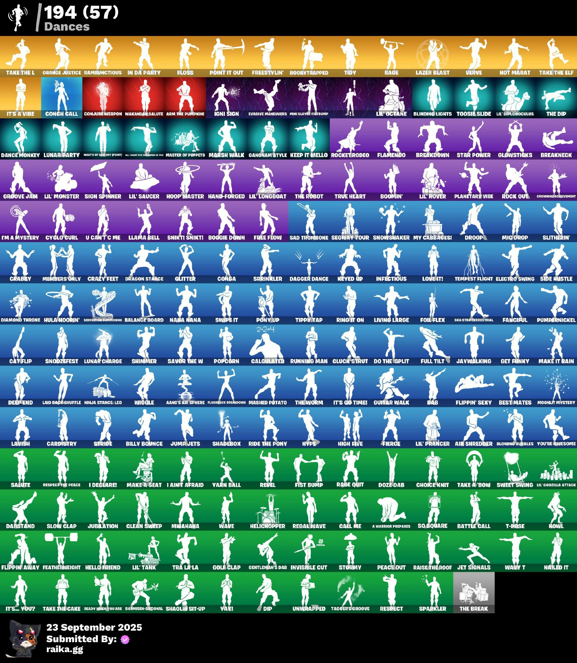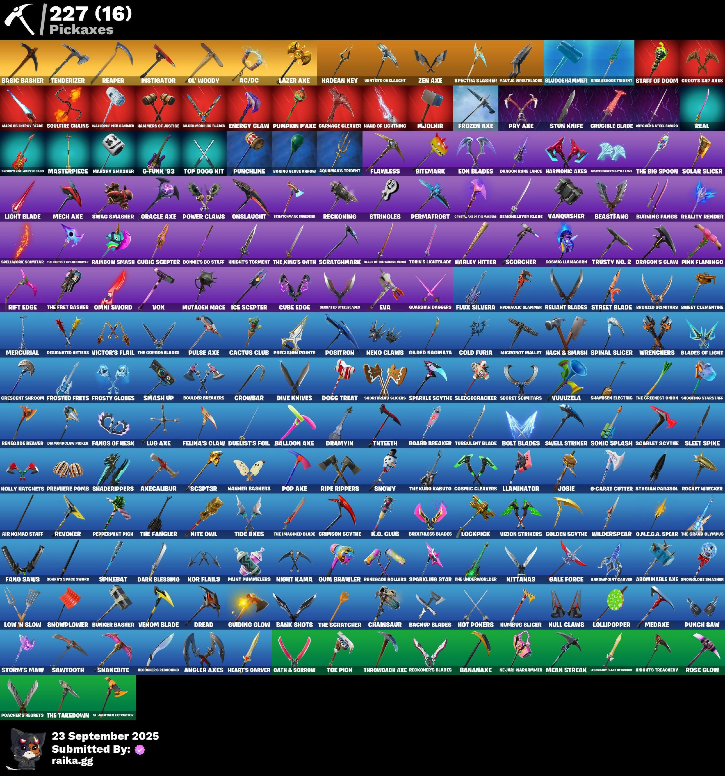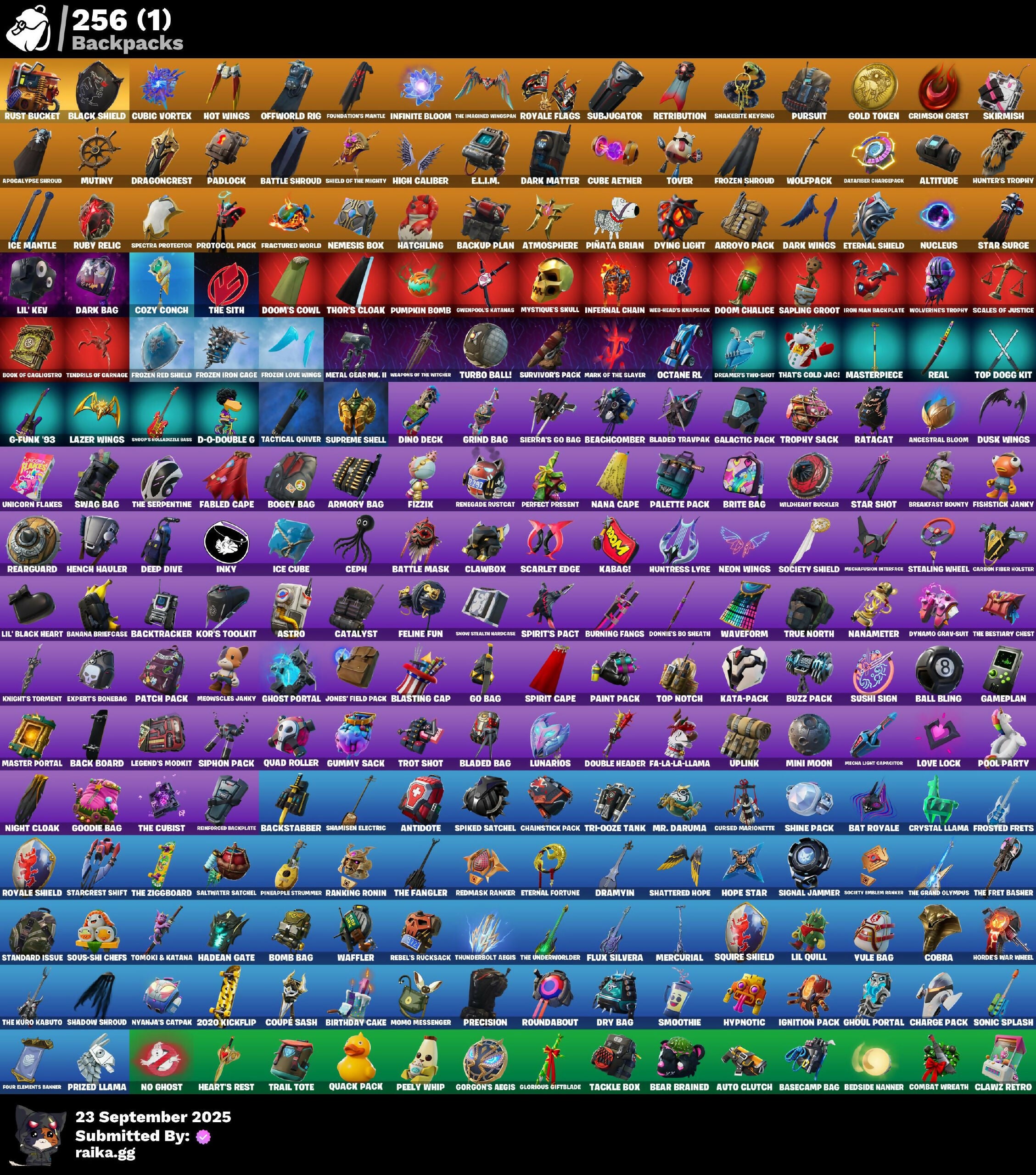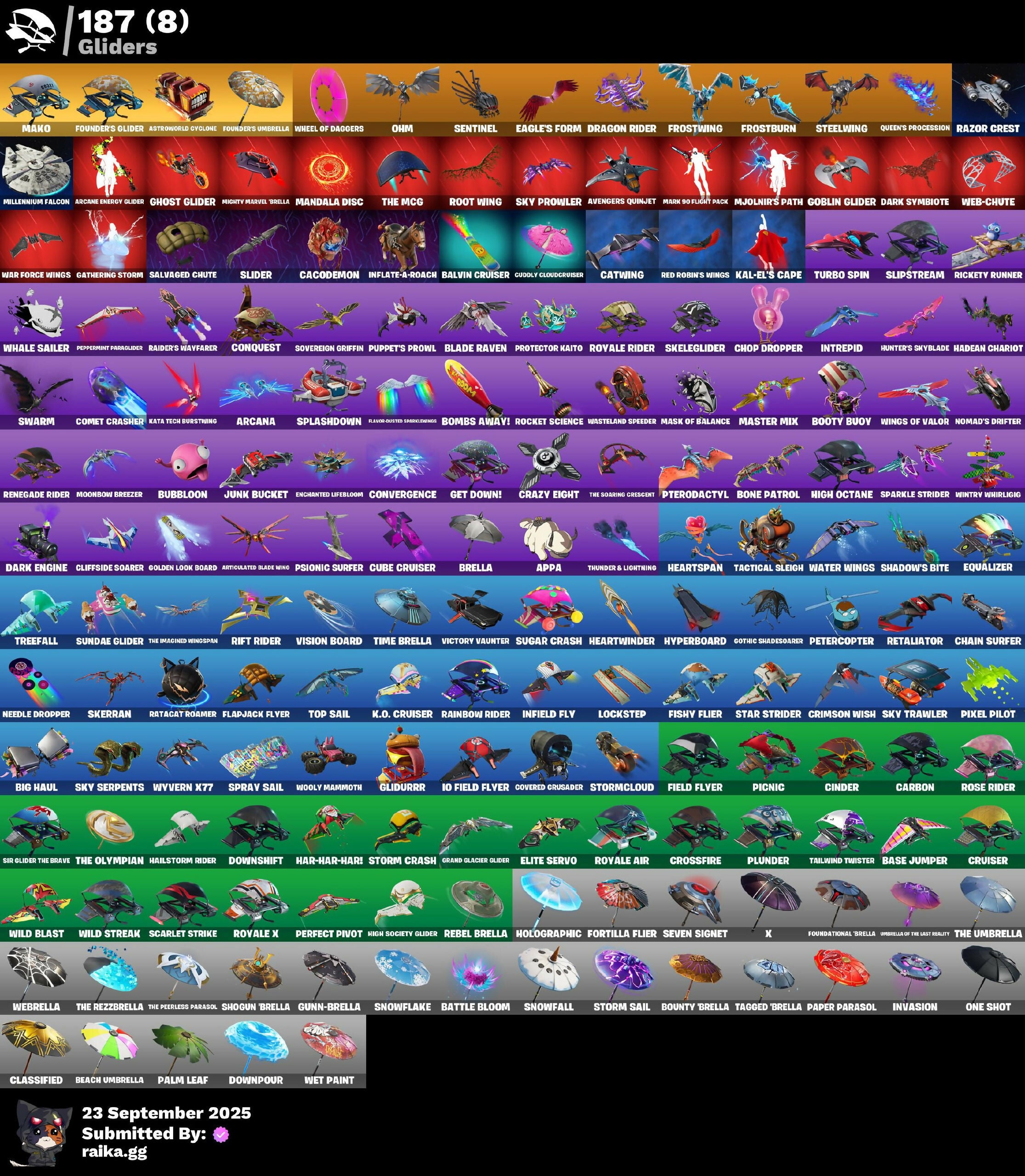 10 Field Flyer, 2020 Kickflip, 6-Carat Cutter, A Warrior Prepares, AC/DC, Aang's Air Sphere, Abominable Axe, Agent Jones, Agent Peely, Air Nomad Staff, Air Shredder, Aling, All I Want For Christmas Is You, All-Weather Extractor, Altitude, Ancestral Bloom, Anchore, Angler Axes, Antidote, Aphrodite, Apocalypse Shroud, Appa, Aquaman, Aquaman's Trident, Arcana, Arcane Energy Glider, Aris, Arm The Pumpkin!, Armory Bag, Arrowpoint Carver, Arroyo Pack, Artemis, Articulated Blade Wing, Astro, Astroworld Cyclone, Atmosphere, Auto Clutch, Avengers Quinjet, Axecalibur, Back Board, Backstabber, Backtracker, Backup Blades, Backup Plan, Balance Board, Ball Bling, Balloon Axe, Balvin Cruiser, Banana Briefcase, Bananaxe, Bandolier, Bank Shots, Base Jumper, Basecamp Bag, Basic Basher, Bat Royale, Battle Bloom, Battle Call, Battle Mask, Battle Shroud, Beach Umbrella, Beachcomber, Bear Brained, Beastfang, Bedside Nanner, Best Mates, Big Haul, Bigaronk, Billy Bounce, Birthday Cake, Bitemark, Black Knight, Black Shield, Blackheart, Blade Raven, Blade of the Hanging Moon, Bladed Bag, Bladed Travpak, Blades of Light, Blasting Cap, Blinding Lights, Blowing Bubbles, Blue Squire, Blum, Board Breaker, Bogey Bag, Bolt Blades, Bomb Bag, Bombs Away!, Bone Patrol, Boobytrapped, Boogie Down, Book of Cagliostro, Boomin', Booty Buoy, Boulder Breakers, Bounty 'Brella, Boxing Glove Arrow, Breakdown, Breakfast Bounty, Breakneck, Breakpoint, Breakshore Trident, Breathless Blades, Brella, Brite Bag, Bronzed Scimitars, Brutus, Bubbloon, Bumbley Cheney, Bunker Basher, Burning Fangs, Buzz Pack, Cache Assassin, Cacodemon, Cactus Club, Calculated, Call Me, Carbide, Carbon, Cardistry, Carnage, Carnage Cleaver, Cat Flip, Catalyst, Catwing, Ceph, Cerberus, Chain Surfer, Chainsaur, Chainstick Pack, Charge Pack, Charlotte, Choice Knit, Chomp Jr., Chop Dropper, Cinder, Clara, Classified, Clawbox, Clawz Retro, Clean Sweep, Cleverve Axe of the Pastels, Cliffside Soarer, Cluck Strut, Cobalt, Cobra, Cold Furia, Colin, Combat Wreath, Comet Crasher, Commrader, Conch Call, Conga, Conjure Weapon, Conquest, Convergence, Cosmic Cleavers, Cosmic Llamacorn, Coupé Sash, Covered Crusader, Cozy Conch, Crabby, Crazy Eight, Crazy Feet, Cream, Crescent Shroom, Crimson Crest, Crimson Scythe, Crimson Wish, Crossfire, Crowbar, Crucible Blade, Cruiser, Crystal Llama, Cube Aether, Cube Cruiser, Cube Edge, Cubic Scepter, Cubic Vortex, Cuddly Cloudcruiser, Cursed Marionette, Cyclo Curl, D-O-Double G, DJ Yonder, Dab, Dabstand, Dagger Dance, Dance Monkey, Dante, Dark, Dark Bag, Dark Blessing, Dark Engine, Dark Matter, Dark Symbiote, Dark Voyager, Dark Wings, Datafiber Chargepack, Deadpool, Deadpool's Katanas, Deep Dive, Deep End, Demavgorgon, Demi, Demonslayer Blade, Derby Dynamo, Designated Hitters, Diamond Diva, Diamond Throne, Diamondclaw Picker, Dino Deck, Dip, Dire, Dive Knives, Do The Split, Doctor Doom, Dogg Treat, Donatello, Donnie's Bo Staff, Donnie's Do Sheath, Doom Chalice, Doom Slayer, Doom's Cowl, Double Header, Downpour, Downshift, Doze Dab, Dragon Rider, Dragon Rune Lance, Dragon Stance, Dragon's Claw, Dragoncrest, Dramvin, Dramyin, Dread, Dreamer's Two-Shot, Drift, Droop, Dry Bag, Dubbs Taisho, Duelist's Foil, Dusk, Dusk Wings, Dusty, Dying Light, Dynamo Grav-Suit, E.L.I.M., Eagle's Form, Electro Swing, Elite Agent, Elite Servo, Ember, Enchanted Lifebloom, Energy Claw, Enforcer, Eon Blades, Equalizer, Erisa, Eternal Fortune, Eternal Knight, Eternal Shield, Ether, Eva, Evasive Maneuvers, Expert's Bonebag, Fa-La-La-Llama, Fabled Cape, Fade, Fallen Red Knight, Fanciful, Fang Saws, Fangs of Hesk, Featherweight, Felina's Claw, Feline Fun, Field Flyer, Fierce, Fishstick, Fishstick Janky, Fishy Flier, Fist Bump, Fizzix, Flamenco, Flapjack Flyer, Flashback Breakdown, Flavor-Dusted Sparklebling, Flawless, Flippin' Away, Flippin' Sexy, Floss, Flux Silvera, Foil-Flex, Forn, Fortilla Flier, Foundation's Mantle, Foundational 'Brella, Founder's Glider, Founder's Umbrella, Four Elements Banner, Fractured World, Free Flow, Freestylin', Frost Squad, Frostburn, Frosted Frets, Frostwing, Frosty Globes, Frozen Axe, Frozen Iron Cage, Frozen Love Wings, Frozen Raven, Frozen Red Shield, Frozen Shroud, Full Tilt, G-Funk '93, Galactic Pack, Galaxy, Galaxy Flyt, Galaxy Scuit, Gale Force, Gameplan, Gangnam Style, Gathering Storm, Gentleman's Dab, Get Down!, Get Funky, Ghost Glider, Ghost Portal, Ghost Rider, Ghoul Portal, Ghoul Trooper, Gilded Morphic Blades, Gilded Naginata, Glados Genesis, Glidurrr, Glitter, Glorious Giftblade, Glowsticks, Go Bag, Goblin Glider, Goff Clap, Gold Token, Golden Look Board, Golden Scythe, Goliath of Rivia, Goodie Bag, Gorgon's Aegis, Gothic Shadesoarer, Grand Glacier Glider, Green Arrow, Green Goblin, Gridy-Up, Grind Bag, Groot, Groots Sap Axes, Groove Jam, Guardian Daggers, Guiding Glow, Guitar Walk, Gum Brawler, Gummna, Gummy Sack, Gunn-Brella, Hack & Smash, Hadean Chariot, Hadean Gate, Hadean Key, Hadlocke, Hailstorm Rider, Hammers of Justice, Hand of Lightning, Hand-Forged, Har-Har-Har!, Harley Hitter, Harley Quinn, Harmonic Axes, Hatchling, Haven, Havoc, Heart's Carver, Heart's Rest, Heartspan, Heartwinder, Heem, Helicopter, Hello Friend, Hench Hauler, High Caliber, High Five, High Octane, High Society Glider, Holiday Roxx, Holly Hatchets, Holographic, Hoop Master, Hope, Hope Star, Horde's War Wheel, Hot Marat, Hot Pokers, Hot Wings, Howl, Hula Hoopin', Humbug Slicer, Hunter's Skyblade, Hunter's Trophy, Huntress, Huntress Lyre, Hybrid, Hydraulic Slammer, Hype, Hyperboard, Hypnotic, I Ain't Afraid, I Declare!, I'm A Mystery, Ice Cube, Ice Mantle, Ice Scepter, Igni Sign, Ignition Pack, In Da Party, Infectious, Infernal Chain, Inferno, Infield Fly, Infinite Bloom, Inflate-A-Roach, Inky, Instigator, Intrepid, Invasion, Invisible Cut, Iron Man, Iron Man Backplate, It's A Vibe, It's Go Time!, It's... You?, J. Bavn, J. C. Chang-Ning, Jaywalking, Jet Signals, Joey, Jonathan Stitch, Jones' Field Pack, Josie, Jubilation, Jules, Jules B.S., Jump J