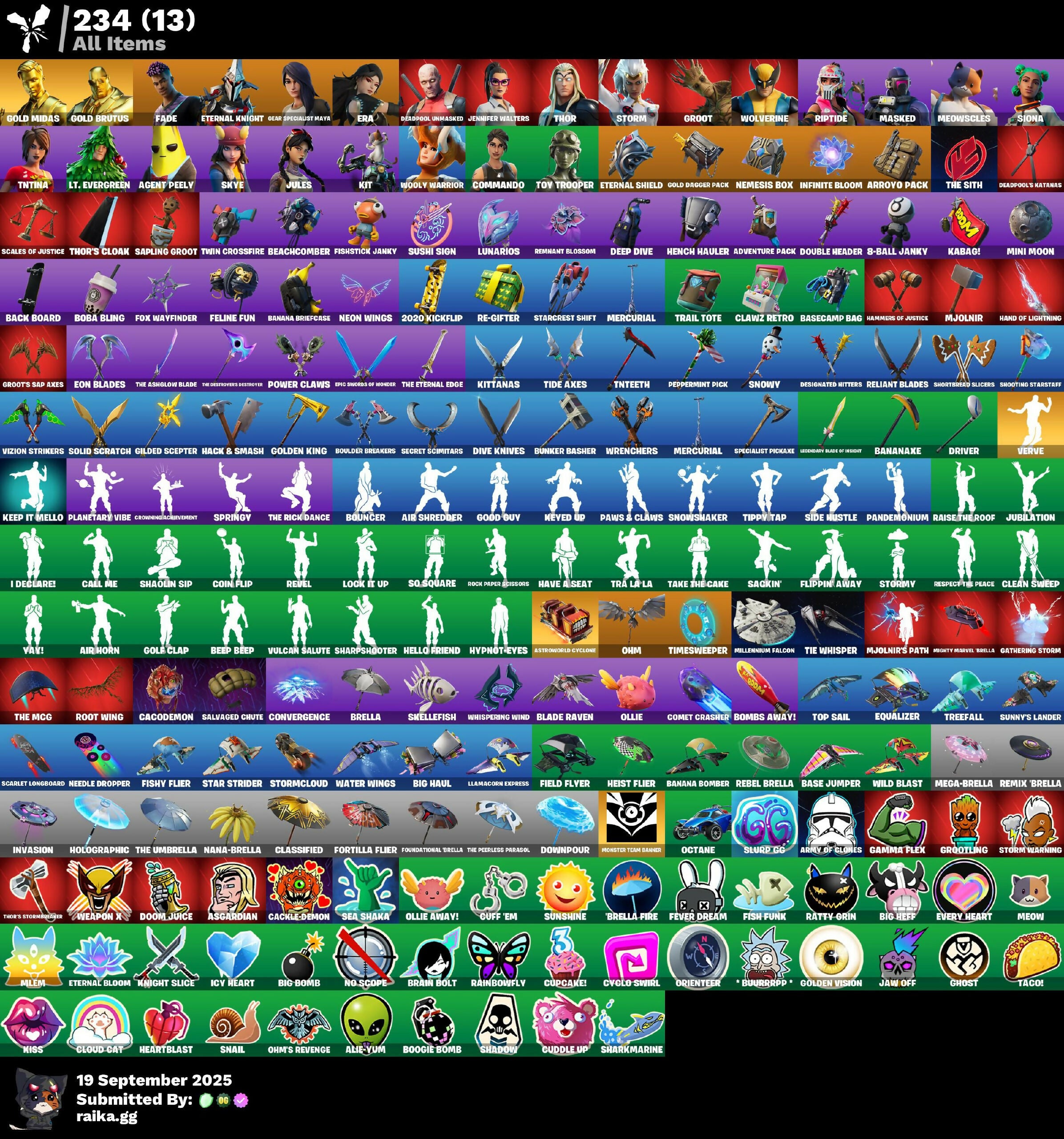 'Brella Fire, 2020 Kickflip, 8-Ball Janky, Adventure Pack, Agent Peely, Air Horn, Air Shredder, Alie-Yum, Army of Clones, Arroyo Pack, Asgardian, Astroworld Cyclone, Back Board, Banana Bomber, Banana Briefcase, Bananaxe, Base Jumper, Basecamp Bag, Beachcomber, Beep Beep, Big Bomb, Big Haul, Big Heff, Blade Raven, Boba Bling, Bombs Away!, Boogie Bomb, Boulder Breakers, Bouncer, Brain Bolt, Brella, Bunker Basher, Buurrrp, Cackle Demon, Cacodemon, Call Me, Classified, Clawz Retro, Clean Sweep, Cloud Cat, Coin Flip, Comet Crasher, Commando, Convergence, Crowning Achievement, Cuddle Up, Cuff 'Em, Cupcake!, Cyclo Swirl, Deadpool Unmasked, Deadpool's Katanas, Deep Dive, Designated Hitters, Dive Knives, Doom Juice, Double Header, Downpour, Driver, Eon Blades, Epic Swords of Wonder, Equalizer, Era, Eternal Bloom, Eternal Knight, Eternal Shield, Every Heart, Fade, Feline Fun, Fever Dream, Field Flyer, Fish Funk, Fishtick Janky, Fishy Flier, Flippin' Away, Fortilla Flier, Foundational 'Brella, Fox Wayfinder, Gamma Flex, Gathering Storm, Gear Specialist Maya, Ghost, Gilded Scepter, Gold Brutus, Gold Dagger Pack, Gold Midas, Golden King, Golden Vision, Golf Clap, Good Guy, Groot, Groot's Sap Axes, Grootling, Hack & Smash, Hammers of Justice, Hand of Lightning, Have a Seat, Heartblast, Heist Flier, Hello Friend, Hench Hauler, Holographic, Hypnot-Eyes, I Declare!, Icy Heart, Infinite Bloom, Invasion, Jaw Off, Jennifer Walters, Jubilation, Jules, Kabag!, Keep it Mello, Keyed Up, Kit, Kittanas, Knight Slice, Legendary Blade of Insight, Llamacorn Express, Lock it Up, Lt. Evergreen, Lunarios, Masked, Mega-Brella, Meow, Meowscles, Mercurial, Mighty Marvel Brella, Millennium Falcon, Mini Moon, Miss, Mjolnir, Mjolnir's Path, Mlem, Monster Team Banner, Nana-Brella, Needle Dropper, Nemesis Box, Neon Wings, No Scope, Octane, Ohm, Ohm's Revenge, Ollie, Ollie Away!, Orienteer, Pandemonium, Paws & Claws, Peppermint Pick, Planetary Vibe, Power Claws, Rainbowfly, Raise the Roof, Ratty Grin, Re-Gifter, Rebel Brella, Reliant Blades, Remix 'Brella, Remnant Blossom, Respect the Peace, Revel, Riptide, Rock Paper Scissors, Root Wing, Sackin', Salvaged Chute, Sapling Groot, Scales of Justice, Scarlet Longboard, Sea Shaka, Secret Scimitars, Shadow, Shaolin Sip, Sharkmarine, Sharpshooter, Shooting Starsstaff, Shortbread Slicers, Side Hustle, Siona, Skellefish, Skye, Slurp GG, Snail, Snowshaker, Snowy, So Square, Solid Scratch, Specialist Pickaxe, Springy, Star Strider, Starcrest Shift, Storm, Storm Warning, Stormcloud, Stormy, Sunny's Lander, Sunshine, Sushi Sign, Taco!, Take the Cake, The Ashglow Blade, The Destroyer's Destroyer, The Eternal Edge, The McG, The Peerless Parasol, The Rick Dance, The Sith, The Umbrella, Thor, Thor's Cloak, Thor's Stormbreaker, Tide Axes, Tie Whisper, Timesweeper, Tippy Tap, Tnteeth, Tntina, Top Sail, Toy Trooper, Tra La La, Trail Tote, Treefall, Twin Crossfire, Vav!, Verve, Vizion Strikers, Vulcan Salute, Water Wings, Weapon X, Whispering Wind, Wild Blast, Wolverine, Wooly Warrior, Wrenchers