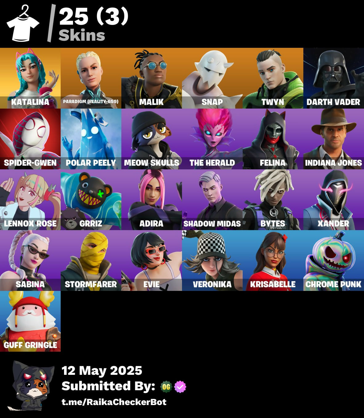 [PC/PSN/XBOX] 25 skins | Katalina | Paradigm (Reality-659) | Malik | Snap | Twyn | Darth Vader | Spider-Gwen | Polar Peely | Meow Skulls | The Herald | 300 VB