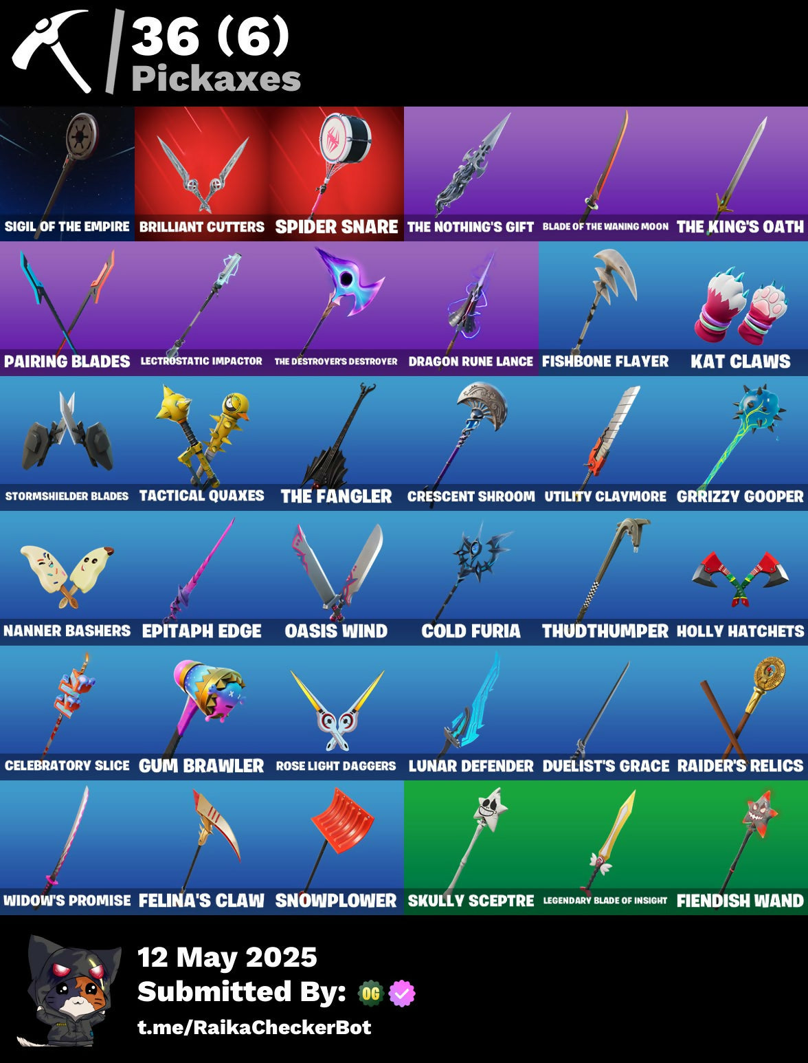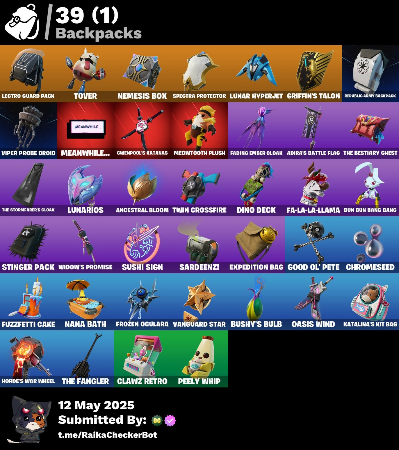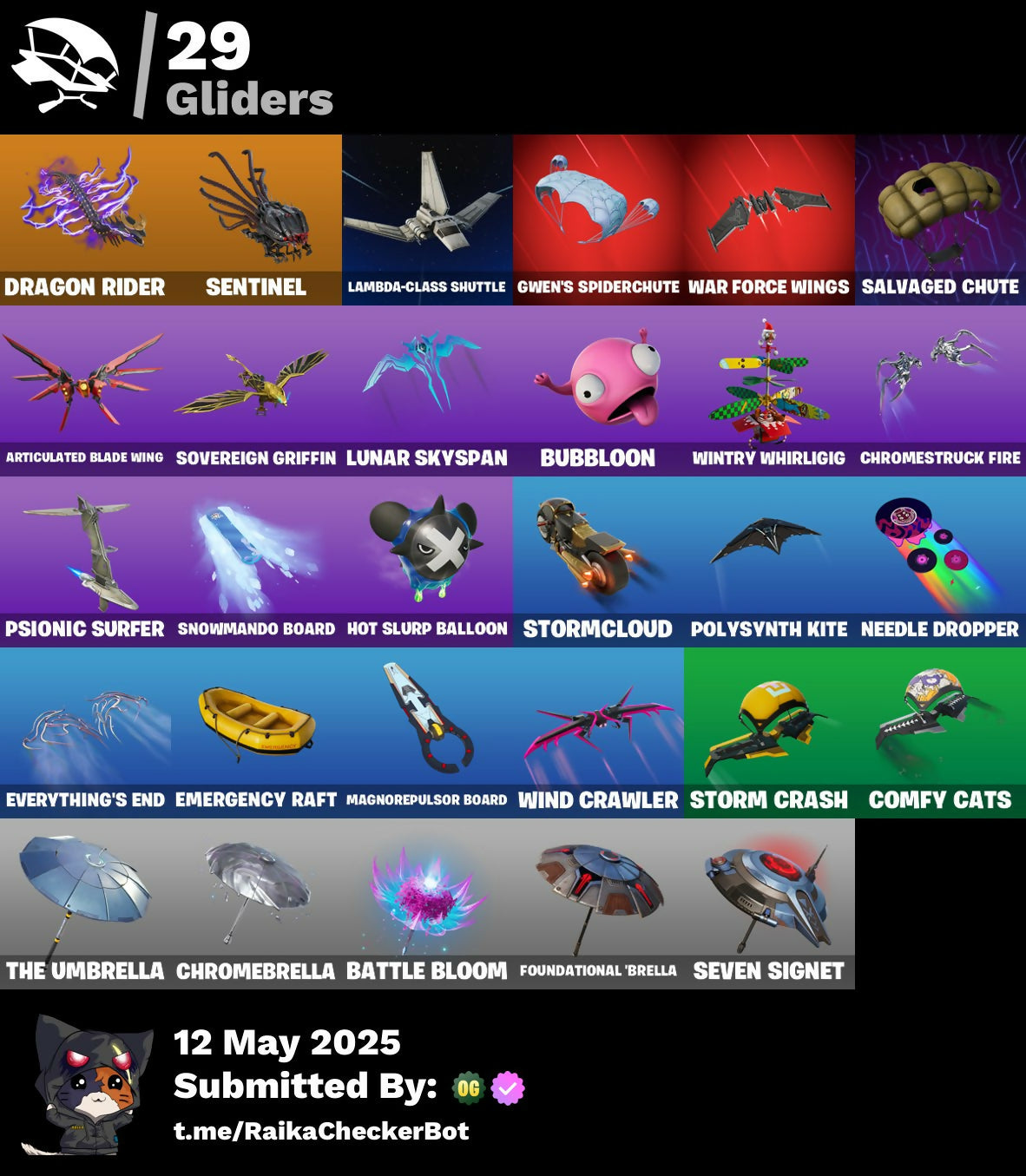 Adira, Adira (Battle Mask), Adira's Armor, Adira's Battle Flag, Agent Jones, Ancestral Bloom, Arachrobatics, Articulated Blade Wing, Banner Icon, Battle Bloom, Blade Of The Waning Moon, Blowin' Up, Brilliant Cutters, Bubbloon, Bun Bun Bang Bang, Bushy's Bulb, Buttoned Up, Bytes, Bytes (Lone Traveler), Bytes' Sigil, Call Me, Candy Cane, Cauldron Chill, Celebratory Slice, Checks And Scratches, Choice Knit, Chrome Marked, Chrome Punk, Chromebrella, Chromeseed, Chromestruck Fire, Clawz Retro, Clean Sweep, Cold Furia, Comfy Cats, Console Cup, Crescent Shroom, Crowning Achievement, Daisies, Darth Shader, Darth Vader, Dino Deck, Dragon Rider, Dragon Rune Lance, Dragon Rune Lances, Duelist's Grace, Emergency Raft, Ensnared, Epitaph Edge, Everything's End, Evie, Expedition Bag, Fa-La-La-Llama, Fading Ember Cloak, Felina, Felina's Claw, Fiendish Wand, Fishbone Flayer, Foundational 'Brella, Frozen Oculata, Frozen Over, Fry Angles, Fuzzfetti Cake, Gila Classic, Good Ol' Pete, Griffin's Talon, Grriz, Grrizzy Gooper, Guff Gringle, Gum Brawler, Gumbo, Gwen's Spiderchute, Gwenpool's Katanas, Gwettermann Jacket, Haven, Hexture, Holly Hatchets, Horde's War Wheel, Hot Slurp Balloon, Immortal Oasis, Imperial March, Indiana Jones, Indiana Jones' Hat, It Is Finished, Jubilation, Jurassically Charged, Kat Claws, Katalina, Katalina's Kit Bag, Krisabelle, Lambda-Class Shuttle, Laser Focused, Lectro Guard Pack, Lectro Tech, Lectrostatic Impactor, Legendary Blade Of Insight, Lennox Rose, Lobby Classic, Love It!, Lunar Defender, Lunar Hyperjet, Lunar Skyspan, Lunarian Luxury, Lunarios, Magnorepulsor Board, Malik, Malik (Solitary Defender), Malik's Honor, Meanwhile..., Meow Skulls, Meowtooth Plush, Nana Bath, Nanner Bashers, Needle Dropper, Nemesis Box, Oasis Wind, Omg I Love It, Organic Diamond, Pairing Blades, Paradigm (Aurelian), Paradigm (Reality-659), Paradigm Shift, Peely Whip, Polar Peely, Polished Stone, Polysynth Kite, Pool Cubes, Psionic Surfer, Raider's Relics, Raise The Roof, Republic Army Backpack, Rogue Archaeology, Rose Light Daggers, Sabina, Sabina (Ponytail), Sabina's Shuriken, Salvaged Chute, Sardeenz!, Sentinel, Seven Signet, Shadow Midas, Shuriken Spinner, Sigil Of The Empire, Skully Sceptre, Slurpmatic, Snap, Snowflake, Snowmando Board, Snowplower, Sovereign Griffin, Spectra Protector, Spectrakinetic, Spider Snare, Spider-Gwen, Spikes, Spinal Vinyl, Steady, Stinger Pack, Storm Crash, Stormcloud, Stormfarer, Stormfarer (Storm Brawler), Stormshielder Blades, Sushi Sign, Sweat-Free, Syndicate, Tactical Kat, Tactical Quaxes, Take A 'Bow, Tarana, The Balance Of Two, The Bestiary Chest, The Destroyer's Destroyer, The Dip, The Fangler, The Herald, The Inquisitor, The King's Oath, The Nothing's Gift, The Stormfarer's Cloak, The Umbrella, Thudthumper, Toasty Roast, Tover, Twin Crossfire, Twinkly, Twyn, Utility Claymore, Vanguard Star, Veronika, Vinyl, Viper Probe Droid, Waning Moon, War Force Wings, Waterworks, Widow's Promise, Wild Rainbow, Wind Crawler, Wintry Whirligig, Wooly, Xander