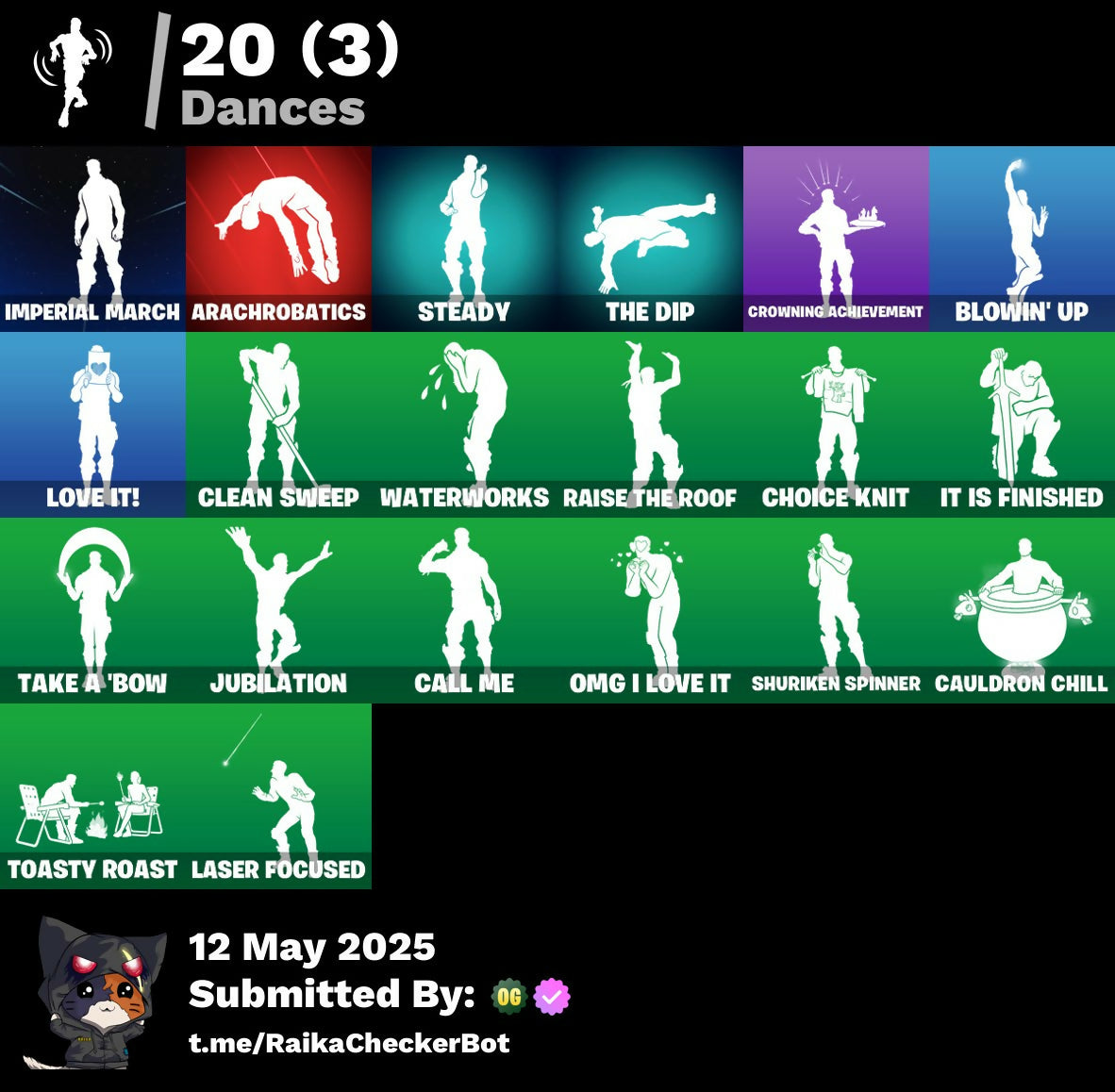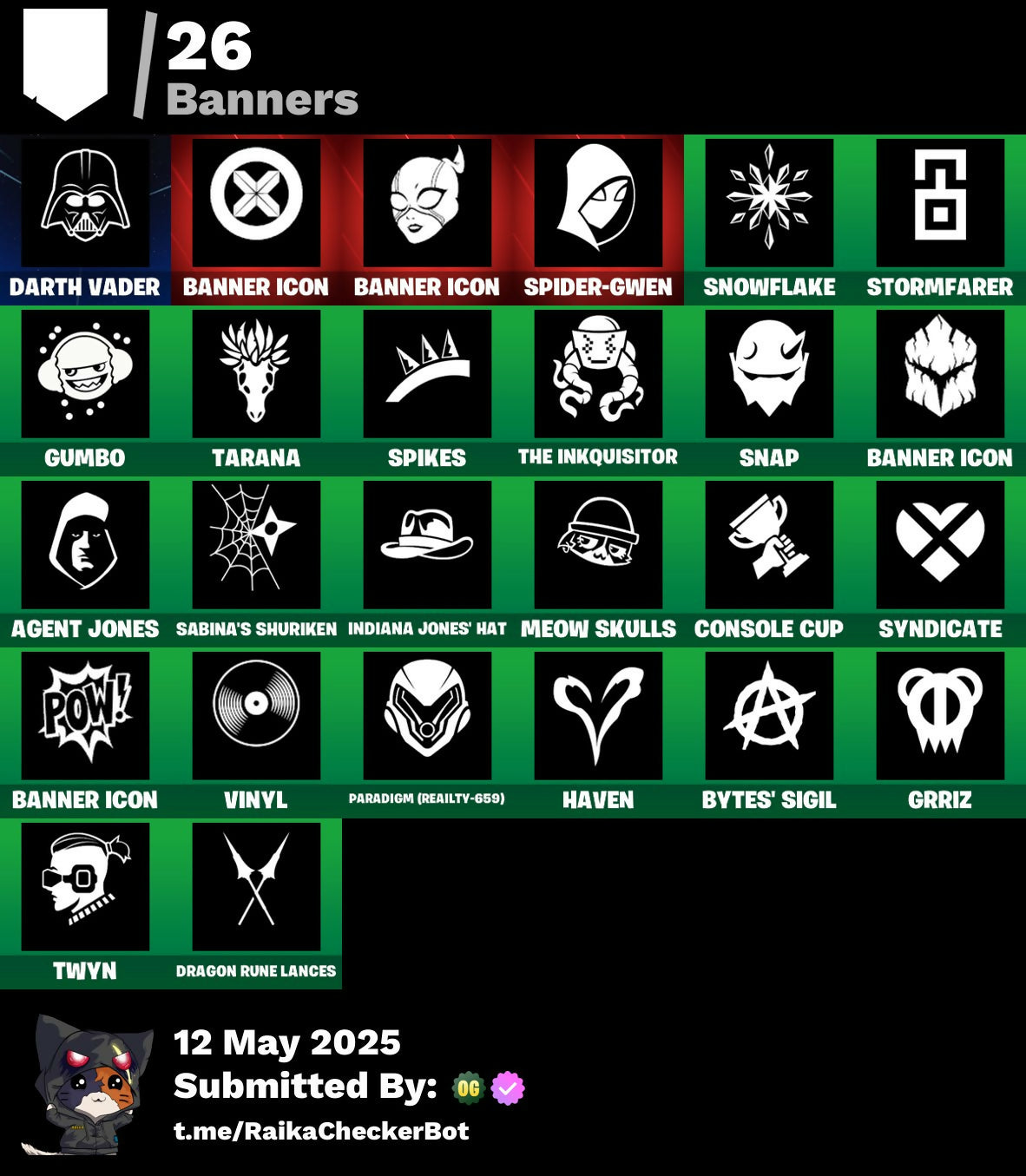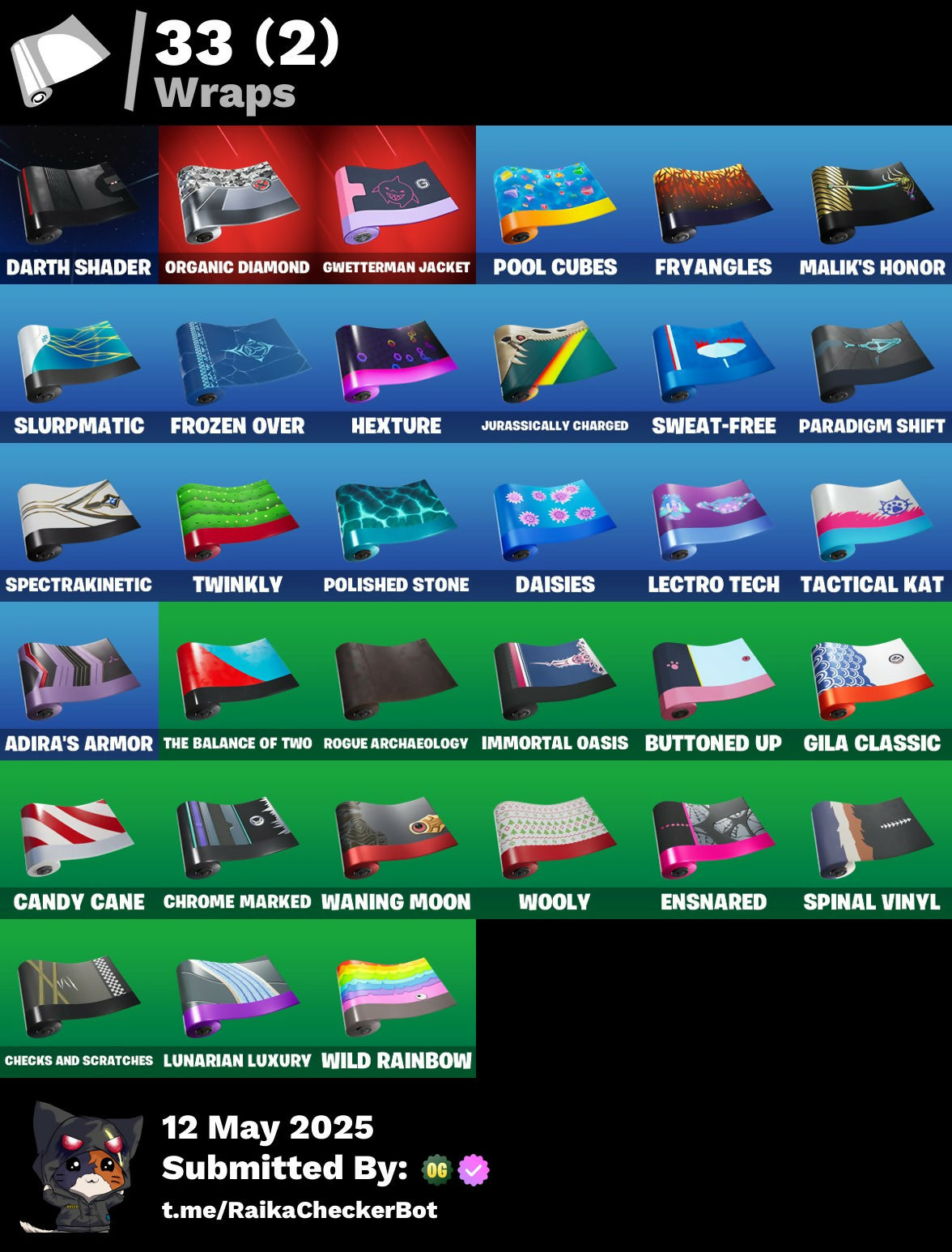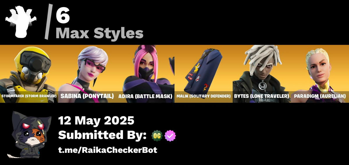 Adira, Adira (Battle Mask), Adira's Armor, Adira's Battle Flag, Agent Jones, Ancestral Bloom, Arachrobatics, Articulated Blade Wing, Banner Icon, Battle Bloom, Blade Of The Waning Moon, Blowin' Up, Brilliant Cutters, Bubbloon, Bun Bun Bang Bang, Bushy's Bulb, Buttoned Up, Bytes, Bytes (Lone Traveler), Bytes' Sigil, Call Me, Candy Cane, Cauldron Chill, Celebratory Slice, Checks And Scratches, Choice Knit, Chrome Marked, Chrome Punk, Chromebrella, Chromeseed, Chromestruck Fire, Clawz Retro, Clean Sweep, Cold Furia, Comfy Cats, Console Cup, Crescent Shroom, Crowning Achievement, Daisies, Darth Shader, Darth Vader, Dino Deck, Dragon Rider, Dragon Rune Lance, Dragon Rune Lances, Duelist's Grace, Emergency Raft, Ensnared, Epitaph Edge, Everything's End, Evie, Expedition Bag, Fa-La-La-Llama, Fading Ember Cloak, Felina, Felina's Claw, Fiendish Wand, Fishbone Flayer, Foundational 'Brella, Frozen Oculata, Frozen Over, Fry Angles, Fuzzfetti Cake, Gila Classic, Good Ol' Pete, Griffin's Talon, Grriz, Grrizzy Gooper, Guff Gringle, Gum Brawler, Gumbo, Gwen's Spiderchute, Gwenpool's Katanas, Gwettermann Jacket, Haven, Hexture, Holly Hatchets, Horde's War Wheel, Hot Slurp Balloon, Immortal Oasis, Imperial March, Indiana Jones, Indiana Jones' Hat, It Is Finished, Jubilation, Jurassically Charged, Kat Claws, Katalina, Katalina's Kit Bag, Krisabelle, Lambda-Class Shuttle, Laser Focused, Lectro Guard Pack, Lectro Tech, Lectrostatic Impactor, Legendary Blade Of Insight, Lennox Rose, Lobby Classic, Love It!, Lunar Defender, Lunar Hyperjet, Lunar Skyspan, Lunarian Luxury, Lunarios, Magnorepulsor Board, Malik, Malik (Solitary Defender), Malik's Honor, Meanwhile..., Meow Skulls, Meowtooth Plush, Nana Bath, Nanner Bashers, Needle Dropper, Nemesis Box, Oasis Wind, Omg I Love It, Organic Diamond, Pairing Blades, Paradigm (Aurelian), Paradigm (Reality-659), Paradigm Shift, Peely Whip, Polar Peely, Polished Stone, Polysynth Kite, Pool Cubes, Psionic Surfer, Raider's Relics, Raise The Roof, Republic Army Backpack, Rogue Archaeology, Rose Light Daggers, Sabina, Sabina (Ponytail), Sabina's Shuriken, Salvaged Chute, Sardeenz!, Sentinel, Seven Signet, Shadow Midas, Shuriken Spinner, Sigil Of The Empire, Skully Sceptre, Slurpmatic, Snap, Snowflake, Snowmando Board, Snowplower, Sovereign Griffin, Spectra Protector, Spectrakinetic, Spider Snare, Spider-Gwen, Spikes, Spinal Vinyl, Steady, Stinger Pack, Storm Crash, Stormcloud, Stormfarer, Stormfarer (Storm Brawler), Stormshielder Blades, Sushi Sign, Sweat-Free, Syndicate, Tactical Kat, Tactical Quaxes, Take A 'Bow, Tarana, The Balance Of Two, The Bestiary Chest, The Destroyer's Destroyer, The Dip, The Fangler, The Herald, The Inquisitor, The King's Oath, The Nothing's Gift, The Stormfarer's Cloak, The Umbrella, Thudthumper, Toasty Roast, Tover, Twin Crossfire, Twinkly, Twyn, Utility Claymore, Vanguard Star, Veronika, Vinyl, Viper Probe Droid, Waning Moon, War Force Wings, Waterworks, Widow's Promise, Wild Rainbow, Wind Crawler, Wintry Whirligig, Wooly, Xander