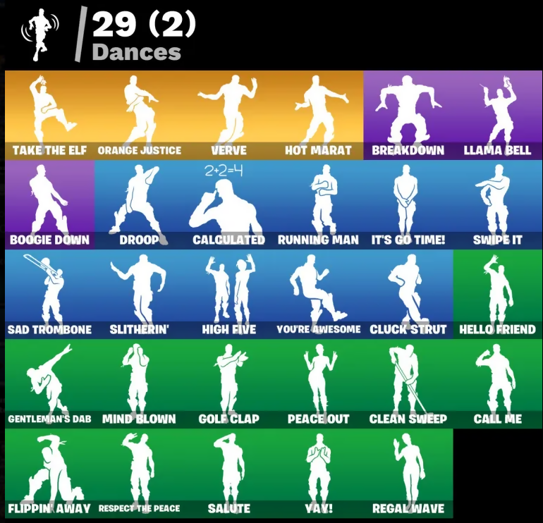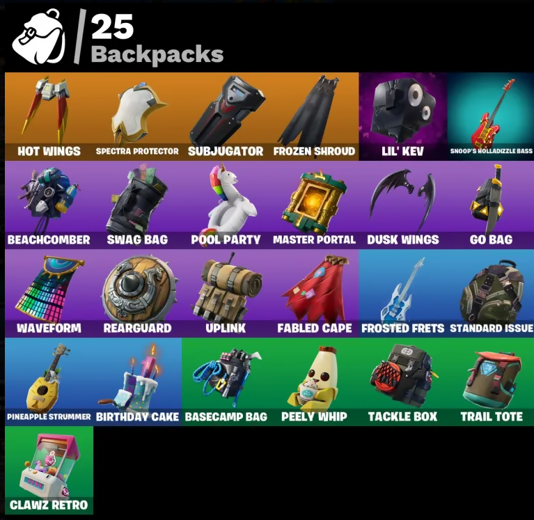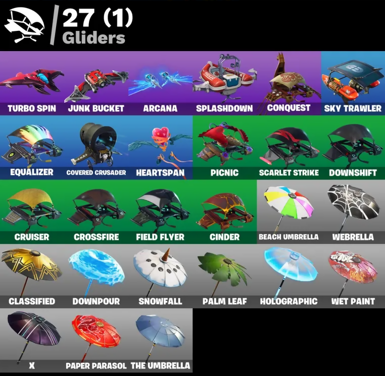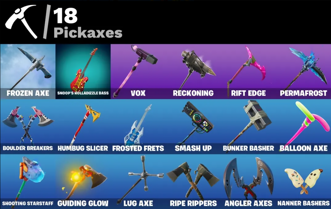 Angler Axes, Arcana, Balloon Axe, Basecamp Bag, Beach Umbrella, Beachcomber, Birthday Cake, Boogie Down, Boulder Breakers, Breakdown, Brite Bomber, Bunker Basher, Bunker Jonesy, Calamity, Calculated, Call Me, Catalyst, Cinder, Classified, Clawz Retro, Clean Sweep, Cluck Strut, Conquest, Covered Crusader, Crossfire, Cruiser, DJ Yonder, Downpour, Downshift, Drift, Droop, Dusk, Dusk Wings, Enforcer, Equalizer, Fable, Fabled Cape, Field Flyer, Flippin' Away, Frosted Frets, Frozen Axe, Frozen Shroud, Gentleman's Dab, Giddy-Up, Go Bag, Golf Clap, Guiding Glow, Heartspan, Hello Friend, High Five, Holographic, Hot Marat, Hot Wings, Humbug Slicer, Huntress, It's Go Time!, Journey Vs Hazard, Junk Bucket, Laguna, Lil' Kev, Llama Bell, Lug Axe, Master Portal, Mind Blown, Nanner Bashers, Orange Justice, Palm Leaf, Paper Parasol, Pastel, Peace Out, Peely Whip, Permafrost, Picnic, Pineapple Strummer, Pool Party, Ragnarok, Rearguard, Reckoning, Redline, Regal Wave, Respect The Peace, Rift Edge, Ripe Rippers, Rippley Vs Sludge, Rook, Rox, Running Man, Sad Trombone, Salute, Santa Dogg, Scarlet Strike, Sentinel, Shooting Starstaff, Sky Trawler, Sledgehammer, Slitherin', Smash Up, Snoop's Holladizzle Bass, Snowfall, Spectra Protector, Splashdown, Standard Issue, Subjugator, Sun Strider, Swag Bag, Swipe It, Tackle Box, Take The Elf, The Ace, The Umbrella, Trail Tote, Turbo Spin, Turk Vs Riptide, Uplink, Vega, Verve, Vox, Waveform, Webrella, Wet Paint, X, X-Lord, Yay!, You're Awesome
