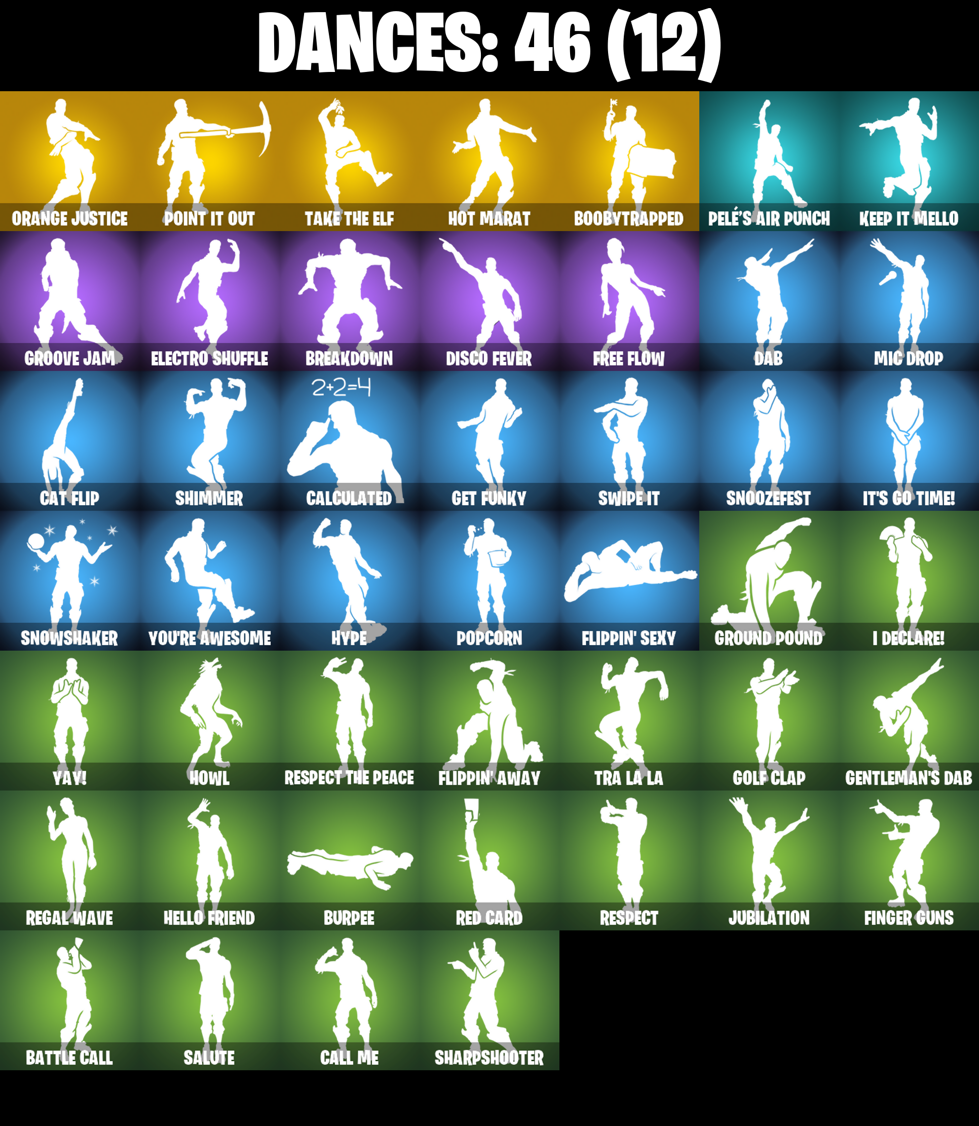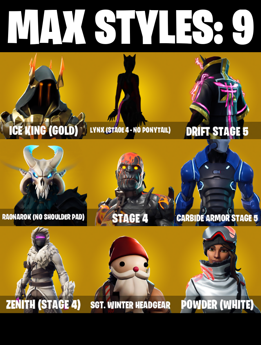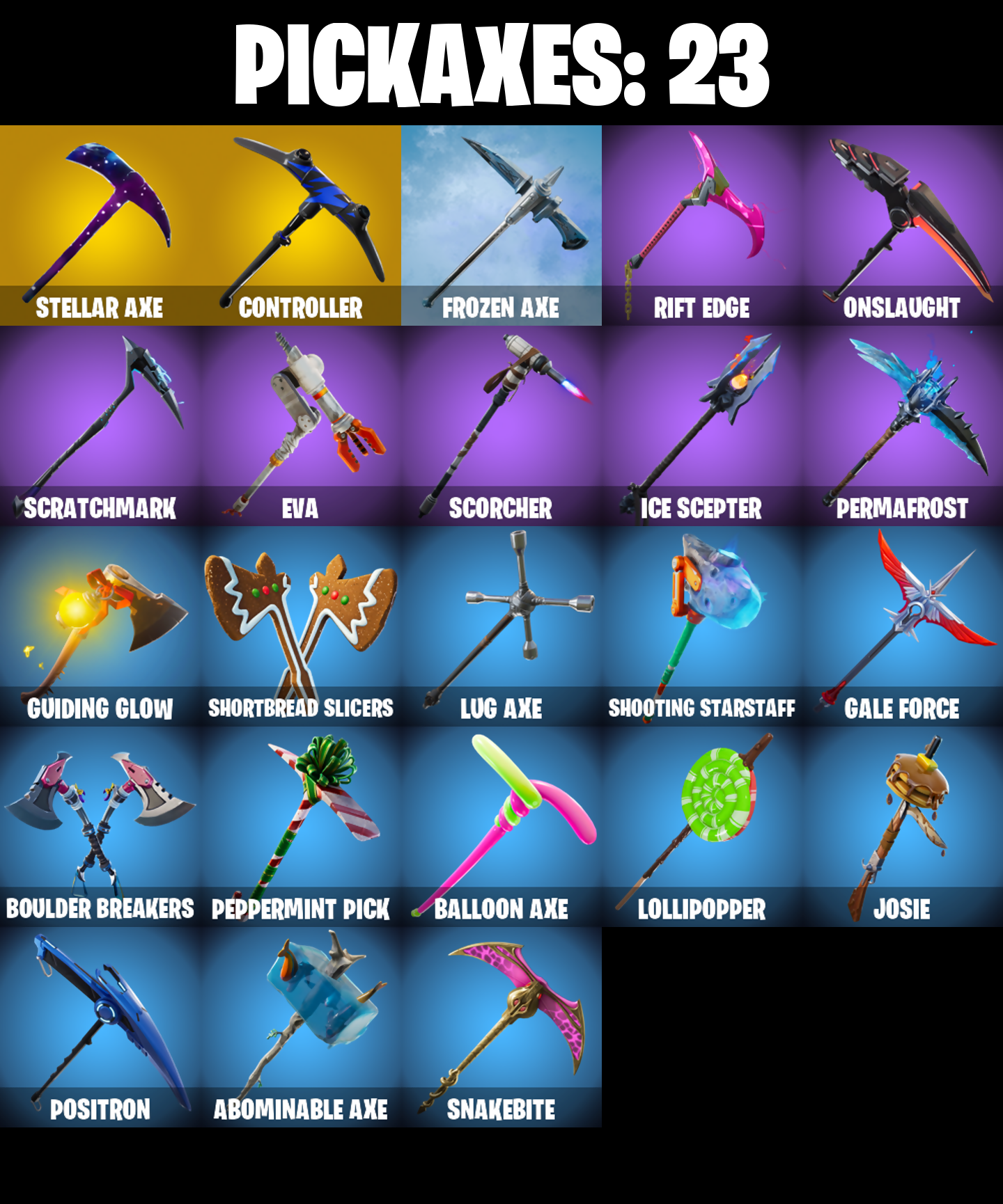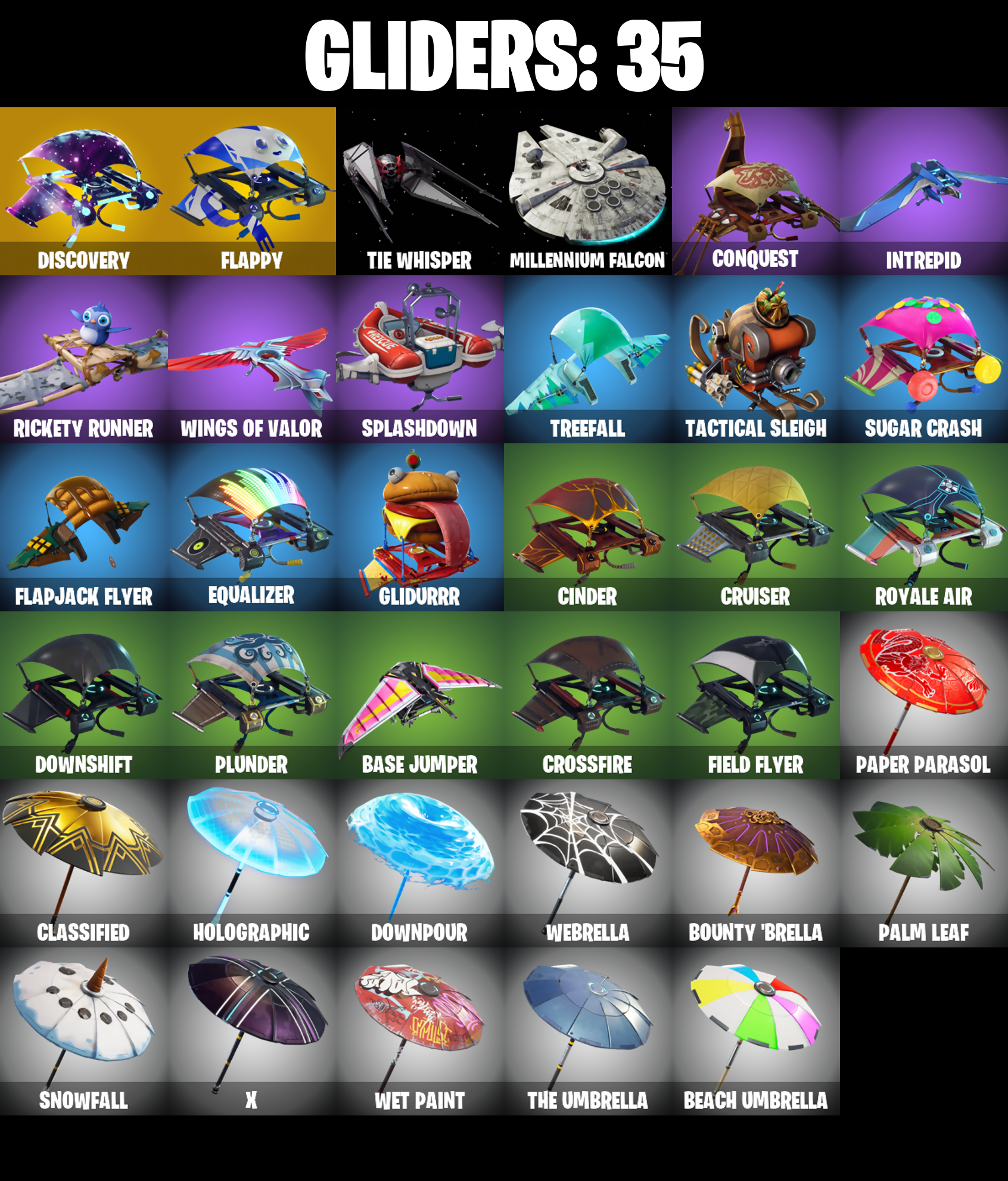 Abominable Axe, Altitude, Arroyo Pack, Balloon Axe, Base Jumper, Basecamp Bag, Battle Call, Battlehawk, Beach Umbrella, Beachcomber, Boobytrapped, Boulder Breakers, Bounty 'Brella, Breakdown, Burpee, Calculated, Call Me, Carbide, Carbide Armor Stage 5, Cat Flip, Cinder, Classified, Clawz Retro, Conquest, Controller, Crossfire, Cruiser, Dab, Disco Fever, Discovery, Downpour, Downshift, Drift, Drift Stage 5, Electro Shuffle, Enforcer, Equalizer, Eva, Fabled Cape, Field Flyer, Finger Guns, Flapjack Flyer, Flappy, Flippin' Away, Flippin' Sexy, Free Flow, Frozen Axe, Frozen Shroud, Galactic Disc, Galaxy, Gale Force, Gentleman's Dab, Get Funky, Glidurrr, Golf Clap, Goodie Bag, Groove Jam, Ground Pound, Guiding Glow, Hello Friend, Holographic, Hot Marat, Howl, Huntress, Hype, I Declare!, Ice Cube, Ice King (Gold), Ice Mantle, Ice Scepter, Intrepid, Iron Cage, It's Go Time!, Josie, Jubilation, Keep It Mello, Lil' Kev, Lollipopper, Lt. Evergreen, Lug Axe, Lynx, Lynx (Stage 4 - No Ponytail), Master Portal, Mic Drop, Millennium Falcon, Omega, Onesie, Onslaught, Orange Justice, Padlock, Palm Leaf, Paper Parasol, Pelé's Air Punch, Peppermint Pick, Perfect Present, Permafrost, Plunder, Point It Out, Pool Party, Popcorn, Positron, Powder, Powder (White), Precision, Prodigy, Ragnarok, Raonarak (No Shoulder Pad), Raven, Re-Gifter, Rearguard, Red Card, Redline, Regal Wave, Respect, Respect The Peace, Rickety Runner, Rift Edge, Rook, Royale Air, Rust Bucket, Salute, Scorcher, Scratchmark, Sgt. Winter, Sgt. Winter Headgear, Sharpshooter, Shimmer, Shooting Starstaff, Shortbread Slicers, Sledgehammer, Snakebite, Snoozefest, Snowfall, Snowshaker, Splashdown, Squad Leader, Stage 4, Standard Issue, Stellar Axe, Subjugator, Sugar Crash, Sun Strider, Swipe It, Tabulator, Tactical Sleigh, Take The Elf, Teknique, The Ice King, The Prisoner, The Sith, The Umbrella, Tie Whisper, Tra La La, Trail Tote, Treefall, Trog, Uplink, Valor, Waveform, Webrella, Wet Paint, Wings Of Valor, X, Yay!, You're Awesome, Zenith, Zenith (Stage 4), Zoey