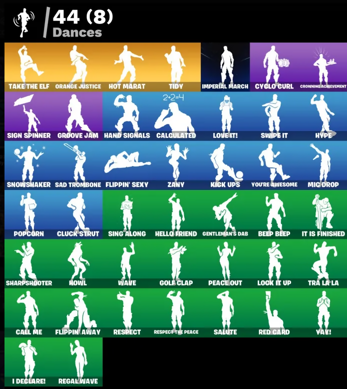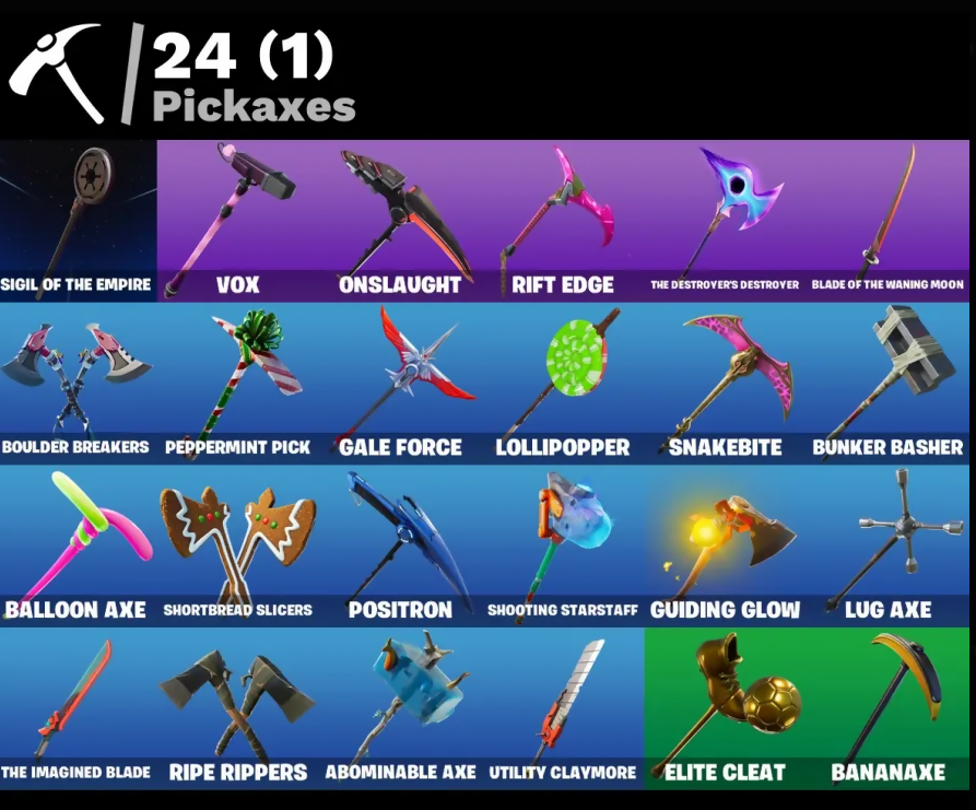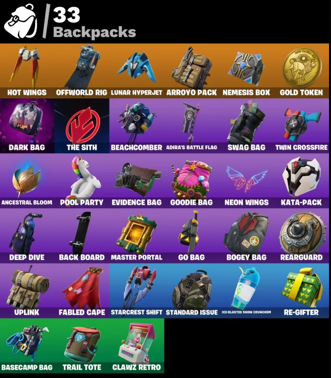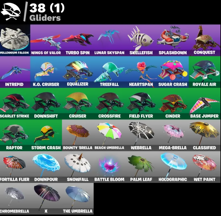 Abominable Axe, Adira's Battle Flag, Ancestral Bloom, Arroyo Pack, Back Board, Balloon Axe, Bananaxe, Base Jumper, Basecamp Bag, Battle Bloom, Battlehawk, Beach Umbrella, Beachcomber, Beep Beep, Blade Of The Waning Moon, Bogey Bag, Boulder Breakers, Bounty 'Brella, Brite Bomber, Bullseye, Bunker Basher, Bunker Jonesy, Calculated, Call Me, Carbide, Chromebrella, Cinder, Classified, Clawz Retro, Cluck Strut, Conquest, Crossfire, Crowning Achievement, Cruiser, Cyclo Curl, Dark Bag, Dark Bomber, Deep Dive, Downpour, Downshift, Drift, Elite Cleat, Equalizer, Evidence Bag, Fabled Cape, Field Flyer, Finesse Finisher, Flippin' Away, Flippin' Sexy, Fortilla Flier, Gale Force, Gentleman's Dab, Go Bag, Gold Token, Golf Clap, Goodie Bag, Groove Jam, Guiding Glow, Hand Signals, Heartspan, Hello Friend, Holographic, Hot Marat, Hot Wings, Howl, Huntress, Hype, I Declare!, Ice-Blasted Snow Cruncher, Imperial March, Intrepid, It Is Finished, K.O. Cruiser, Kata-Pack, Kick Ups, Lock It Up, Lollipopper, Love It!, Lt. Evergreen, Lug Axe, Lunar Hyperjet, Lunar Skyspan, Master Portal, Mega-Brella, Mic Drop, Millennium Falcon, Nemesis Box, Neon Wings, Offworld Rig, Omega, Onslaught, Orange Justice, Palm Leaf, Peace Out, Peppermint Pick, Pool Party, Popcorn, Positron, Raptor, Re-Gifter, Rearguard, Red Card, Redline, Regal Wave, Respect, Respect The Peace, Rift Edge, Ripe Rippers, Rox, Royale Air, Sad Trombone, Salute, Scarlet Strike, Scorpion, Sentinel, Sharpshooter, Shooting Starstaff, Shortbread Slicers, Sigil Of The Empire, Sign Spinner, Sing Along, Skellefish, Sledgehammer, Sleuth, Snakebite, Snowfall, Snowshaker, Splashdown, Squad Leader, Standard Issue, Starcrest Shift, Storm Crash, Stratus, Sugar Crash, Sun Strider, Swag Bag, Swipe It, Take The Elf, Teknique, The Ace, The Destroyer's Destroyer, The Imagined Blade, The Sith, The Umbrella, The Visitor, Tidy, Tra La La, Trail Tote, Treefall, Turbo Spin, Twin Crossfire, Uplink, Utility Claymore, Valor, Vay!, Vega, Vox, Wave, Webrella, Wet Paint, Wingman, Wings Of Valor, Wooly Warrior, X, You're Awesome, Zany, Zoey