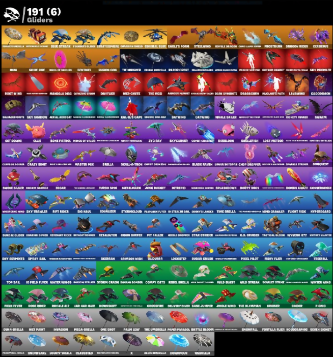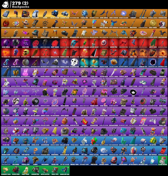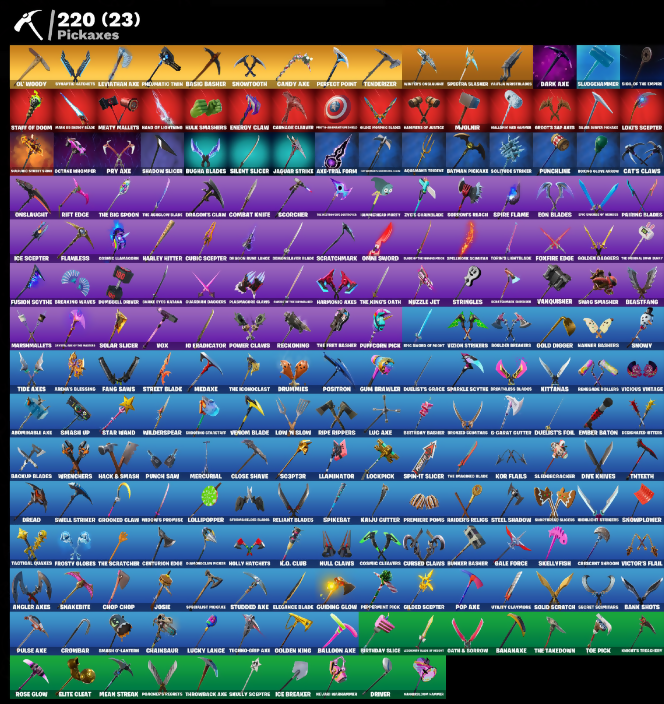 &Ovs Skinskiller, 10 Stealth Sail, 2030's Cyborg, 3D Field Flyer, 8-Ball Janky, Adarna Energy Blade, Adira, Adorn's Blessing, Adrenaline Axe, Adventure Pack, Aerial Arcshot, Aerial Elite, Aerial Treat, Agent Jones, Agent Peely, Air Shredder, Ajanx, Alley Loser, Altitude, Amber, Angler Axes, Antidote, Antonia, Aquaman, Aquaman's Trident, Arctic Ace Ram, Ark Shard Cutter, Arroyo Pack, Atmosphere, Auto Clutch, Avengers Quinjet, Awkward Club, Axe-Trail Form, Axo, Back / Pack, Back Board, Backlash, Backstab Blades, Backstabber, Bad, Ball Bling, Balloon Axe, Banana Axe, Banana Bomber, Bank Shots, Banner Cape, Base Jumper, Basecamp Bag, Basic Basher, Bat Royale, Batman Pickaxe, Battery Basher, Battle Bag, Battle Bloom, Battlehawk, Batwing, Beachcomber, Bean Bag, Beastfang, Beep Beep, Beezild Stingers, Best Dance Ever, Bhangra Boogie, Big Reaul, Big Shaman, Billy Bounce, Bion Blades, Birthday Cake, Birthday Slice, Bitter Sweets, Black Manta, Blackboard, Blackout Dag, Blade, Blade Bag, Blade Raven, Bladed Bag, Bladed Cage, Bladed Tramp, Blaze, Blazearule, Blister Pack, Blowin' Up, Blue Hexanaut Blade, Blue Shift, Blue Squire, Blue Striker, Blue Team Leader, Boba Bling, Body Bag, Bogler, Bold of the Empire, Bombs Away!, Bone Patrol, Bonny's Lancer, Boogie, Boogie Down, Boogie Patrol Season, BoomDaffy, Boomin', Bootsin' Cats, Booty Buoy, Born Runeburst, Bounty, Bounty Brella, Boxing Gloves Axe, Brain Freeze, Brasling, Bravo Leader, Breaking Point, Breaking Waves, Breakneck, Brella, Brenix, Bring It Around, Brooding Overshirt, Brownline, Brutus, Bubsloon, Bugga, Bugha Blades, Bunker Basher, Burst, Butter Robot, Buzz Pack, Cable, Cable Cloak, Calamity, Calculated, Call Me, Candy Axe, Candy Cloudcrasher, Captain America, Captain Kael, Carbon Pack, Cardistry, Cat's Claws, Catalyst, Catflip, Catwing, Centurion, Centurion Edge, Cerberus, Chain Surfer, Chainsaw, Charlotte, Chef's Special, Chicago Jules, Chiguñas, Chilly, Chimichanga!, Chitauri Chariot, Choice Knit, Chomp Sr., Chomper's Doom, Chop Chop, Chop Dropper, Chromatic Pack, Chrome-Dipped, Cinder, Cindercera, Clambox, Clank Retro, Clark Kent, Classified, Clean Sweep, Cliffside Soarer, Clifton & Badger, Close Shave, Club Guerilla, Club Llama Remix, Cluck Strut, Clutch, Coaxial Blue, Cobalt, Cobra, Combat Knife, Comet Cruiser, Comfy Cats, Commander Ramirez, Conba, Conjure Weapon, Conquest, Contrast Caller, Convergence, Corn Flip, Corvus, Cosmic Clawmas, Cosmic Llamacorn, Crack It, Cracked Orb, Crazy Eight, Crespyra, Crimson Claws, Crimson Crest, Crimson Season, Crimson Wish, Crooked Claw, Crosby Dronefish, Crossblade, Crosses Gore, Crossfire, Crowbar, Cruiser, Crystal Clean, Crystal Flame Pin, Cube Aether, Cubic Scepter, Cud, Cuddlepool, Cursed Claws, Cyclo Curl, D.U.O. Kevin, DJ Yonder, Daffy Gronkle, Dagger Dance, Dahan Cabana, Damage, Damaran Shield, Danny Vs. Slushy, Daria, Dark Axe, Dark Eyes Katana, Dark Jonesy, Dark Phoenix, Dark Red Card, Dark Shield, Dark Wings, Darkshroom Defender, Darn Symbiote, Darth Vader, Dawn's Theme, Day Bad, Dayflyer, Daywalker's Kata, Deadpool, Deadpool's Katana, Death & Sorrow, Death Valley, Deep Dive, Delivery Driver, Deluxe Streak, Dessie, Destabilizer, Diamond Diva, Diamond Throne, Dice Roll, Diffused Driver, Dime Knives, Dimensional Cape, Dino Deck, Disco Fever/Wonderland, Disguised Esters, Distributor, Divino Light, Do The Split, Doctor Doom, Doctor Slone, Doctor Strange, Dodo, Doggie Bag, Dohkos, Dolsey D'Tangle, Domo Pack, Doom Chalice, Doom's Doom, Double Header, Downpour, Downshift, Dozeoab, Draftless Blades, Drag Stand, Dragon Daggers, Dragon Dragon KTM, Dragon Rider, Dragon Stance, Dragon's Claw, Dragoncrest, Dragonform, Dread, Dreamer, Drift, Driver, Droop, Drumines, Duelist's Grace, Duelist's Toss, Dummy, Dunk On 'Em, Dusk Reneg, Dust Bucket, Dynamo Duelist, Eagle's Fogn, Edgar, Elegance Blade, Elite Cleat, Ella, Ember Baton, Energy Cella, Equalizer, Eternal Shield, Exolias Scroll, Expedition Bar, Expressionism, Extraspacer, FDR Armor, Faided Cape, Fang Saws, Featherweight, Felipe FDR, Field Flyer, Fierce, Fiery Jam, Final Maelstrom, Firestarter, First Order, Fish Taco, Fishstick Boombox, Fishy Flier, Fixer, Flaky Feast, Flamenco, Flare, Flashing Crossbones, Flawless, Flight Risk, Flippin' Away, Foil Flex, Fonfire Edge, Forest Shadow, Fortilla Flier, Founder's Glow, Fox Scorpion & Raccoon, Fox Winterized, Foxborn Guard, Fozzie, Fractured World, Free Flow, Freestyle, Frost Squad, Frostburn, Frosty Globes, Frozen Lilies, Full Moon, Fusion, Fusion Coil, Fusion Orb, Fusion Scythe, Futuristic Headband, Gado Demon, Galactic Pack, Galaxia, Galaxity, Gale Force, Gallant Gear, Game Day Salute, Gameplan, Gasp, Gathering Storm, Gentleman's Dab, Get Downie, Get Funky, Giddy-Up, Glimmer's Talon, Glitchbag, Go Bag, Gold Butters, Gold Digger, Gold Kratos, Gold Medals, Gold Sector, Gold Tinha, Gold Token, Goldburr, Golden Daggers, Golden Gambit, Golden King, Golf Clap, Good Buy, Goodie Bag, Grand Guard Saber, Grand Salute, Grave Feaster, Green Arrow, Grimmy Sack, Grind, Groot, Groove Jam, Ground Pound, Guard Pup, Guiding Claw, Gumbo, Gun Brawler, Gunbar, Gyroderv Salute, HQ Organizer, Haar-Haar-Haar!, Hack & Smash, Halloweye, Hand-Forged, Handy Lane, Harley Hunter, Harmonic Axes, Harold, Harvey Guava-M, Hatter Wings, Have A Seat, Haven, Havoc's Promise, Hell Pistol, Hello Friend, Hera'hand Salute, Herald's Star, Hexath, Hexaxe, High Caliber, High Five, High Society Clucker, Hittanas, Hold On, Hollow Charger, Holly Hatchets, Holographic, Hooked Cutlass, Hoop Master, Hootenanny Halo, Hope, Horo's Toolkit, Hot Marat, Hot Wings, House Party, Hula Hoopin', Hulk Smashers, Hunter's Trophy, Huntress, Hvpe, Hybrid, Hymera, Hyper Class Scout, Hyper Parasol, Hyperboard, Hypnoteyes, I Declare!, I'm A Mystery, I.C.O. Club, Ice Breaker, Ice Cube, Ice Mantle, Ice Scepter, Ice's Up Crew Ski, Ignition, Illuminator, Imperial March, Infinite Bloom, Inkly, Inky Calamores, Intrepid, Invasion, Io Eradicator, Iris, Ironclad, Isabelle, It I