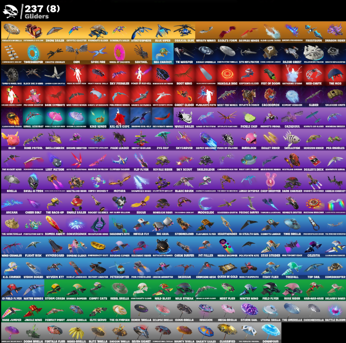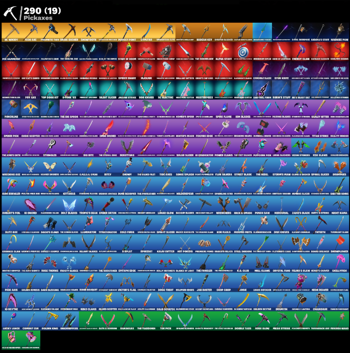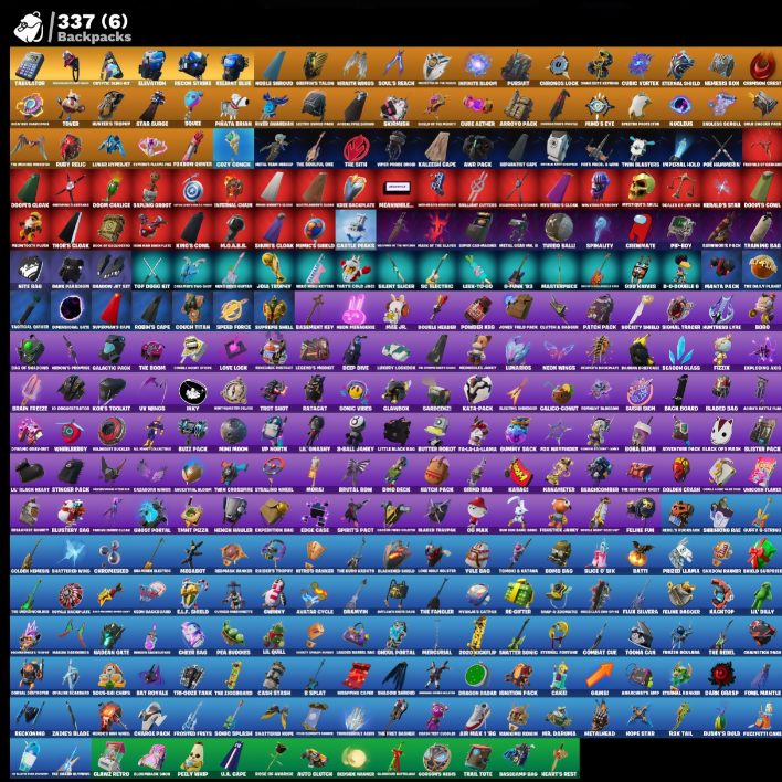 1-Ball, 10 Grabinator, 10 Stealth Sail, 150, 2020 Kickflip, 50 Field Flyer, 9-Ball Jamzy, 90 Square, Abster's Bag, Adira, Adventure Aerials, Adventurer Pack, Agent Jones, Agent Peely, Ahab's Trident, Air Max 1 '98, Alpha Staff, Alte Shredder, Alto, Amaryllis / Amary, Amphibian, Ancient Clawlars, Antonia, Aphrodite, Apothecary Supply, Apprentice Ivo, Appropriations, Aquaman, Ara, Arcadium Flyer, Arcadoof, Arcana, Arctic Eagle, Armored Side-Arm, Arrow Pack, Artemis, Artful, Ash, Ashoka Tano, Assassin, Auto Glitch, Avatar Cycle, Avatar’s Drum, Awakens My Head, B-Splat, Bach's Soni, Back of Bags, Back to Board Park, Badban Key, Balance Board, Bam Bam Boom, Banana Bomber, Bardin6 Wayfarer, Barrel Break, Base Jumper, Basement Key, Basic Dasher, Bat Royale, Batscat Rider, Battle Blessings, Battle Bloom, Batty, Baymax Wings, Beachcomboer, Beacon Glass, Bean Bag, Bear Hug, Beast Boy, Beastfang, Beatdown, Beatz Bomb, Beep Beep, Bersark Umbrella, Bersark or Dead, Berserker Axes, Betsy, Big Bite, Big Dill, Big Haul, Big Spring Checkpoint, Bionic, Bird Lady Ouija, Birthday Gun, Bitey, Bitty Raider, Black Manta, Black One 45, Black Panther, Blade Raven, Bladed Bag, Blades of Light, Blazemey Blade, Blaziken Shed, Blister Pack, Blitz Axe, Blitz Brella, Blizzard Team Leader, Bloblobber, Blown Up, Blue Poshtick, Blue Viper, Bluestuy Bag, Boba Bling, Bobo, Bodega & Felicity, Body Snack, Boink Splash, Bolt Blades, Bomb Bag, Bomb Bouquet, Bombs Away!, Bonde Do Dragao, Bone Breaker, Bone Concubines, Bone Patrol, Boomin’, Boots N’ Cats, Boots N’ Chick, Born Born, Bounty Brella, Bourgeois Kid, Brain Freeze, Breathless Blades, Brella, Brief Moves, Brilliant Cutters, Broken Ice Staff, Bros Of A Fatter, Brutal Bom, Bubblioon, Bullet Rider, Bump Me Up, Burnblaze Pack, Butter Robot, Buzz Pack, Buzzsaw Bracer, Bytes, Cacodemon, Cakes, Call Me, Called Shot, Canadian Wings, Captain Claw, Captain Jones, Captain Marvel, Captain Phasma, Carbine Cleaver, Cardistry, Carnage, Cash Stash, Celcic, Celestia, Ceramic Hammer, Cerberus, Chain Surfer, Chainsaur, Chalkberry Buckler, Chaotic Cavalier, Charge Pack, Charlotte, Chazboba, Cheer Bolt, Chef’s Special, Cherry Bag, Chimera Brella, Chop Chop, Chop Dropper, Chopsknit, Christmas, Chrome Punk, Chronobreak Fae, Chronos Lock, Chronosled, Chun-Li, Clamps Glider, Clark Kent, Classified, Clean Sweep, Cliffsid Slayer, Clinton & Danger, Cloud Striker, Cobra Knives, Cold Fusion, Coldrain Chill, Colonel Quvous, Colony Assailant, Colossa Nostromo, Comanche, Combat Cue, Combocopter, Come Flap, Comet Grasher, Comfy Cats, Company Jig, Conga Call, Contract Killer, Convergence, Cosmic Cleavers, Count It, Courage, Cowboy, Cozy Gnome, Crack It, Crackle Blade, Crimson Cape, Crimson Clawclaws, Crimson Crest, Crimson Wish, Crooked Claw, Crossbart Sabon, Crypto-Funk 5000, Crystal Fang, Cube Aether, Cubic Vortex, Curlin’ Iron, Cycloholic, Cyclone Coaster, D-Double G, D.J., DJ Yonder, Daddy's Claws, Dagger Dance, Dance Gun, Dance Off, Dark Blessing, Dark Charger, Dark Light, Dark Paragon, Dark Symbiote, Darklight, Darth Vader, Dawn Grasp, Deadly Darts, Deadpool, Dealer's Deck, Death Star Stella, Death's Masonry, Deep Dive, Delivery Diver, Desire Hammer, Diamond Hanzo, Diamond Throne, Dice Roll, Dilly Dilly It, Dimensional Gym, Dino Deck, Diplomates, Discord, Dive Knives, Divide & Conquer, Do The Split, Doakal Blue, Doctor Doom, Doctor Strange, Dogge Treat, Don’t Sobbin’, Doom, Doom Brella, Doom Cloak, Doom Slayer, Doom's Cloak, Doom's Coak, Doomal Cracker, Dot's Coverup, Double Guanj, Double Header, Double Up, Doubleswipe, Douch Titan, Downpour, Doze Dab, Draco, Dragon Radar, Dragon Rider, Dragonfaxes, Dramatic Flares, Drazyn, Dreamspasm Bag, Drinking Skins, Drippin’ Flavor, Drone Drifter, Drops Die, Drraymis, Duelist’s Foil, Dumpling Sufficient, Dune Scooper, Duplicator, Durrr Talsao, Dusey's Dual, Dynamic Shuffle, Dynamo Titan, Eagle's Form, Eat It Or Beat It, Echo Knives, Eclipse Brella, Eclipsed Edges, Econo Backpack, Edgar, Edge Case, Elevation, Elf. Shield, Elite Servo, Ember Baton, Ember Pick, Emergency Raft, Emma Frost, Emotional Interjection, Enchanted Umbrella, Endless Scroll, Energy Claw, Entranced, Eono Knives, Epic Waves, Era, Esports Carry, Eternal Knight, Eternal Shield, Eve, Excess Expression, Expedition Bag, Exploding Acid, Fade, Faded Braves, Fall, Feel The Floor, Feline & Claw, Feline Dagger, Felix Fun, Field Flyer, Fin's Rising Wings, Fire’s Down, Fish Taco, Fishing Rod, Fishy Flier, Fist Bump, Fist of Doom, Fixer, Fizzix, Flaky Feast, Flameannouncer, Flamingo Flyer, Fletcher Kane, Fletchery's Claw, Flight Risk, Flip Flyer, Flippin’ Away, Flux Slayer, Flux Slicer, Foe Dameon, Foil Flex, Follow The Butterfly, Fondue 53, Footloose, Force Lightning, Fornel Mantlue, Fortilla Flier, Forum Worker Ladles, Founder's Glider, Foxfire Edge, Free Ranging, Frontier's Grasp, Frost Specialist, Frost Squad, Frostburn, Frosted Fangs, Frosted Freys, Frostfang's Claw, Frostfire, Frostshot, Frosty Clovers, Frozen, Frozen Goblin, Frozen Nog Ops, Fukka Scarabio, G-Hollows, GR33Z, Gabon’s World, Galactic Pack, Galaxi, Galaxy Scout, Galico-Count, Gamebo, Ganks, Gardencut, Gathering Storm, Geospero, Geralt Of Rivia, Get Groovy, Ghost Glider, Ghost Power, Ghost Rider, Ghost Suppressors, Ghost Trooper, Ginga Gigga, Give Me A Mic, Glanbow, Glare Retro, Glide Scepter, Glow of the Solstice, Goat-C-Ulture, Goff Gatch Gundaz, Goku Black, Gold Brutus, Gold Midas, Gold of the Empire, Golden Crash, Golden Nemesis, Golden Scythe, Golf Clap, Good Guy, Goopy Drones-Y, Gorgons Reds, Goss Gobsneal Boy, Grave, Green Arrow, Greenlining, Griffin's Talon, Grind Bag, Grizzly Cooper, Groot, Groove Adrenaline, Groove's Claw Axes, Grrag Greegton, Guggimon, Gum Brawler, Gummy Sack, Gunnar, Guns-Brella, Gyrostars, Gythar, Hack & Smash, Hades, Hand-Forced, Harden Chariot, Harley Quinn, Harlowe, Hassai, Haven, Havy, Hawaiian Dry Fender, Hayley Skye, Headhunter's Karma, Headstop, Heart Sign, Heart's Rest, He