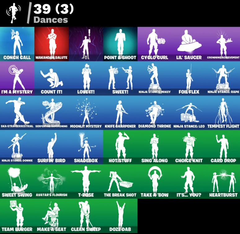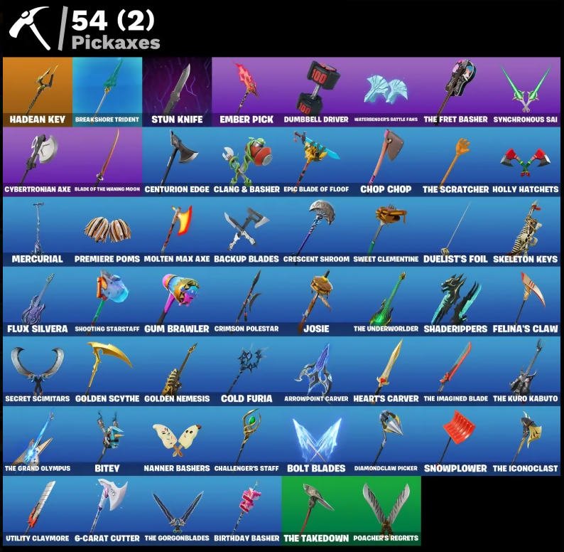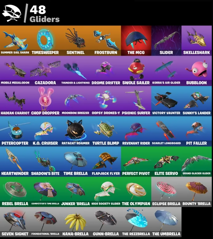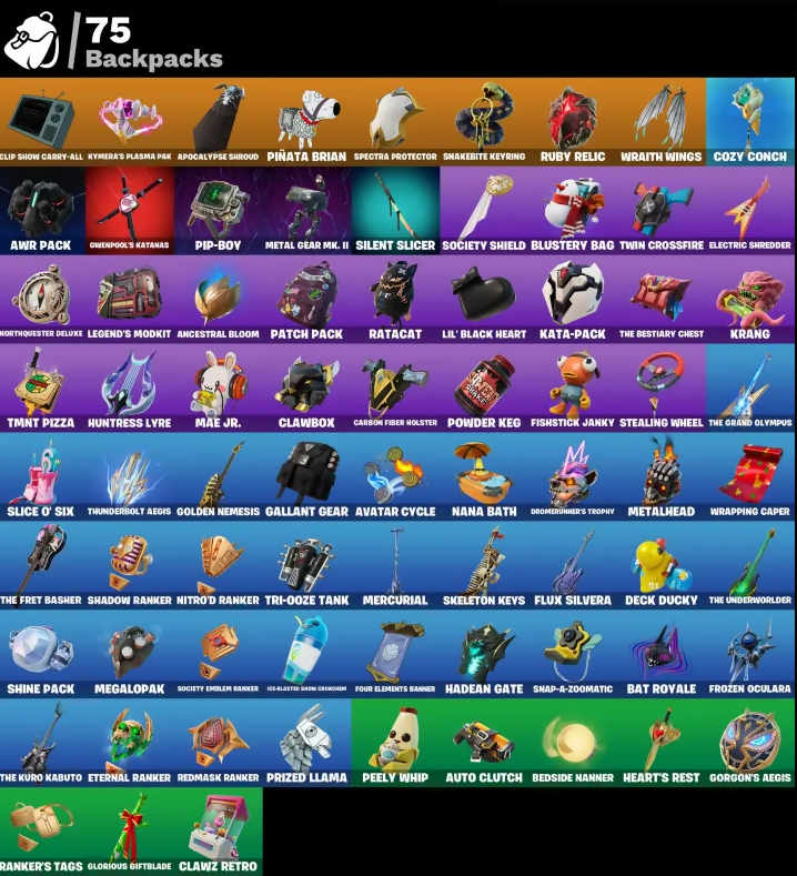 6-Carat Cutter, AWR Pack, Ancestral Bloom, Aphrodite, Apocalypse Shroud, Arrowpoint Carver, Artemis, Auto Clutch, Avatar Cycle, Avatar's Flourish, Backlash, Backup Blades, Bat Royale, Bedside Nanner, Birthday Basher, Bitey, Blade Of The Waning Moon, Blustery Bag, Bolt Blades, Bounty 'Brella, Breakshore Trident, Bubloon, Carbon Fiber Holster, Card Drop, Cazadora, Centurion, Centurion Edge, Cerberus, Challenger's Staff, Choice Knit, Chop Chop, Chop Dropper, Clang & Basher, Clawbox, Clawz Retro, Clean Sweep, Cold Furia, Competitor's Time Brella, Conch Call, Count It!, Cozy Conch, Crescent Shroom, Crimson Polestar, Cybertronian Axe, Cyclo Curl, Deck Ducky, Diamond Diva, Diamond Throne, Diamondclaw Picker, Doze Dab, Drome Drifter, Dromerunner's Trophy, Duelist's Foil, Dumbbell Driver, Eclipse Brella, Electric Shredder, Elite Servo, Ember Pick, Epic Blade Of Floof, Eternal Ranker, Felina, Felina's Claw, Fishstick Janky, Flapjack Flyer, Flux Silvera, Foil Flex, Foundational 'Brella, Four Elements Banner, Frostburn, Frozen Oculara, Gallant Gear, Glorious Giftblade, Golden Nemesis, Golden Scythe, Gorgon's Aegis, Grand Glacier Glider, Gum Brawler, Gunn-Brella, Gwenpool's Katanas, Hadean Chariot, Hadean Gate, Hadean Key, Hades, Heart's Rest, Heartburst, Hearts Carver, Heartwinder, High Society Glider, Holiday Boxy, Holly Hatchets, Hope, Hot Stuff, Huntress Lyre, I'm A Mystery, Ice-Blasted Snow Cruncher, It's... You?, Josie, Junker 'Brella, K.O. Cruiser, Kata-Pack, Knife Sharpener, Korra, Korra's Air Glider, Krang, Krisabelle, Kymera, Kymera's Plasma Pak, Legend's Modkit, Lil' Black Heart, Lil' Saucer, Love It!, Mae Jr., Make A Seat, Medusa, Megalopak, Mercurial, Metal Gear Mk. II, Metalhead, Mobile Megalodon, Molten Max Axe, Montague, Moonbow Breezer, Moonlit Mystery, Nana Bath, Nana-Brella, Nanner Bashers, Ninja Stance: Donnie, Ninja Stance: Leo, Ninja Stance: Mikey, Ninja Stance: Raph, Nisha, Nitro'd Ranker, Northquester Deluxe, Oopsy Drones-V, Oscar, Patch Pack, Peely Whip, Perfect Pivot, Peter Griffin, Petercopter, Pinata Brian, Pip-Boy, Pit Faller, Poacher's Regrets, Point & Shoot, Polar Peely, Poseidon, Powder Keg, Premiere Poms, Prized Llama, Psionic Surfer, Ranker's Tags, Ratacat, Ratacat Roamer, Rebel Brella, Redmask Ranker, Revenant Rider, Ruby Relic, Runway Racer, Scarlet Longboard, Secret Scmitars, Sentinel, Serpentine Summoning, Seven Signet, Shadebox, Shaderippers, Shadow Ranker, Shadow's Bite, Shine Pack, Shooting Starstaff, Silent Slicer, Sing Along, Ska-Stra-Terrestrial, Skeleton Keys, Skelleshark, Slice O' Six, Slider, Snakebite Keyring, Snap-A-Zoomatic, Snowplower, Society Emblem Ranker, Society Shield, Soldado Colorado, Solid Snake, Spectra Protector, Stealing Wheel, Stun Knife, Summer Sail Shark, Sunny, Sunny's Lander, Surfin' Bird, Sweet Clementine, Sweet Swing, Sweet!, Swole Sailer, Synchronous Sai, T-Pose, TMNT Pizza, Take A 'Bow, Team Burger, Tempest Flight, The Bestiary Chest, The Break Shot, The Fret Basher, The Gorgonblades, The Grand Olympus, The Iconoclast, The Imagined Blade, The Kuro Kabuto, The Mcg, The Olympian, The Rezzbrella, The Scratcher, The Takedown, The Umbrella, The Underworlder, Thunder & Lightning, Thunderbolt Aegis, Time Brella, Timesweeper, Tri-Ooze Tank, Turtle Blimp, Twin Crossfire, Underworld Desdemona, Utility Claymore, Valeria, Vengeance Jones, Victory Vaunter, Wakandan Salute, Waterbender's Battle Fans, Winterfest Bushranger, Wraith Wings, Wrapping Caper, Zeus
