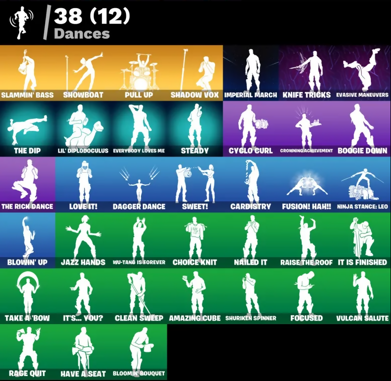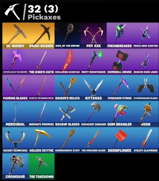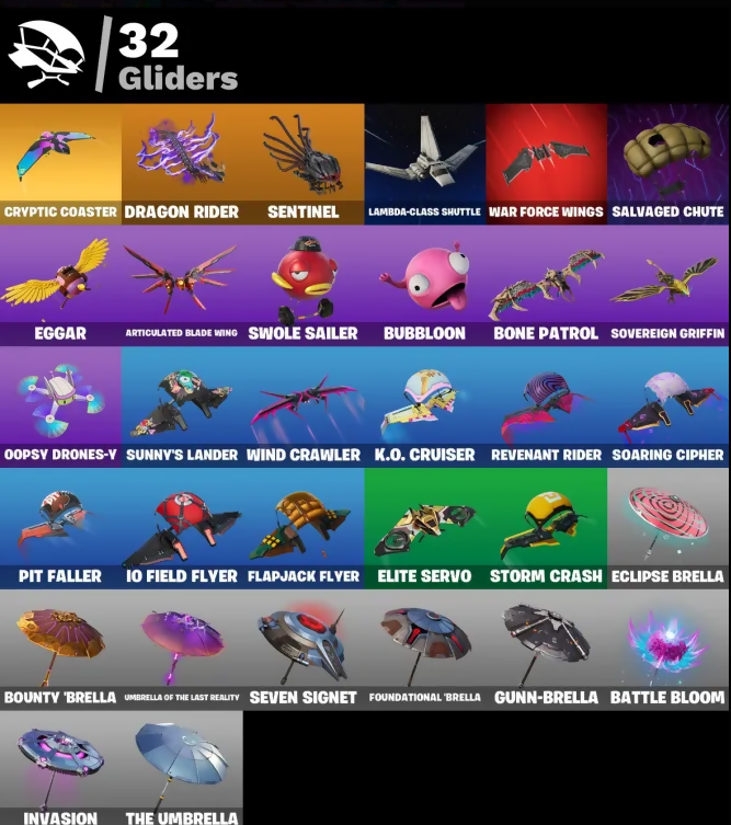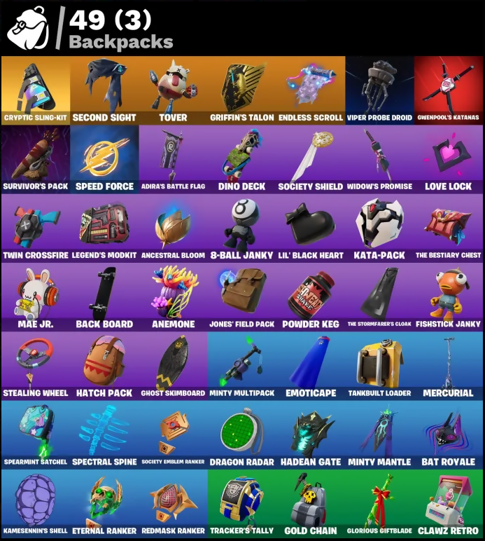 8-Ball Janky, Adira, Adira's Battle Flag, Agent Jones, Amazing Cube, Ancestral Bloom, Anemone, Articulated Blade Wing, Aspen, Back Board, Backup Blades, Basic Basher, Bat Royale, Battle Bloom, Blade of the Waning Moon, Bloomin' Bouquet, Blowin' Up, Bone Patrol, Boogie Down, Bounty 'Brella, Bubloon, Cardistry, Chainsaur, Choice Knit, Clawz Retro, Clean Sweep, Cluck, Crescent Shroom, Crowning Achievement, Cryptic, Cryptic Coaster, Cryptic Sling-Kit, Crystal Axe of the Masters, Cyclo Curl, Dagger Dance, Darth Vader, Deadeye, Dino Deck, Dragon Radar, Dragon Rider, Dragon Rune Lance, Dumbbell Driver, Eclipse Brella, Eggar, Elite Servo, Emmy Elite, Emoticape, Endless Scroll, Eternal Ranker, Evasive Maneuvers, Everybody Loves Me, Evie, Fishstick Janky, Flapjack Flyer, Focused, Forsaken Strike, Foundational 'Brella, Fresh Aura, Freshbreaker, Fusion! Hah!!, Ghost Skimboard, Glorious Giftblade, Gold Chain, Golden Scythe, Griffin's Talon, Gum Brawler, Gunn-Brella, Gwenpool's Katanas, Hadean Gate, Hatch Pack, Have A Seat, Holiday Boxy, IO Field Flyer, Imperial March, Invasion, It Is Finished, It's... You?, Jazz Hands, Jones' Field Pack, Josie, K.O. Cruiser, Kamesennin's Shell, Kamesennin's Staff, Kata-Pack, Kittanas, Knife Tricks, Lambda-Class Shuttle, Lara Croft, Legend's Modkit, Lil' Black Heart, Lil' Diplodoculus, Love It!, Love Lock, Machinist Mina, Mae Jr., Malik, Mercurial, Midsummer Midas, Minty Bomber, Minty Mantle, Minty Mountaineer, Minty Multipack, Nailed It, Ninja Stance: Leo, Ol' Woody, Oopsy Drones-V, Pairing Blades, Pit Faller, Polar Peely, Polarity, Powder Keg, Pry Axe, Pull Up, Rage Quit, Raider's Relics, Raise The Roof, Raz, Rebirth Harley Quinn, Red Jade, Redmask Ranker, Revenant Rider, Sabina, Salvaged Chute, Second Sight, Secret Scimitars, Sentinel, Seven Signet, Shadow Vox, Showboat, Shuriken Spinner, Sigil of the Empire, Skellemint Oro, Slammin' Bass, Snap, Snowplower, Soaring Cipher, Society Emblem Ranker, Society Shield, Sovereign Griffin, Spearmint Satchel, Spectral Spine, Speed Force, Spellwork Scimitar, Starfish, Steady, Stealing Wheel, Storm Crash, Stormfarer, Stormshielder Blades, Subzero Cryptic, Sunny's Lander, Survivor's Pack, Sweet!, Swole Sailer, Take A 'Bow, Tankbuilt Loader, Tarana, The Bestiary Chest, The Dip, The Flash, The Imagined Blade, The King's Oath, The Rick Dance, The Stormfarer's Cloak, The Takedown, The Umbrella, Tover, Tracker's Tally, Triple Mint Scepter, Twin Crossfire, Umbrella Of The Last Reality, Utility Claymore, Viper Probe Droid, Vulcan Salute, War Force Wings, Widow's Promise, Wind Crawler, Wu-Tang Is Forever