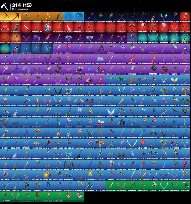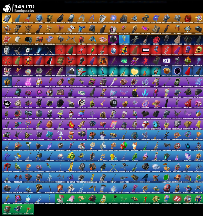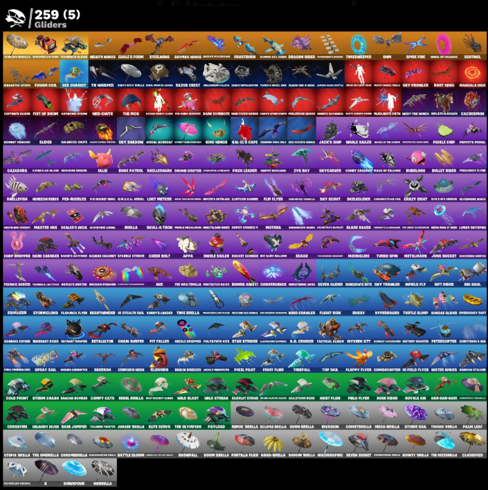 'Armer Pick, (Saints), 10 Stealth Sail, 100 Thief Lagar, 3-Day of the Event, 3020 XPickup, 90mm Wives, Absolve, Access Core, Ace of Spades, Activated Uplink, Adira, Adventure Animal, Adventure Pack, Aerial Acrobat, Agent Hunter, Agent Jones, Agent Polly, Agitated Octowisp, Airboat Emblem, Alpha Trophy, Altitude, Ambidote, Andy Counter, Annihilated, Antlers Fourism, Antonia, Apex Predator, Aphrodite, Appa, Aquaman, Archidancetoss, Archmage, Arrow'd Pack, Arrow's Quill, Artemis, Artifact Axe, Assassin Fox, Astralis Commit, Atmosphere, Atomic Drifter Glider, Auto Clutch, Avatar, Avila Wienk, B-Ball Jammy, B-Splat, Back Board, Backstabber, Backtracker, Bad Fan, Bader's Majesty, Balance Board, Baldwin (MK1), Ball Bomb, Ballin Bomb, Bamboo Pretzel, Bane Zero Dark X, Base Jumper, Basecamp Map, Basic Basher, Battle Bloom, Battle Builder, Battle Raider, Battle-Hardened, Baymax Wings, Beach Breezer, Beachcomber, Beacon Glass, Bean Bag, Beatzbunny, Bed Bed, Beekie, Bell's Scarf, Beta, Bettor's Ride, Big Bill, Big Haul, Bing, Black Foxy, Blackened Yellow, Blackheart, Blackout Bag, Blade Bag, Blade One-X Wing, Blade Raven, Blanka, Blaze Axe, Blinded Lights, Blizzersmile, Blood Hawk Wings, Blown Up, Blue Arc Glider EX, Blurg, Blustery Bag, Boba Bling, Bobo, Boiboi, Bolt Blades, Bomber's Pack, Bombs Away!, Bon Blades, Bone Breaker, Bone Crusher, Bone Patrol, Boney, Boogie Break Bucc, Boogie Down, Boogin, Boom Shock, Boomrabbit, Boosting Em' O, Boots N' Cats, Bounty Brella, Bow Go, Brambles Blast, Breakneck, Brella, Brie, Brief Moves, Briella, Brite Board, Brock, Bubble Llama, Bubloon, Bugsy, Bullet Rider, Bunker Jonesy, Bushwalker, Butter Robot, Buzz Axe, Buzz Pack, Bye Bye Bye, Bytes, Cacodemon, Calico-Coconut, Caliko, Call Me, Called Shot, Cammy, Camno Radsson, Camo Carrier, Canola As Areal, Canyon Step, Captain Jones, Captain's Glider, Carbohydry, Card Drop, Carnage, Cassidy Quinn, Catflip, Cauldron Chill, Cazadora, Celery Raise, Cerberus, Chain Surfer, Chainbreaker, Chainsaw, Chainsawer, Chaos Sharpen, Charge Pack, Charlotte, Charms Challenge, Cheer Bag, Cheer Bolt, Chef's Special, Chipping Sputter, Chiron's Look, Choceyholt, Chomp Claws, Chompe Chunk, Chop Dropper, Chromibrella, Chrono-Buss, Chun-Li, Circuit Slicer, Clank & Blagar, Clank Retro, Clark Kent, Classified, Clavic Vortex, Clawbox, Clean Sheet, Cliffside Soarer, Cluck, Cluck Strut, Clueless Dribboss, Clutch and Dodge, Cobalt, Cobra, Coffey Drones, Cold Front, Cole, Combat Crimson, Come Up, Comet Crashin', Cometbrella, Comfy Cats, Commander Roan, Companion's Honor, Conch Call, Conjure Weapon, Contract Caller, Convergence, Coraline's Foxy, Corruption Blade, Count It!, Court Of Conqueror, Cozy Couch, Crash Star, Crazy Eight, Crimson Crest, Crimson Sai, Crimson X Wish, Crossfire, Crowbar Downpacked, Crows Stonethorn, Crunchilicious, Crystal Fang, Cube Armor, Cuppa Joe, Curioso, Curling Iron, Cyclovolour, Daft End, Dagger Dance, Dagger Fang, Dagger Thrasher, Daigo, Dancer Of Light, Dancing Stance, Dapper Up, Dardeditz, Daredevil's Cape, Dark Pack, Dark Scavenger, Dark Voyager, Darkness Geist, Darn Charger, Darvel Decon, Davis & Claws, Dawn Synerbyte, Deadeye, Deadpool, Dealer's Deck, Death Ray's Skull, Deathfang, Decky Ducky, Dedo Edge, Deep D-Tron, Deep Dive, Delirium, Delivery Diver, Demon Crest, Diamond Diva, Diamond Throne, Dice Roll, Dimethyl Flares, Dipo Raeg, Diretthalkar, Disasssemble, Do The Split, Doctor Clove, Doctor Doom, Doctor Strange, Dogger Johnny, Domeca, Doom, Doom Brella, Doom Chalice, Doom Slayer, Doom's Cloak, Doorstormin, Doplimates, Downpour, Doze Off, Dragon Corset, Dragon Radar, Dragon Rider, Dragonfly, Dralo & Sandleback, Drawn, Drome Drifter, Droop, Drumlines, Drums of Chaos, Dual Katana's, Duneer Basher, Duphl Kate, Dusty, EVA, Eagle's Force, Eagle's Talon, Early Roamer, Eclipse Brella, Edge of Armada, Eggar, Elite Servo, Elite's Hog-Raider, Ema Frost, Emergency Raft, Endless Scroll, Engineforge Mind, Envy and Jasmine, Epidemic Skull, Equalizer, Equinox Helix, Era, Erazer, Ersa, Eternal Crown, Eternal Edge, Eternal Shield, Eve, Everything's Ok, Evil Spade, Expedition Bag, Explosive Jones, Extra Clutch, Extra Round, Fabled Cape, Fang Dance, Fang Saws, Featherweight, Feel The Force, Felina, Feline Fur, Fenris' Clawos, Field Flyer, Fiery Jam, Fire Rocket Wings, Fire's Foul, Firewok Ca-Guy, First Rider, Fish Taco, Fishy Flier, Fist Bump, Fist Of Doom, Flame Bat, Flamework Archer, Flamjack Flyer, Flamy Feast, Flapping Aussie, Flappy Flyer, Fletcher Kane, Flight Risk, Flip Flyer, Flippin' Away, Flurry Silvera, Flux Silfera, Foe Hammer, Force Lightning, Fortilla Flier, Founders Glider, Founders Umbrella, Fowl Mantle, Fox Patterned, Fox Trooper, Foxflex, Freeze'n Point, Frenetic Mystery Spin, Frequency Flyer, Frostburn, Frostbyte, Frosted Fangs, Frosty's Claws, Funiless Victory, Fusion, Fusion Coil, Fusion Orb, Galactic Headset, Galactic Pack, Gale, Gamerish Spinner, Gamesplan, Ganbatte, Gangnam Style, Gashame Rosso, Gathering Storm, Georgia Olivia, Geralt of Rivia, Get Funky, Ghost Portal, Gladiator Wings, Glass Eye Cover, Glowwra, Go Bag, Goal Clap, Gold Brutus, Gold Knight, Gold Midas, Golden Flames, Golden Mandora, Good Guy, Good Ole Pete, Goose, Gorss, Grac It, Gracious, Grand Bag, Gravedigger Ghoul, Graveheart, Green Armory, Grimpet's Colossus, Groot, Ground Smash, Guigigom, Gumball Gun, Gummy Sack, Gunn-Brella, Gunnar, H.A. Cruiser, Hag-Mag-Haggi, Haku, Hallstorm Rider, Hand It, Handsome Claw, Harametsu's End, Hard Forged, Haroldine, Harpoga, Have A Seat, Havoc, Hayley Skye, Haz Launcher, Hazel, Hazmat Key Men, Headboat, Heart Cloud, Heart Song, Heart's Rest, Heartburst, Heartwinder, Heist Flier, Hellfire Dance, Hellfire Mineposse, Hench Hauler, Henchman, Hex Cutters, Hey Mom!, Himot, HoldoRAPHIC, Holiday Rock, Holly Mighty's Blades of Light, Hombanaut 2099, Honoto Rider, Hope, Hope Star, Hot Royale, Hot Stuff Balloon, Hot Wings, Hula Stance LOL, Hungan's Garb, Hunter's Love, Hunting Order, Hydro Moves, Hyperboard, 
