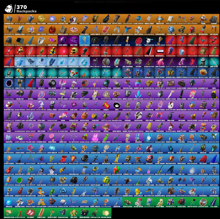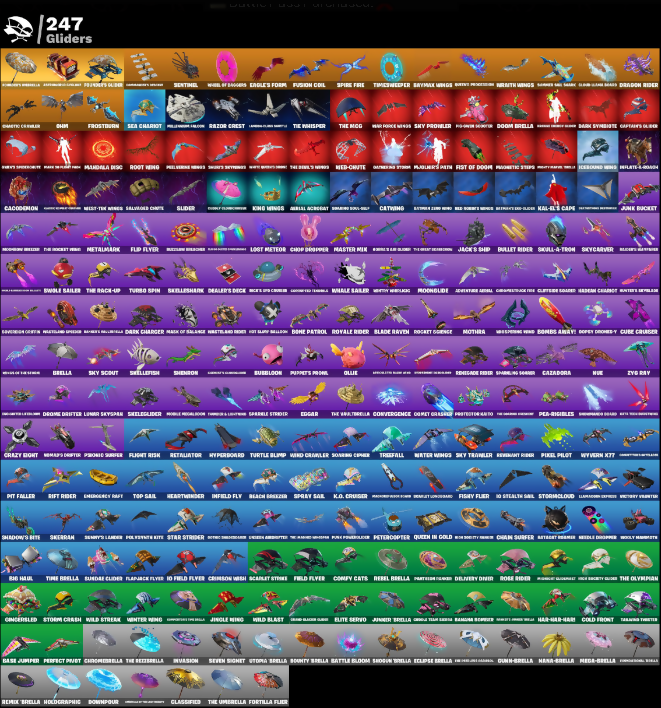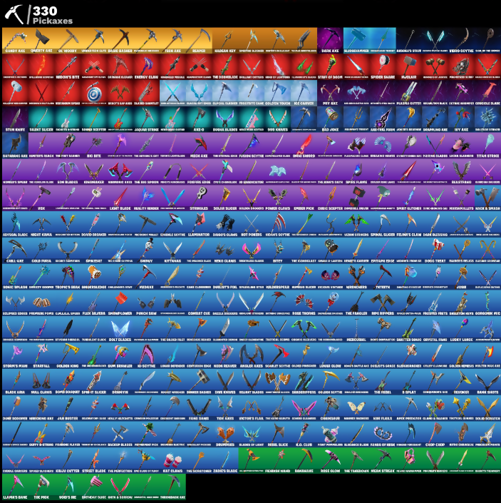 (Shmit), 10 Field Flyer, 10 Stealth Sail, 1945 Set, 1981 Ericsson, 2020 Jet Slap, 8-Bit Bomber, A Hand Of Firearms, A-Lion, Acadia Glacier Glory, Acrobatotics, Adam, Adventure Astral, Adventure Pack, Aegis, Aerial Acrobat, Aerial Assault One, Agent Jones, Aim's Felt Pack, Air Shredder, Albino, Alpha Trophy, Amethyst Bag, Anathema Fork, Angler Axes, Annihilatorious, Anthem, Antidote, Antonia, Apex Predator Claw, Aphrodite, Aquaman, Arbor Claw, Arcanak Dingo, Ares, Armad of Lightning, Armor Axe, Arrow, Arroyo Pack, Arroyo Packs, Arsenal Pack, Artright Bomber, Assassin, Atmosphere, Auto Cup Gun, Axer, Axor Claw, B-Splat, Back Board, Bad Juice, Badger Criger, Baggy Ace, Balance Door Palm & Clams, Bandana Scooter, Bandoli, Bani Don, Banner Sail Kang, Baron's Words, Base Jumper, Basic Basher, Batarang Axe, Batman Zero, Battle Bash, Battle Bloom, Battle Shining, Battle Subzero, Battleboa Move Mod Reefets, Baymax Wings, Be Seeing You, Beach Breaker, Beach Umbrella, Beach Upgrade, Beacon Glass, Beam Bag, Bean Bag, Bear Brained, Beast Boy, Beatz Bunny, Beefstank, Beep Beep, Bellamy, Better Markets, Biff Gungola, Big Fan, Big Haul, Billion V-Bucks, Billy Bounce, Birthday Sage, Bitely, Black Op Pack, Black Panther, Blade Aura, Blade Raven, Blade Sad, Blades of Light, Blankets Tags, Blowin' Up, Blueberry Bag, Boa Days, Boar Dragger, Bob's, Bob's Shack, Bom Blades, Bomb Bag, Bomb Bouquet, Bombs Away!, Bone Crusher, Bone Patrol, Bonsai Jonesy, Boogie Bomber, Boogie Down, Boogie!, Boomin', Boostin' Gats Sad Trombone, Boosting Pik, Boscoe's Covil, Bottle Challenge, Bounty Brella, Bounty Teeth, Bow, Bow Ma Biscuit, Brain Freeze, Breakneck, Breezy Coast, Brella, Bridge of Splats, Brie Moves, Bright Ground, Brilliant Cutters, Brite Bomber, Brosketeer, Bruno Mars, Brutus, Bubbleloon, Bugshay's Box, Bullet Rider, Bullz, Bunker Jonesy, Butter Robot, Button Pack, Buzz Pack, Cacodemon, Calico-Comet, Call Me, Call-Cal, Called Shot, Calzone Pack, Camnet, Camp Cuddle Crew, Candy Apple Ice Idol, Candy Axe, Captain Jones, Captain L. America, Captains Glider, Card Drop, Cardistry, Carnage, Carr Track Clothes Taken, Catalina, Catalyst, Catwing, Cauldron Chill, Cazadora, Cent Yankee, Centurion, Centurion Rose, Cerberus, Chain Surfer, Chain Sword, Chainsaw, Challengers Bite, Champion Razes, Chaos Director, Charlotte, Cheet, Chef's Special, Chicken, Chillax, Choir Checkin', Chop Chop, Chop Dropper, Christmas Leaf, Chrome Brella, Chrome Punk, Clara, Clarke Kent, Claw King, Clean Sweep, Cliffside Soarer, Cluck Strut, Coin Flip, Cold Clawser, Cold Front, Cold Furia, Colope Case, Colossal Croc, Combat Cue, Combat Que, Combo Cleaver, Combustible Ace, Comet Crasher, Comfy Cats, Commanders Club, Common Pickaxes, Concave Saber, Conch Call, Condor, Conjurer Weapon, Conjurer's Claw, Contact Caller owo, Convergence, Coodeahnis, Cooper's Axe, Core Getter, Corroded Terrapin, Cosmic, Count It, Cozy Coach, Crack It, Crazy Eight, Crescent Shard, Crime Squad Trophy, Crimson, Crimson Crest, Crimson Wing, Crimson Wish, Crisp Rend, Crossed Riders, Crosswieldles, Cruel Claw, Crusher, Crystal Fang, Cube Cruiser, Cubic Scepter, Cubic Vortex, Cuddly Clinger, Curling Iron, Cursed Energy, Curves & Bones, Cyborg Z-Dynamite, Cyclo Curl, Cypher Over Clock, DIP-367, Dagger Dance, Dagger of Light, Dallas, Dame Knives, Dandelion, Dango's Claws, Danielle Guerrero, Darcy, Daredevil, Dark Blessing, Dark Charger, Dark Shield, Dark Side, Dark Symbiote, Dartgcat, Darth Vader, Dartstand, Dead Head Bucket, Deadpool, Deadshot Pack, Dealer's Dice, Deck Pockey, Deep Dab, Deep Dive, Delight's Dance, Delivery Diver, Delta Sliders, Demi, Desert Ember, Dest Royale, Dexter Tashino, Dezlo, Diamond Throne, Diamond Tiara, Dice Roll, Diesel Hammer, Digidog, Dillon Heymans Cosmic Splats, Disassemble, Disrupting Axe, Diva Fever, Do The Split, Doctor Doom, Doctor Stone, Doctor Strange, Dodo Beak, Dodog Treat, Dog Collie Meow, Doggo, Doll Dominator, Dome Drifter, Doom, Doom Slayer, Doom Umbrella, Doom's Callous, Doom's Claw, Dopey Donkey-V, Doral Monuments, Double Heard, Double Portal, Downpour, Doze Dab, Dr. Darmama, Dr. Smith's Eyepatch, Dr. Wo, Draavni, Dragon Board, Dragon Dagger, Dragon Rider, Dragon's Score, Dragonfly Roll, Dramahawk, Dreadclaw, Dreadhunter, Dream Feet, Dropout, Drum Beater, Drum Talkers, Drumdrill, Dubin Knight, Duffle Dog, Duke Sodbper, Dumb, Dune Bacon Griffin, Duoba Blades, Duplicates, Dusty, Dwey Icer, Eagle's Form, Eclipse Brella, Edge of Night, Eggar, Ekeo, Elastano, Elite Servo, Ember Pick, Emergency Raft, Emissary Aero, Emissary Riotous, Emma Frost, Emote Limits, Energy Claw, Entanglemant, Epitaph Edge, Era, Eros Demon, Eternal Knight, Eternal Shield, Evil Plan, Expedition Bag, Explorer Moon, Expressionism, Extra Round, Fade, Fall Bang, Fang Dance, Fang Swipes, Fangs of Ash, Feather Bicycle, Feather Edge, Felina, Feline Fur, Feline's Claw, Fennec's Wand, Fictional Jenny, Field Flyer, Fire Show, Fireworks Salvo, Fish Stick, Fishy Flier, Fist Bump, Fist of Doom, Fladeau 01/01/23, Flaky Feast, Flapback Flyer, Flight Risk, Flip Flyer, Flippin' Away, Flunk Slinger, Fool Fill, For The Going, Forkps, Fortilla Flyer, Founder's Glider, Founder's Mesaela, Fox Wig, Freezing Point, French Toast, Freshlin Collar & Barn, Froid Back, Froid Cola Upset-C, Frontpage Pose, Frost Broker, Frostburn, Frostify, Frosty Paw, Frozen Fang, Funky Emote Vibes, Funky Hits, Fusion, Fusion Coil, Fusion Scythe, Fyla-U-Lega, Galactic Miners, Galactic Pack, Galaxi Tracker Blade's Twigy, Gallant Gear, Gathering Storm, Gator Patrol, Gentleman's Dab, Geralt of Rivia, Ghost's Cloak, Ghostly Cloak, Ghostly Skull, Ginger Slade, Gingersled, Glam Box, Glassified, Glide & Hallow, Glob-Lucks, Go Bag, Gold Token, Gold Token Pick, Golden Hooks, Golden King, Golden Scythe, Golden Shard, Golden Skin, Goldy, Good Day, Good Time Bandit, Goufy G-String, Grand Pummeler, Grand Sasa, Great, Groot, Groove Jammy, Guapoleon, Gull Rider, Gumbo, Gumina, Gummy Back, Gun Breaker, Gunn-Brella, Gusher, Gwen-