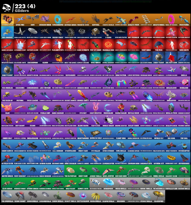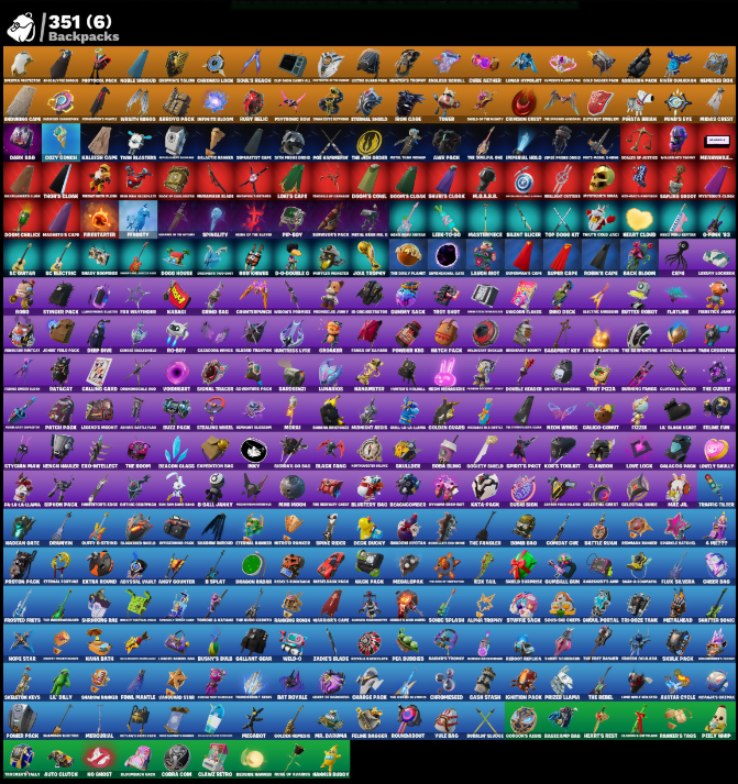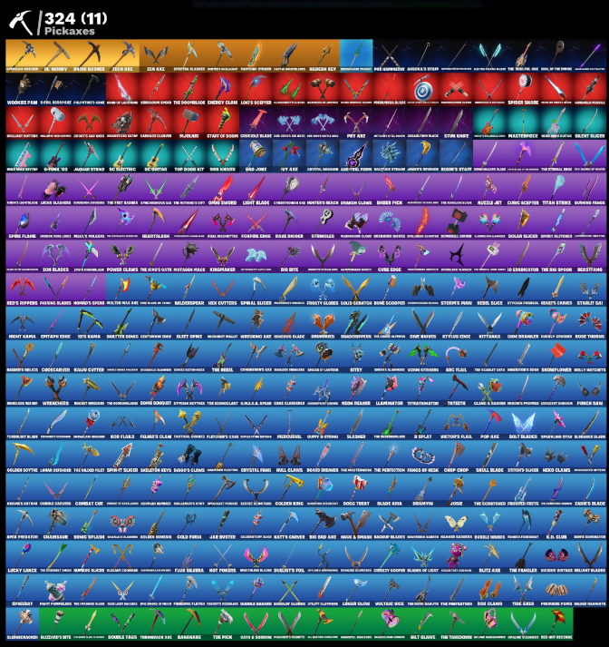 187's Kama, 3-Ball, 40 Ghost, 999 Knives, A Warm Pawprint, Abe 73 Dogs, Abysmal Harvest, Abyssal Vault, Acrobatics, Adira, Adventures Real, Aerial Acrobat, Aftermath, Agent Jones, Ahsoka Tano, Air Shredder, Aloff, Alpha Squad, Alpha Trophy, Alpha's Wrath, Amet Trio, Anarchy & Steel, Angry Counter, Ani Vangellola, Antonio, Aparote, Apex Predator, Arach Knight, Arc Flail, Arctic, Aries, Aromantic Pack, Aroto Kiddel, Arrow Pack, Artemis, Arttart's Flourish, Assassin Pack, Assault Claws, Astara, Astro Morpheus Cyclone, Avla Rain, Aw, Snacks., Aww Pack, B-Skill Junker, B30, Back Blood, Bagpop Blades, Balance Board, Banana Axe, Banana Bomber, Barb Claws, Barons Honor, Barrel, Barrel Girl, Base Jumper, Basic Basher, Bat Royale, Batt's Carver, Battery Cycle, Battle Blessing, Battle Bloom, Battle Call, Battle Ruin, Bayley Sexx, Bazzi, Beach Breeze, Beach Grover, Beacon Glass, Bean Bag, Bear's Melt, Beastboy, Beastfang, Beatz Bunny, Beep Beep, Big Bad Axe, Big Haul, Biohazard Lifeguard, Bitty, Black Dart Hover, Black Dream Ghost Glider, Blackout, Blade Arsa, Blade Fang, Blade Raven, Blades Of Light, Blast Off, Blazing Claw, Bliska Heska, Blitz Axe, Blown Up, Board Breaker, Board Flair, Boba, Boba Shack, Boh Go, Bombs Away!, Bone Breaker, Bone Patrol, Boogie Down, Boogiesdomain, Boomer Bond, Boomin', Boostin' Cats, Boosting Ki, Bootstrap Edge, Bounty Brella, Brandy's Power, Brave Moves, Breakdown Axe, Breezaille, Brella, Brilliant Blades, Brutus, Bubble Buddy, Bubloon, Buffalo Blade, Bull, Bullet Brode, Bullet Rider, Butter Boot, Buttercup, BuzzSaw Beast, Caco Demon, Calico Combat, California Love, Call Me, Called Shot, Calling Card, Cannonbore's Kisser, Captain Clamsica, Captain Cook, Captain's Glider, Carboto Crawler, Card Drop, Cardistry, Carmine Rosso, Carnage, Carnage Cleavers, Cash Stash, Cassidy Quinn, Cat Fit, Catallas Secret, Cattroid Glider, Celebration Saber, Celestial Omega, Centurion, Centurion Edge, Cerberus, Chain Surfer, Chainsaw, Chanda Titten, Chaos Origins, Charge Pack, Charlotte, Cheer Bag, Chewbacca, Chiblitz, Chief Bolt, Chief's Special, Choice Knut, Chop Dropper, Chroma Edge, Chrombrella, Chrome Punk, Circusator PUZ, Clark Kent, Classified, Claw Cleaver, Clean Sweep, Clear Slicer, Cliffside Soarer, Clone Trooper Rex, Cloud Crusader, Cloudray Driver, Cluck, Coal Lawdence, Codebreaker, Coin Flip, Cold Furies, Combat Club, Combat Suit, Combocopter, Comet Crusher, Comfy Cats, Command's Mode, Commoner, Commsced, Conch Call, Conjure Weapon, Connecky Big, Conqueror's Axe, Conquerors Claw, Convergence, Coral Coco, Costumes Dem The Magician, Count It!, Counter Punch, Cousella Espoled, Craggle Star Wings, Cranberry, Crescent Dagger, Crimson Crest, Crimson Wish, Crop Crop, Cryosniffer Wings, Crystal Fang, Crystal Shard, Cthul-Brella, Cuffin, Cure Edge, Cyber Assassin, Cyclo Curl, Cyclone Blade, DJ Woody, DJ Yonder, Dagger Dance, Daigo, Daily Flight, Dali, Dam Lemouinon, Danger Face, Dario Deck, Dark Bag, Dark Bomber, Dark Cat, Dark Charger, Dark Domination, Dark Machina, Dark Symbiote, Darlen, Darth Maul, Darth Vader, Dawg's Cleaver, Dayman Wings, Deader P, Deadlock, Deadpool, Dealer's Deck, Death's Reach, Deception, Deck Decky, Deep Blue, Detective's Notebook, Diablo's Claws, Diamond Thorne, Dice Edge, Dice Roll, Dill With It, Dire Raider, Disarray, Disassemble, Diva Fever, Do The Split, Doctor Doom, Doctor Strange, Dogg Treat, Dogo House, Doom Brella, Doom Chalice, Doom Slayer, Doomgles, Doom’s Cloak, Doom’s Cove, Dosa Sling, Double Hands, Double Tags, Double U, Down Bomber, Downpour, Doze Dab, Dragato Flares, Dragon Raider, Dragon Rider, Dragon Scythe, Dragon's Claw, Dragonblades, Drawcin, Driver’s Sludge, Drok, Dronachodon, Drone Drifter, Droppic Snowflake, Drumroll Spear, Duel Of Swords, Duelist's Fol, Dugabee Flutter, Dune Knives, Dune Scooper, Dusha, Dusk Star, Dusty, Eagle's Form, Ecgar, Eclipse Brella, Eco-Knifelist, Elegant Crooner, Elite Servo, Elven Berger, Ember Monarch, Emergency Raft, Emma Frost, Energy Claw, Erisia, Eternal Render, Eternal Shell, Evasive Maneuver, Everything's Red, Evie, Evil Shadow, Expedition Bag, Expression Dance, Expressionism, Extra Round, Eye, F.I.S.T, Fa-La-La Llama, Fade, Fangs Dance, Fangs Of Hesh, Fara, Feel The Force, Felina, Feline Dagger, Fenice, Fire Show, Firestarter, Firework Salvo, Fish TT66G, Fishy Flier, Fist Bump, Fist of Doom, Flamings Claws, Flamjack Flyer, Flappy Feast, Flatline, Flight Risk, Flip Flyer, Flippin Away, Flux Saver, Flux Silvers, Fogged Pete's, Foley Hop, Folkenhide, Force Lightning, Fortilla Flyer, Foul Flex, Fowl Mantle, Fox Fighter, Foxfire Edge, Fracture Jack, Friends Also Trick, From Cool, Front-Pack Pose, Frost Squad, Frostbite, Frostburn, Frosted Frets, Frosty, Frosty Gloves, Frozen, Fuzzik, Fywz, GAG Doctor, Galactic Ranger, Galatea Spear, Gallant Gear, Gargoyles Skyrings, Garrison, Gathering Storm, Gazadora, Genesis Original, Get Off Your Phones, Ghost Sniper Rifle, Ghost of Di Yena, Gilt Gloves, Giselle’s Crest, Glambox, Gland Bag, Glowqueen, Glut Pack, God of the Empire, Gold Rank, Gold Shank, GoldHart, Golden Guard, Golden King, Golden Remers, Golden Retro, Golden Scythe, Golden Solo Glider, Gone Glider Grappler, Good Buy, Gorgon’s Axis, Graali, Gracie It, Gracing Pack, Grizzly Coper, Groot, Guard, Guideo, Gully Getting, Gumball Gun, Gummy Sack, Gunm-Brella, Gunnar, Gwen-Step, H.A.R.B., HF Dalma, Had A Way Up, Hades, Hadesan Chariot, Hair-Hair-Hare, Halcyon Glow, Half-Baked Trade, Hamjord Zane, Hammerman, Hammer’s Grove, Hand Sabers, Hand-Forged, Hands Eye, Harness Back, Hatuls Hoberts, Haven, Havoc & Splash, Havoc Blade, Havoc C-Q5R, Havoc Claws, Havoc Hashtag, Havoc Kama, Havoc Knife, Havoc Machete, Hawk Operator, Heart Chopper, Heart Cloud, Heart Sign, Heart's Carver, Heartburst, Heartslash, Heartwinder, Heart’s Rest, Heavy Descent, Heavy Lake, Helena Cross, Hellfire Dance, Hench Hauler, Hern Monk, Hex Cutters, Hexo Claws, Heyed Up, Hip Bunny Scooter, Holiday Boy, Holly Hatchets, Holly Rak
