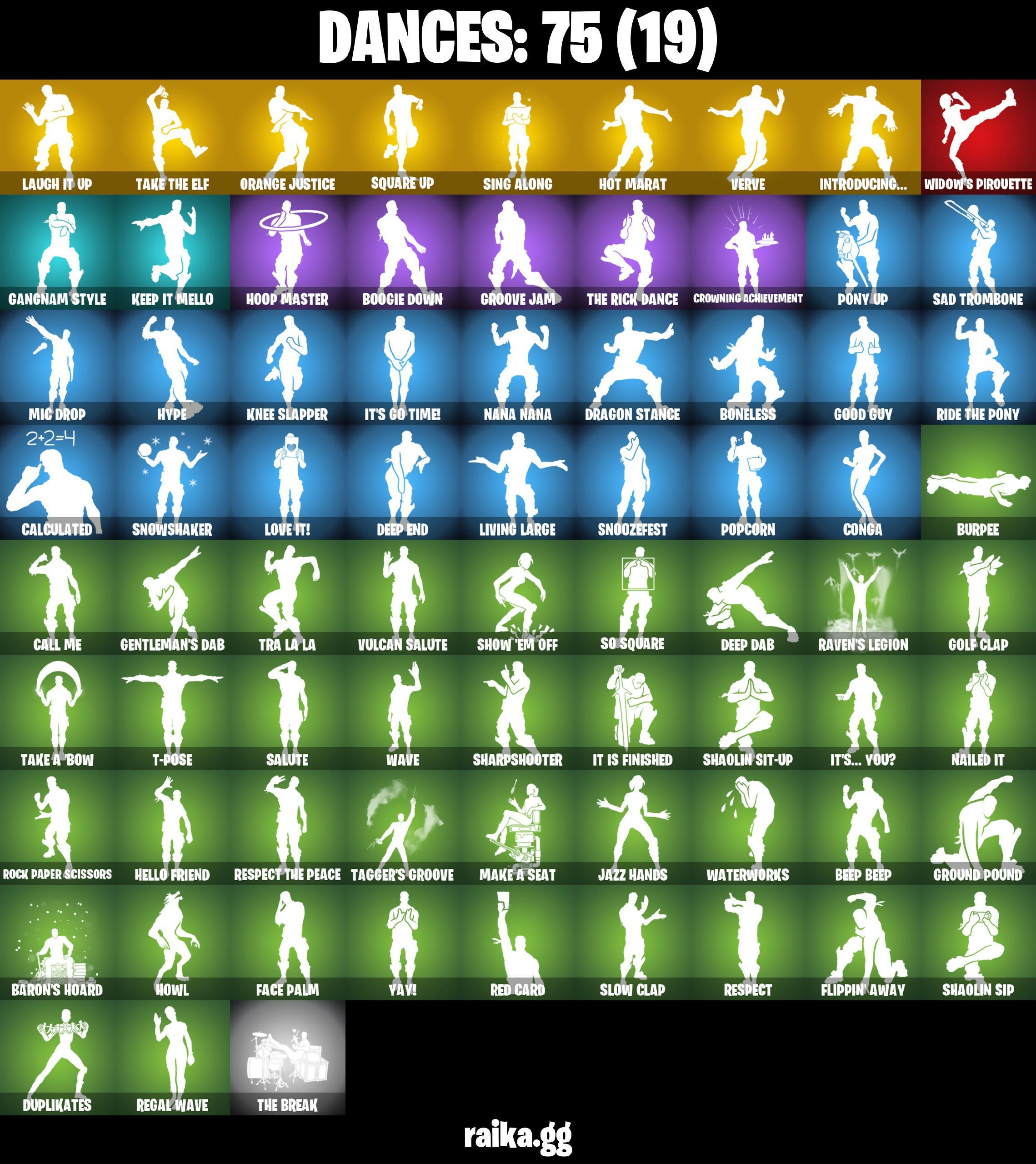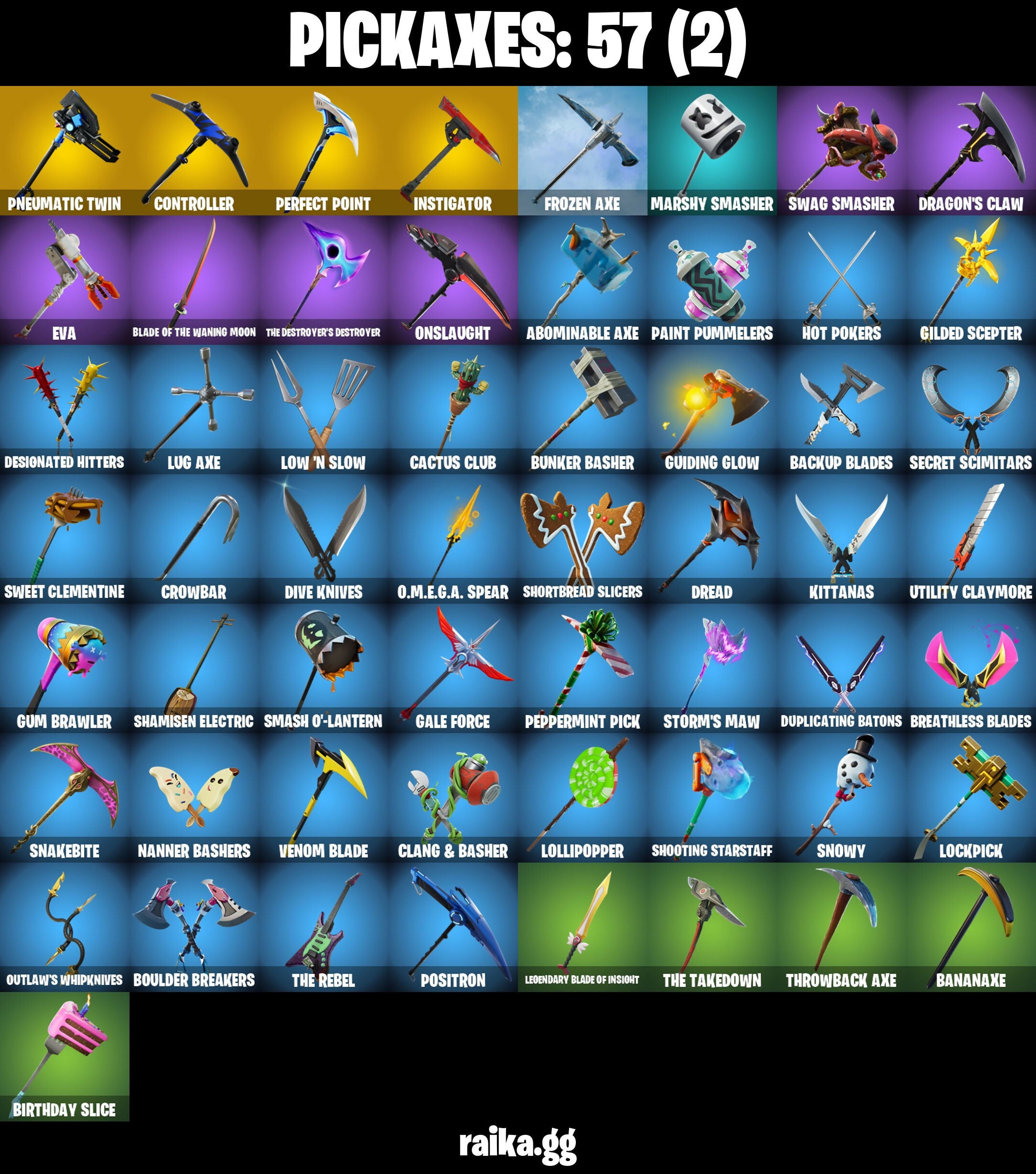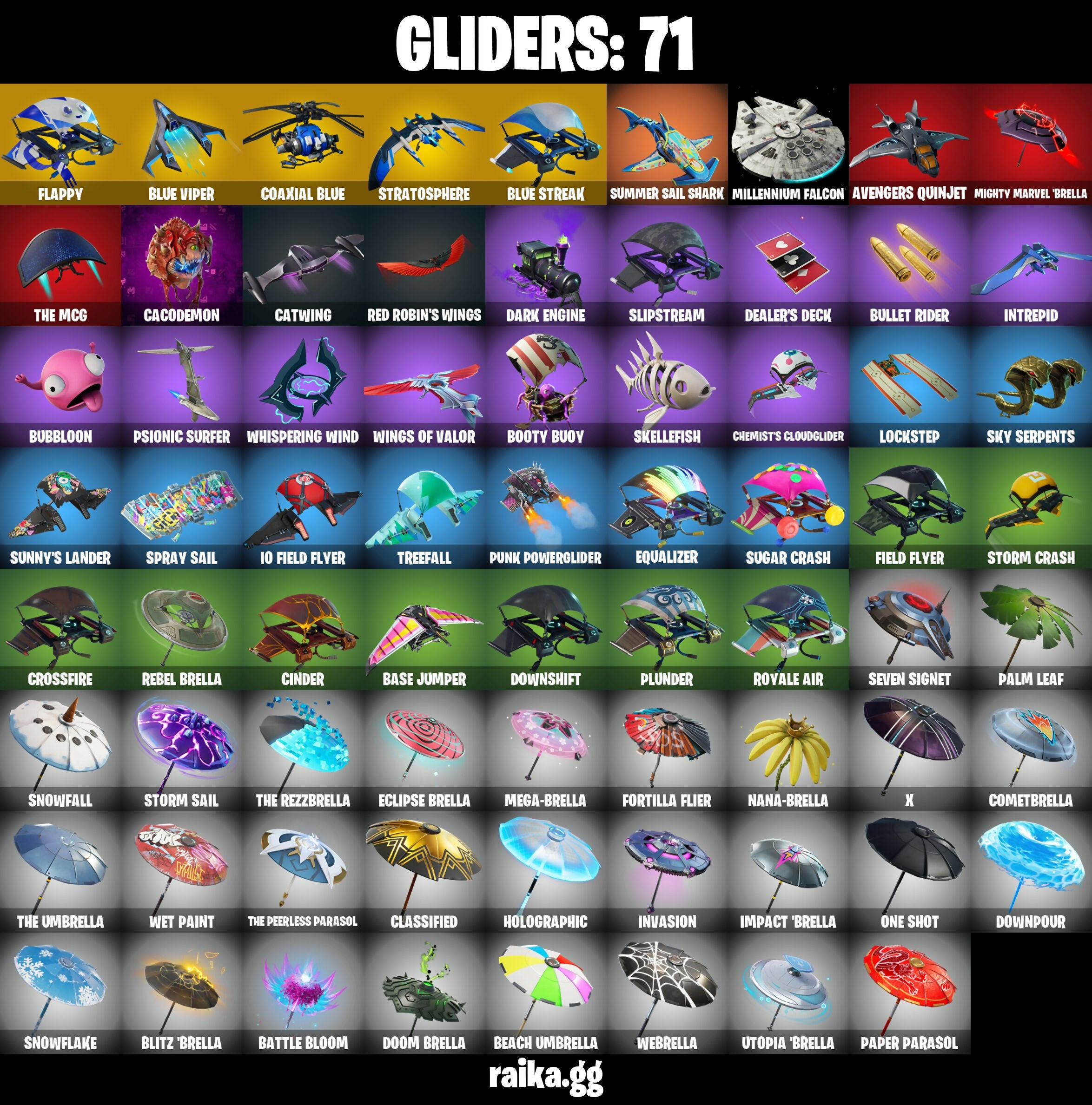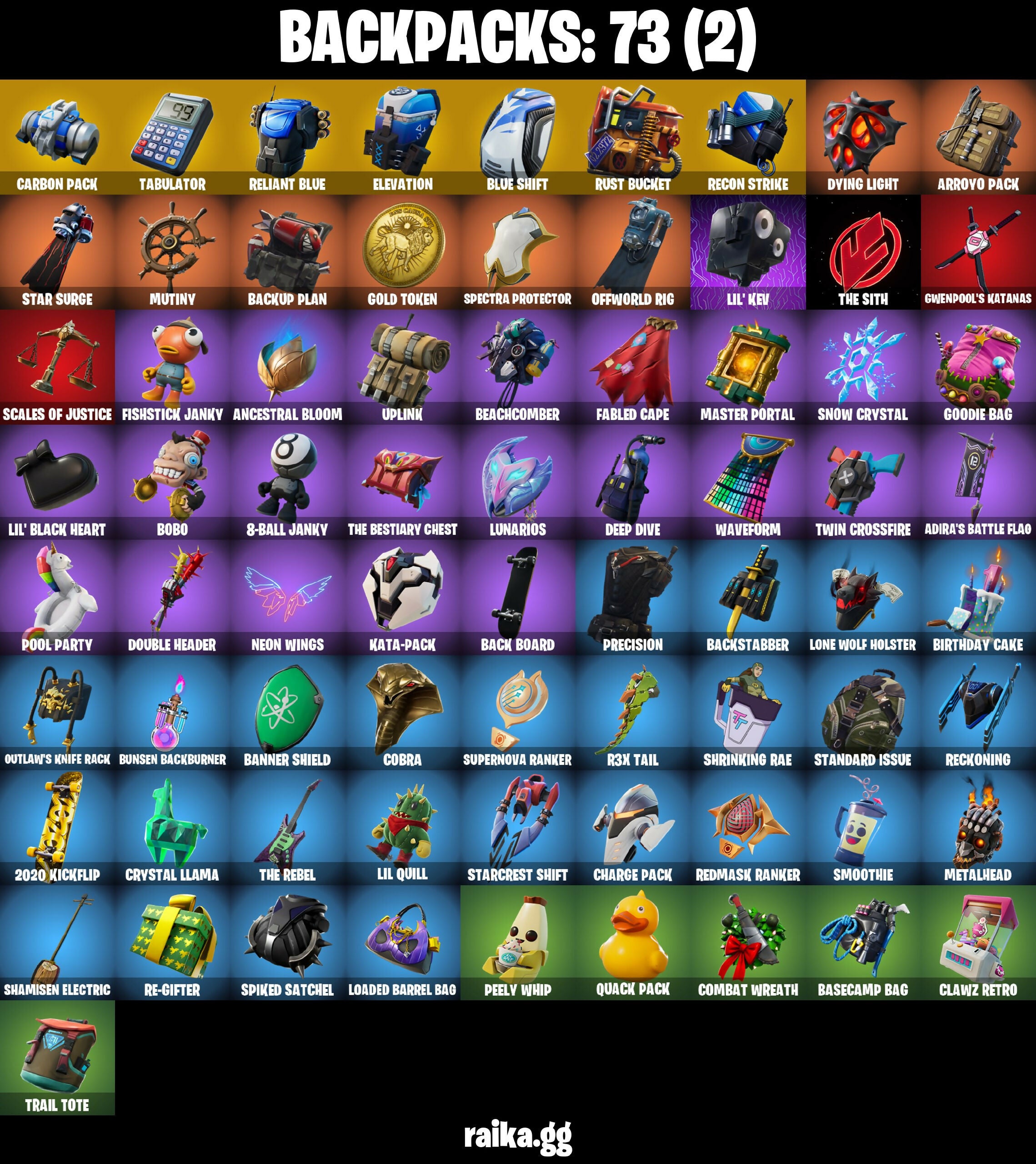 2020 Kickflip, 8-Ball Janky, Abominable Axe, Adira's Battle Flag, Ancestral Bloom, Arroyo Pack, Avengers Quinjet, Back Board, Backstabber, Backup Blades, Backup Plan, Bananaxe, Banner Shield, Baron's Hoard, Base Jumper, Basecamp Bag, Battle Bloom, Battle Bus, Battlehawk, Beach Umbrella, Beachcomber, Beep Beep, Birthday Cake, Birthday Slice, Blackheart (Stage 8), Blade of the Waning Moon, Blitz 'Brella, Blue Shift, Blue Streak, Blue Striker, Blue Team Leader, Blue Viper, Bobo, Boneless, Boogie Down, Booty Buoy, Boulder Breakers, Breathless Blades, Bubbloon, Bullet Rider, Bunker Basher, Bunsen Backburner, Burpee, Cacodemon, Cactus Club, Calculated, Call Me, Carbide Armor Stage 5, Carbon Commando, Carbon Pack, Catwing, Charge Pack, Chemist's Cloudglider, Cinder, Clang & Basher, Classified, Clawz Retro, Cloud Striker, Coaxial Blue, Cobra, Combat Wreath, Cometbrella, Conga, Controller, Crossfire, Crowbar, Crowning Achievement, Crystal Llama, Dark Engine, Dealer's Deck, Deep Dab, Deep Dive, Deep End, Designated Hitters, Dive Knives, Doom Brella, Double Header, Downpour, Downshift, Dragon Stance, Dragon's Claw, Dread, Duplicating Batons, Duplikates, Dusk Knight, Dying Light, EVA, Eclipse Brella, Elevation, Ember (Night), Equalizer, Fabled Cape, Face Palm, Field Flyer, Fishstick Janky, Fixer, Flappy, Flippin' Away, Fortilla Flier, Frozen Axe, Gale Force, Gangnam Style, Gentleman's Dab, Gilded Scepter, Gold Token, Golf Clap, Good Guy, Goodie Bag, Groove Jam, Ground Pound, Guiding Glow, Gum Brawler, Gwenpool's Katanas, Havoc, Hello Friend, Holographic, Hoop Master, Hot Marat, Hot Pokers, Howl, Hybrid (Stage 4), Hype, Impact 'Brella, Instigator, Intrepid, Introducing..., Invasion, Io Field Flyer, It Is Finished, It's Go Time!, It's... You?, Jazz Hands, Kata-Pack, Keep It Mello, Kittanas, Knee Slapper, Laugh It Up, Legendary Blade of Insight, Lil Quill, Lil' Black Heart, Lil' Kev, Living Large, Loaded Barrel Bag, Lockpick, Lockstep, Lollipopper, Lone Wolf Holster, Love It!, Low 'N Slow, Lt. Evergreen, Lug Axe, Lunarios, Make A Seat, Marshy Smasher, Master Key, Master Portal, Mega-Brella, Metalhead, Mic Drop, Mighty Marvel 'Brella, Millennium Falcon, Monster Team Banner, Mutiny, Nailed It, Nana Nana, Nana-Brella, Nanner Bashers, Neon Wings, Nitelite, O.M.E.G.A. Spear, Offworld Rig, Omega, One Shot, Onslaught, Orange Justice, Outlaw's Knife Rack, Outlaw's Whipknives, Paint Pummelers, Palm Leaf, Paper Parasol, Peely, Peely Whip, Peppermint Pick, Perfect Point, Plunder, Pneumatic Twin, Point Patrol, Point Patroller, Pony Up, Pool Party, Popcorn, Positron, Precision, Prodigy, Psionic Surfer, Punk Powerglider, Quack Pack, R3X Tail, Radiant Blue, Raven's Legion, Re-Gifter, Rebel Brella, Reckoning, Recon Strike, Red Card, Red Robin's Wings, Redmask Ranker, Regal Wave, Reliant Blue, Respect, Respect The Peace, Ride The Pony, Rock Paper Scissors, Royale Air, Ruin, Rust Bucket, Sad Trombone, Salute, Scales of Justice, Secret Scimitars, Seven Signet, Shamisen Electric, Shaolin Sip, Shaolin Sit-Up, Sharpshooter, Shooting Starstaff, Shortbread Slicers, Show 'Em Off, Shrinking Rae, Sidewinder (Dark), Sing Along, Skellefish, Sky Serpents, Slipstream, Slow Clap, Smash O'-Lantern, Smoothie, Snakebite, Snoozefest, Snow Crystal, Snowfall, Snowflake, Snowshaker, Snowy, So Square, Spectra Protector, Spiked Satchel, Spray Sail, Squad Leader, Square Up, Standard Issue, Star Surge, Starcrest Shift, Storm Crash, Storm Sail, Storm's Maw, Stratosphere, Sub Commander, Sugar Crash, Summer Sail Shark, Sunny's Lander, Supernova Ranker, Swag Smasher, Sweet Clementine, T-Pose, Tabulator, Tagger's Groove, Take A Bow, Take The Elf, Teknique, The Bestiary Chest, The Break, The Destroyer's Destroyer, The Mcg, The Peerless Parasol, The Rebel, The Rezzbrella, The Rick Dance, The Scientist (White), The Sith, The Takedown, The Umbrella, The Visitor, Throwback Axe, Tra La La, Trail Tote, Treefall, Trilogy, Twin Crossfire, Uplink, Utility Claymore, Utopia 'Brella, Valor, Venom Blade, Verve, Vulcan Salute, Waterworks, Wave, Waveform, Webrella, Wet Paint, Whispering Wind, Widow's Pirouette, Wings Of Valor, Wooly Warrior, World Cup 2019, World Cup 2019 Banner, X, Yay!, Yellowjacket, Zoey