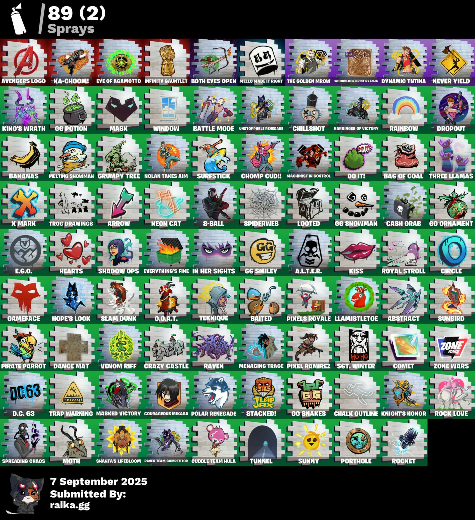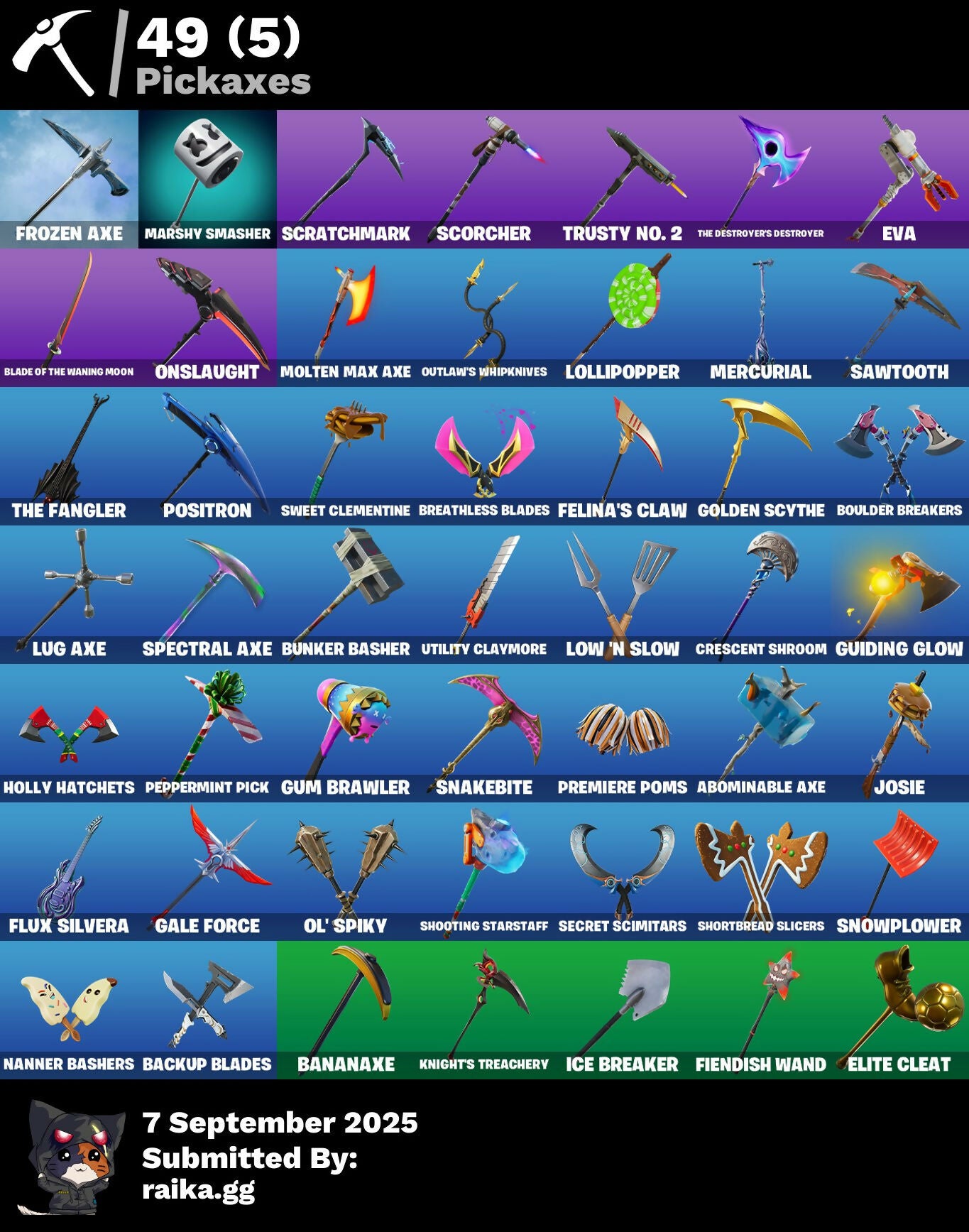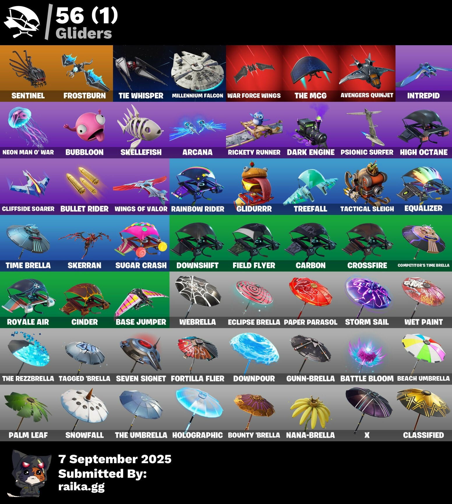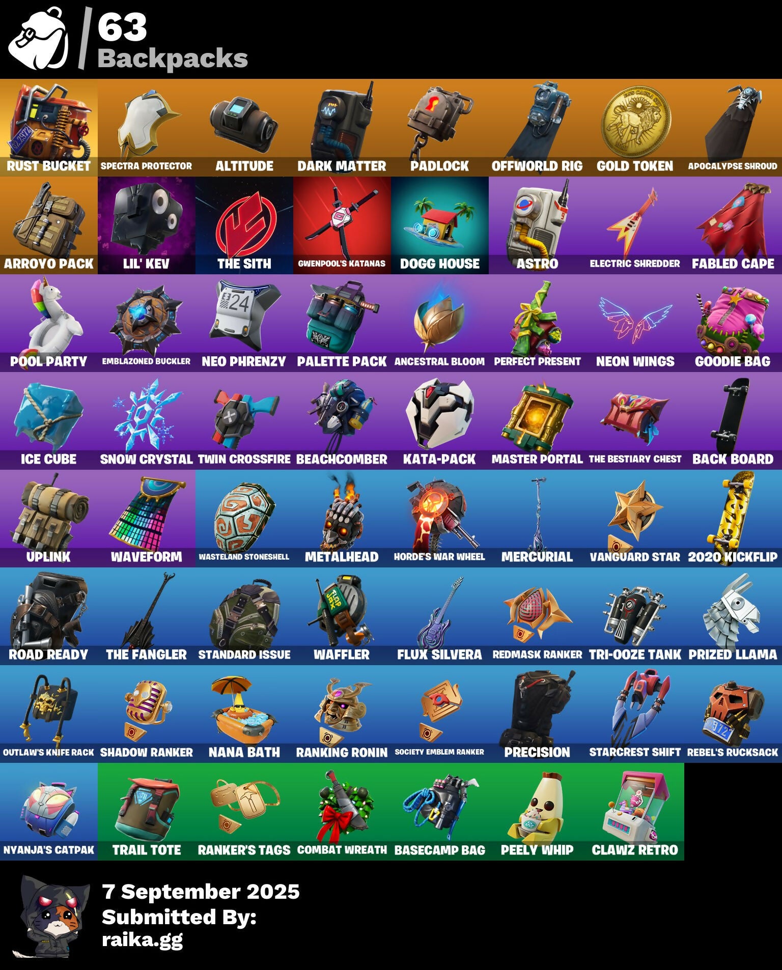 2020 Kickflip, 2022, 8-Ball, A.L.T.E.R., Abominable Axe, Abstract, Aerial Threat, Agent Jones, Altitude, Ancestral Bloom, Apocalypse Shroud, Arcana, Arctic Assassin, Arctic Camo, Arrow, Arroyo Pack, Astro, Avengers, Avengers Logo, Avengers Quinjet, Back Board, Backbone, Backup Blades, Bag Of Coal, Baited, Bananas, Bananaxe, Banner, Banner Icon, Base Jumper, Basecamp Bag, Batman, Battle Bloom, Battle Call, Battle Mode, Battlehawk, Beach Umbrella, Beachcomber, Bee, Beep Beep, Best Mates, Bitter Sweets, Blade of the Waning Moon, Blasted, Blue Metallic, Boogeyman, Both Eyes Open, Boulder Breakers, Bounty 'Brella, Bow, Breathless Blades, Bubbloon, Buckets, Bullet Rider, Bunker Basher, Burning Dragon, Calculated, Call Me, Callsign Falcon, Callsign Skull, Camera, Captain America's Shield, Carbide, Carbide Armor Stage 5, Carbon, Carbon & Gold, Cash Grab, Cat Flip, Cerberus Bite, Chains, Chalk Outline, Chaos Directive, Chic, Chick, Chillshot, Choice Knit, Chomp Cud!!, Chromatic, Cinder, Circle, Classified, Clawz Retro, Clean Sweep, Cliffside Soarer, Combat Wreath, Comet, Competitor's Time Brella, Console Cup, Contour Camo, Courageous Mikasa, Cowboy Chat, Crab, Crazy Castle, Crescent Shroom, Crossfire, Crosshair, Crowning Achievement, Cuddle Team Hula, Cuddly Bear, Cursed, Cyclo Curl, D.C. 63, Dance Mat, Dark Engine, Dark Matter, Dark Voyager, Deep End, Dinosaur, Dinosaur Skull, Disco, Do It!, Dog Bowl, Dog Collar, Dogg House, Double Up, Downpour, Downshift, Doze Dab, Dropout, Duck, Durrr Burger, Dynamic TNTina, E.G.O., EVA, Eagle, Eclipse Brella, Egg, Electric Shredder, Elite Agent, Elite Cleat, Emblazoned Buckler, Equalizer, Everything's Fine, Expedition, Eye Of Agamotto, Fabled Cape, Falcon, Falling Leaf, Falling Snow, Felina's Claw, Fence, Festive Paper, Field Flyer, Fiendish Wand, Finger Wag, Firewalker, Fish Hook, Flail, Flippin' Away, Floating Island, Flux Silvera, Fortilla Flier, Frostburn, Frozen Axe, Fryangles, G.O.A.T., GG Ornament, GG Potion, GG Smiley, GG Snakes, GG Snowman, Gale Force, Gameface, Gentleman's Dab, Get Funky, Glidurrr, Gold Token, Golden Scythe, Golf Clap, Goodie Bag, Grav-Fusion, Groove Jam, Ground Pound, Grumpy Tree, Guiding Glow, Gum Brawler, Gumbo, Gunn-Brella, Gunnar's Special, Gwenpool's Katanas, Gwetterman Jacket, Ham, Hand Horns, Hand of Trace, Happy Cloud, Harbinger Of Victory, Haute Hustle, Haven, Hearts, Hello Friend, Hero Emblem, High Octane, Holly Hatchets, Holographic, Hootenanny, Hope's Look, Horde's War Wheel, Hot Marat, Hype, Ice Breaker, Ice Cube, In Her Sights, Indigo Ice, Infinite Dab, Infinite Swirl, Infinity Blade, Infinity Gauntlet, Intrepid, It's Go Time!, It's... You?, Jaeger, Jolly Roger, Josie, Ka-Choom!, Kata-Pack, Keep It Mello, King's Wrath, Kiss, Knight's Honor, Knight's Treachery, Lbc Signature, Lightning, Lil' Kev, Lithic, Llamistletoe, Lobby Classic, Lock It Up, Lollipopper, Looted, Love, Love It!, Low 'N Slow, Lug Axe, Lynx, Lynx (Stage 4 - No Ponytail), Machinist In Control, Major Mancake, Make A Seat, Marshy Smasher, Mask, Masked Victory, Master Plan, Master Portal, Mello Made It Right, Melting Snowman, Menacing Trace, Mercurial, Merry Marauder, Metalhead, Mic Drop, Millennium Falcon, Mission Specialist, Molten Max Axe, Monks, Moonwalker, Moth, Nana Bath, Nana-Brella, Nanner Bashers, Neo Phrenzy, Neo Versa, Neon Cat, Neon Man O' War, Neon Tendrils, Neon Tropics, Neon Wings, Never Yield, New Year 2020, No Sweat, Nolan Takes Aim, Nyanja's Catpak, Octopus, Offworld Rig, Ol' Spiky, Omega, Onesie, Only 90's Kids, Onslaught, Orange Justice, Outlaw's Knife Rack, Outlaw's Whipknives, Padlock, Paint Brush, Palette Pack, Palm Leaf, Paper Parasol, Paper Plane, Party Hips, Paw, Peely Whip, Pencil, Peppermint Pick, Perfect Present, Pirate Parrot, Pixel Ramirez, Pixels Royale, Pizza Party, Polar Renegade, Pony Up, Pool Cubes, Pool Party, Popcorn, Porthole, Positron, Powder, Powder (White), Precision, Premiere Poms, Prized Llama, Psionic Surfer, Radiant 1, Raider's Return, Rainbow, Rainbow Rider, Ranker's Tags, Ranking Ronin, Rattlesnake, Raven, Raven Team Competitor, Rebel's Rucksack, Redmask Ranker, Reese, Regal Wave, Relik, Resistance Banner, Respect, Respect The Peace, Rickety Runner, Ride The Pony, Road Ready, Rock Love, Rocket, Royal Stroll, Royale Air, Rubber Duckie, Rust Bucket, Rust Lord, Salt, Salute, Sawtooth, Scorcher, Scratchmark, Sea Serpent, Secret Scimitars, Sentinel, Seven Signet, Sgt. Winter, Sgt. Winter Headgear, Shackle, Shadow Ops, Shadow Ranker, Shadow Seal, Shanta's Lifebloom, Shaolin Sip, Sharpshooter, Shimmer, Shooting Star, Shooting Starstaff, Shortbread Slicers, Sing Along, Sith, Skellefish, Skerran, Slam Dunk, Slow Clap, Snakebite, Snoop Dogg, Snow Clan Shuriken, Snow Crystal, Snowfall, Snowflake, Snowplower, Snowshaker, Society Emblem Ranker, Spectra Protector, Spectrakinetic, Spectral Axe, Spider, Spiderweb, Spray Can, Spreading Chaos, Squad Leader, Stacked!, Stage, Standard Issue, Starcrest Shift, Storm King, Storm Sail, Sugar Crash, Sun, Sunbird, Sunny, Surfstick, Sweet Clementine, Tactical Sleigh, Tagged 'Brella, Take The Elf, Take The L, Tartan, Teeth, Teknique, The Bestiary Chest, The Break Shot, The Destroyer's Destroyer, The Fangler, The Golden Mrow, The Mcg, The Prisoner, The Reaper, The Rezzbrella, The Robot, The Sith, The Umbrella, The Visitor, Three Llamas, Tie Whisper, Time Brella, Timer, Top Hat, Tra La La, Trail Tote, Trap Warning, Trash Can, Treefall, Tri-Ooze Tank, Trog, Trog (Tribal), Trog Drawings, Trusty No. 2, Tsuki 2.0, Tunnel, Twin Crossfire, Ultra Red, Unstoppable Renegade, Uplink, Utility Claymore, Valentine, Valor, Vanguard Star, Venom Riff, Viking Ship, Villain Emblem, Waffler, Waning Moon, War Force Wings, Wasteland Stoneshell, Wave, Waveform, Waves, Wavy (Blitz), Webrella, Webslinger, Well Wrapped, Wet Paint, Whale, Wilde, Window, Wing, Wings Of Valor, Wolf, Woodblock Print Nyanja, Wooly Warrior, Worm, Wreath, X, X Mark, X-4 Stormwing, X-Mass Sweater, Yay!, Zenith, Zenith (Stage 4), Zoey, Zo